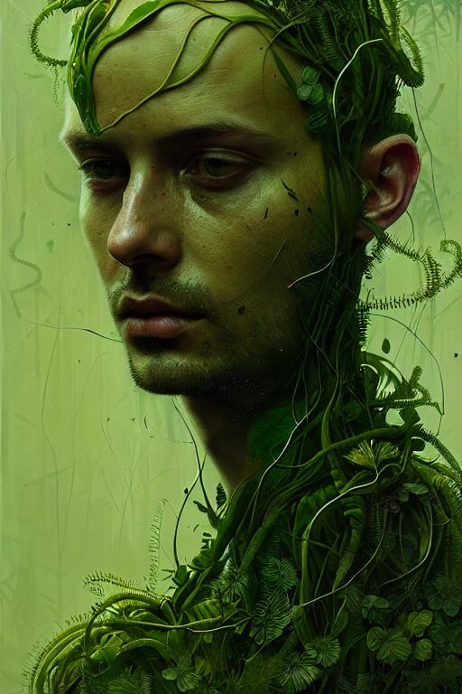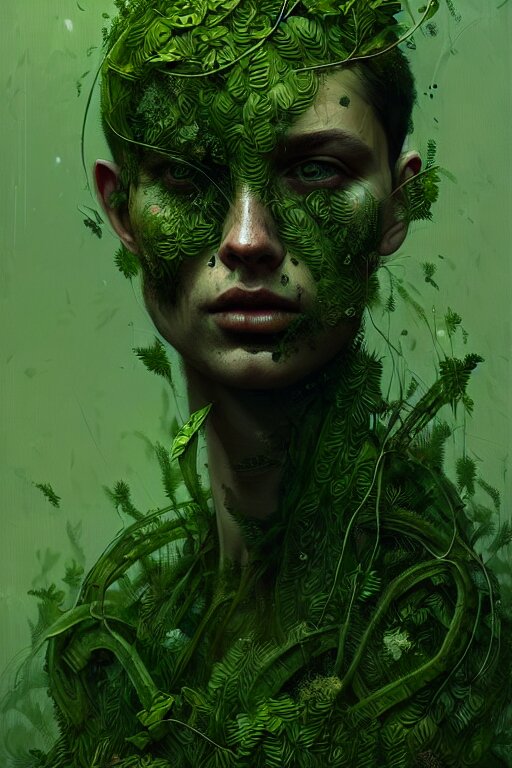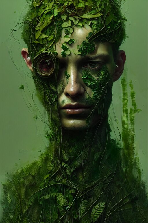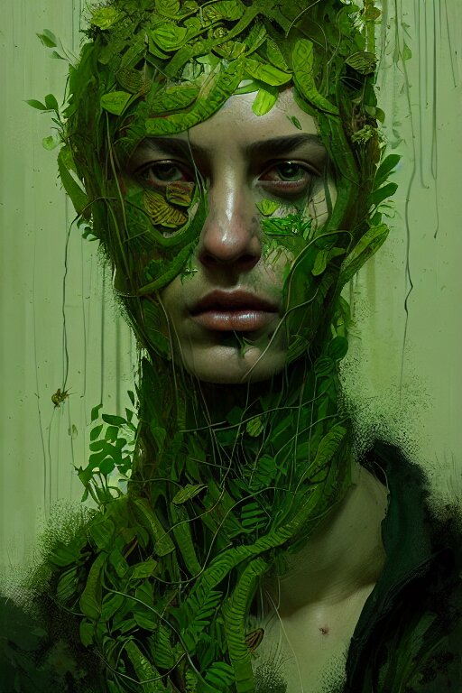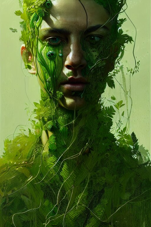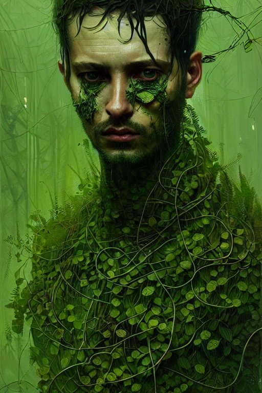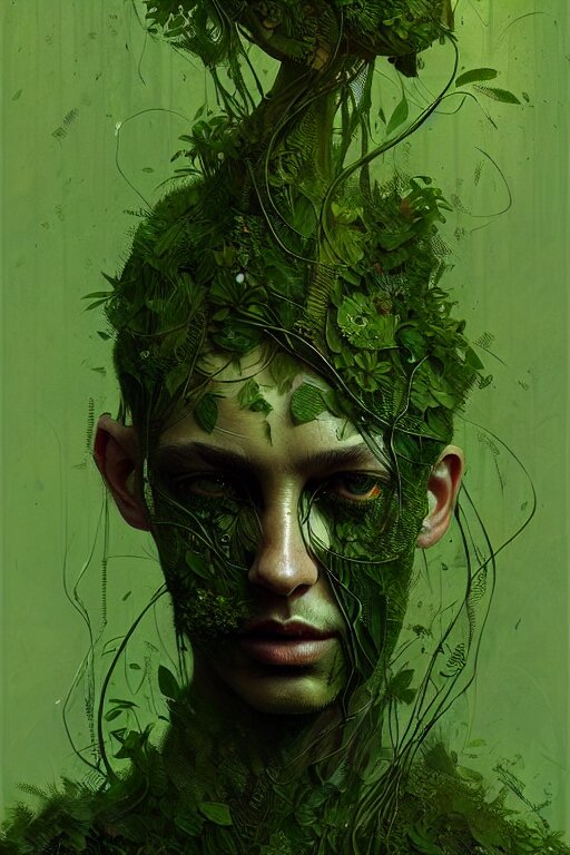 Detailed portrait of person made of green vines, plants, horror, gritty, elegant, luxury, by ismail inceoglu dragan bibin hans thoma greg rutkowski alexandros pyromallis nekro rene maritte illustrated, perfect face, fine details, realistic shaded