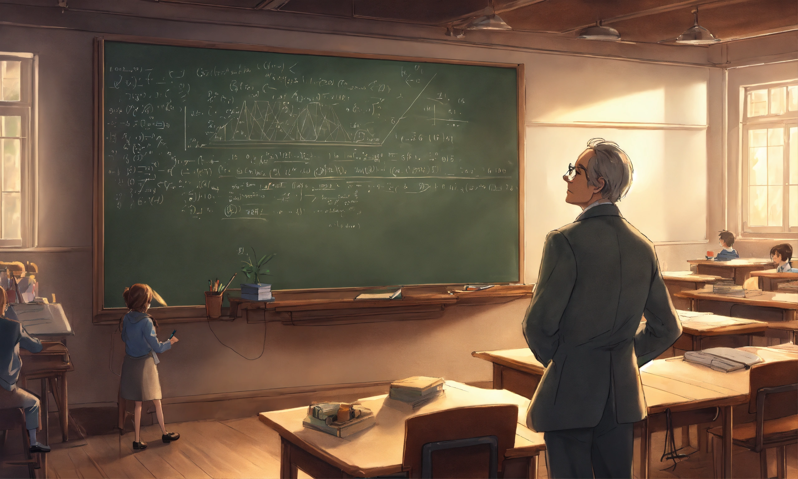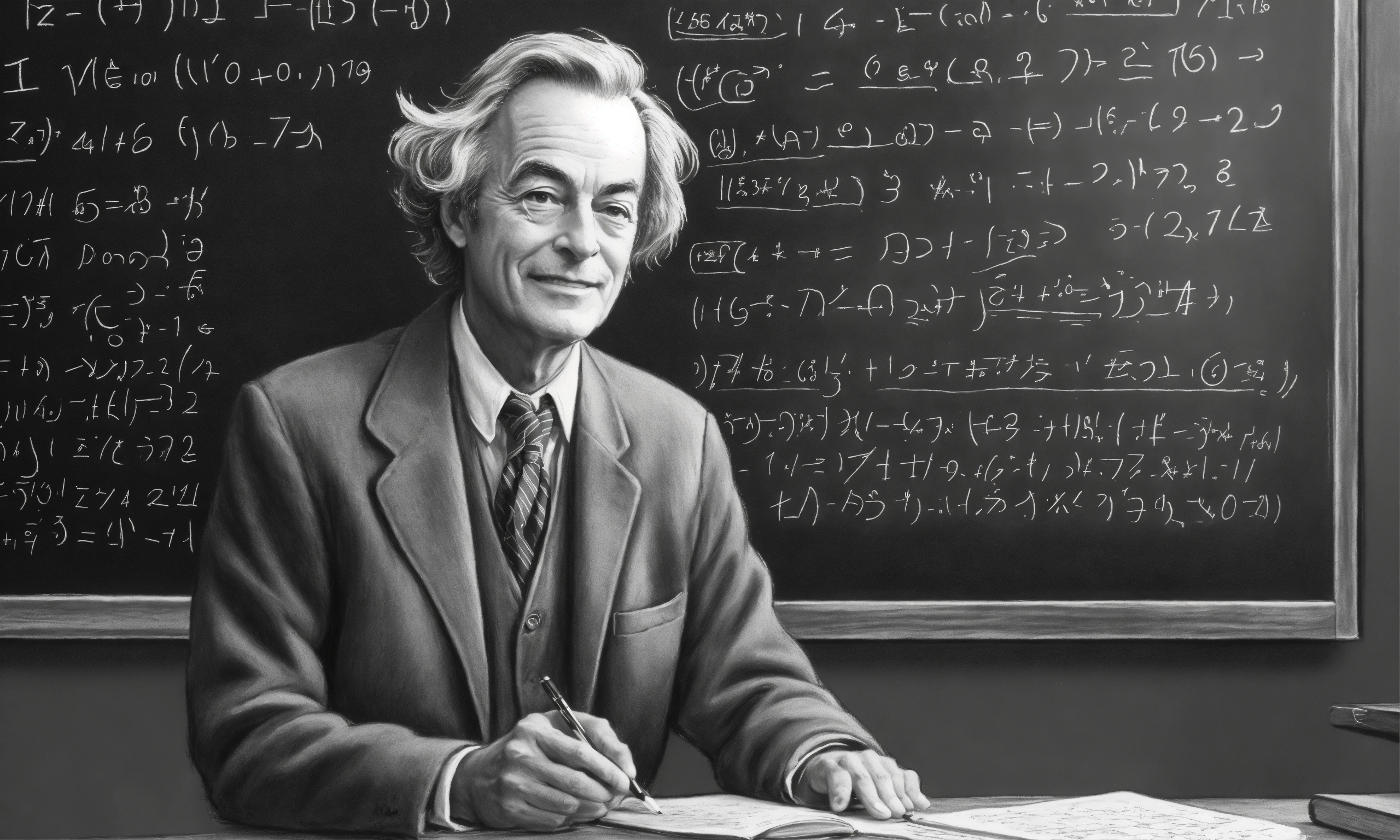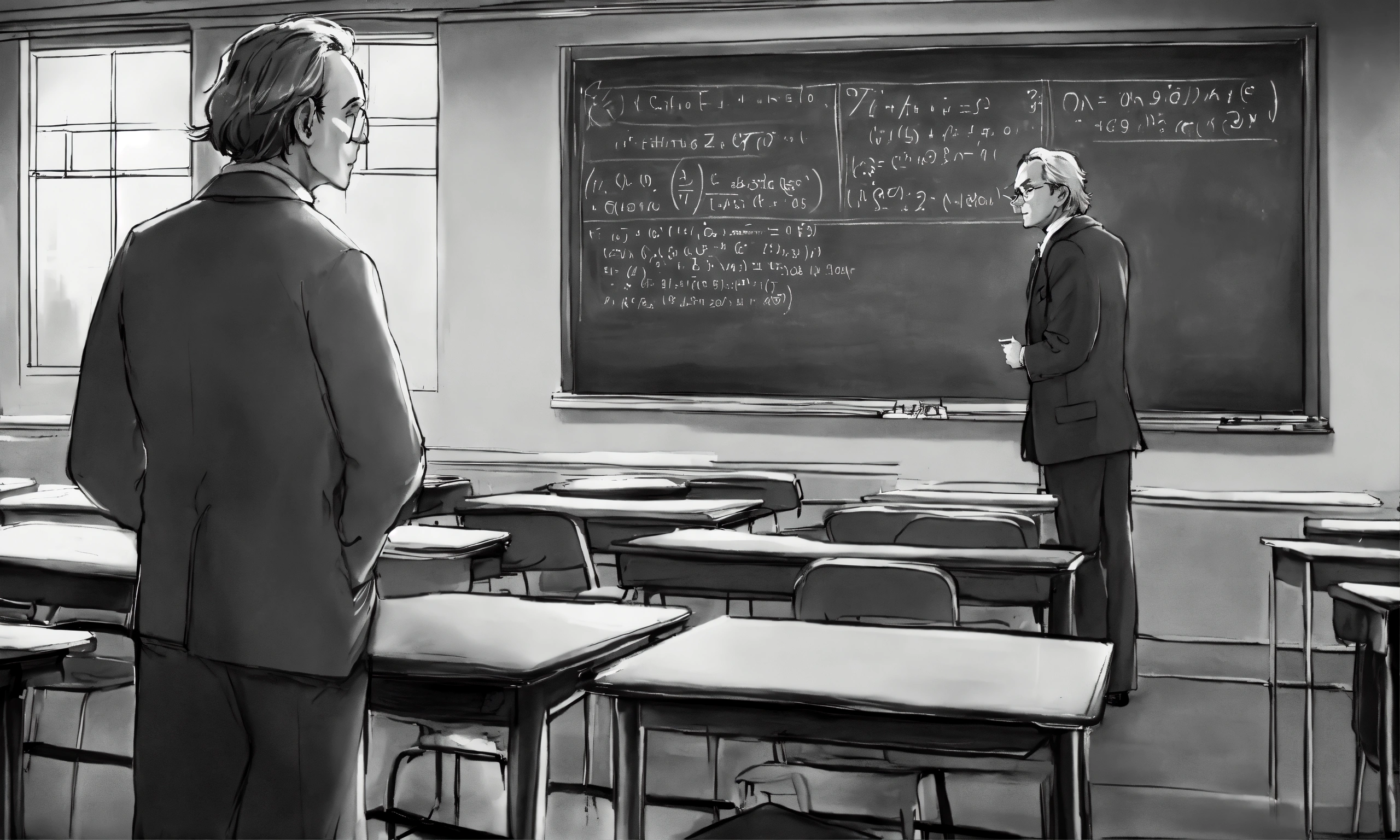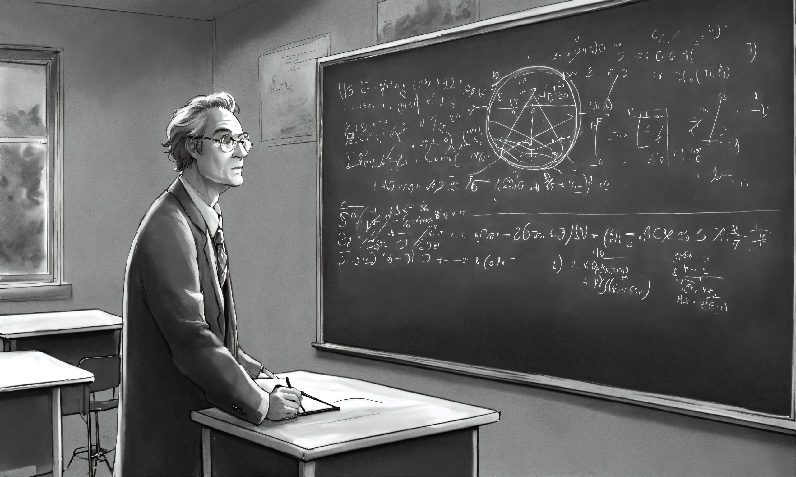 Professor at a chalkboard in front of a classroom doing math greyscale anime richard feynman pastel art