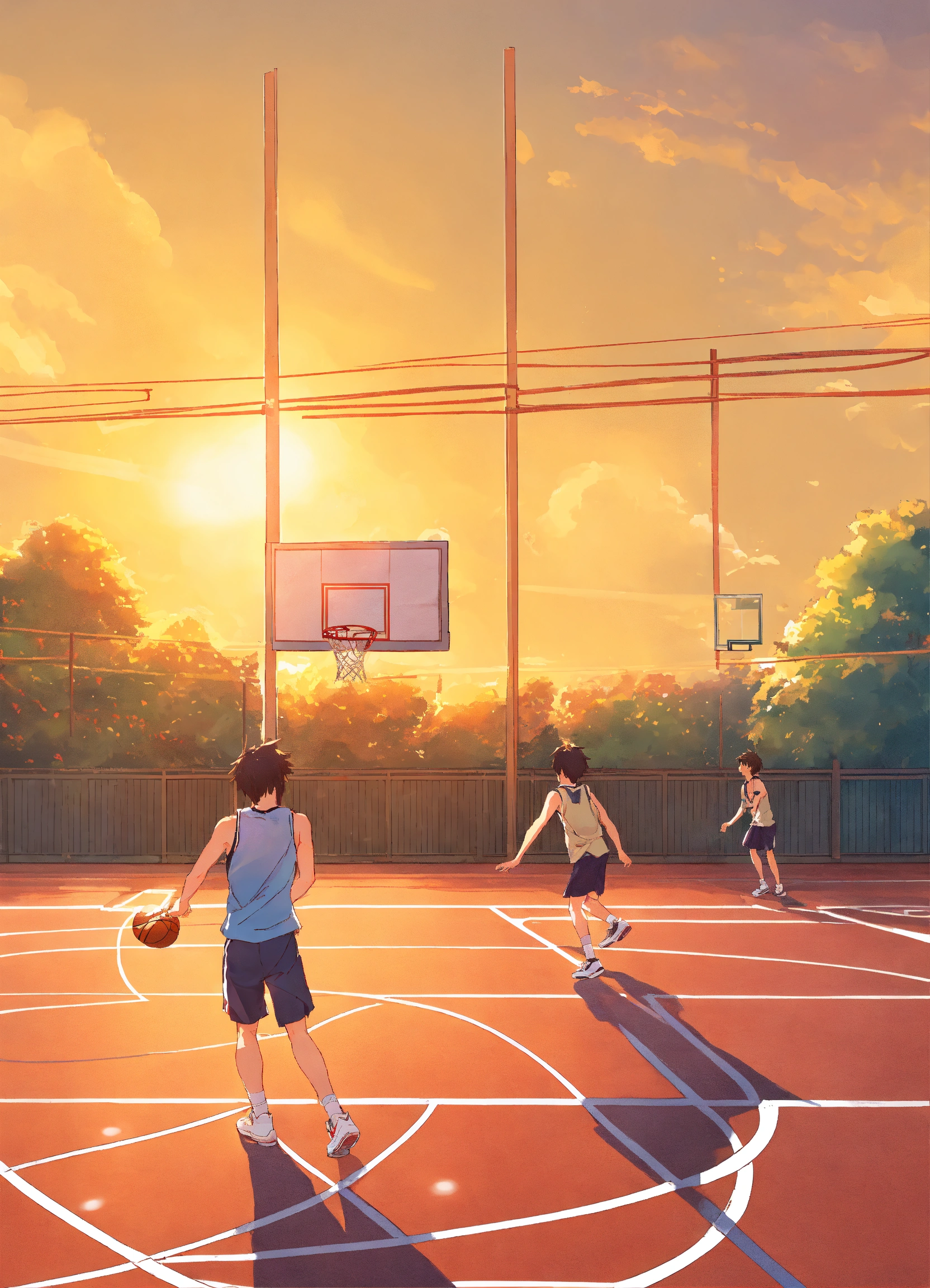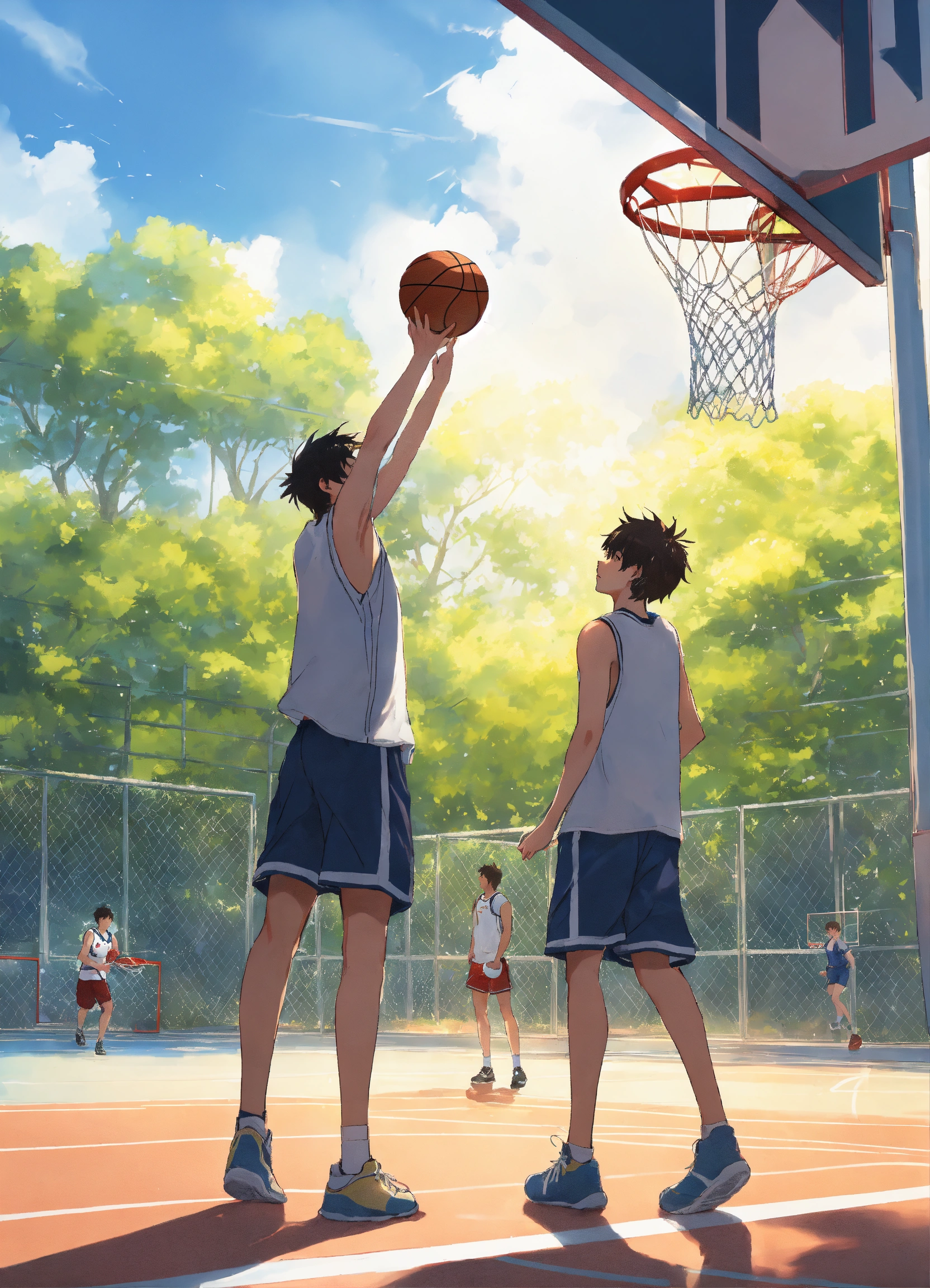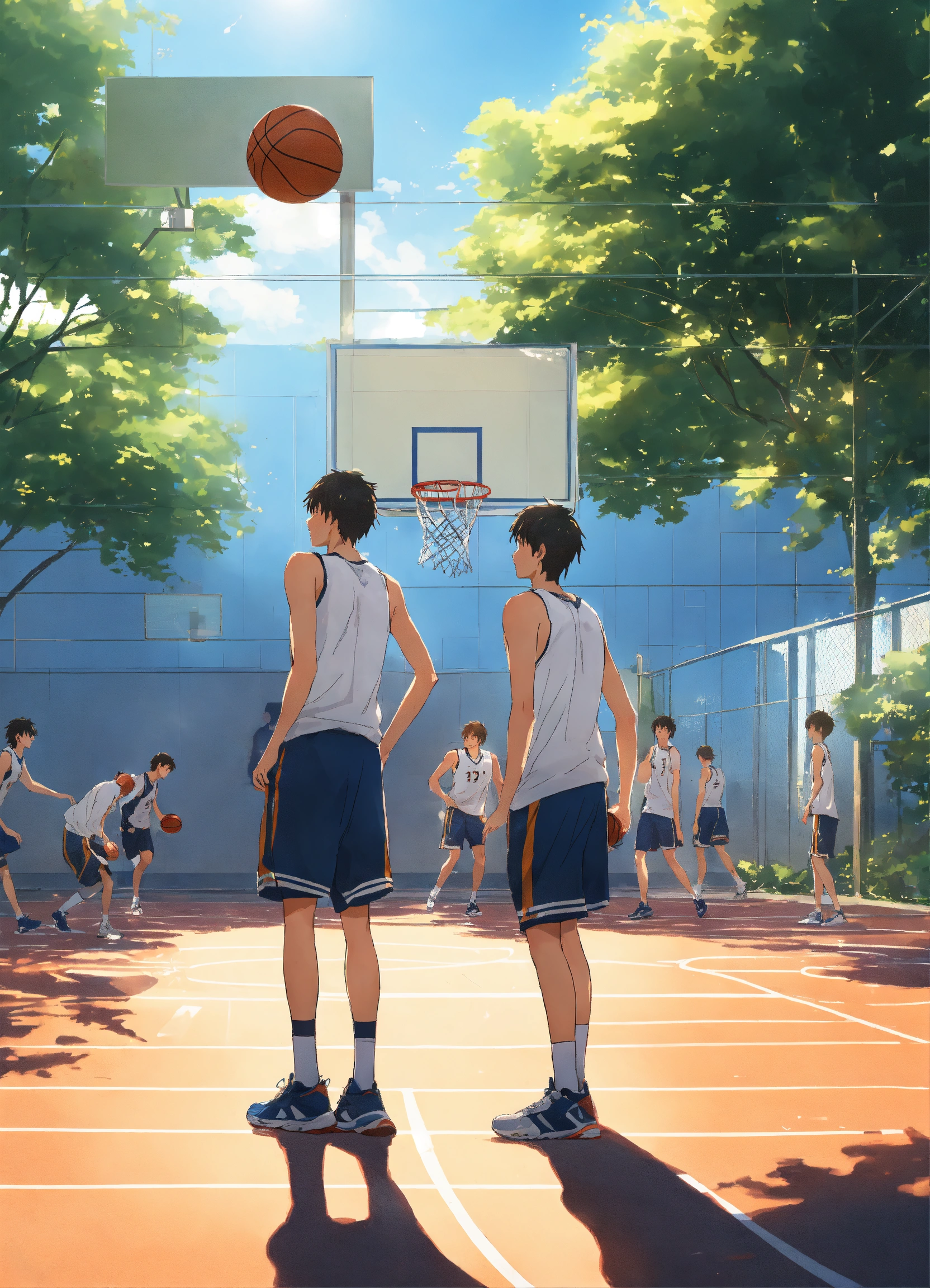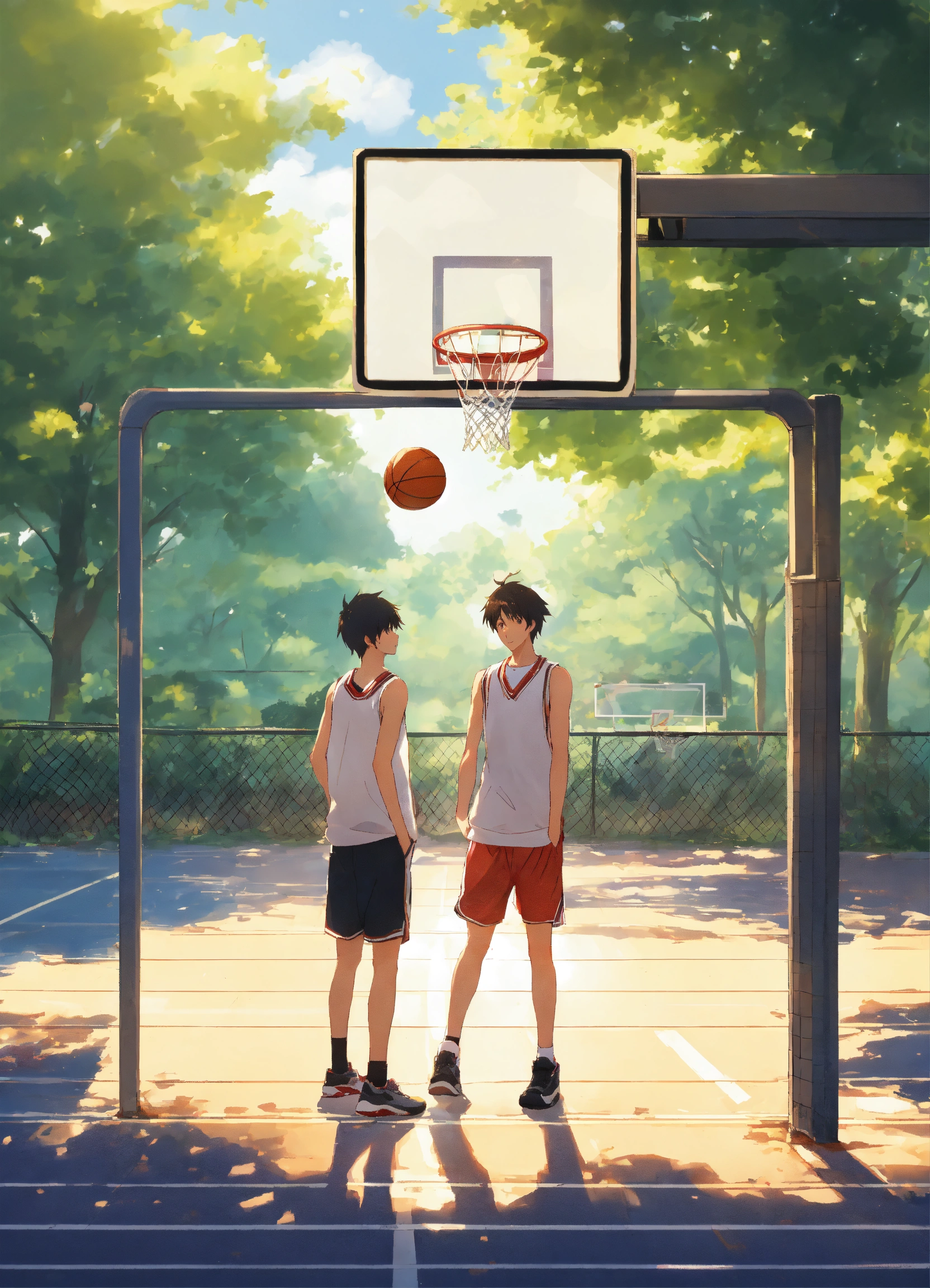 On a bright and sunny day, two male classmates were playing basketball on the school's basketball court. makoto shinkai style