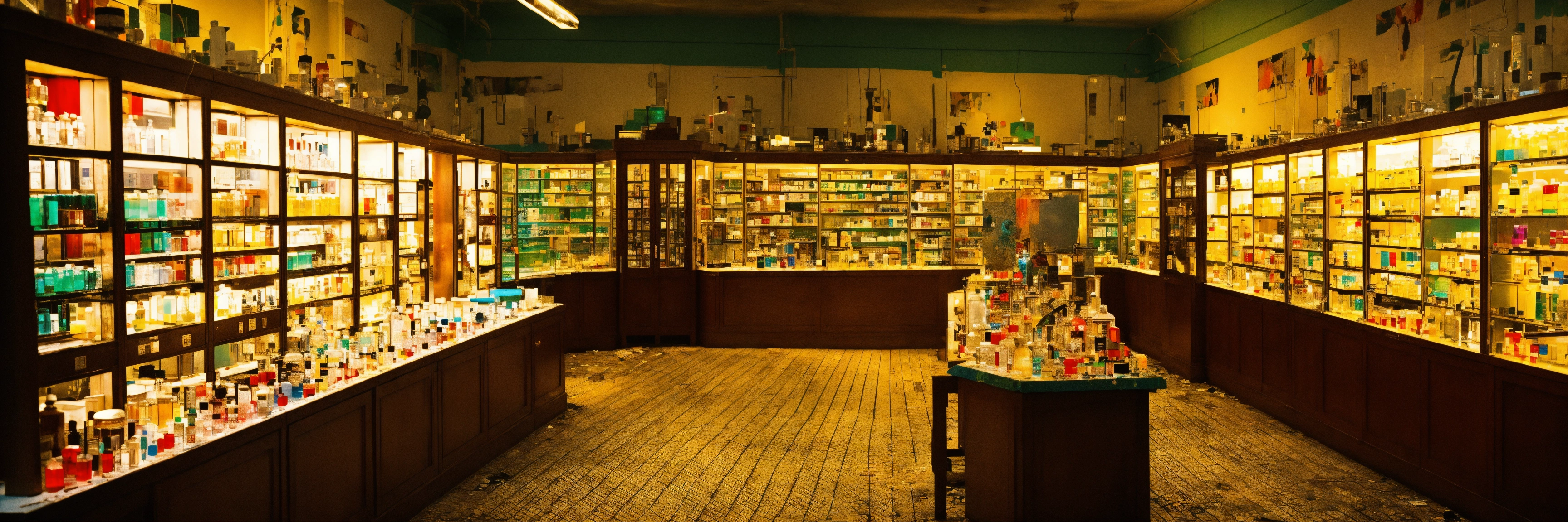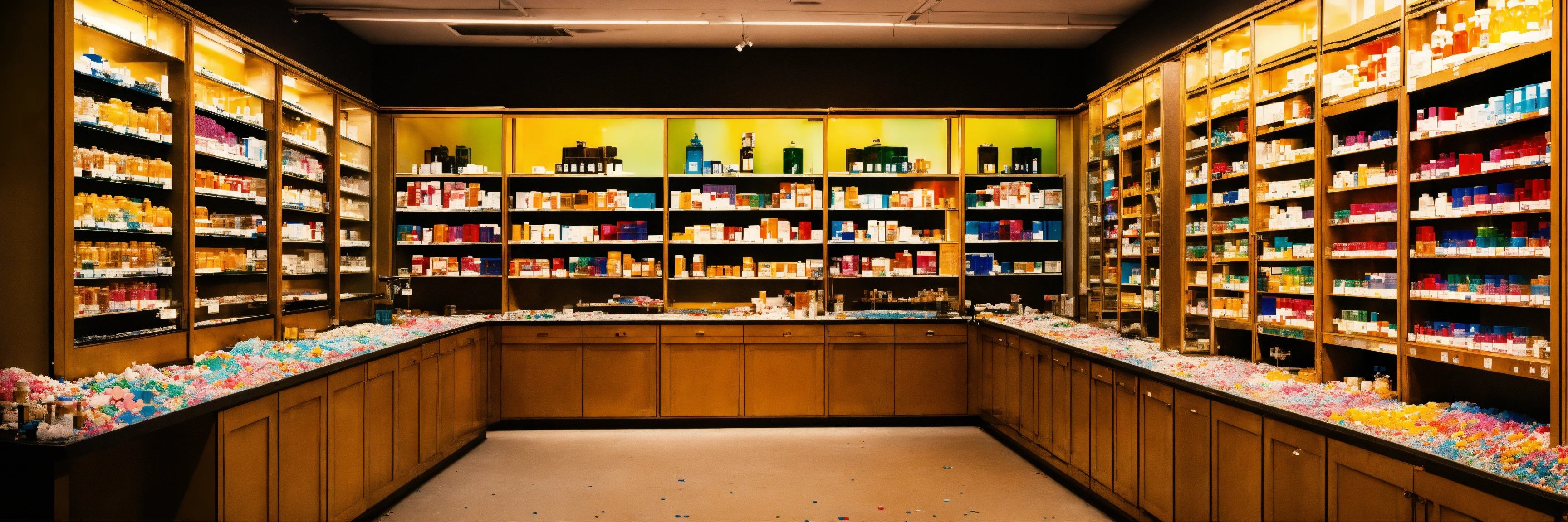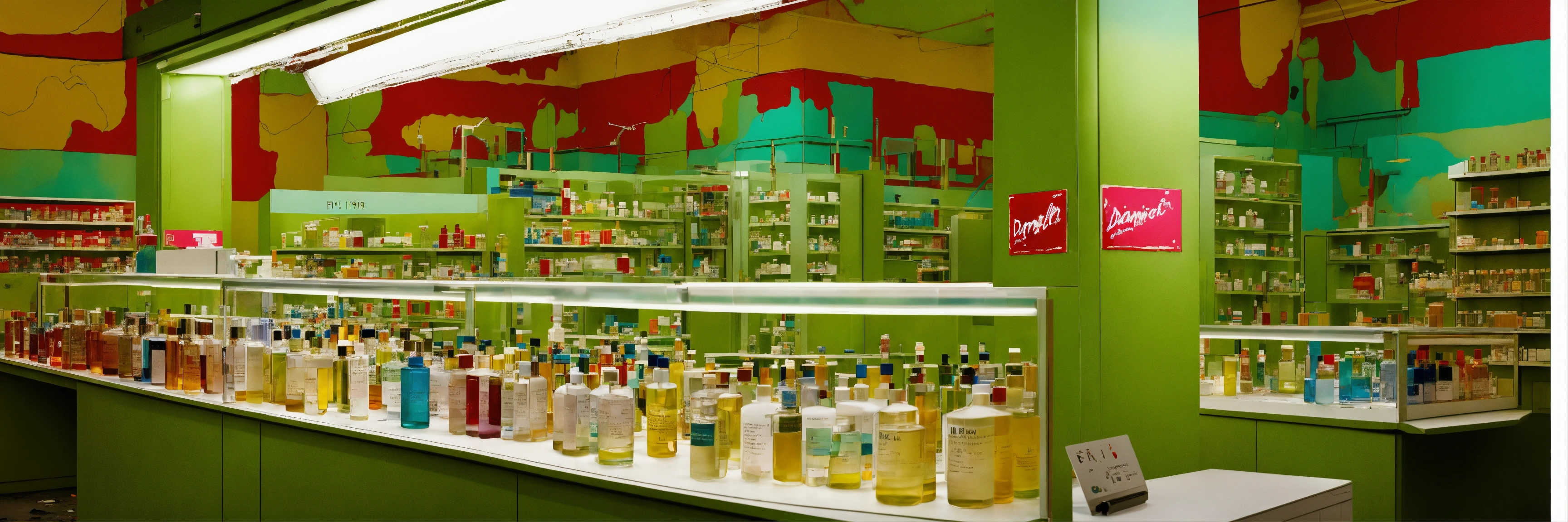 F in the style of artist damien hirst, an artistic scene reminiscent of his iconic work 'pharmacy' (1992). destroyed, explosed in thousand of pieces a perfumery laboratory, nikon d5600 photography.