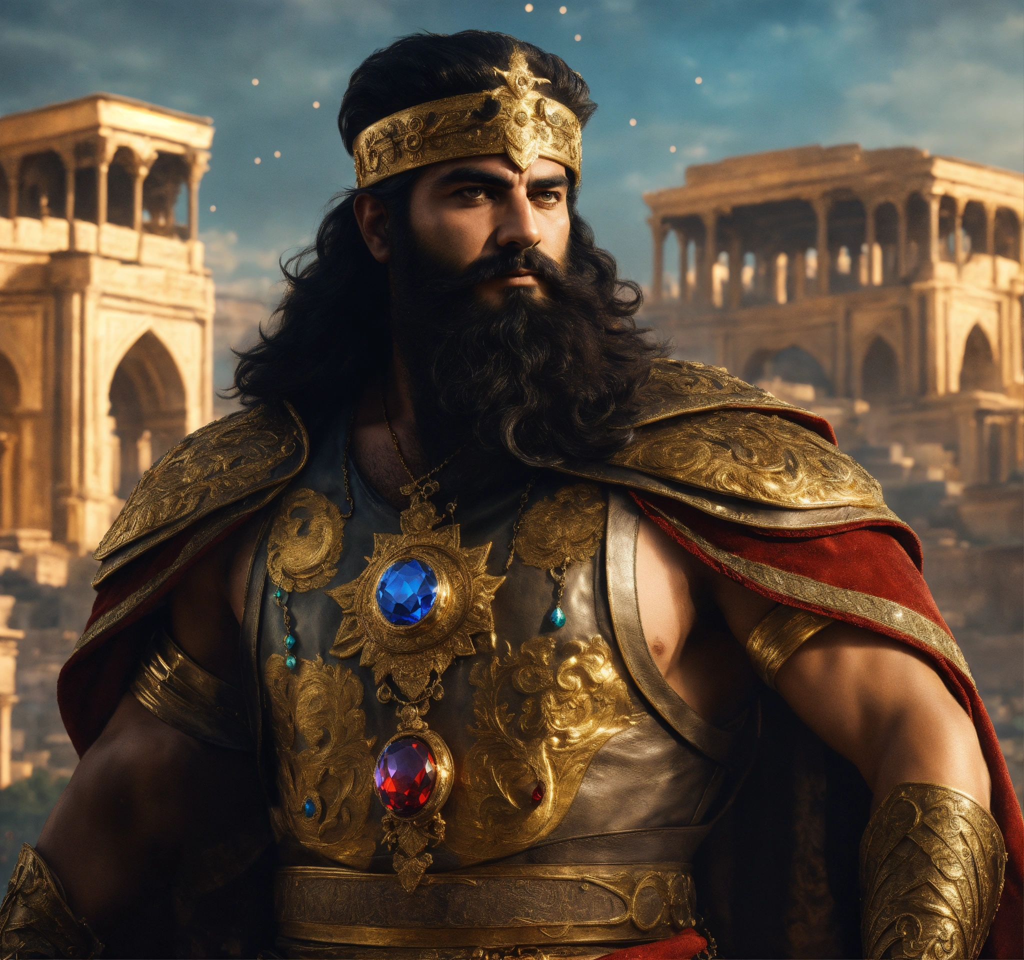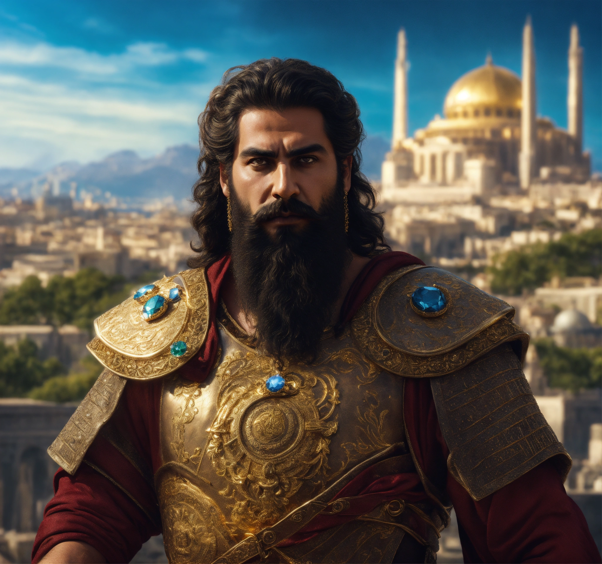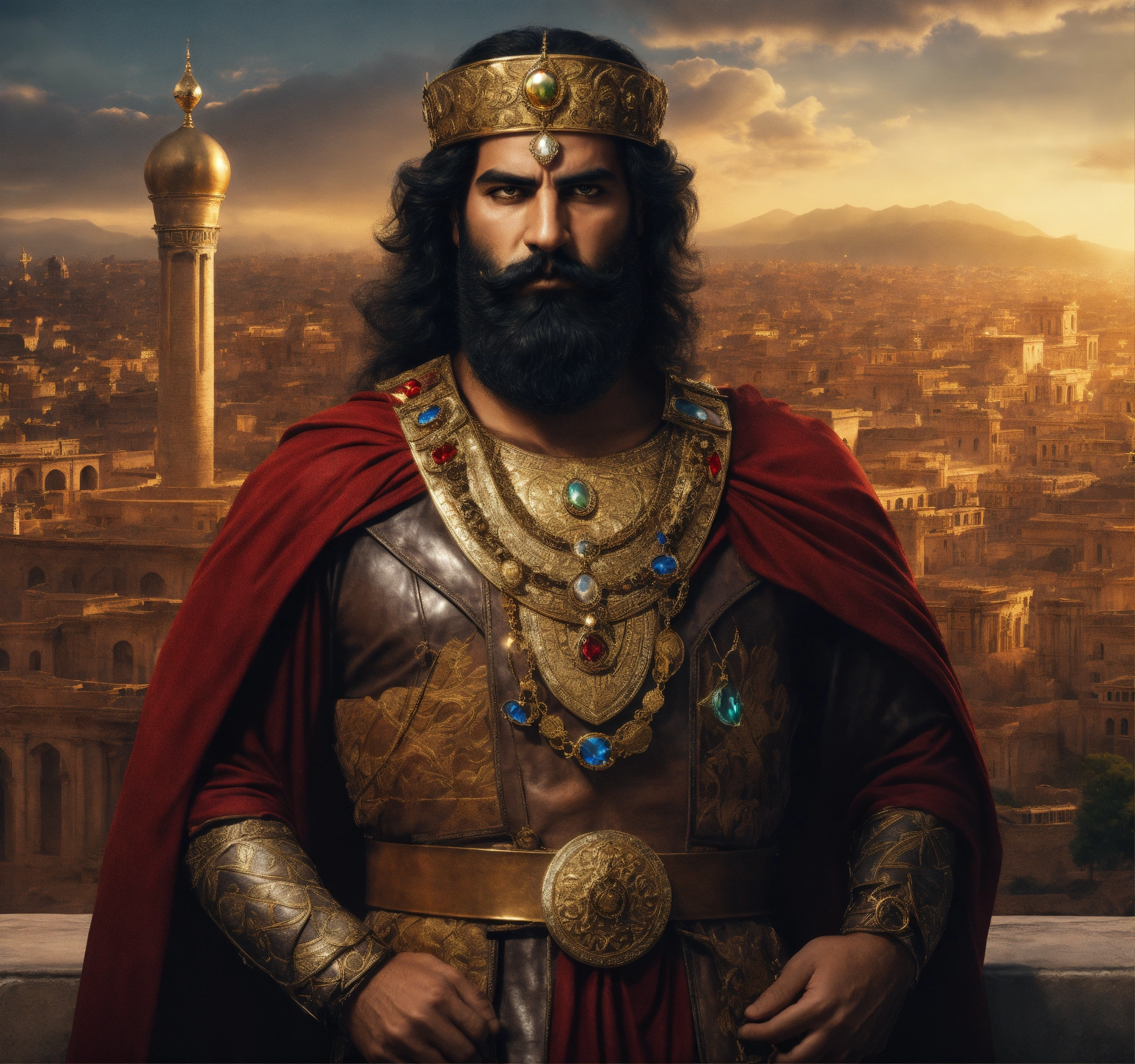Fantasy setting, a sinister-looking wise persian male royal, with a large beard, wearing leather, gold circlet with precious gems, large roman like city in the background, body shot, highly detailed, digital graphic art, top-rated, sharp, no blur, edited, corrected