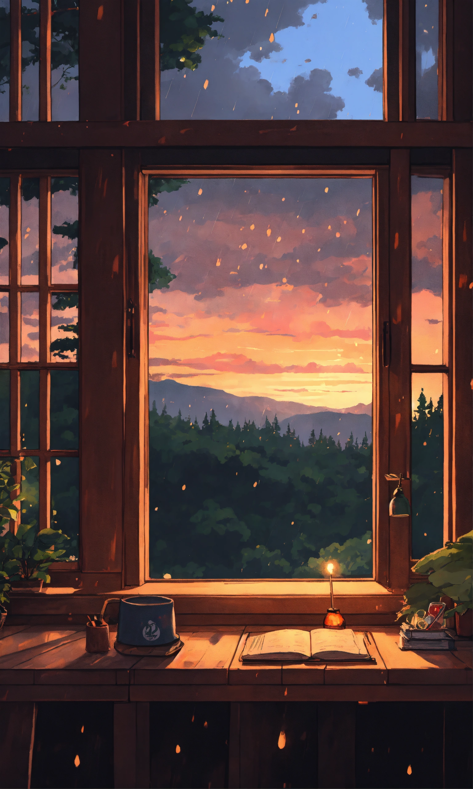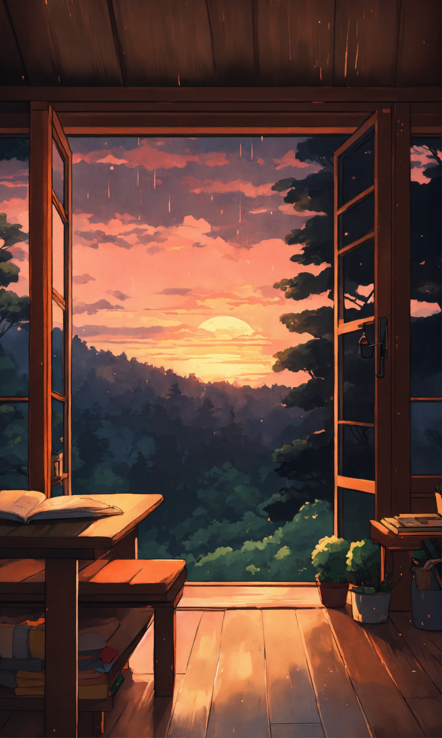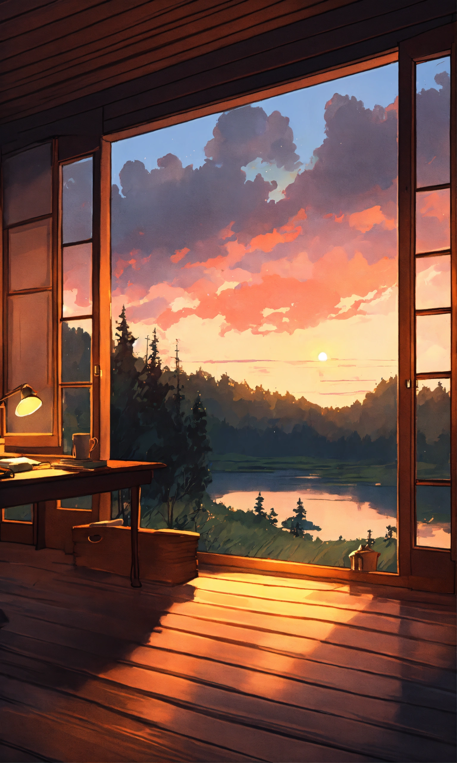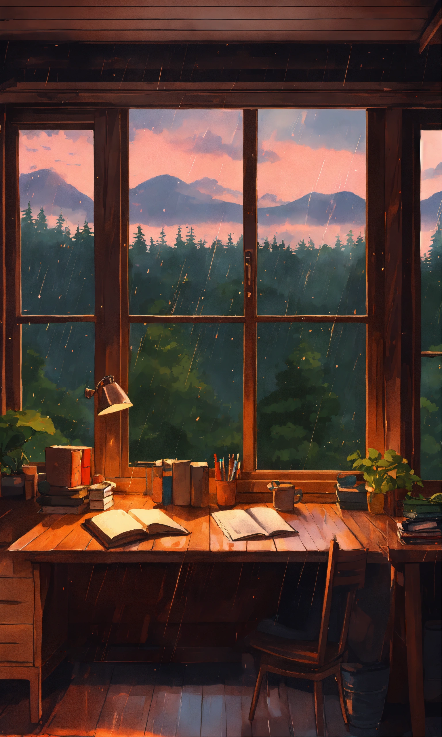 Cozy wooden nordic cabin, anime, studio ghibli, minimalistic, raining outside, dark cloudy evening sunset, big window view with study desk, washed acrylic image, forrest outside, anime lofi artwork