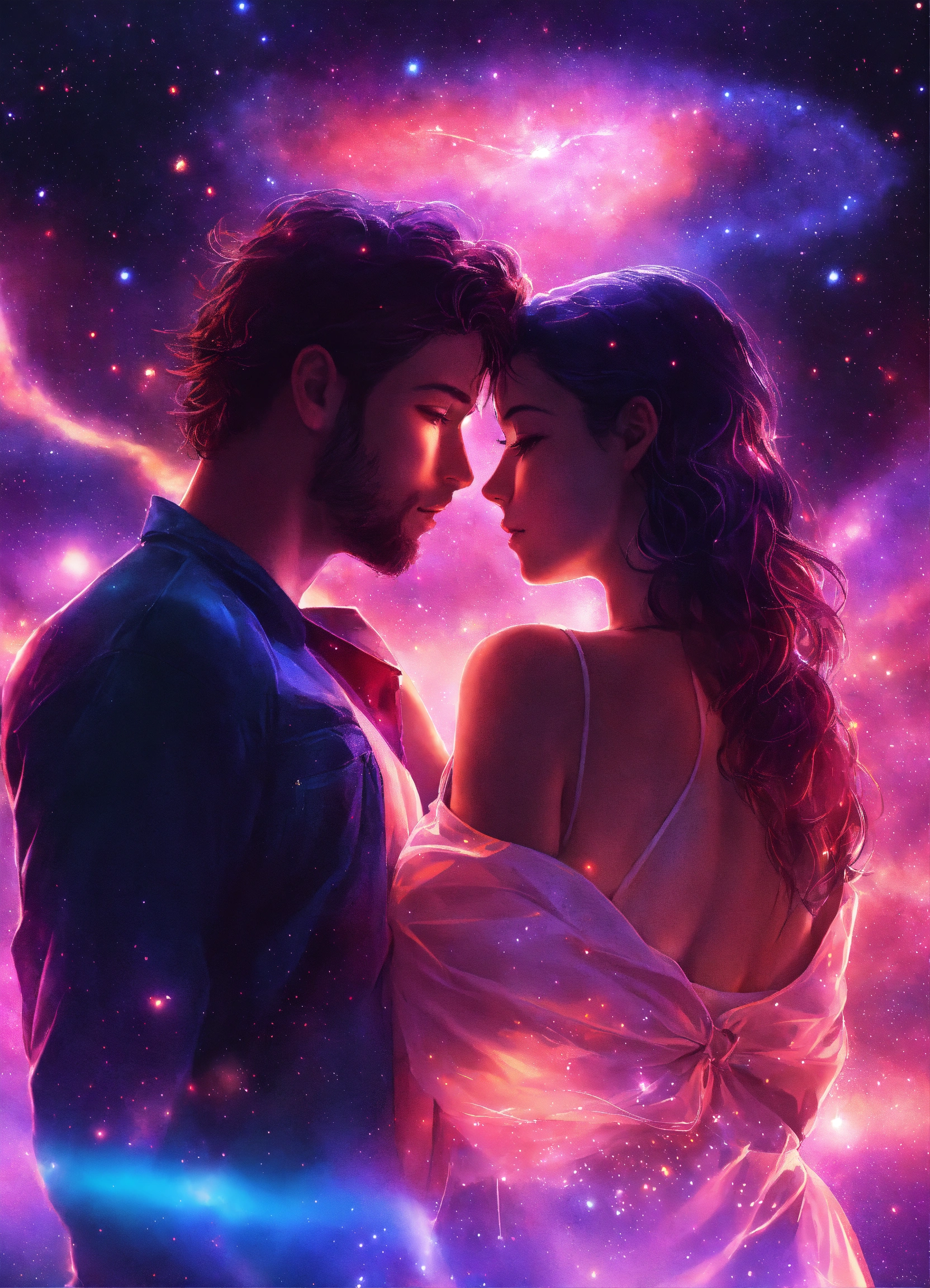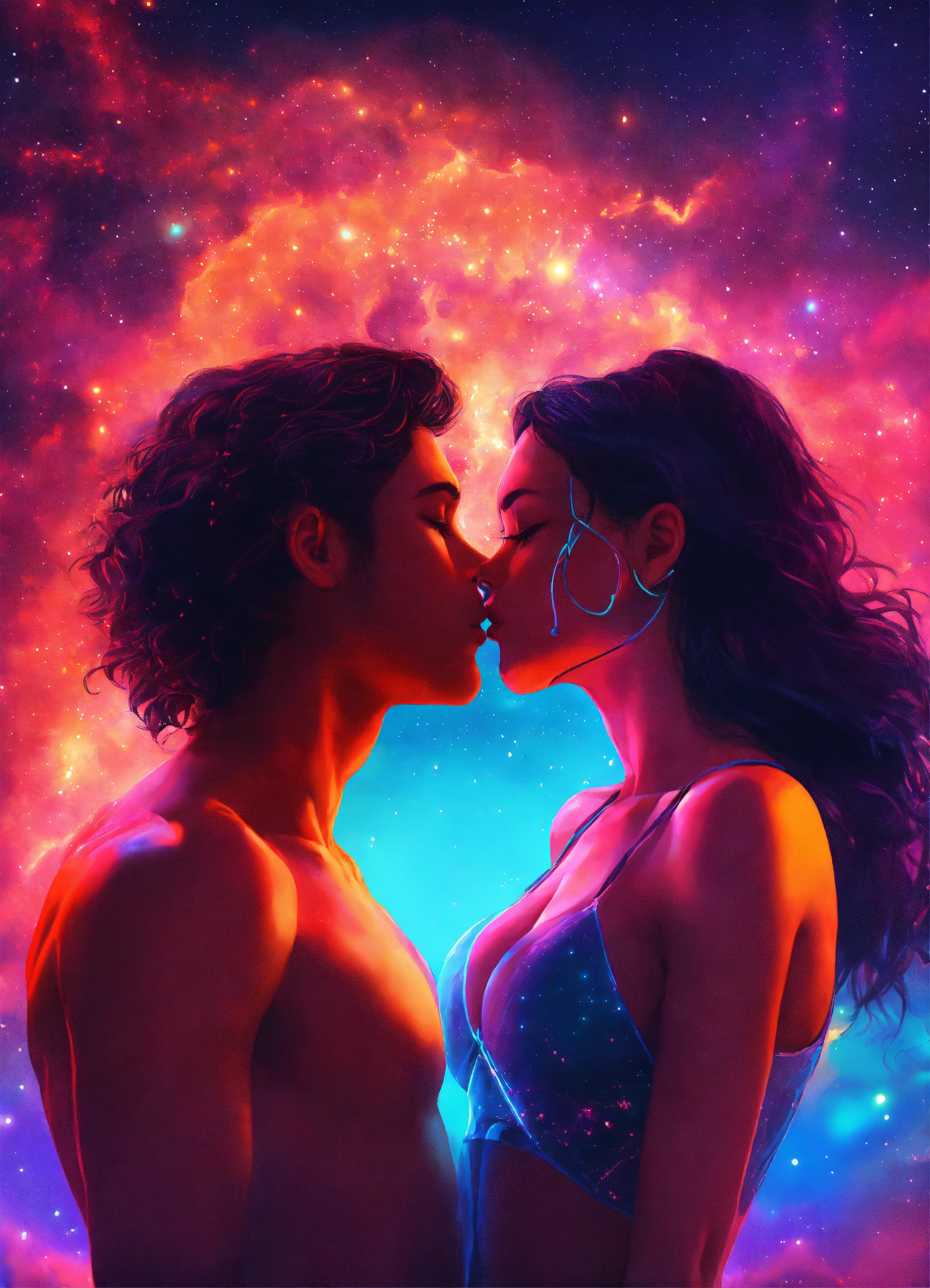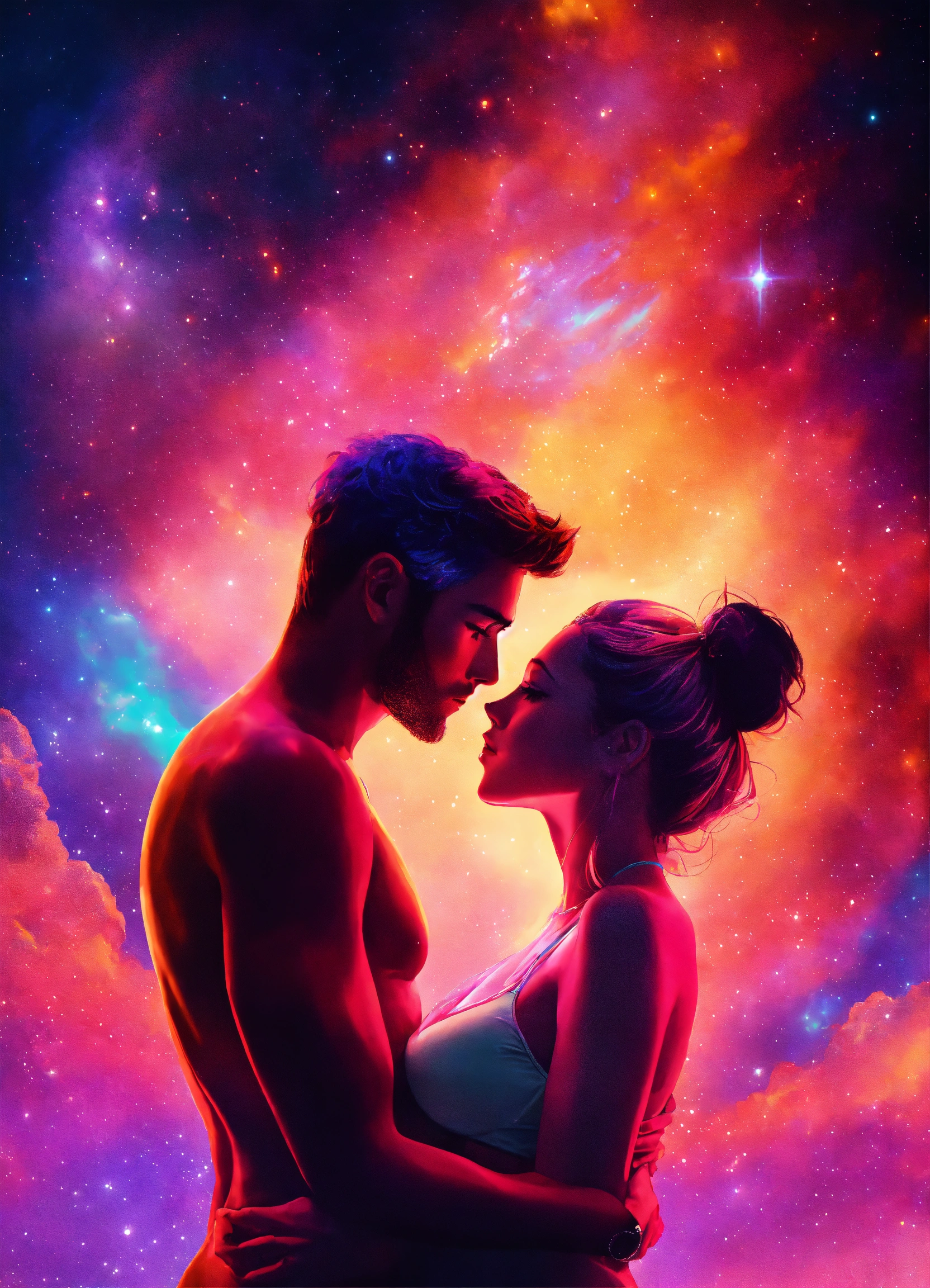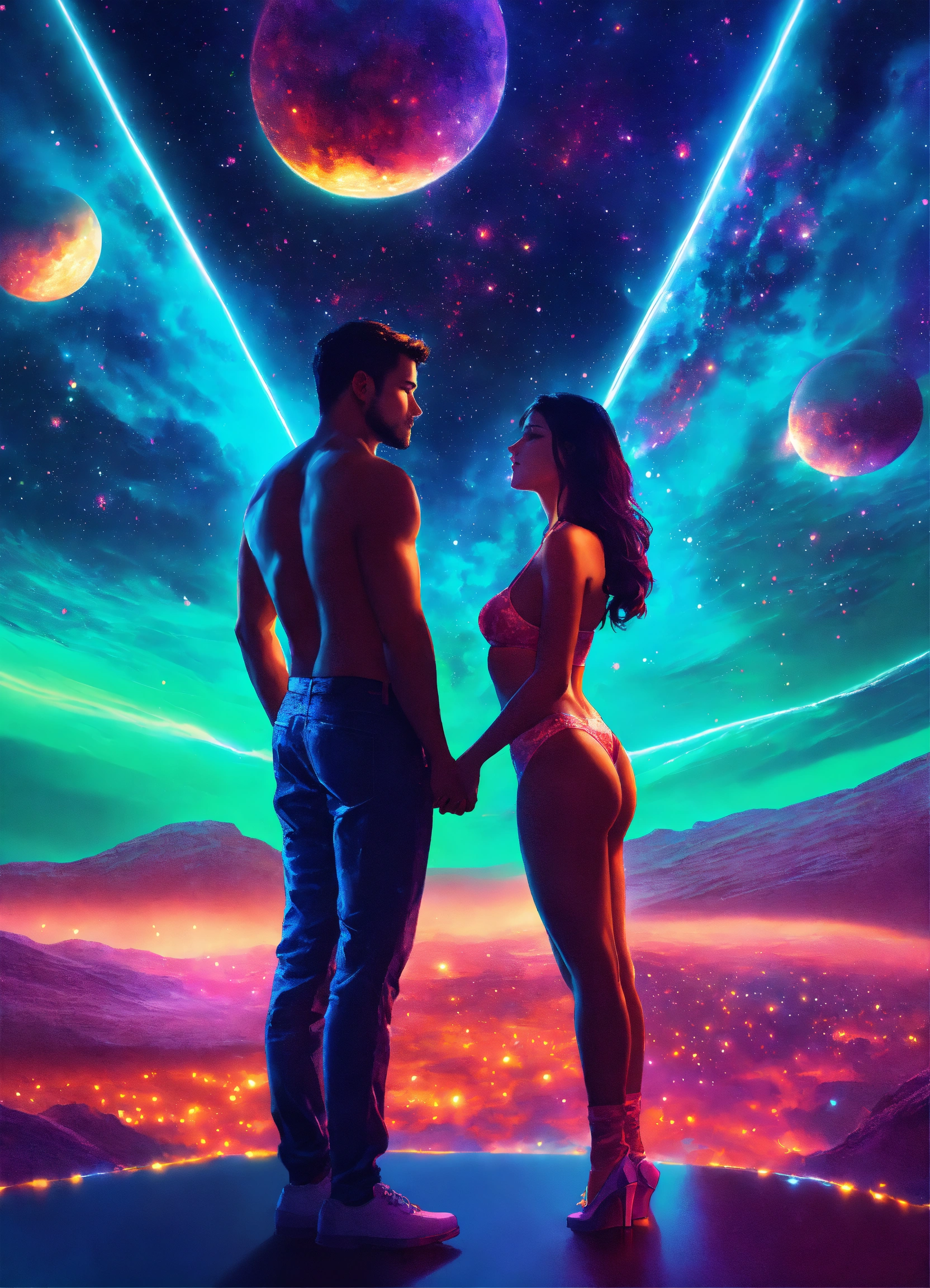 A woman and a man wearing underware in cosmos sharing love in a soulmate way watching a nebula sharing love in a soulmate way . neon lights lightly illuminate . realistic, cyberwave, future
