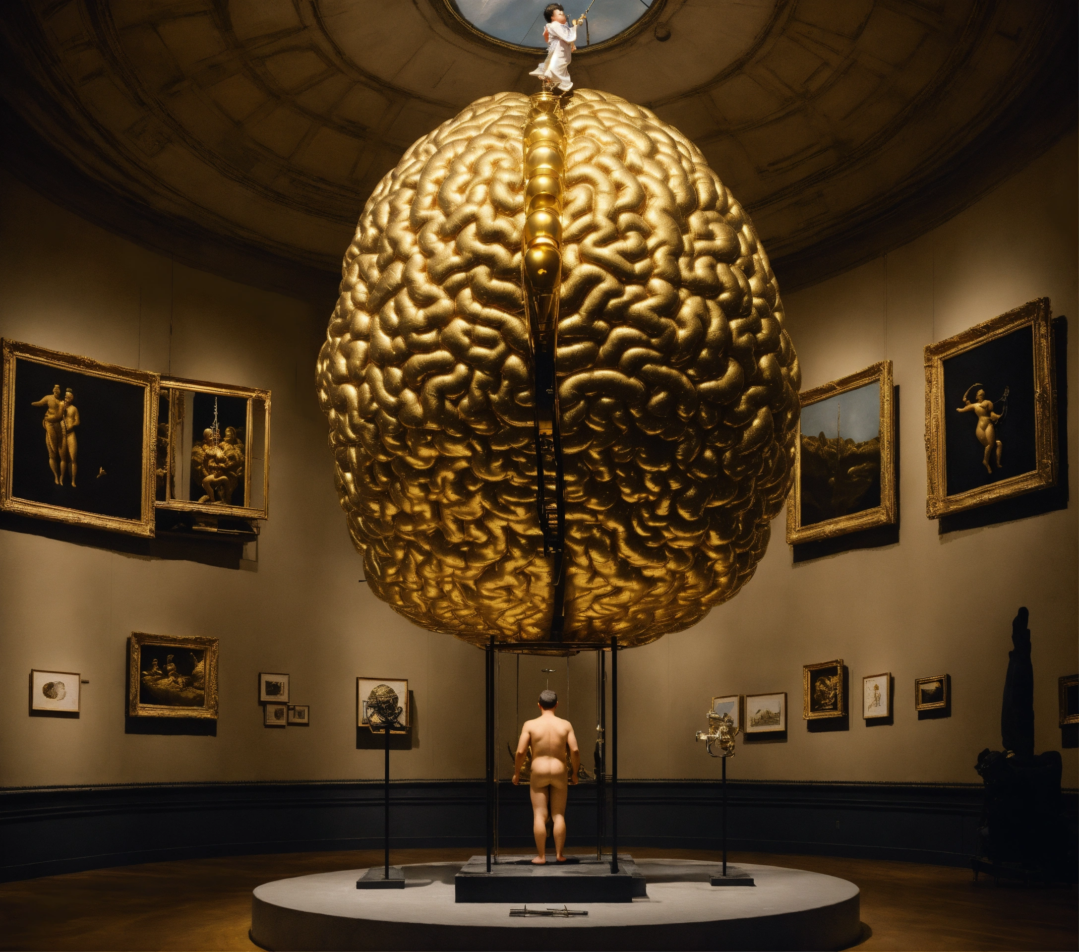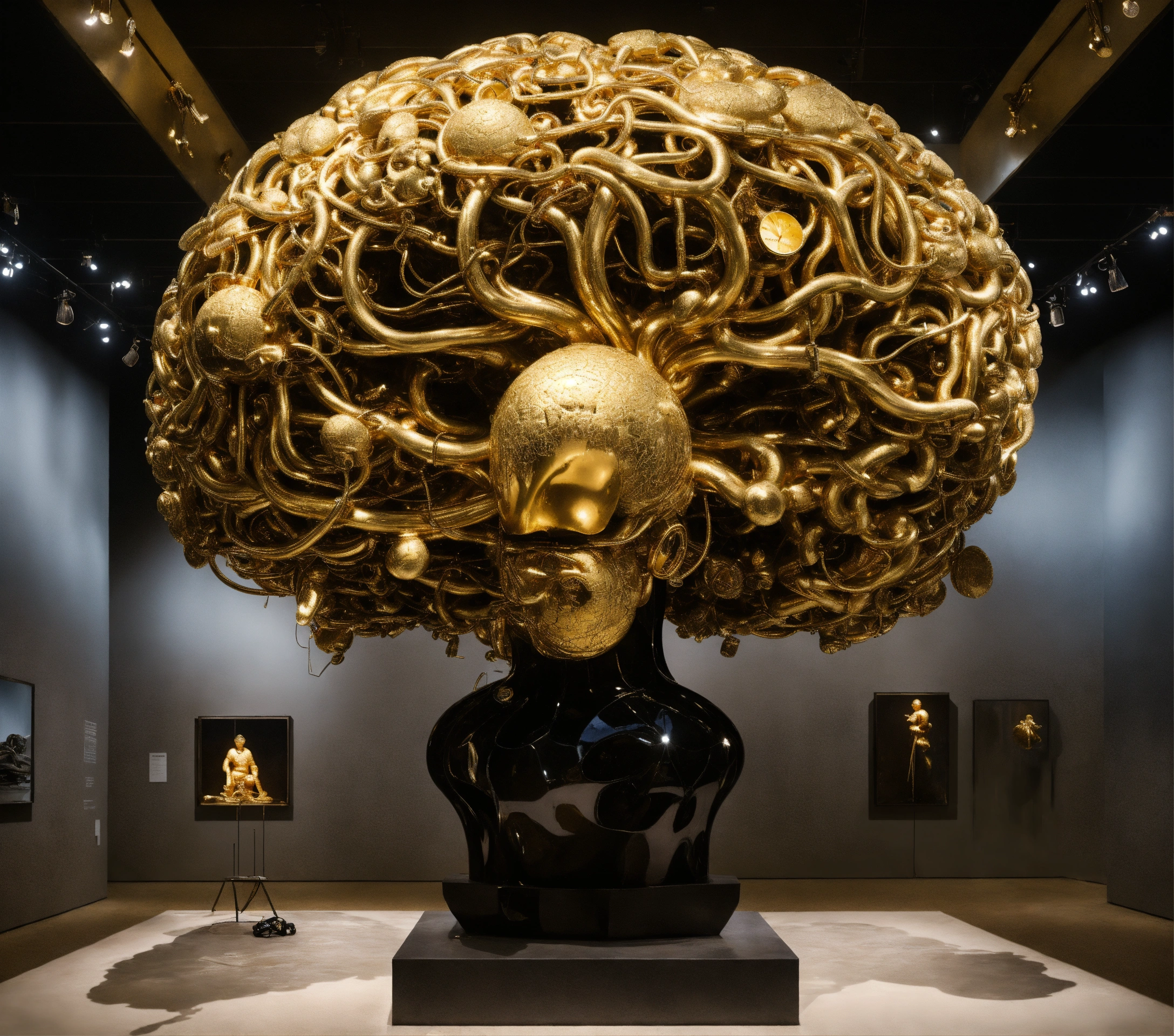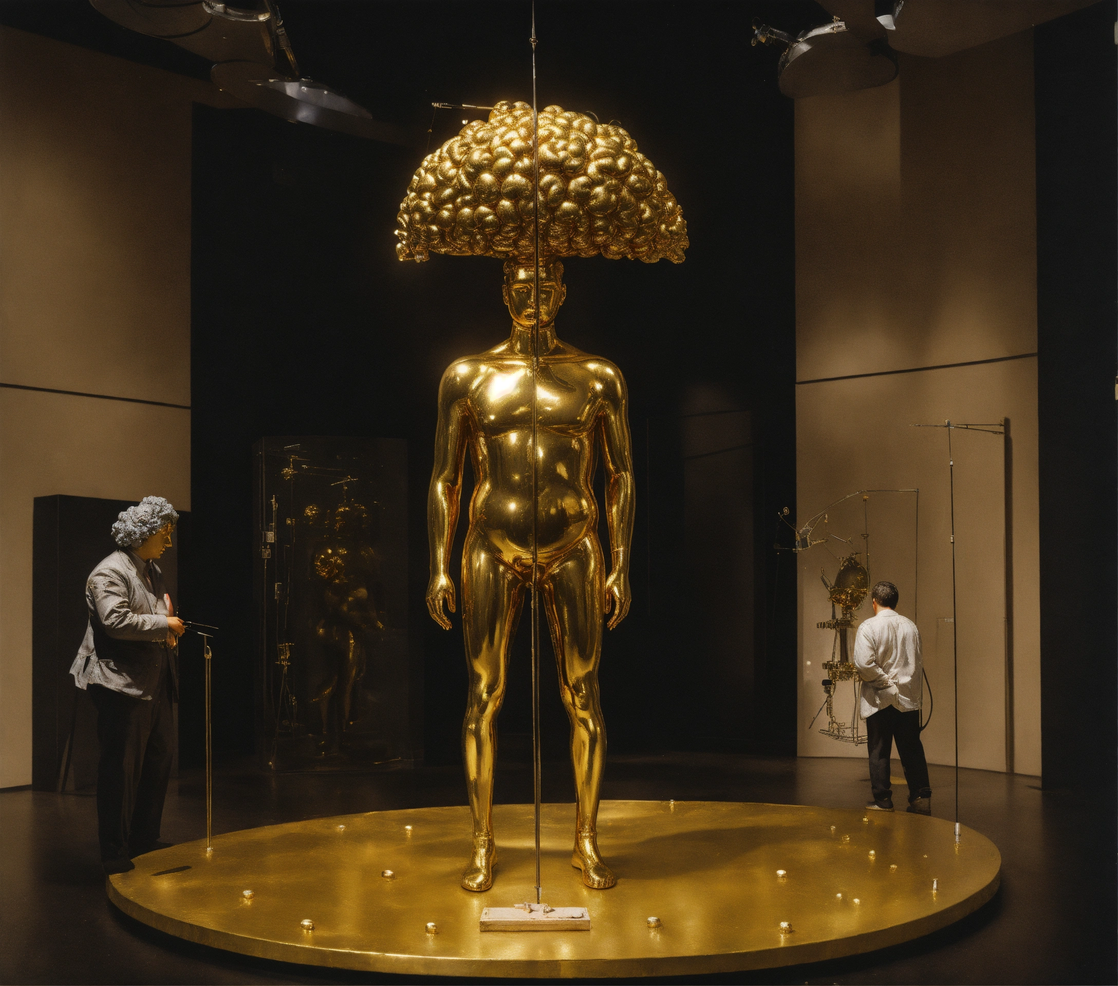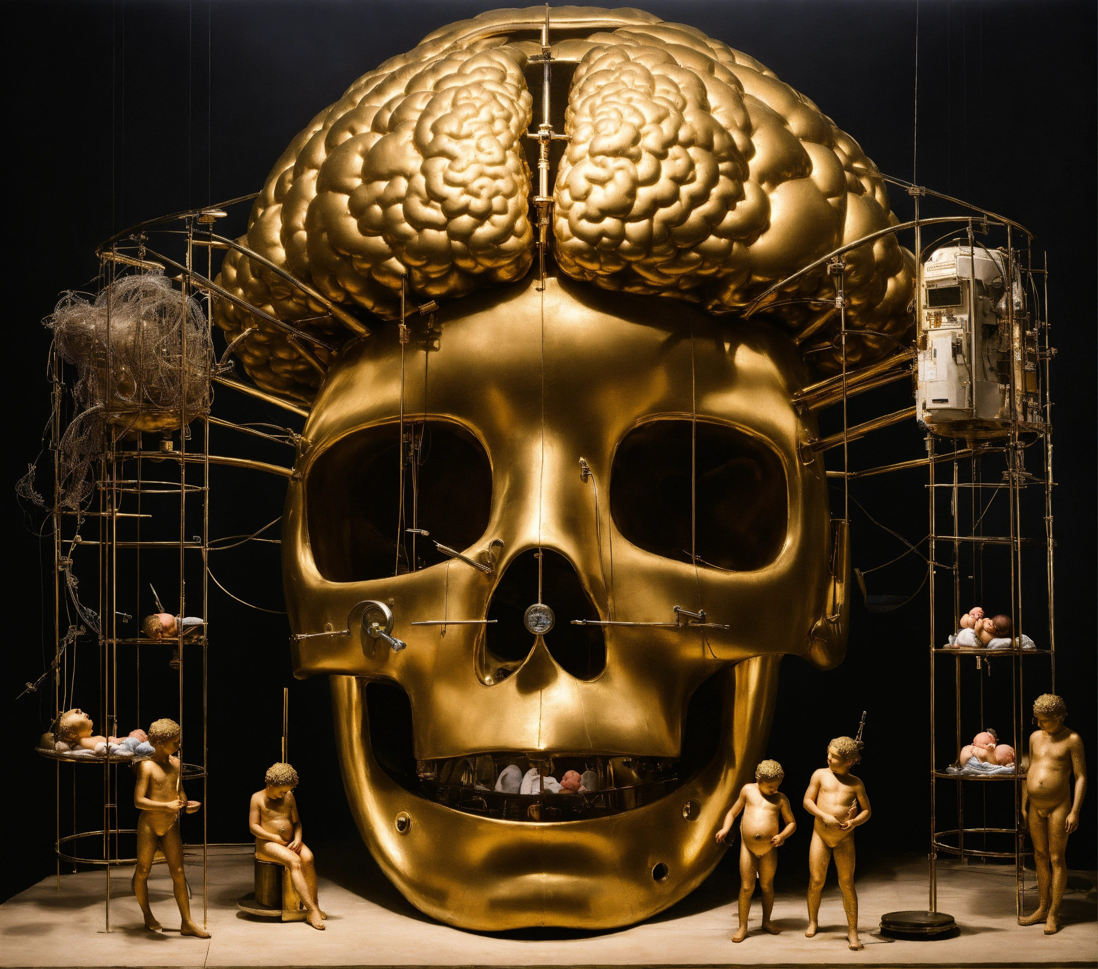 A huge golden brain supported by very small beautiful human bodies, complex surgical instruments, and a newborn boy within a time vortex, war installation, black background, surrealism, symbolism, minimalism, sculpture by lucian freud, rene magritte, salvador dali