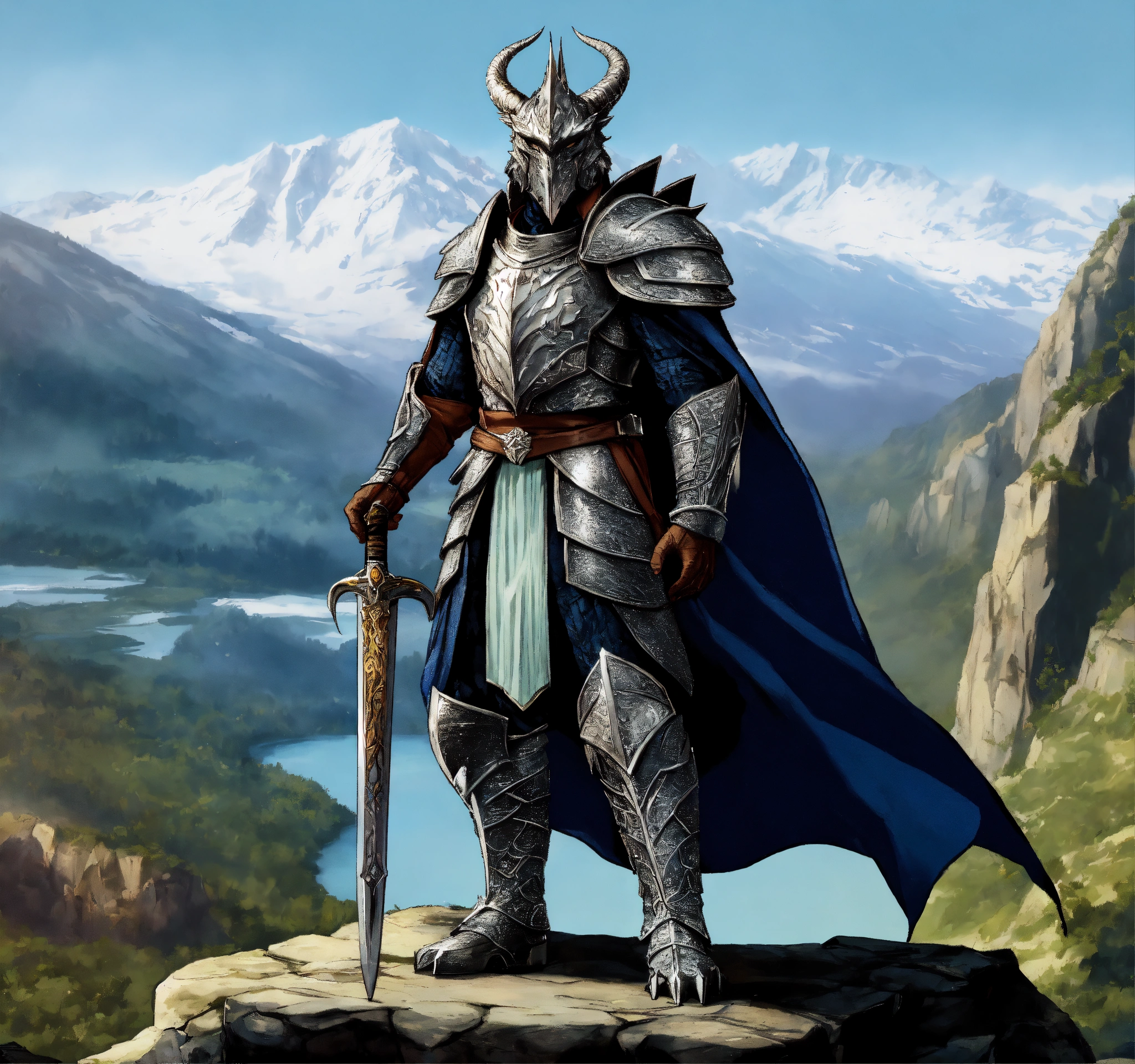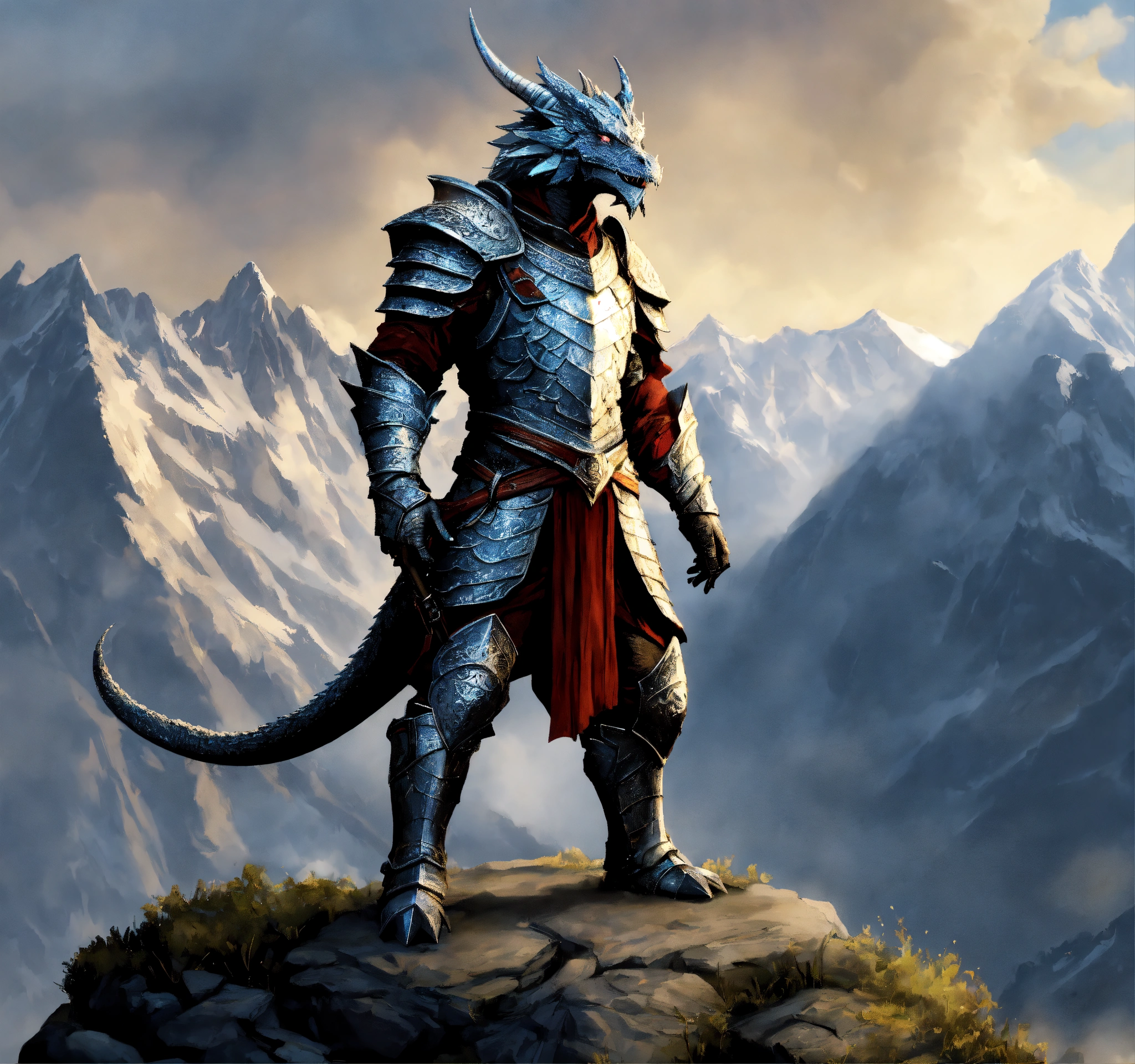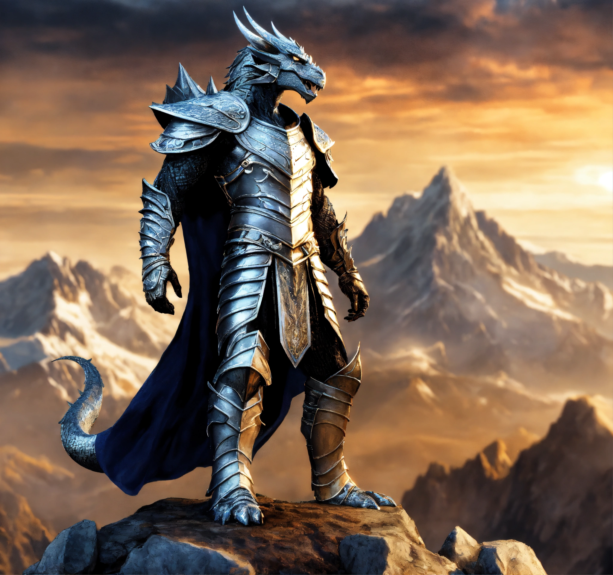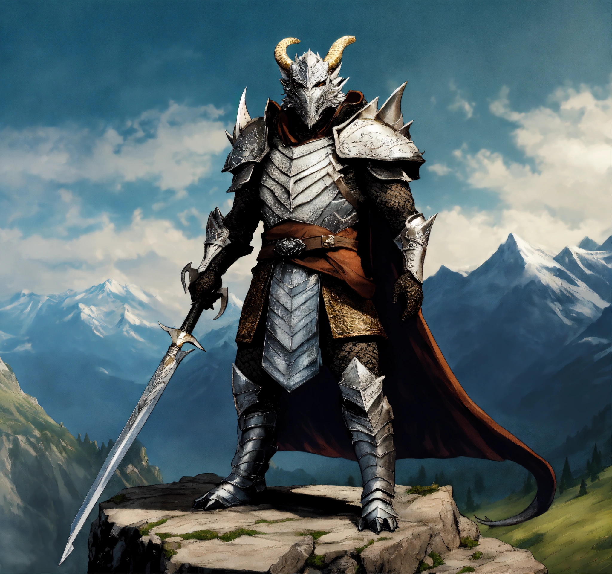 Fantasy setting, an enigmatic silver dragonborn king, standing in a heroic pose, towering mountains in the background, highly detailed, body shot, comic graphic novel art, top-rated, realistic, sharp, no blur, edited, corrected, trending