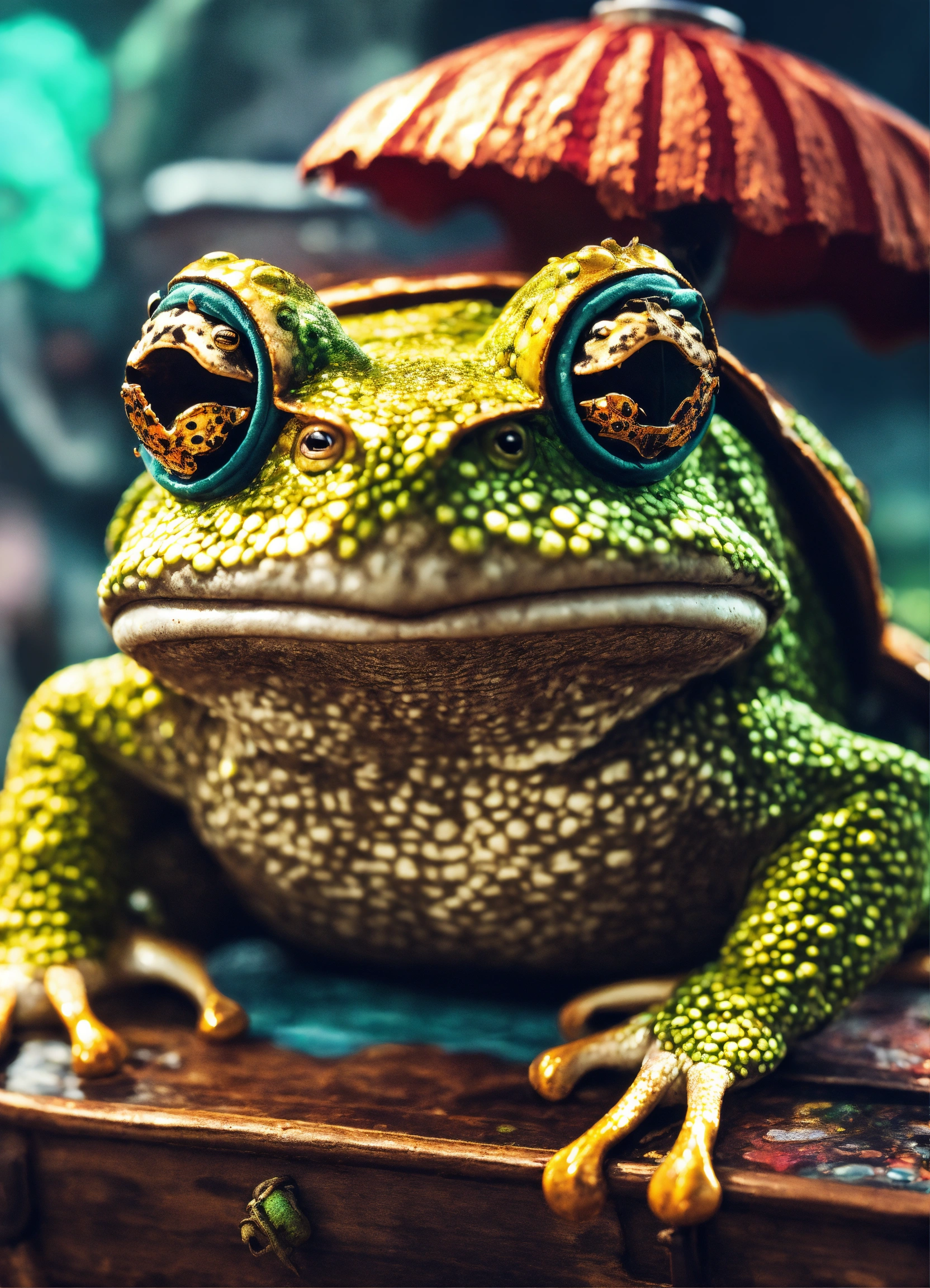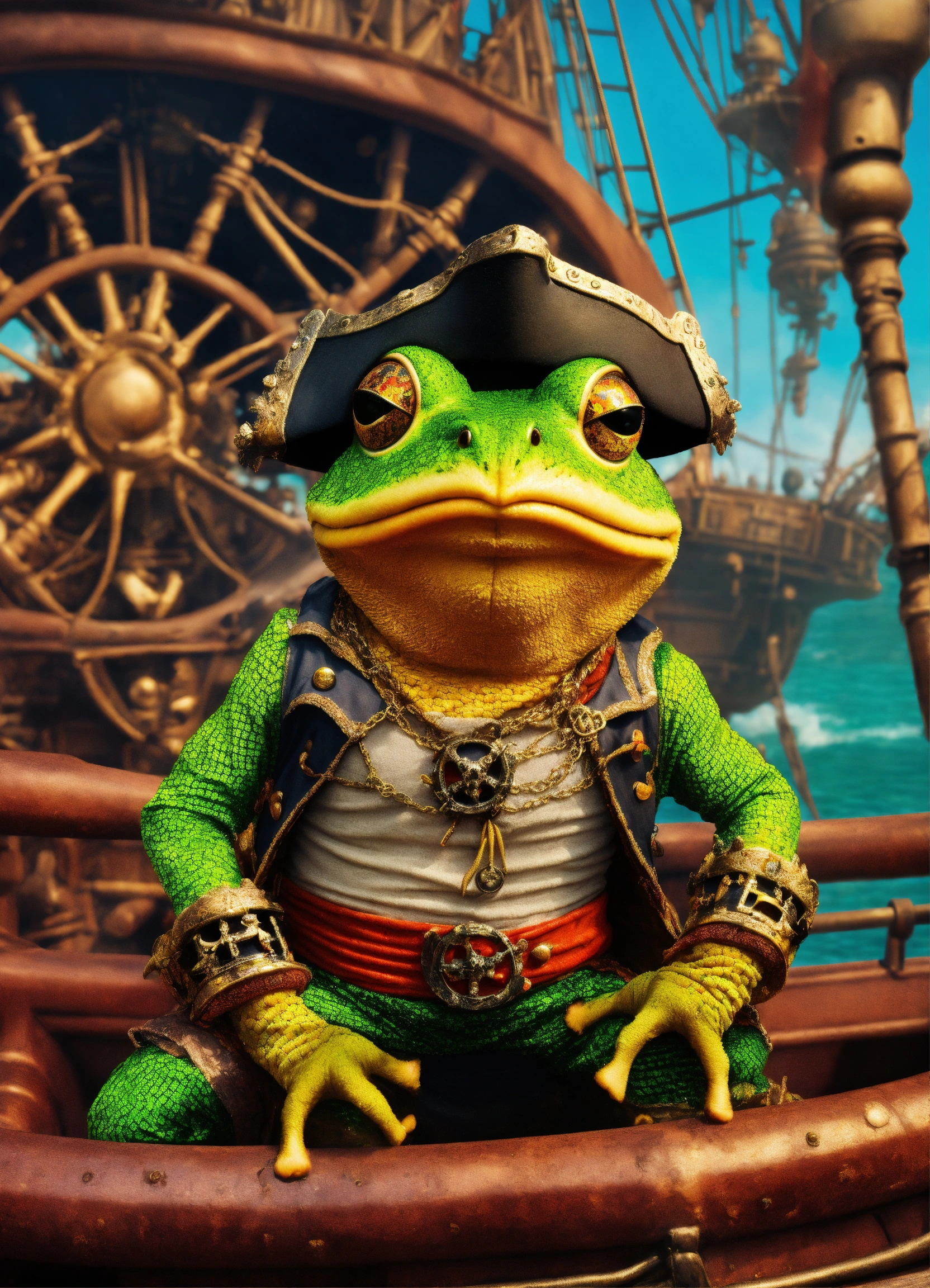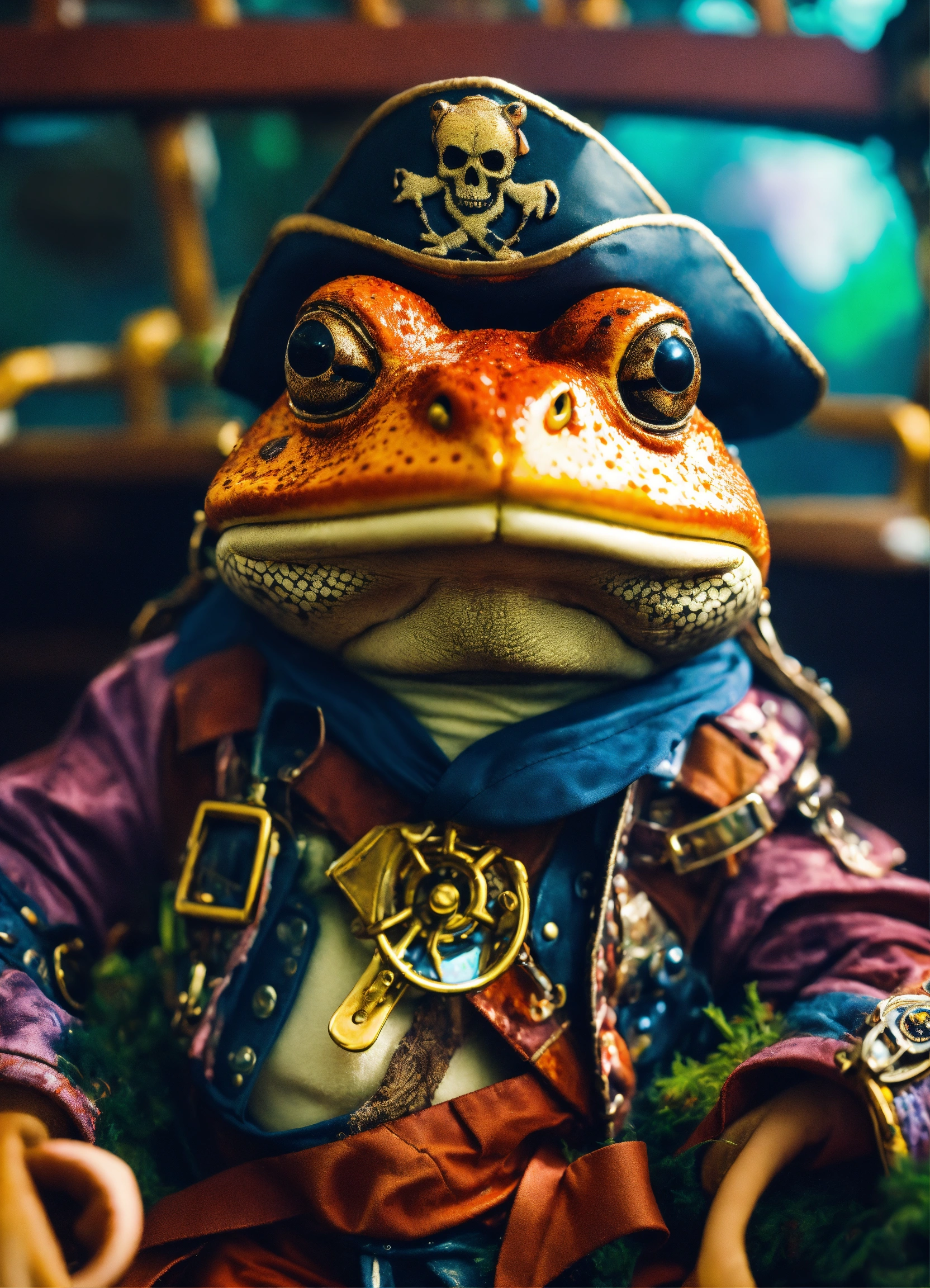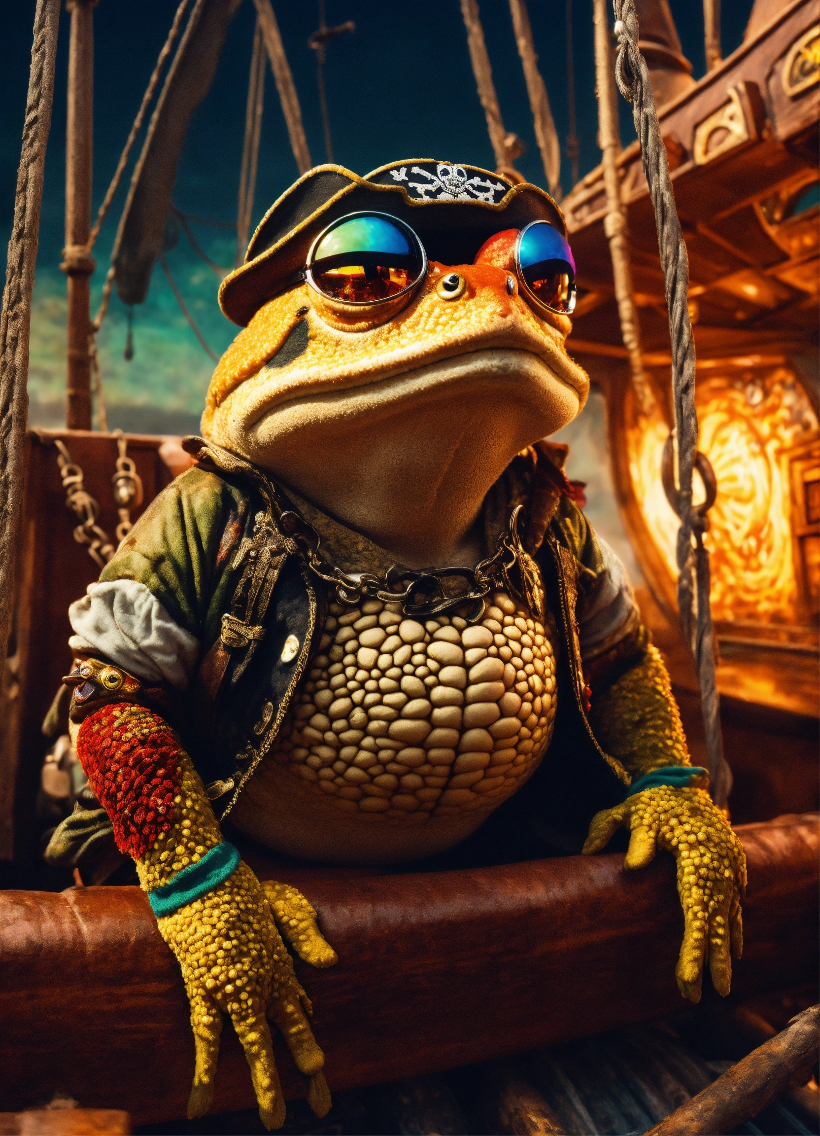 Photorealistic fashion shoot of toad as a scary pirate on a qr code psychedelic dmt pirate ship in, post apocalypse slice of life anime