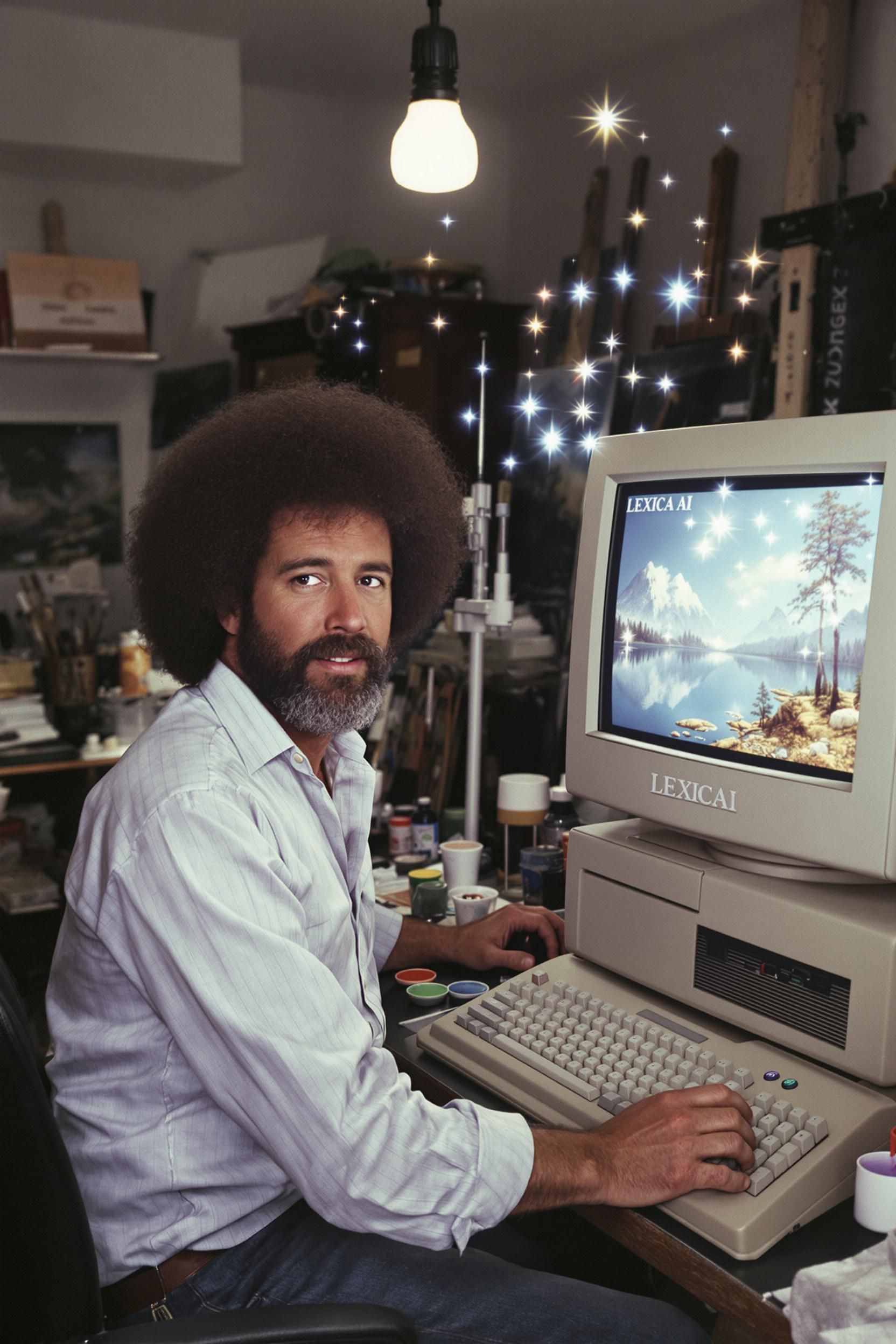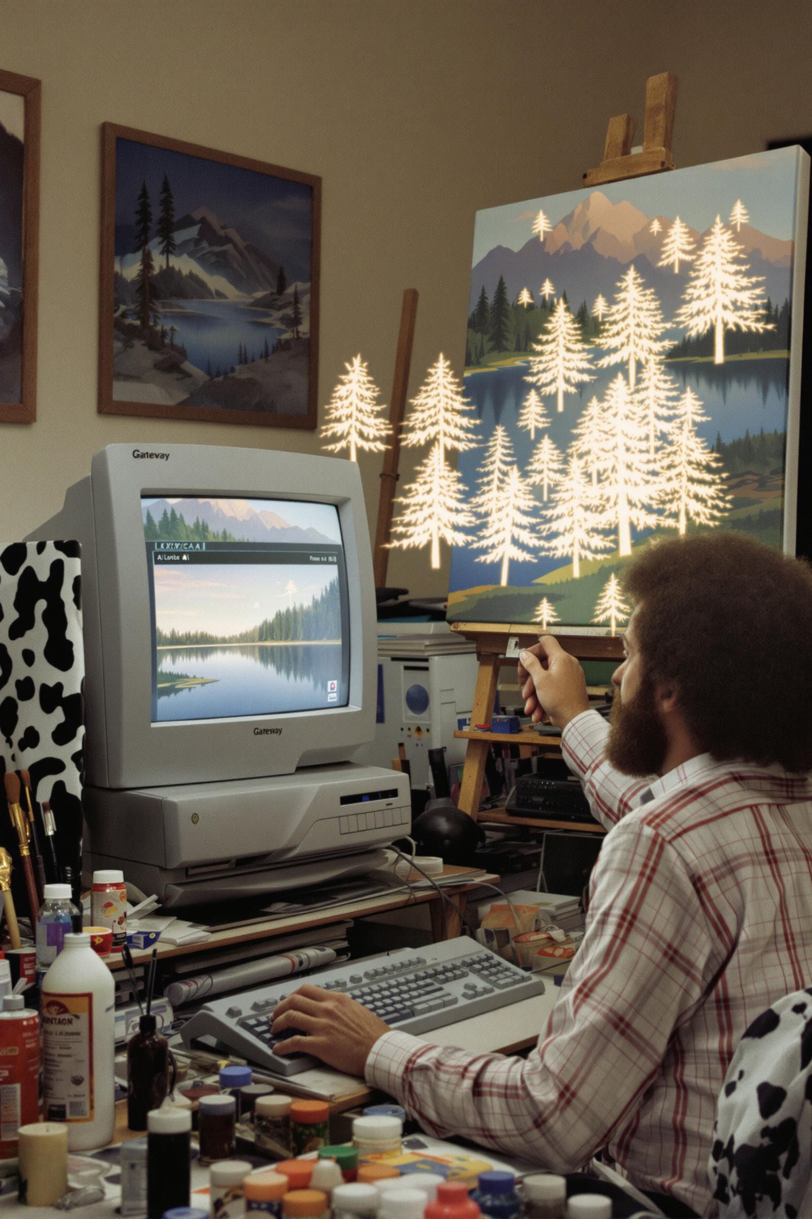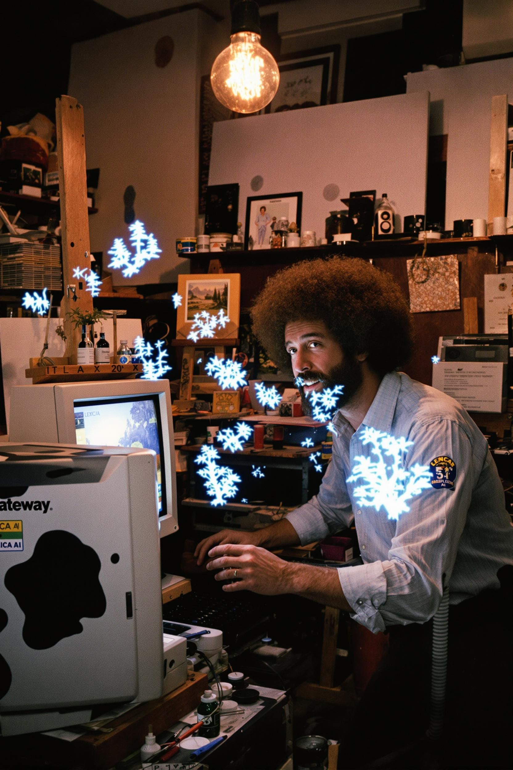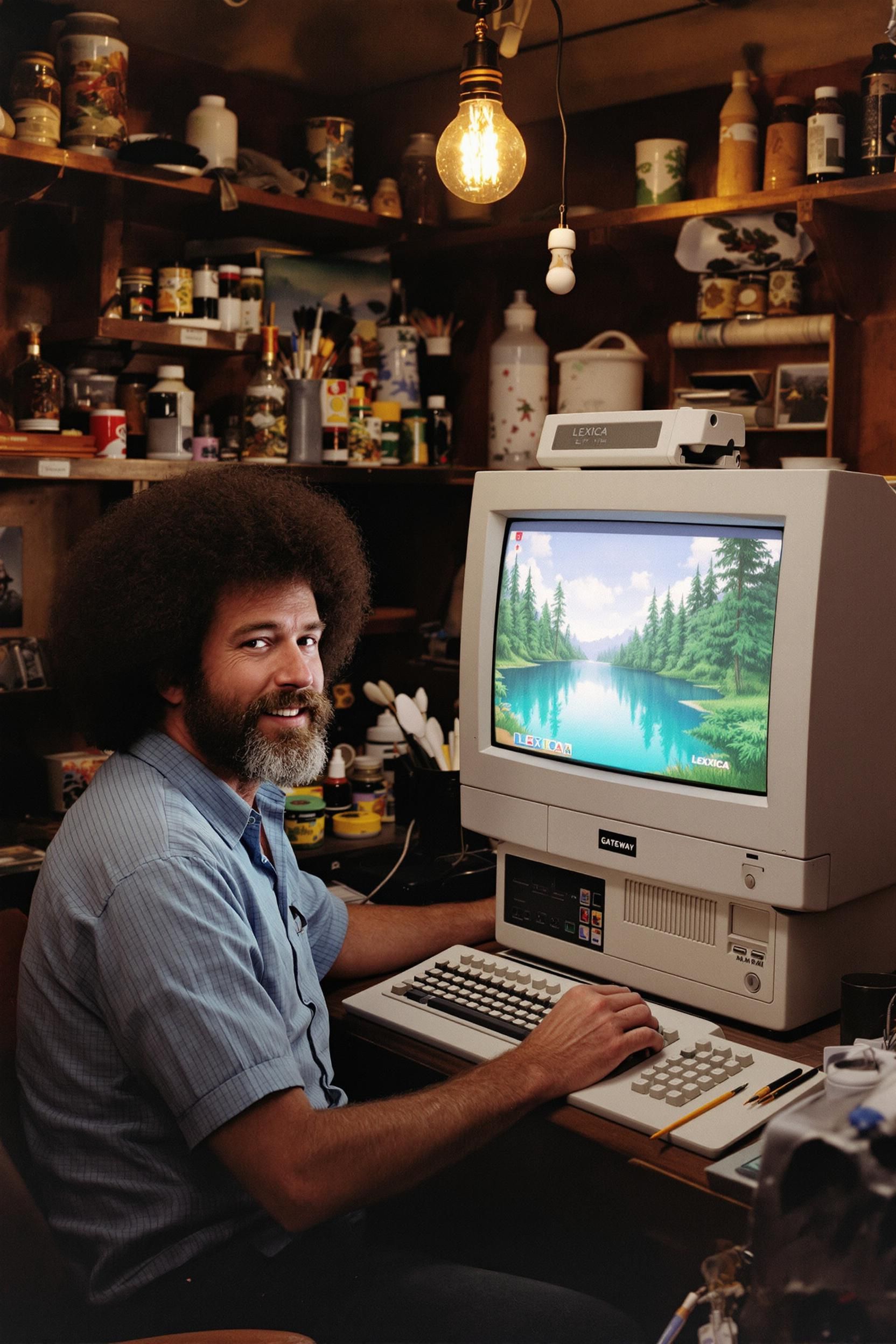 Bob ross is in his art studio in 1994, but he appears like he did from his 1970s tv art show. he is using his gateway desktop computer with its 20" crt monitor to utilize the ai tool lexica as he creates happy little trees. the "happy little trees" float figuratively from his fingertips through the air as they find their place onto the screen with a halfway completed/sketched lakeside landscape image. the crt clearly shows some sort of lexica interface. aside from the image on the screen of the crt, the quality of the image is a candid one taken by a minolta 35mm slr camera with a 50mm lens. there's a bit of unevenness to the lighting of the image, as the primary light source is the camera's flash and the secondary light source is a bulb hanging from the ceiling in the art studio. the studio is cluttered with art stuff like brushes, easels, canvasses. bob's brow is furrowed as he's figuring out lexica.