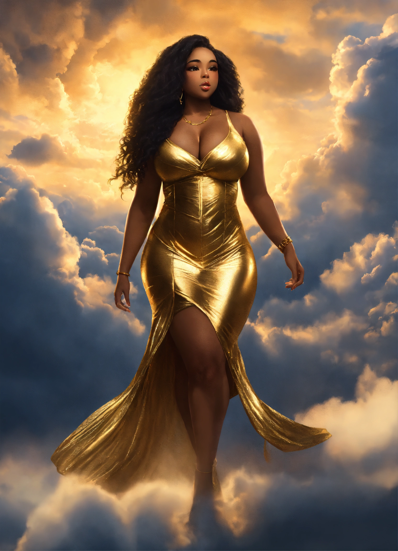 Phat girl, a beautiful black girl goddess, a perfect face perfect figure, shapely beautiful goddess with long dark hair hour-glass figure wearing gold dress, walking in the clouds, resolution 8k, insanely detailed