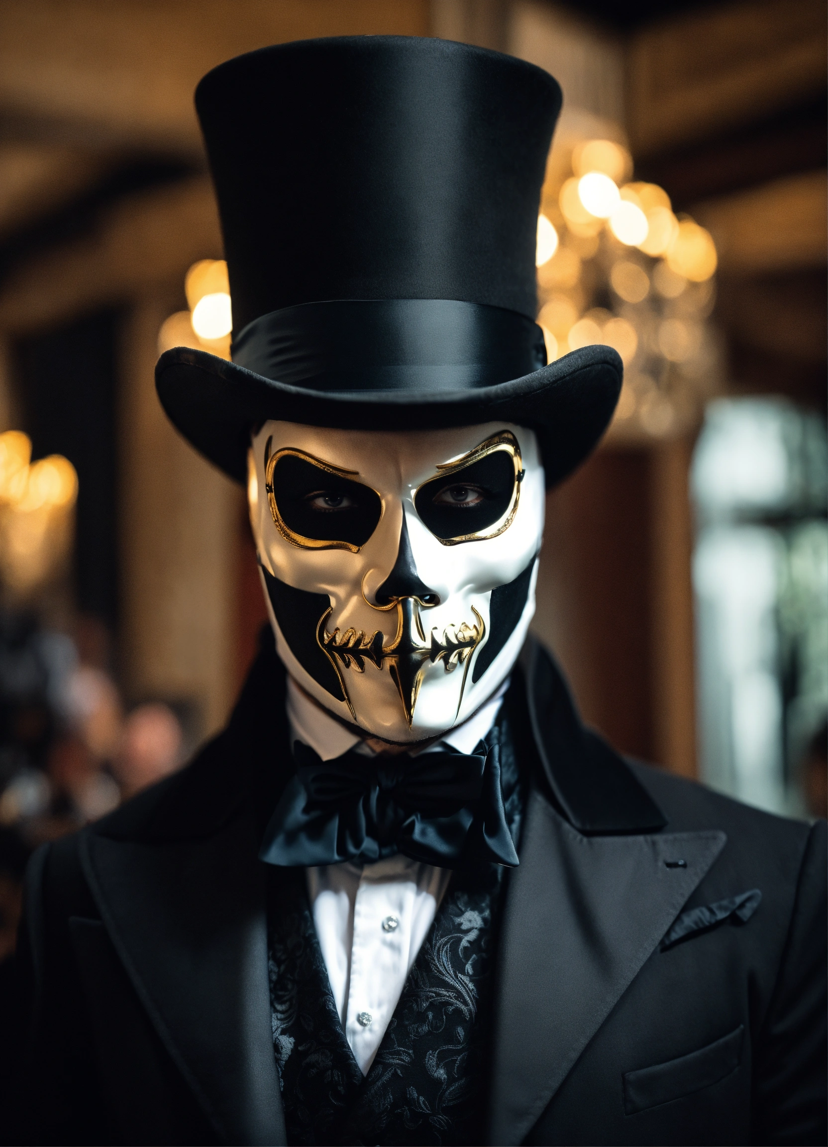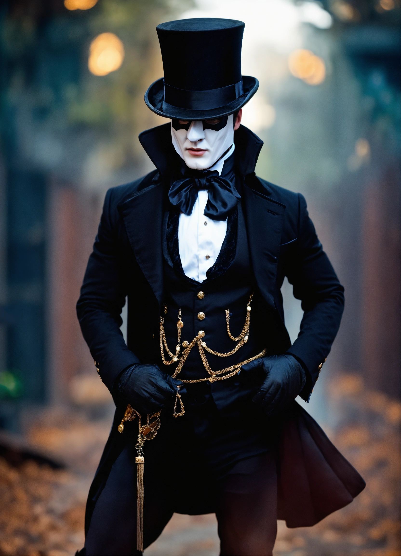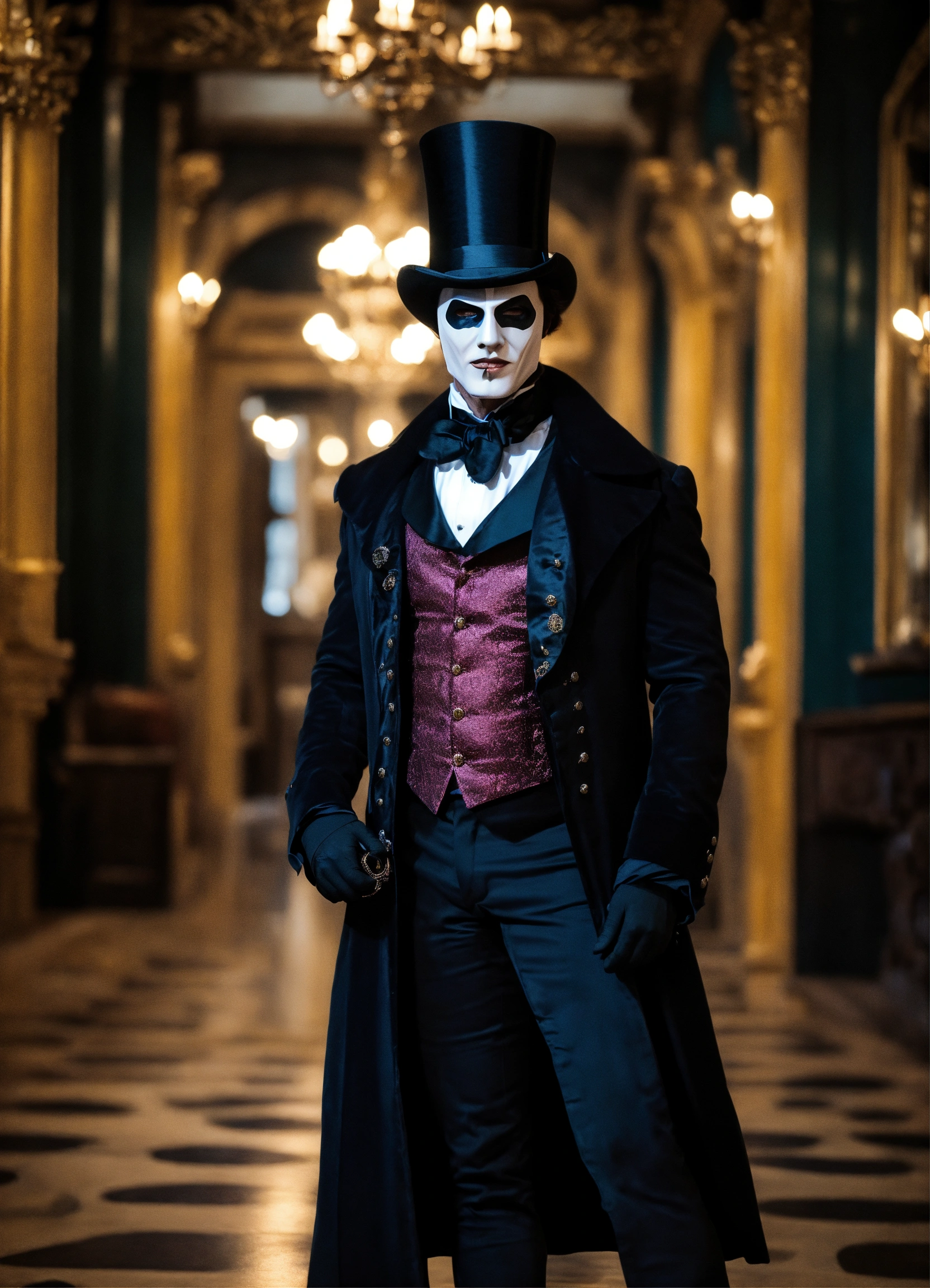 Built man handsome wearing phantom of the opera outfit wearing black and top hat and half mask