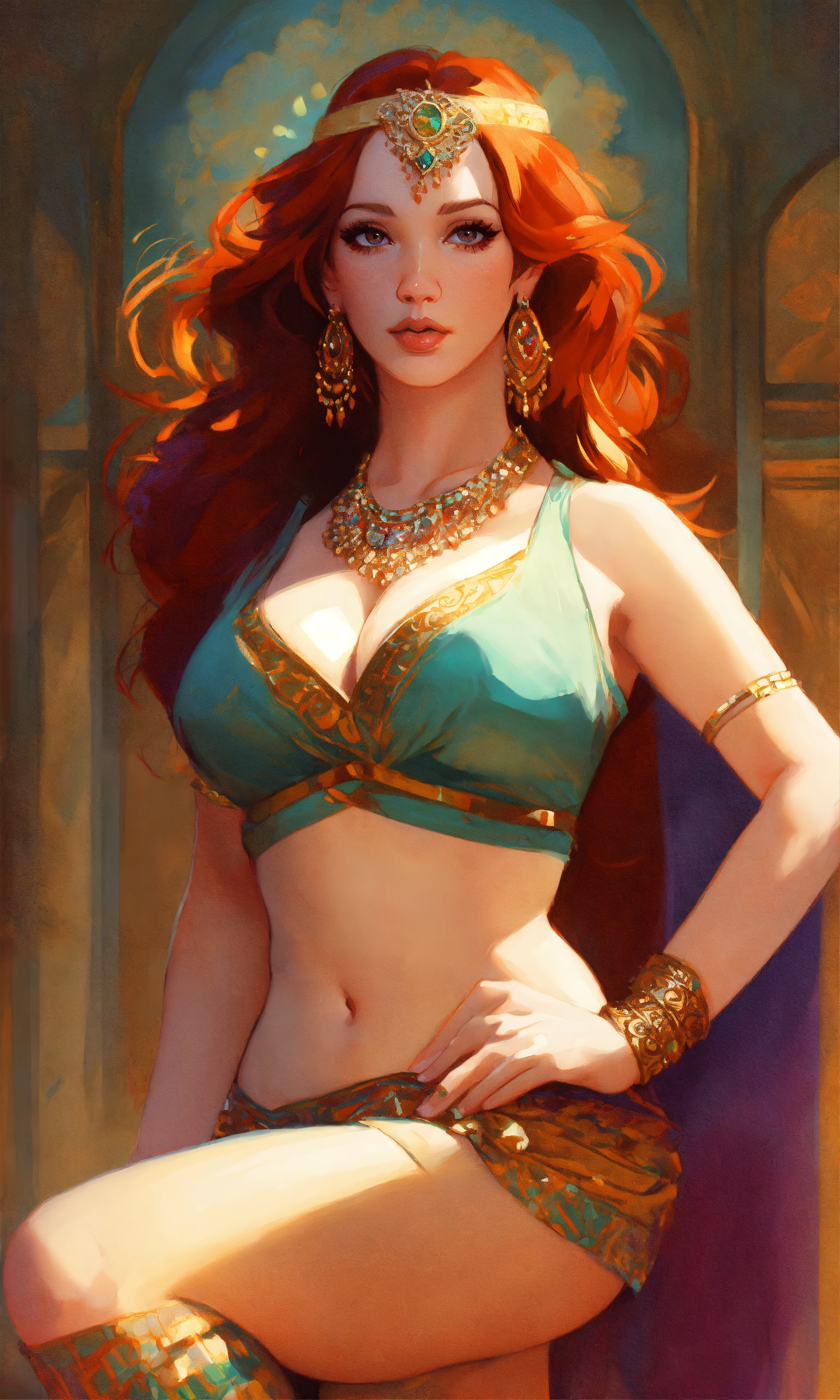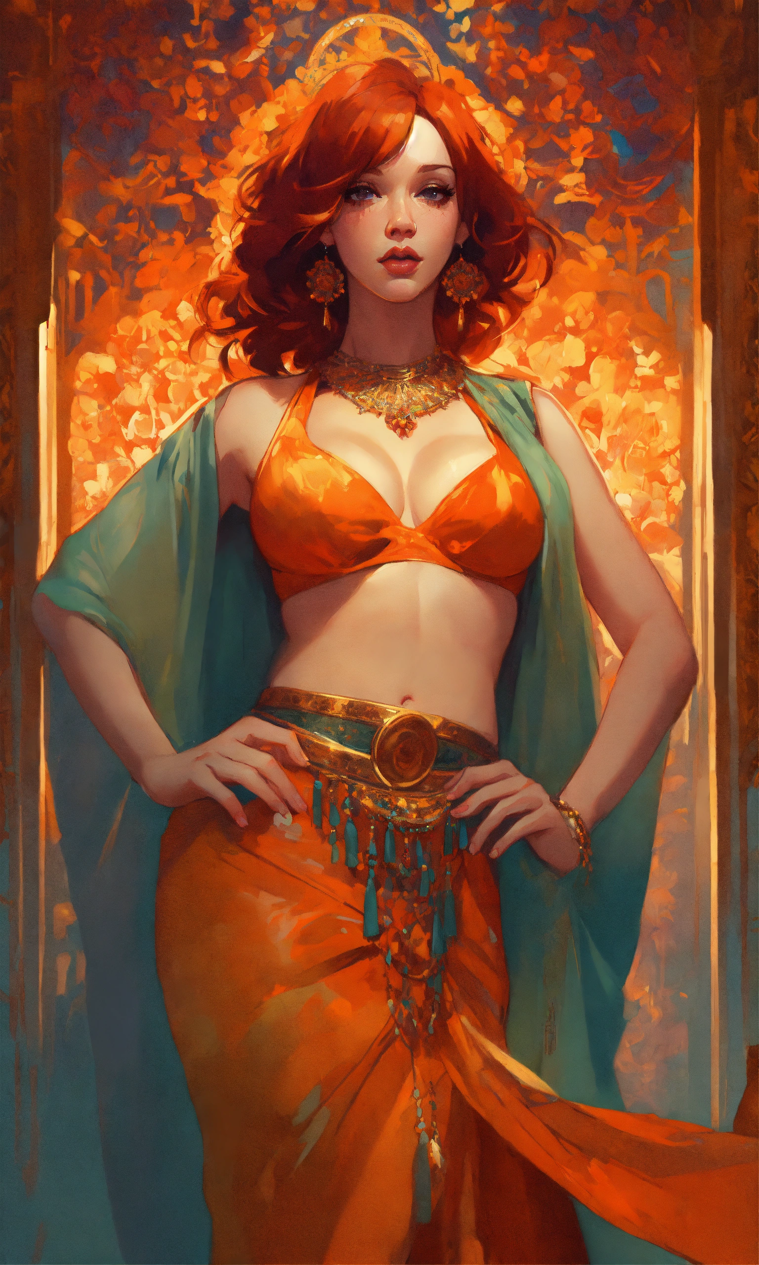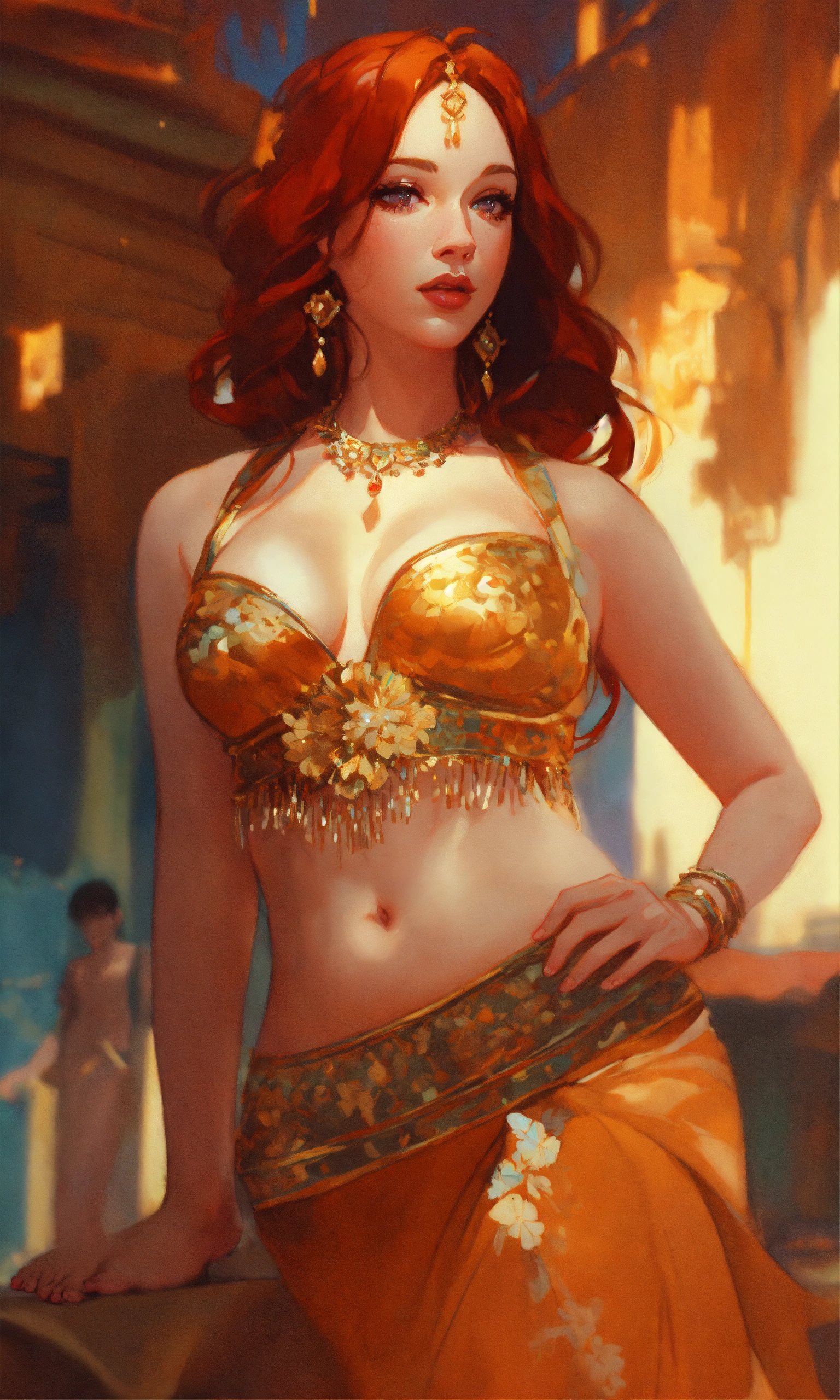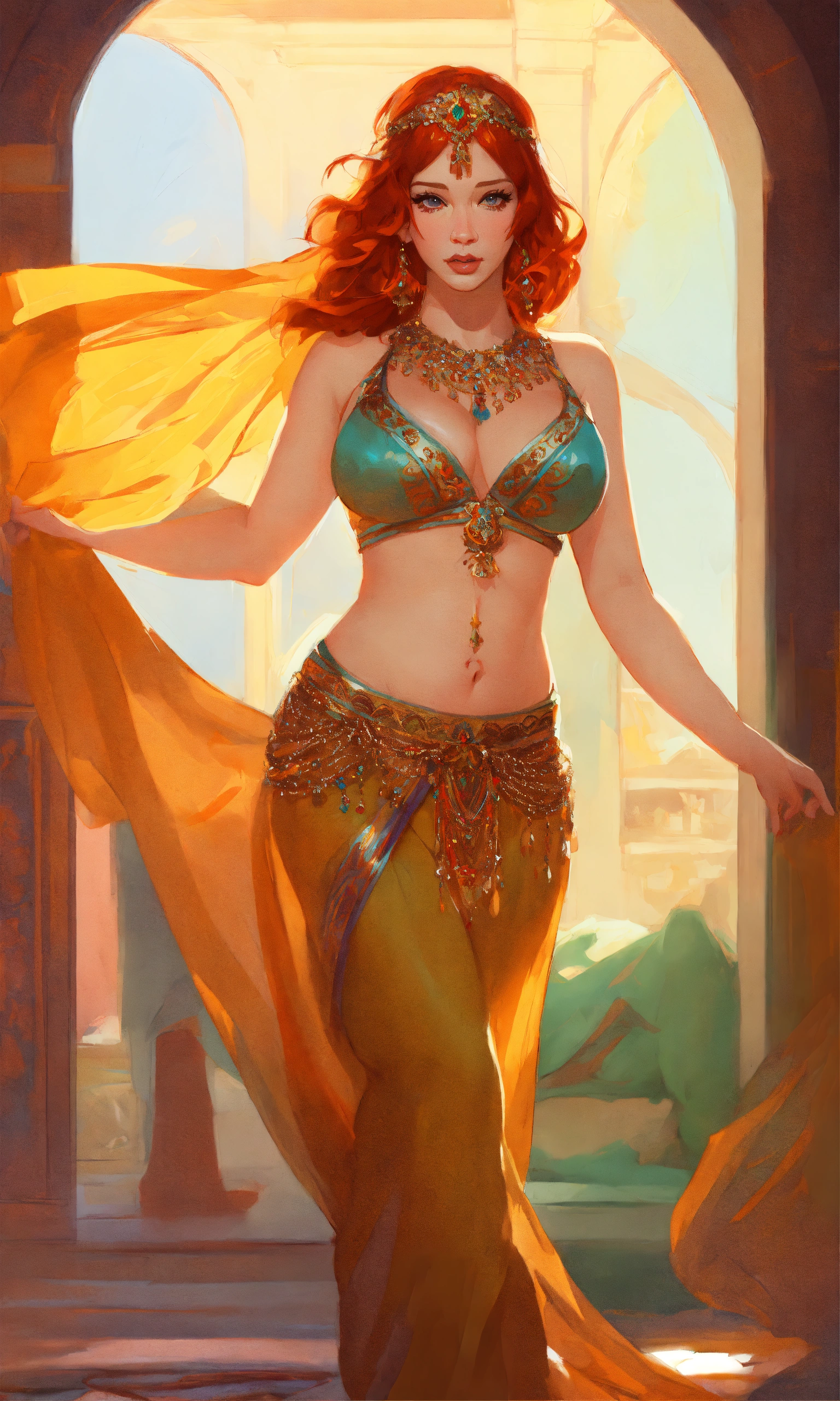 Christina hendricks as belly dancer, full body, barefoot, bare feet, rounded eyes, far minimalist perspective, mixed media, fan art, pixiv, by ilya kuvshinov, magali villeneuve, artgerm, jeremy lipkin, michael garmash, rob rey, ultrarealism, transparent clothing.