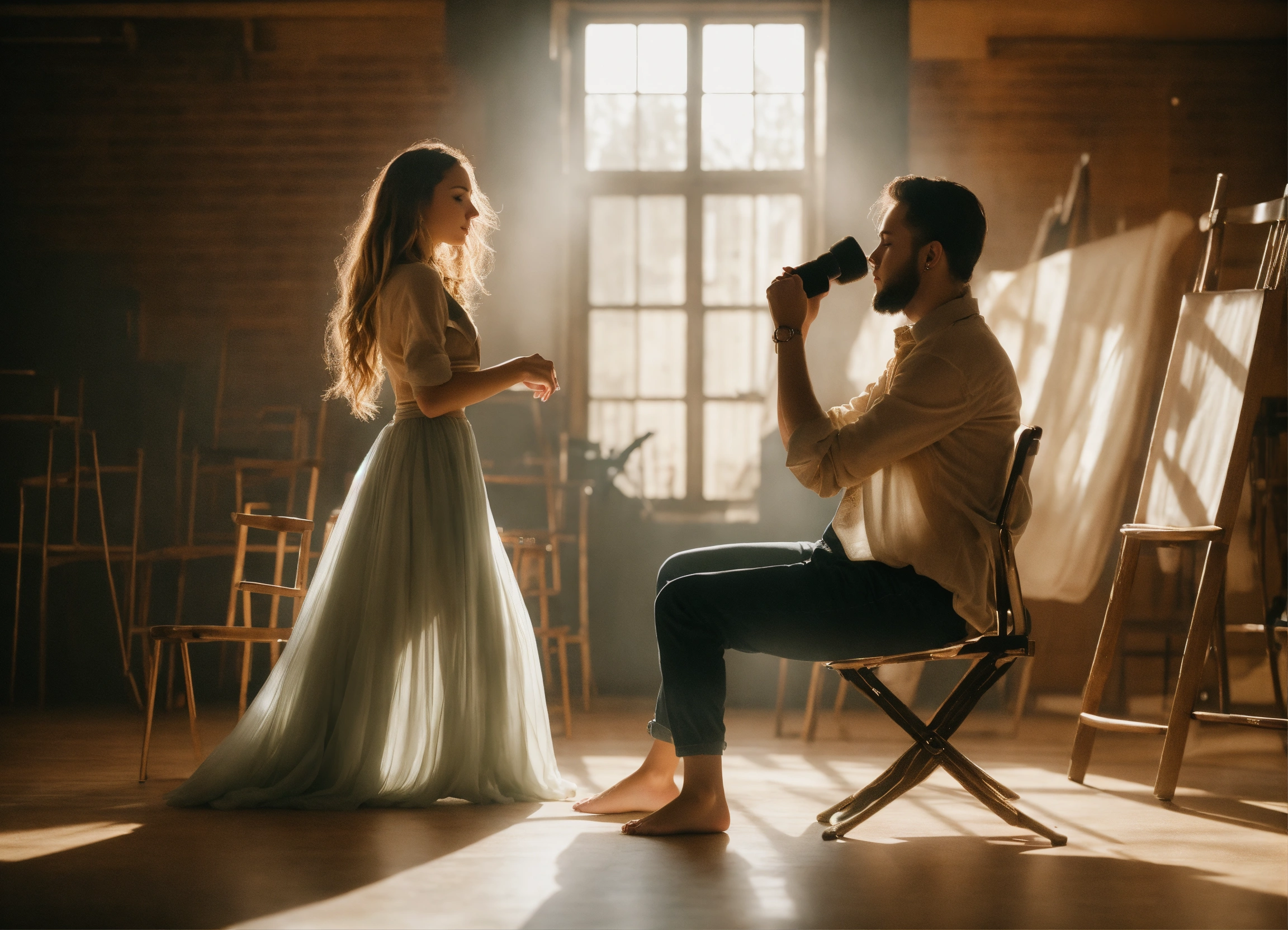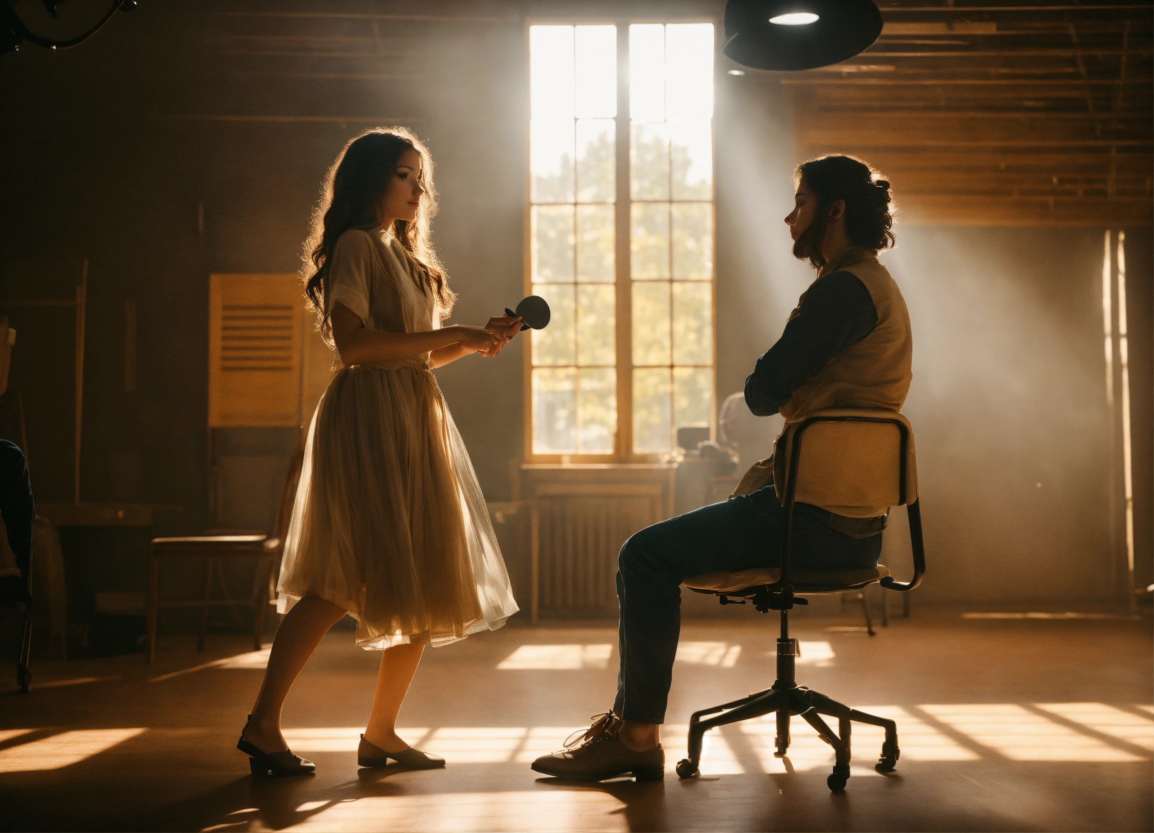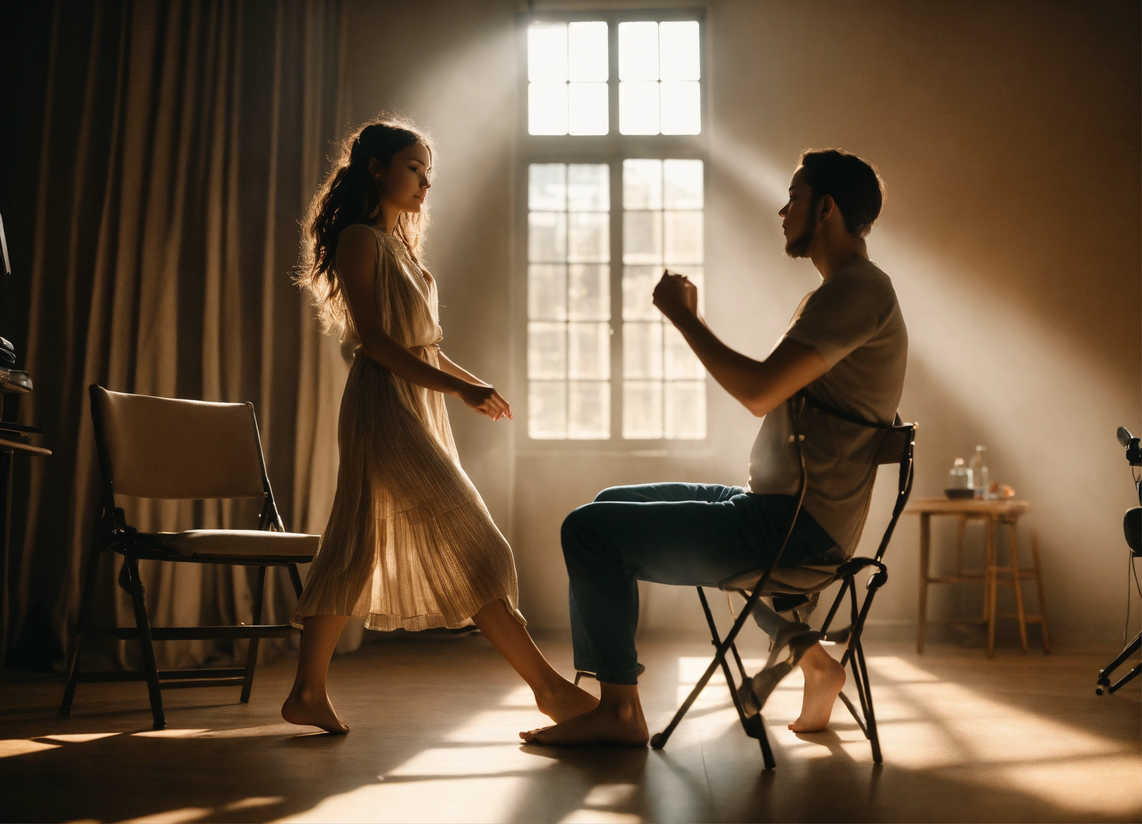 **the girl is casting in a movie. she's dancing in front of a male director. a full-length girl.a man is sitting in a chair. side view. full frame. realistic. detailed. soft light, clear shadows, proportional body parts and beautiful faces, clarity. high quality. 4k. real photo.