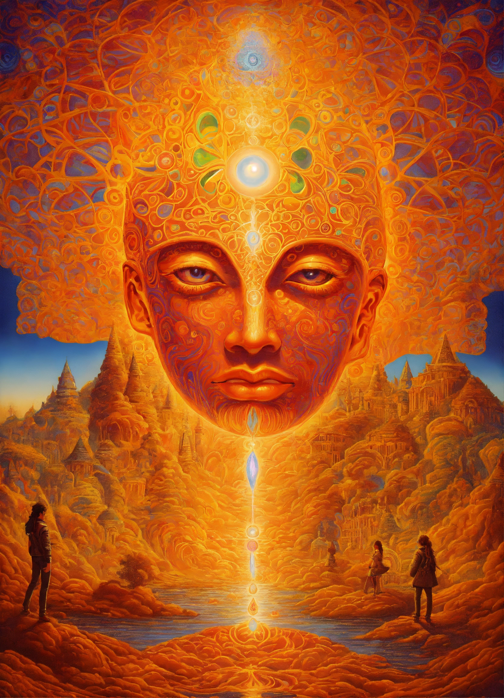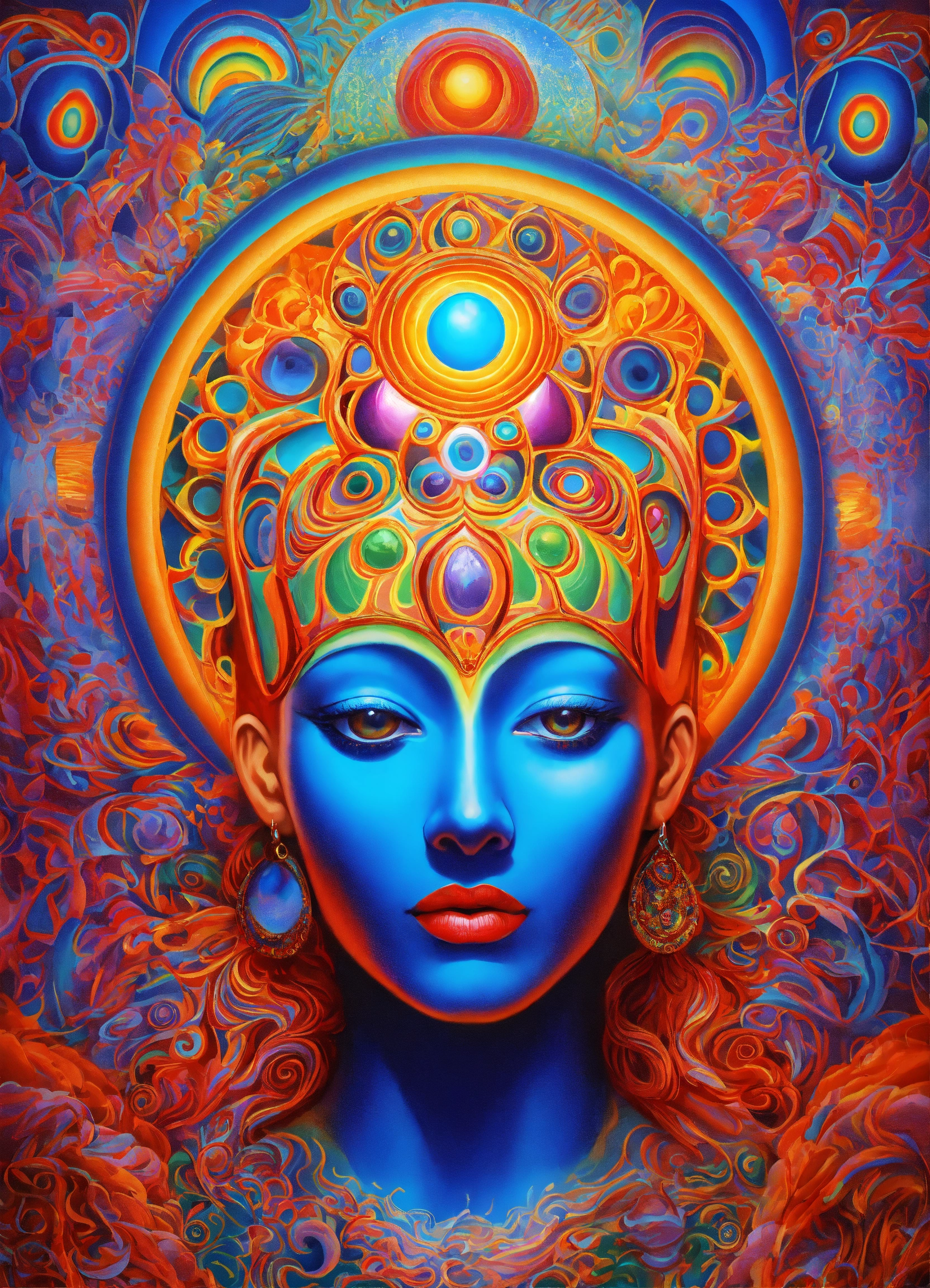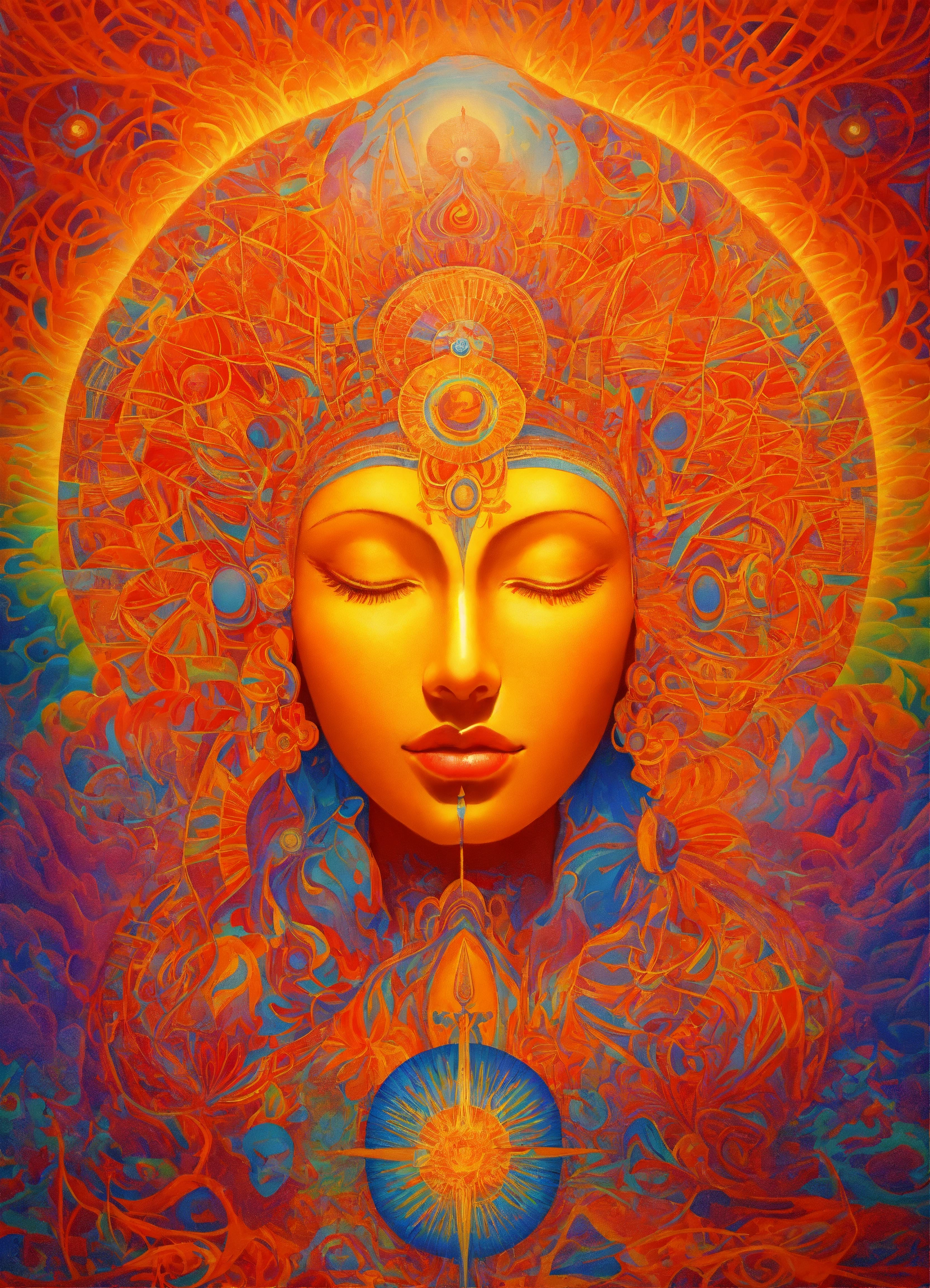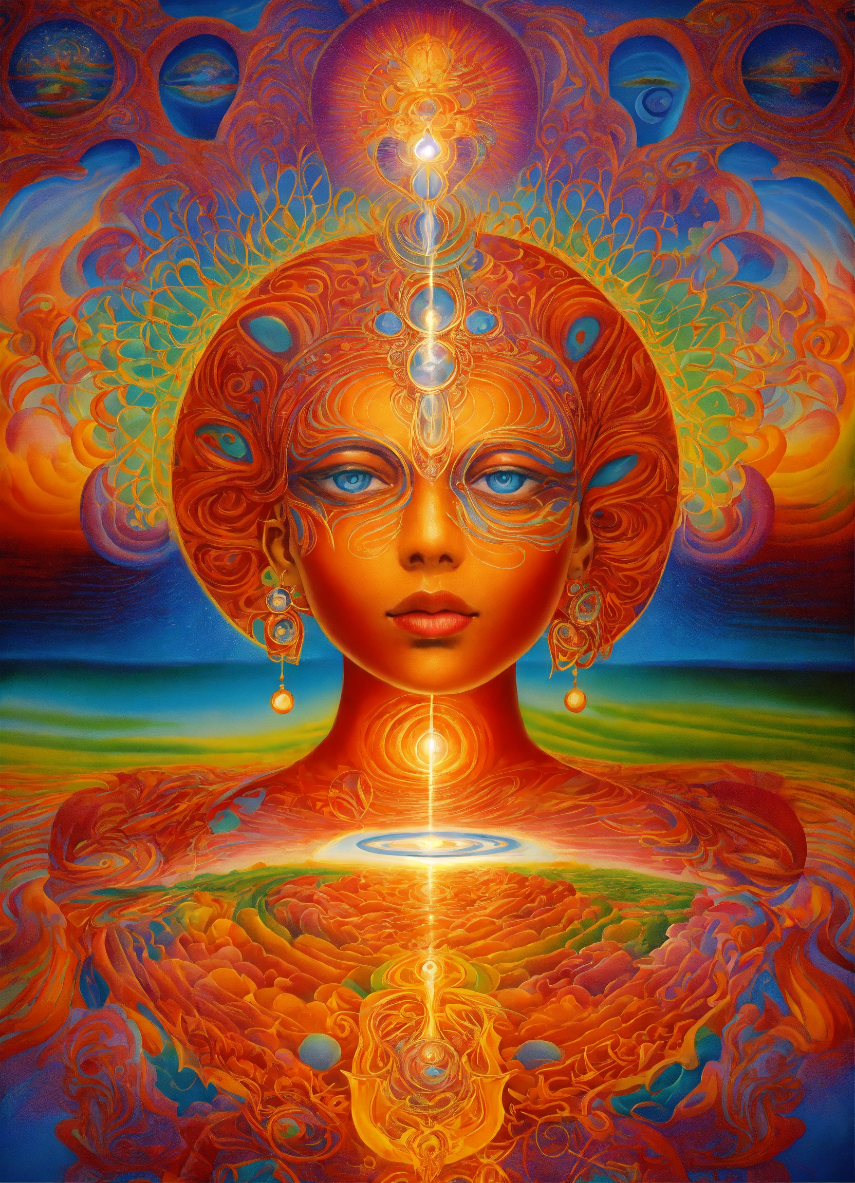 Générer une image au style psytrance et trippy, fortement inspirée par l'art d'alex grey. utilisez des couleurs vives et psychédéliques, des motifs fractals complexes, et des représentations de la conscience et de la spiritualité. l'image devrait évoquer une expérience visuelle et spirituelle intense, avec des éléments tels que des visages humains en fusion, des yeux mystiques, et des formes géométriques en constante évolution. assurez-vous que l'image transmette une sensation de voyage spirituel et mystique, tout en explorant les limites de la perception visuelle.