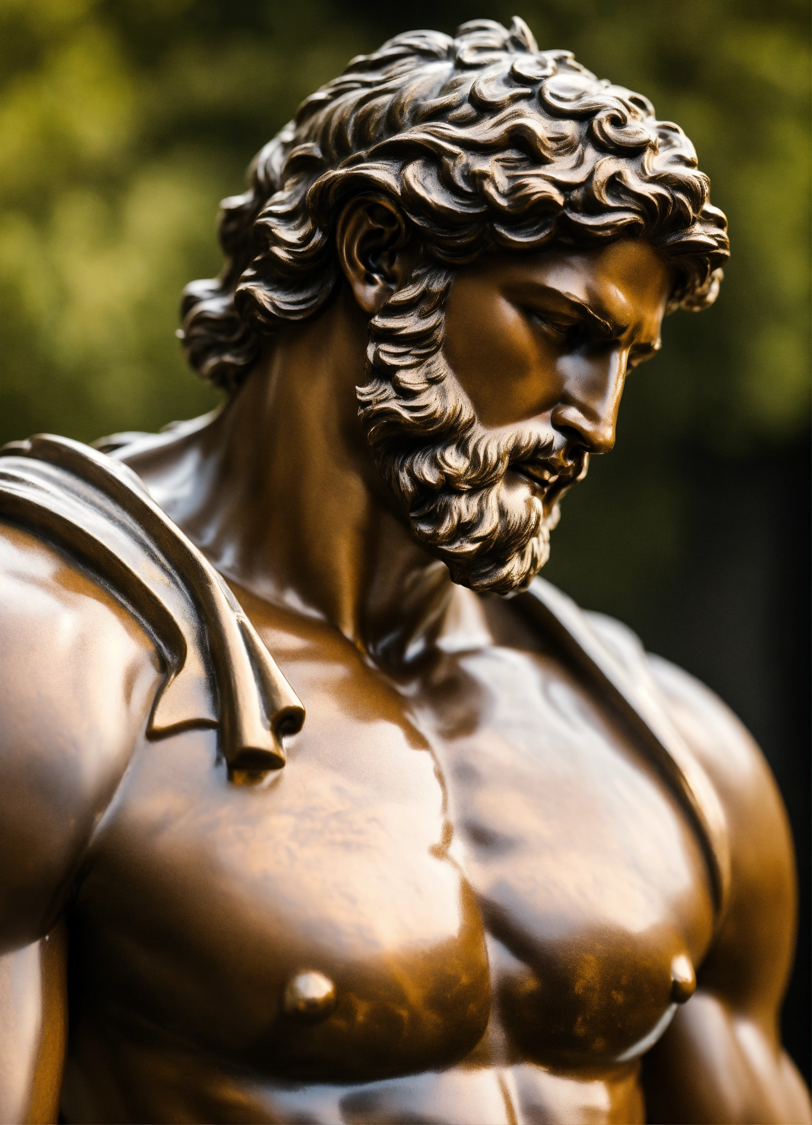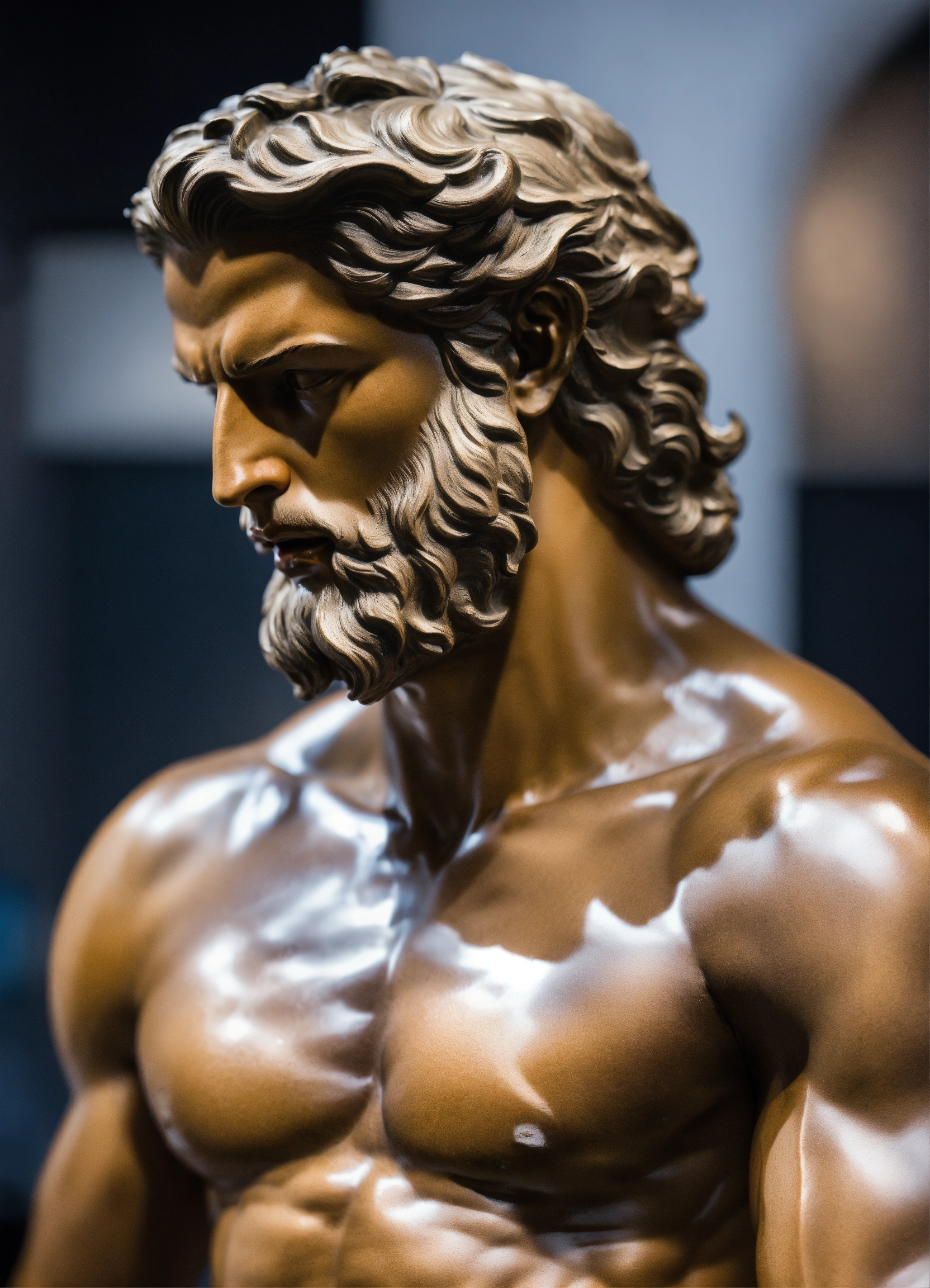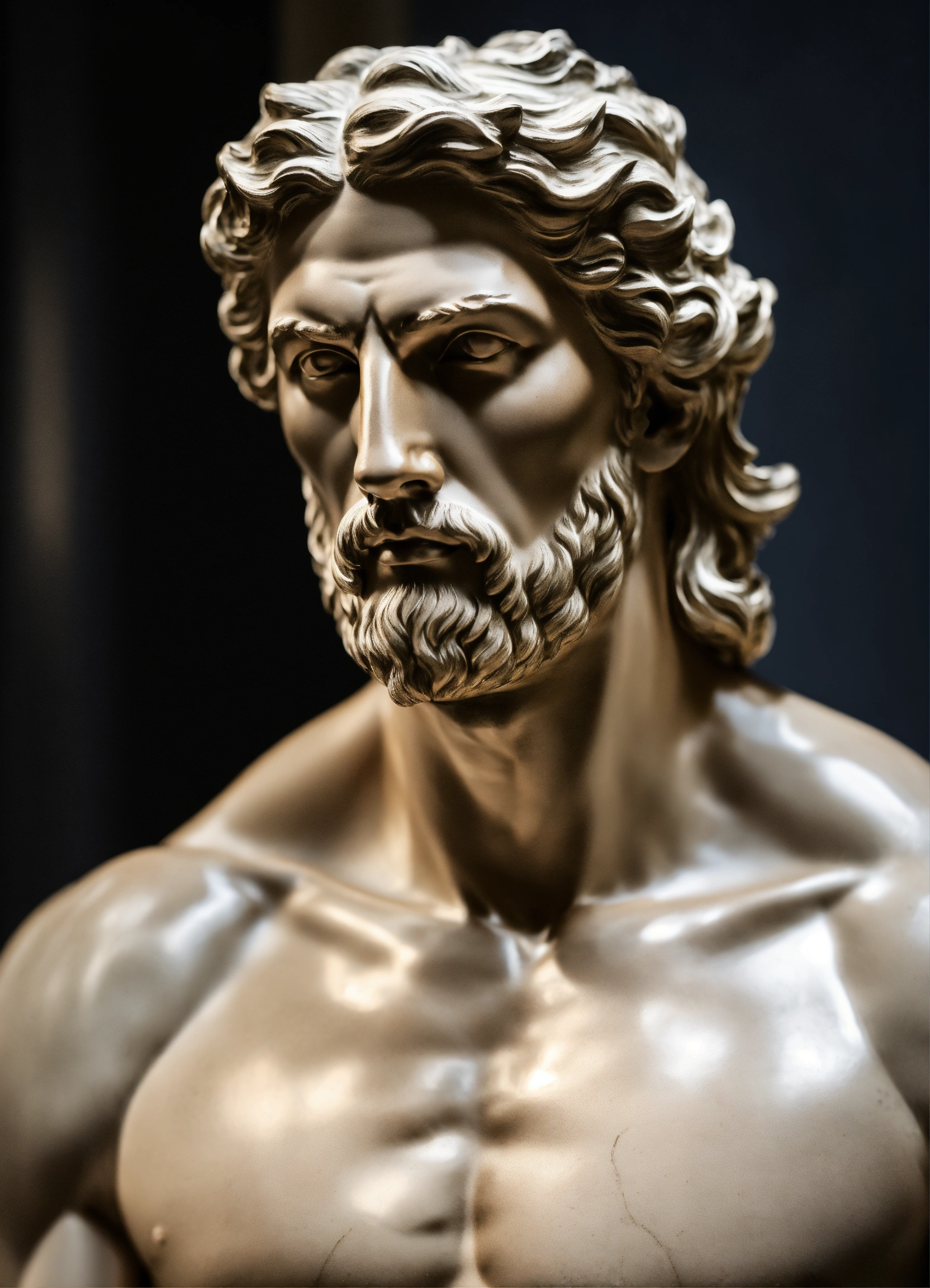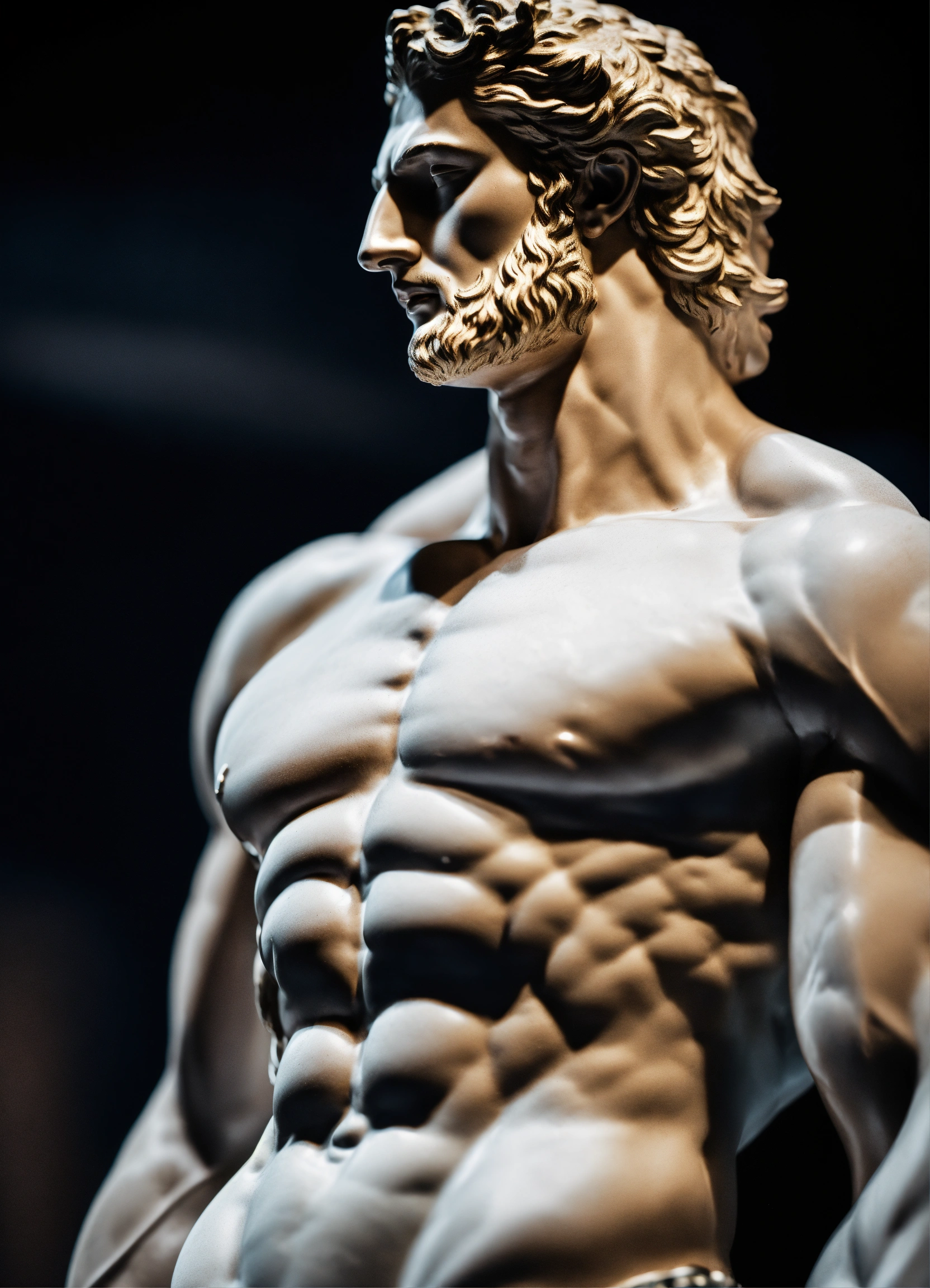 Modern muscular greek god statue with middelparting hair with white boddy with dark backround only head on a bodium