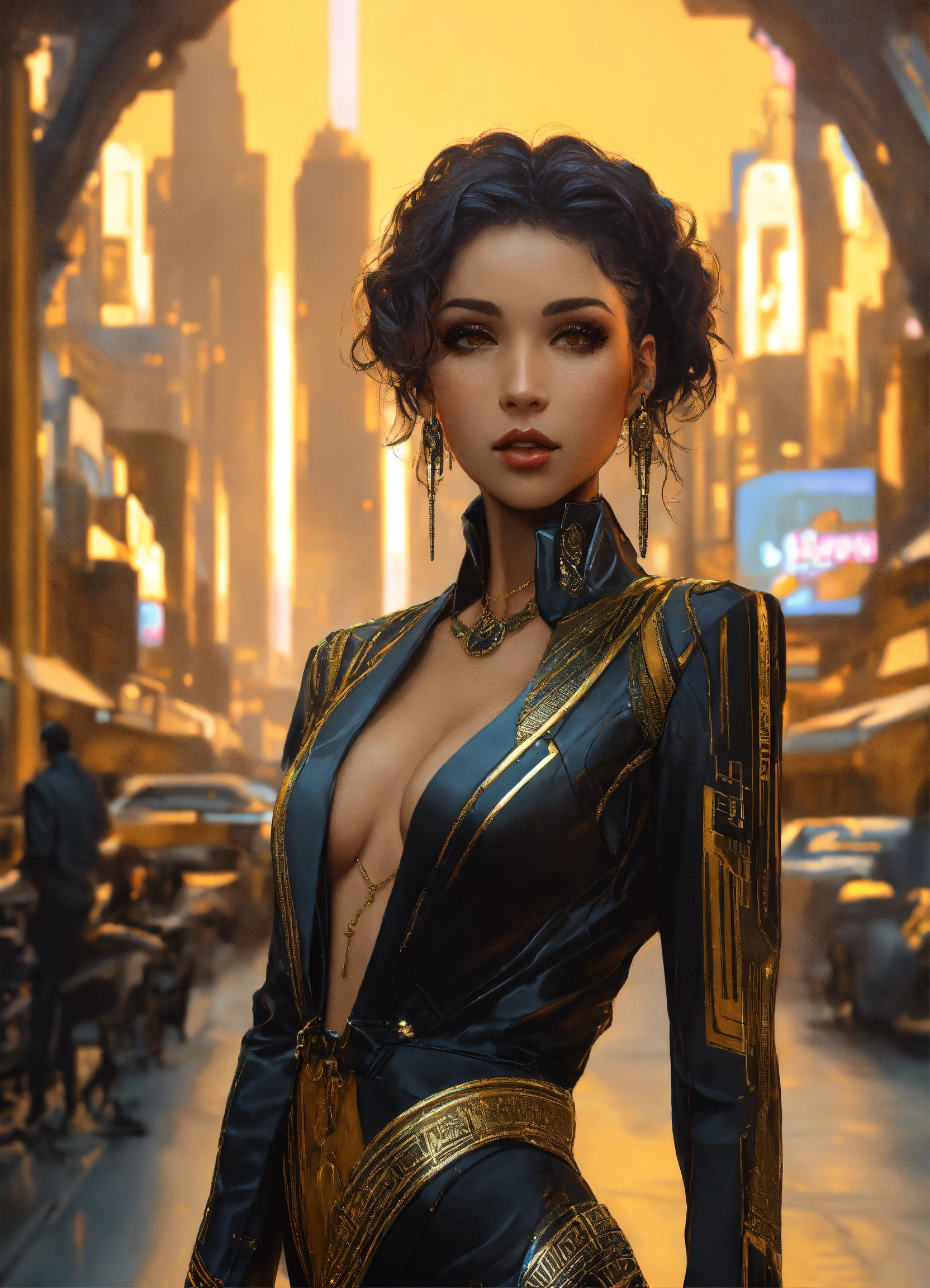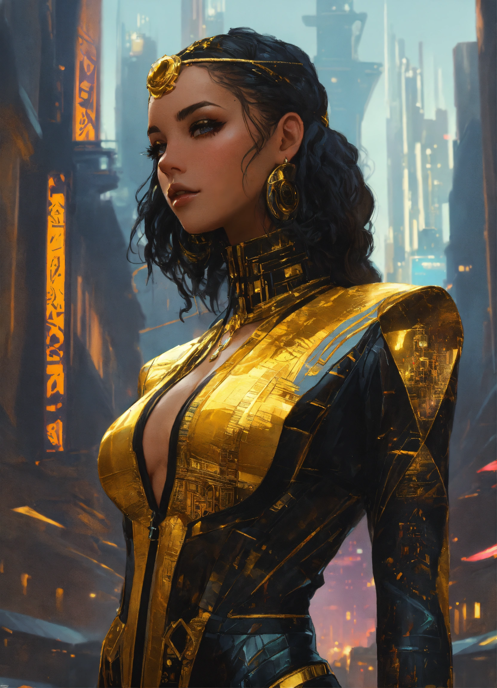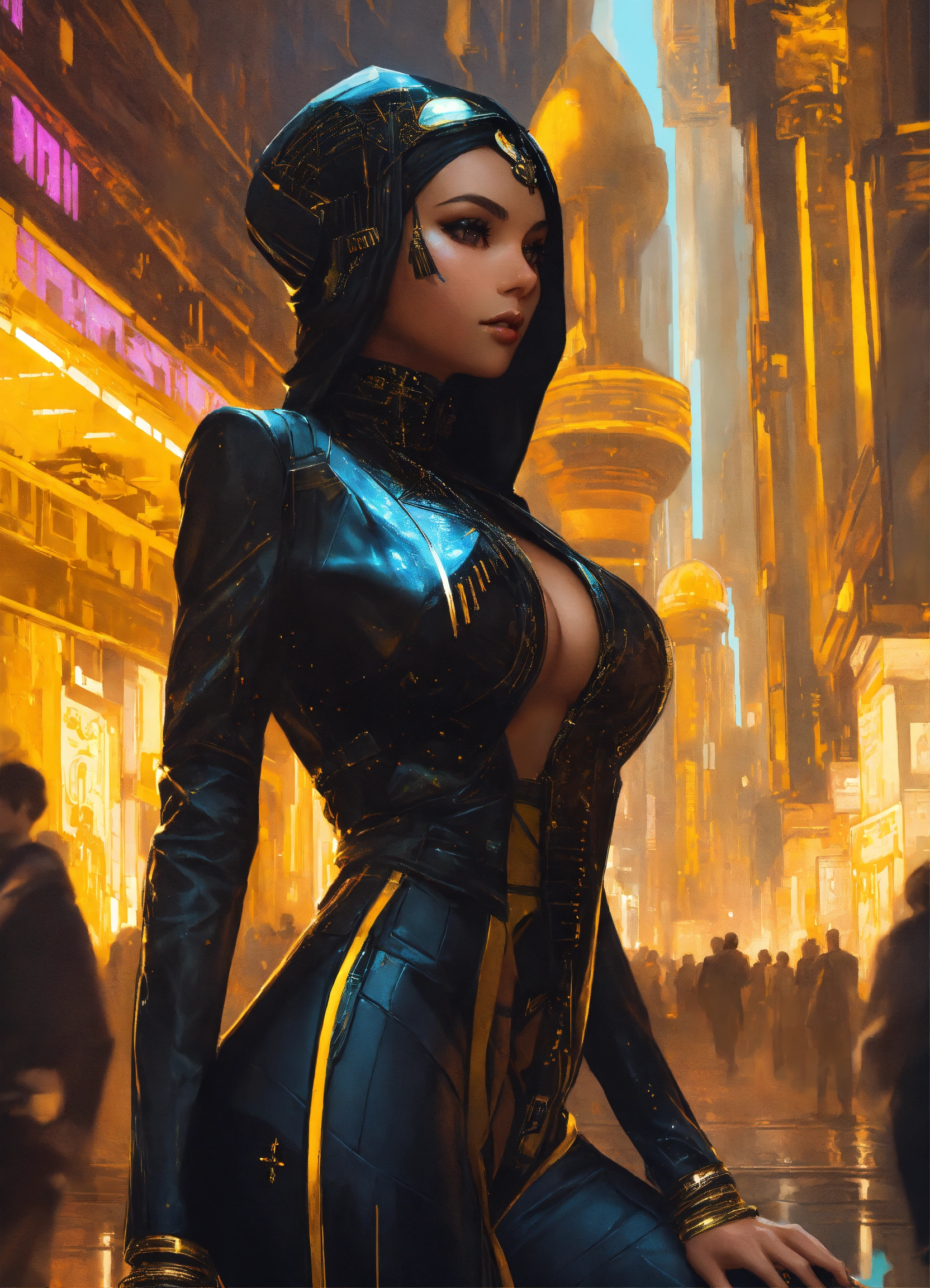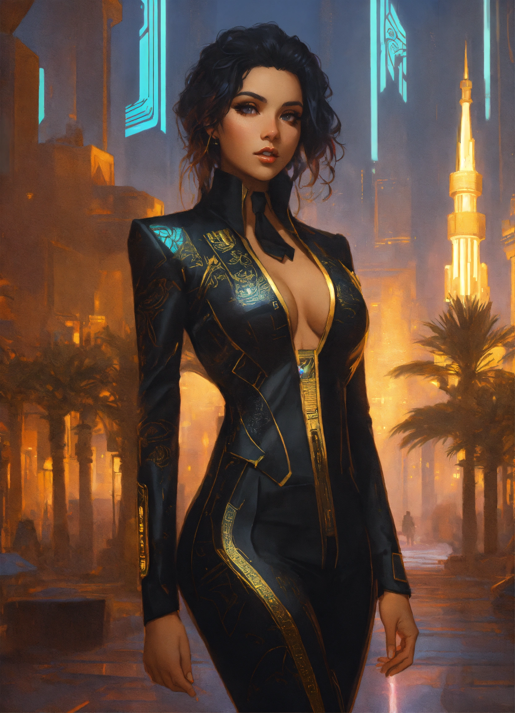 Beautiful middle eastern bimbo wearing a black and citrine egyptian business suit, in a futuristic cityscape, hyper detailed, cyberpunk style, greg rutkowski, alphonse mucha, wlop, face view