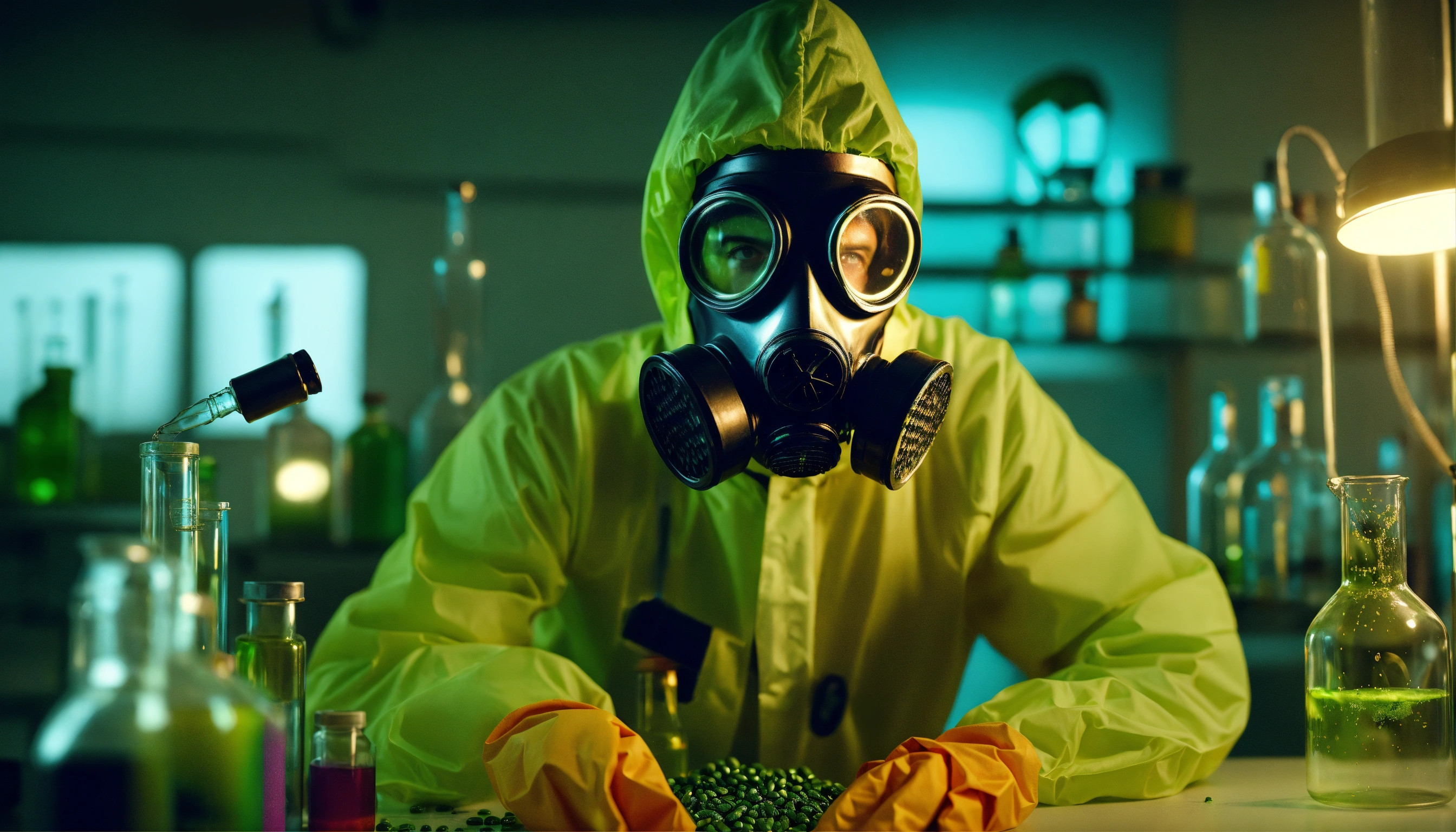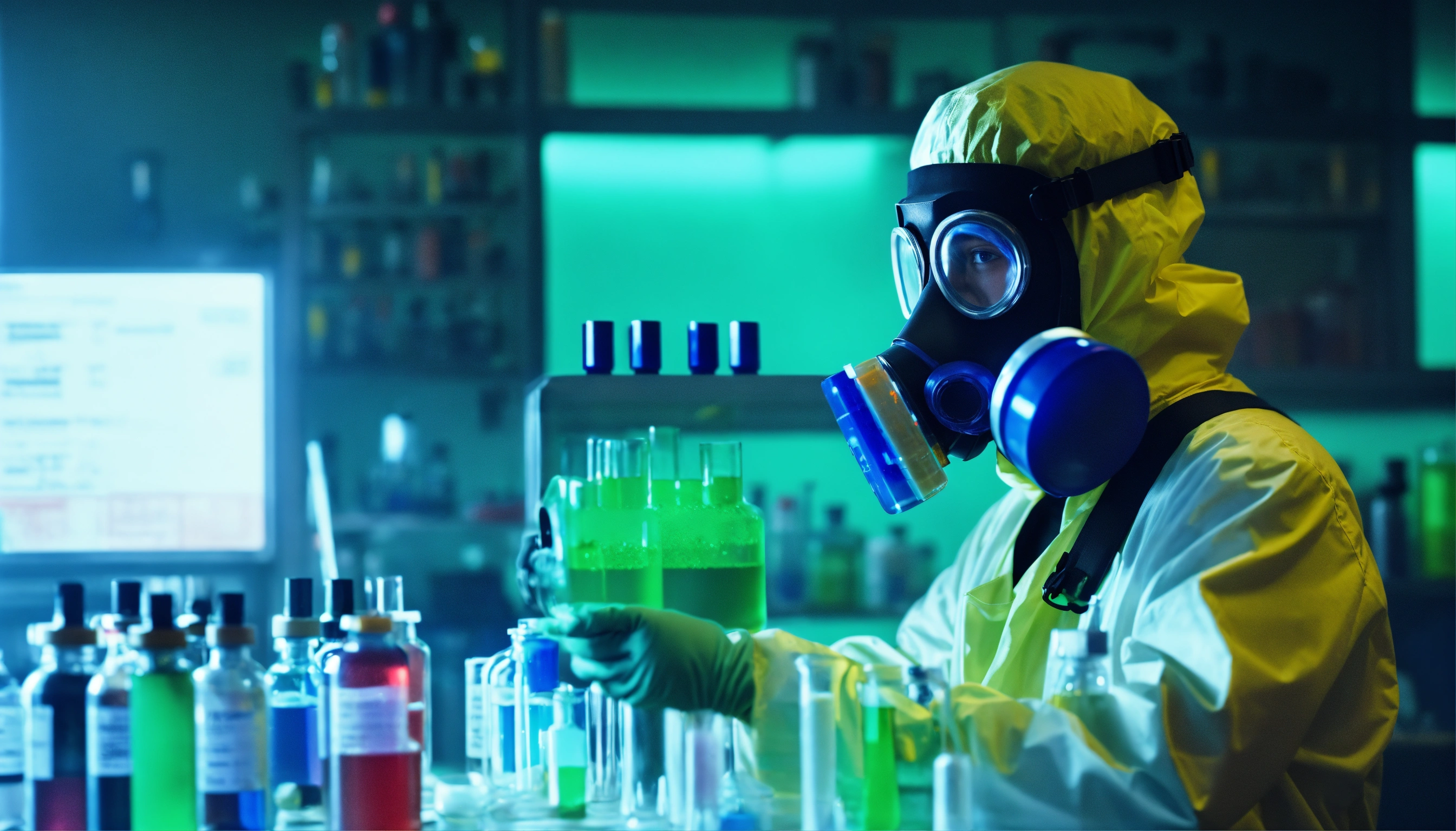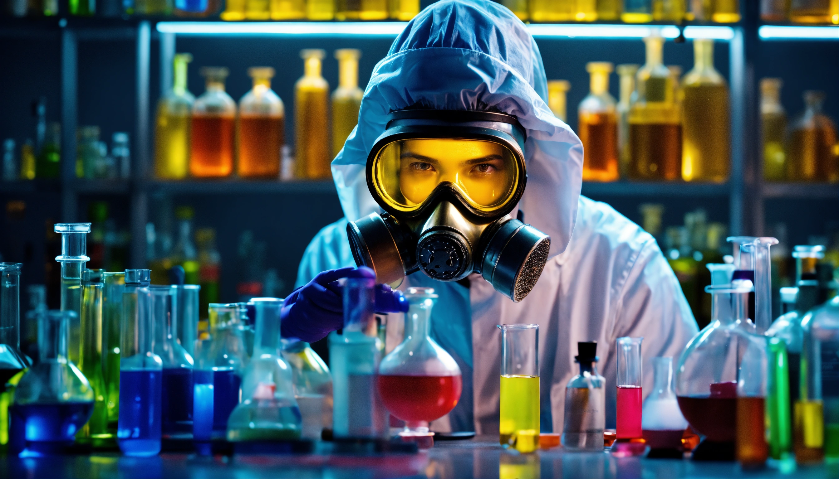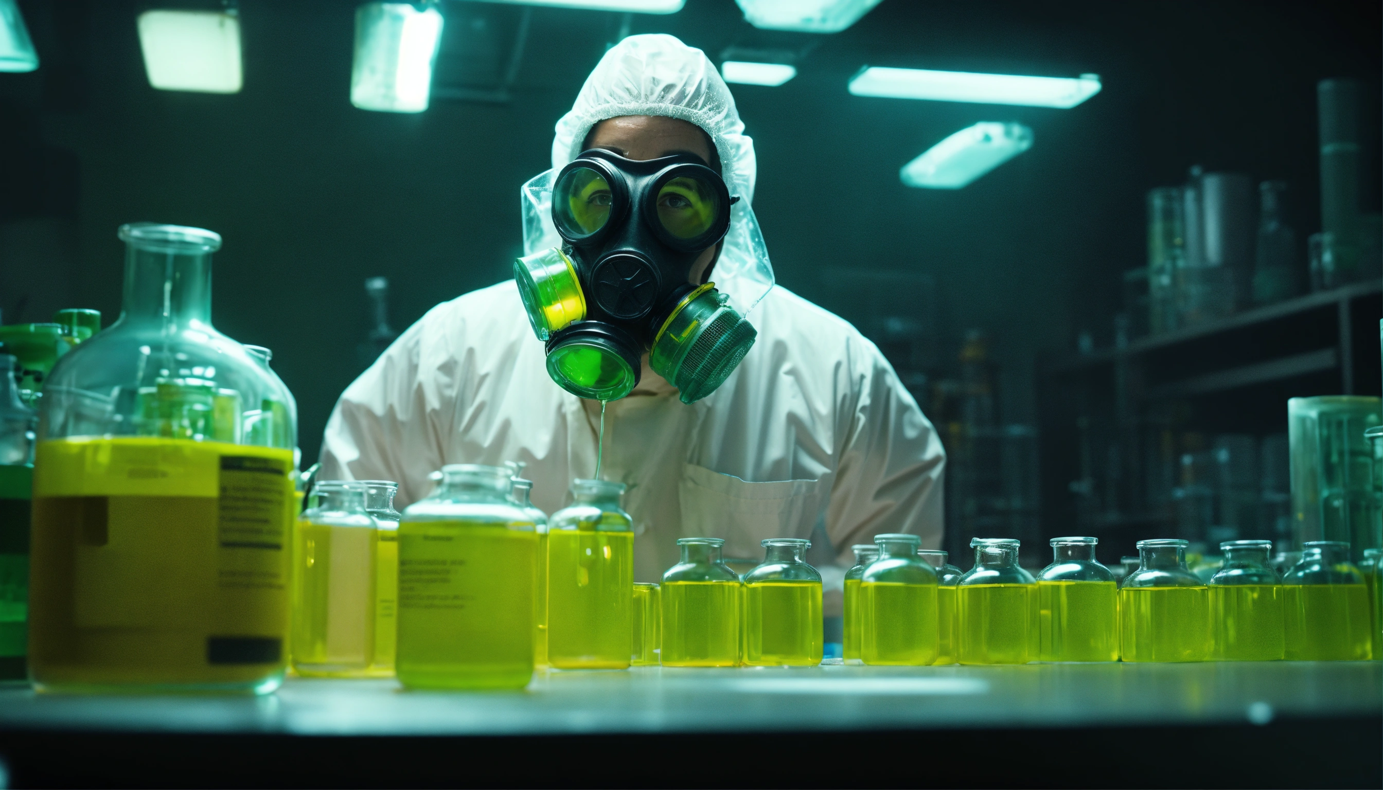 Toxic. crazy man chemist wearing gas mask. working in a modern clandestine laboratory withtest tube, flasks and colored pouring liquids and reagents. production of synthetic designer drugs - pills. octane render, highly detailed, lighting, professional, realistic, sharp focus, 4k, 8k, high resolution, candid, personal, bright lighting, ultra-detailed, bright lighting, photo, photography