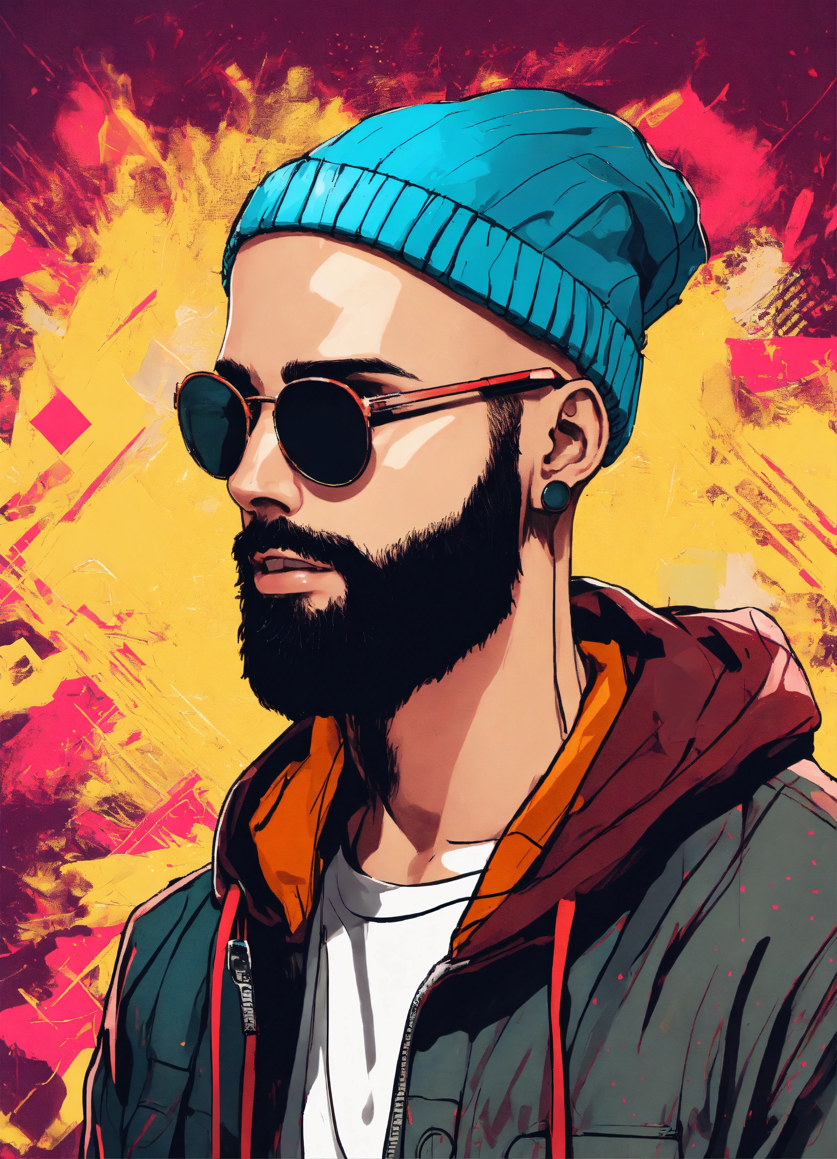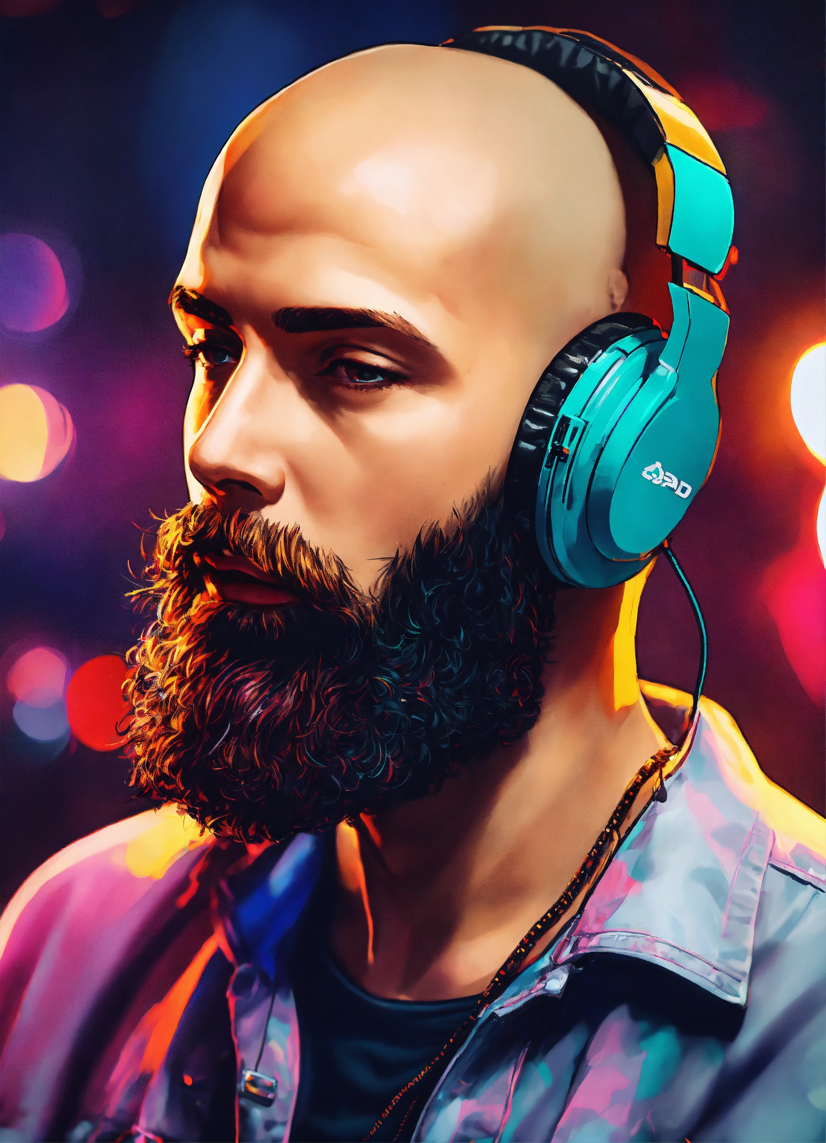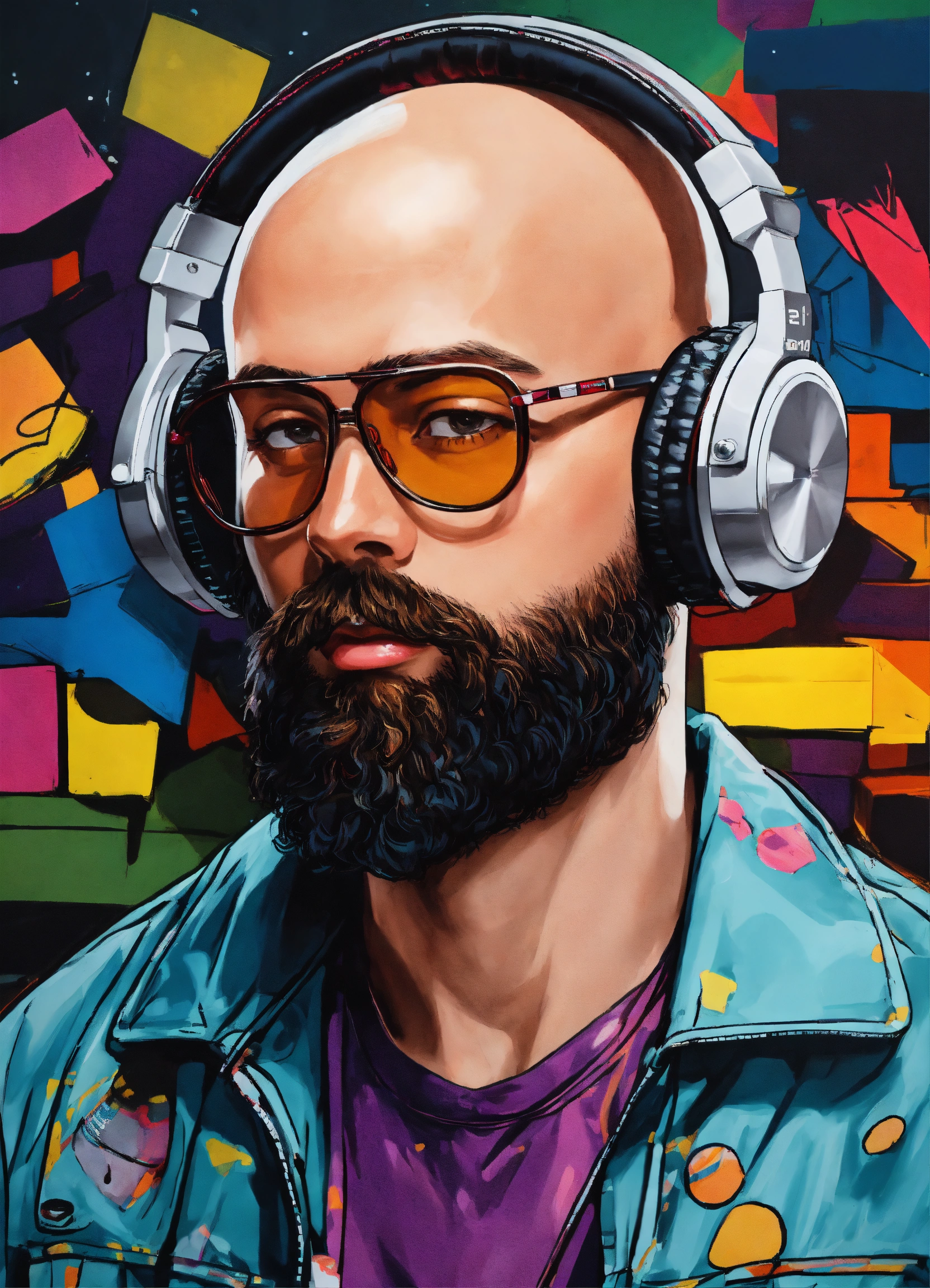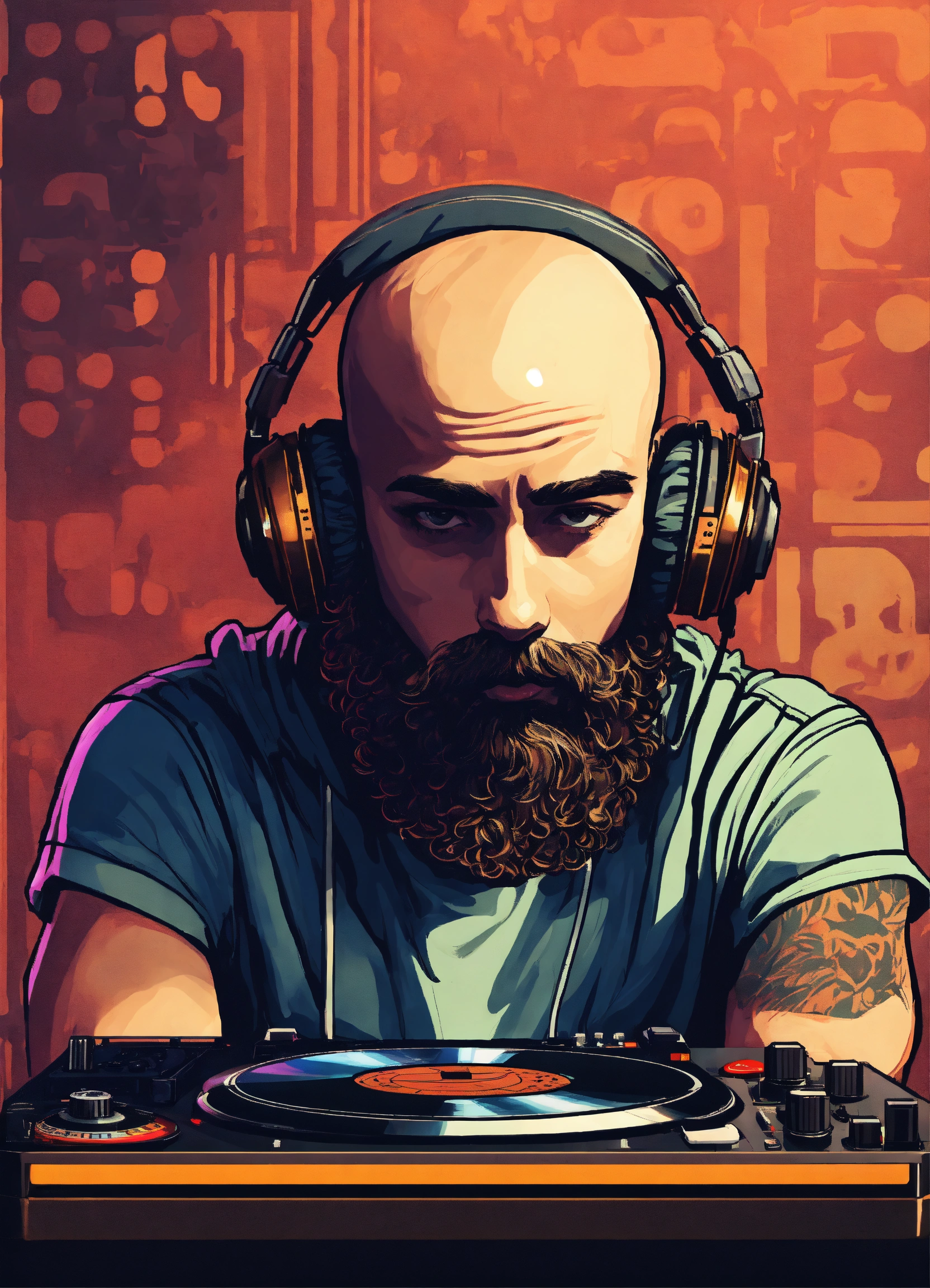 A young man bald head man with beard in high quality, popular beauty pinups in a variety of styles and colours, mostly pop art and comic style, 8k modern day the pioneer ddj-1000srt serato dj controller provides 4 channels of dj performance control and deep integration with serato dj