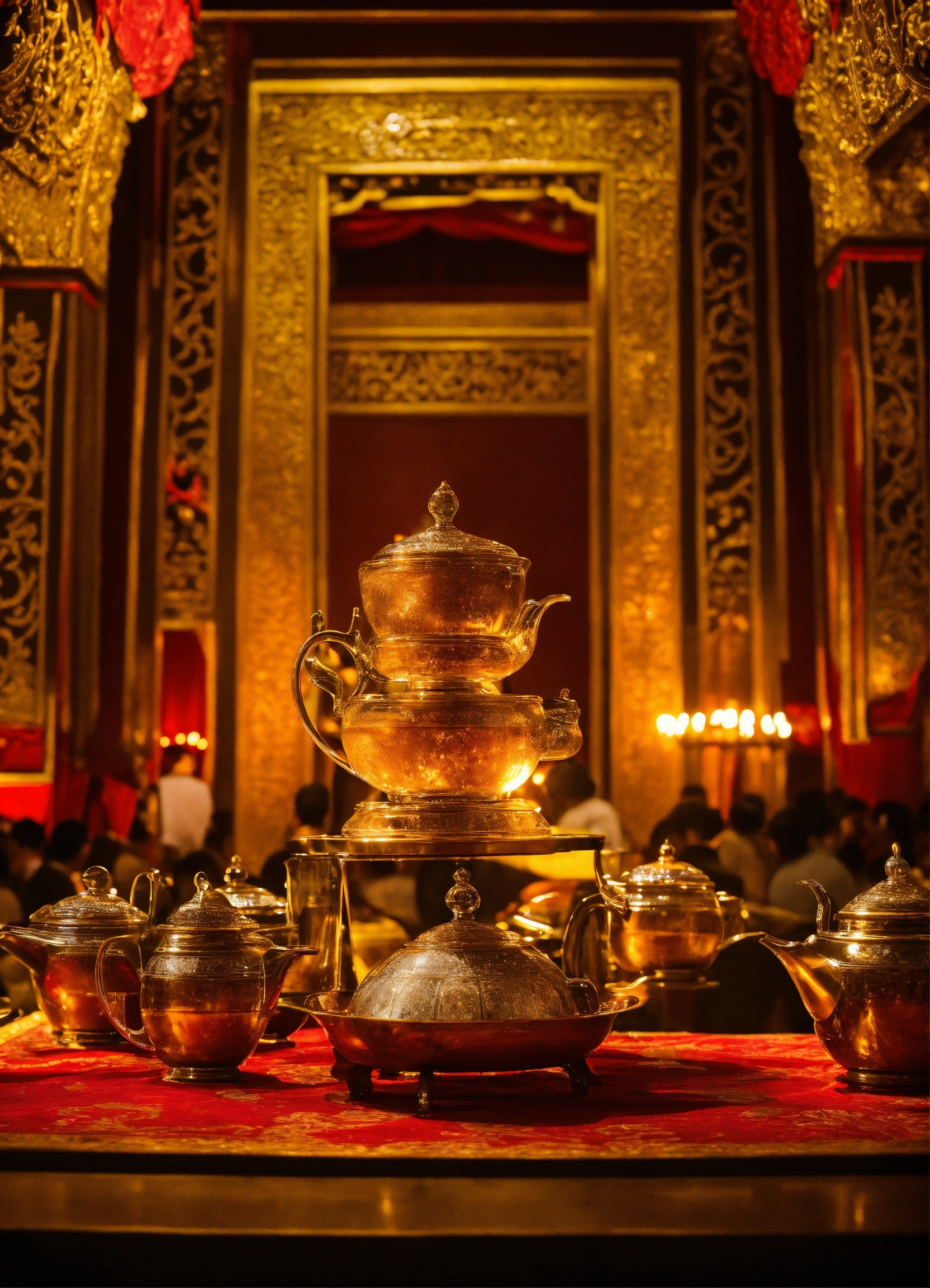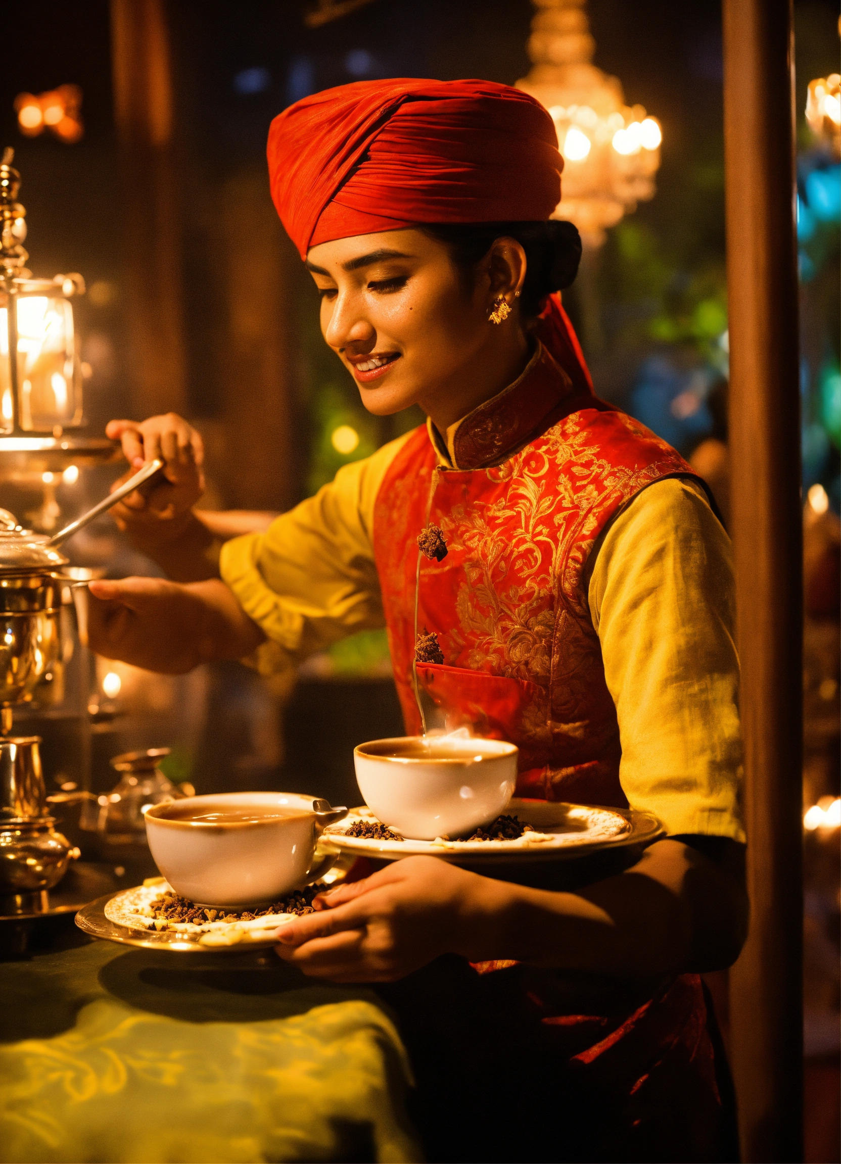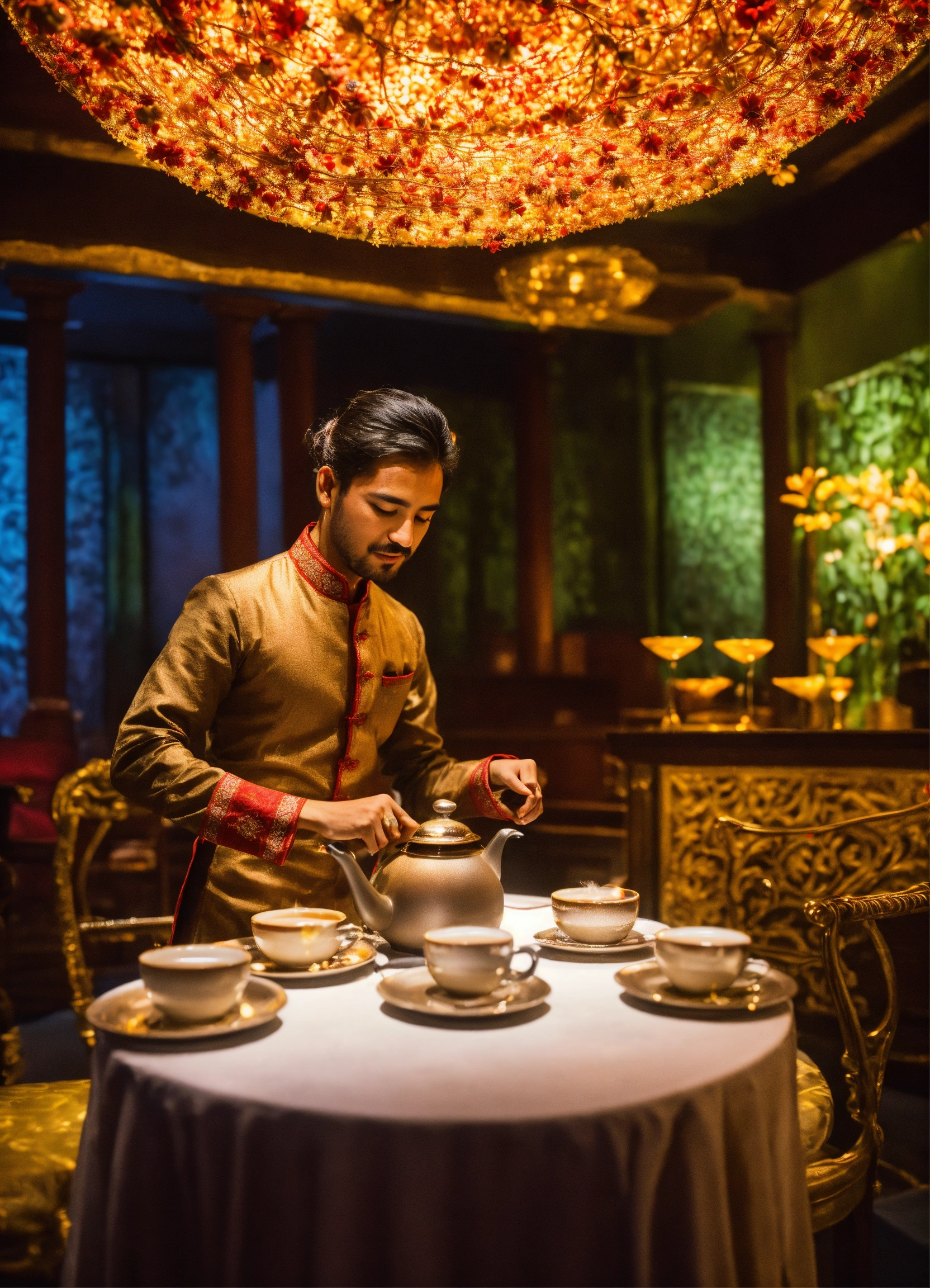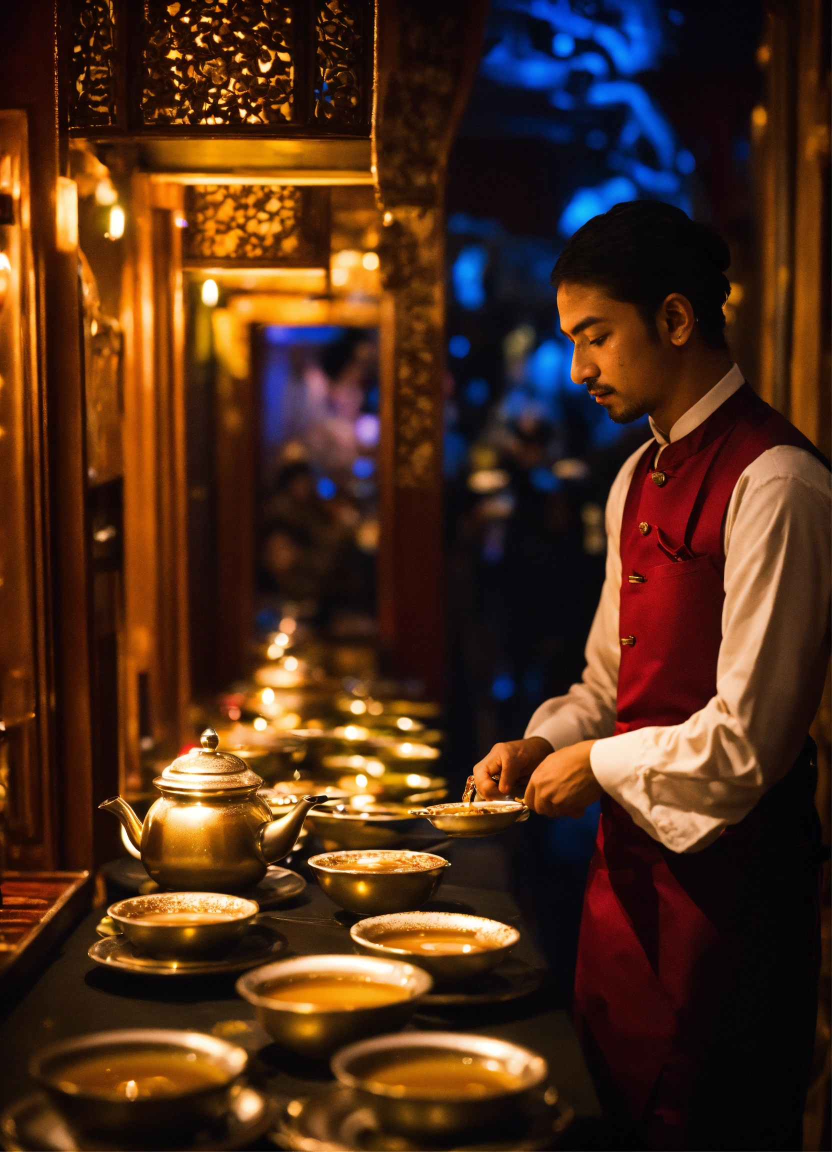 Skilled servers pour chai tea in a theatrical manner