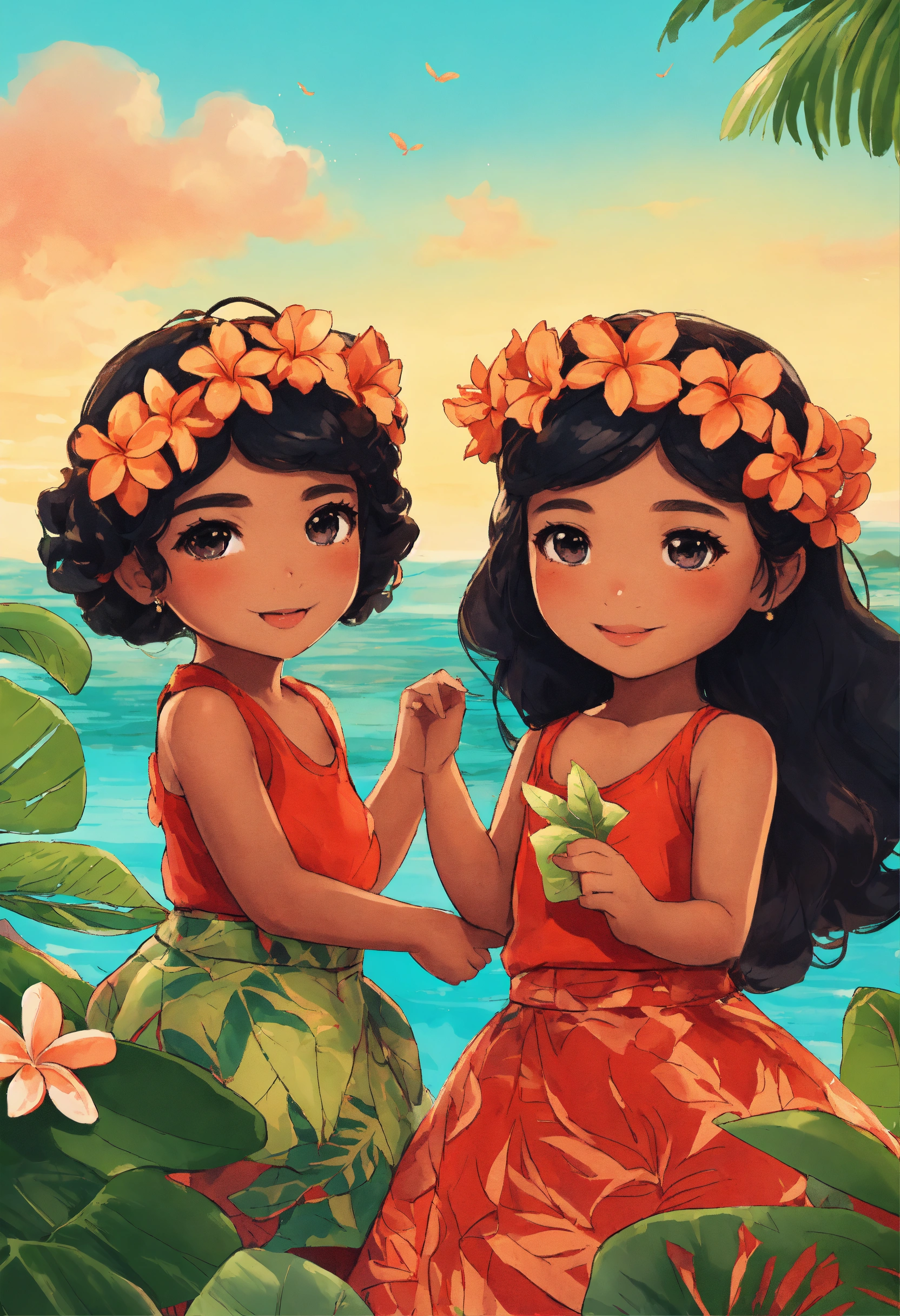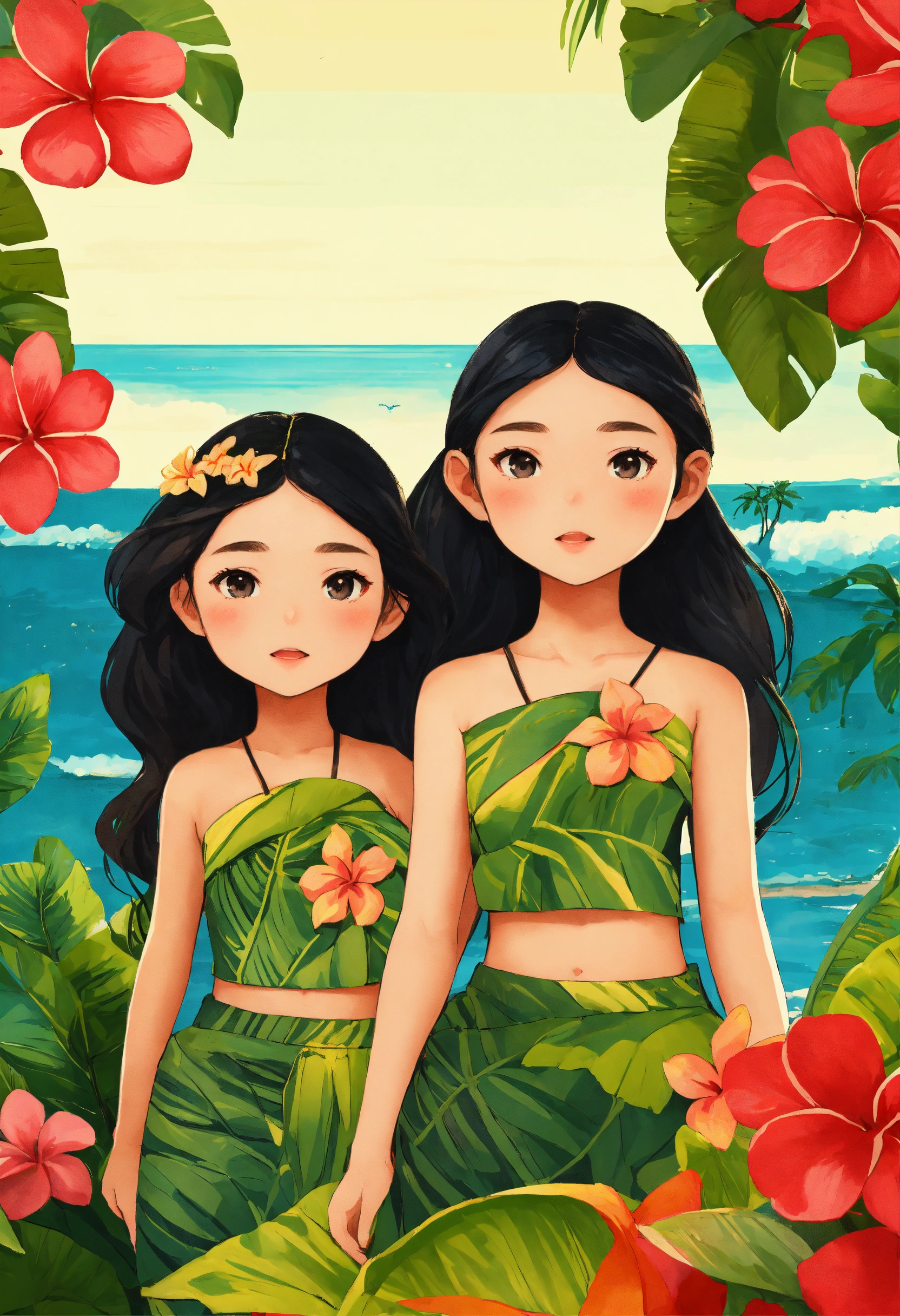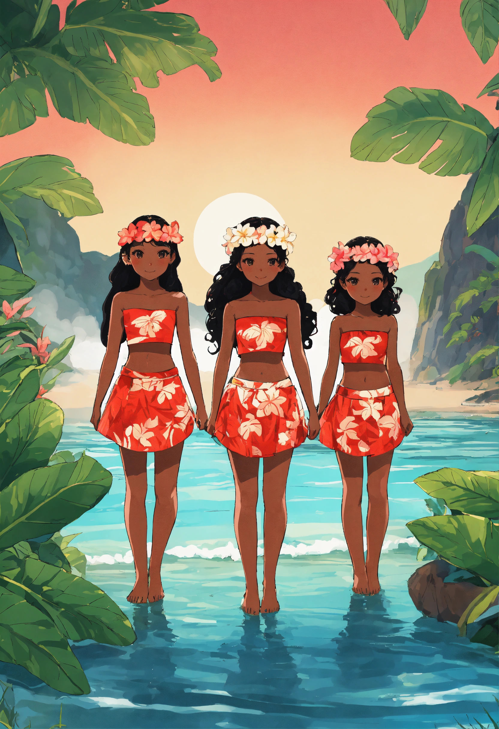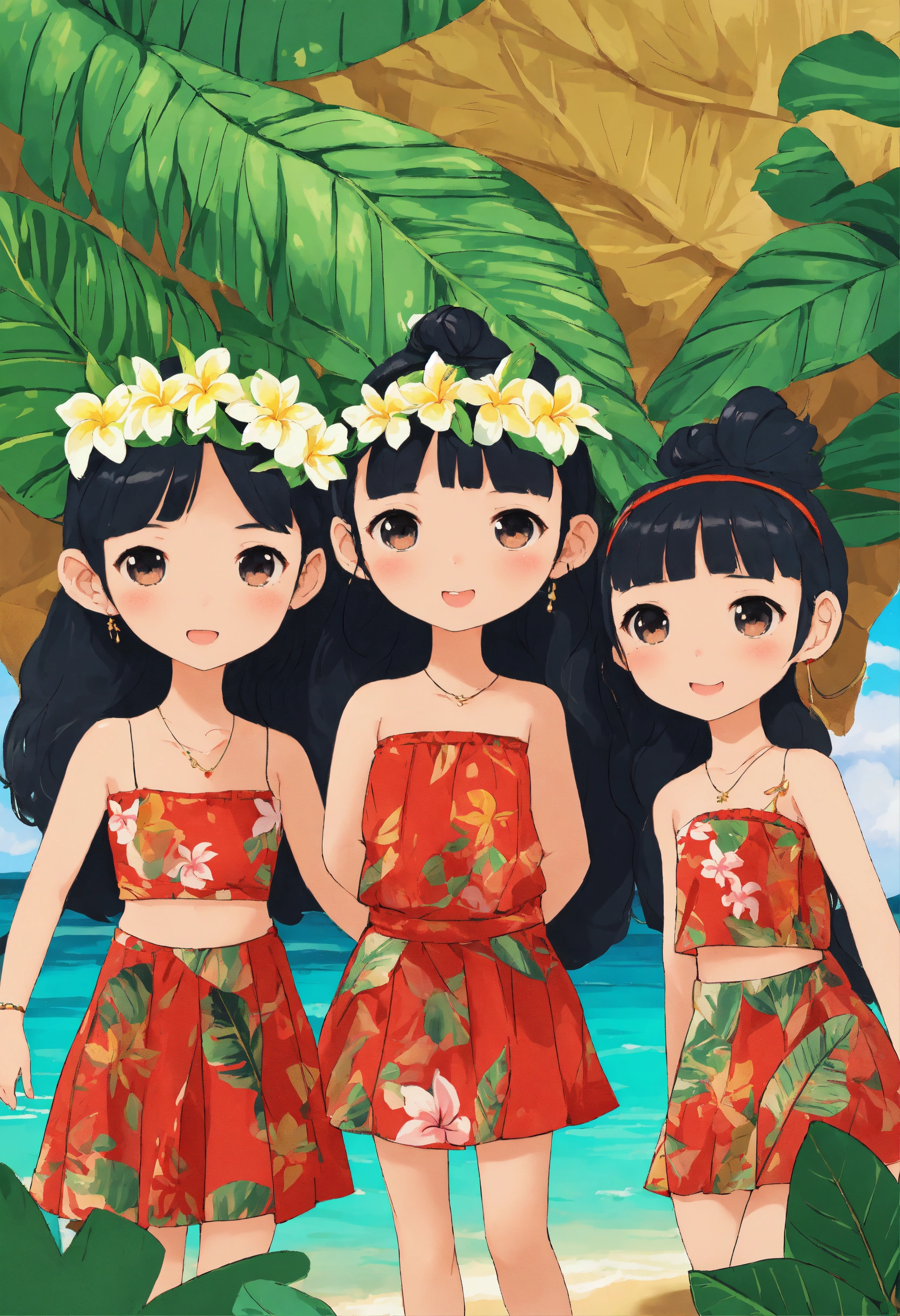 Illustration of three girls, little girls wearing a plumeria headdress on their head, red tube tops and leaf skirts, they are wearing a skirt made of leaves, a dreamy gaze, the background is hawaii sea, black hair, 4k, 8k, asian beauty, moani, die cut sticker