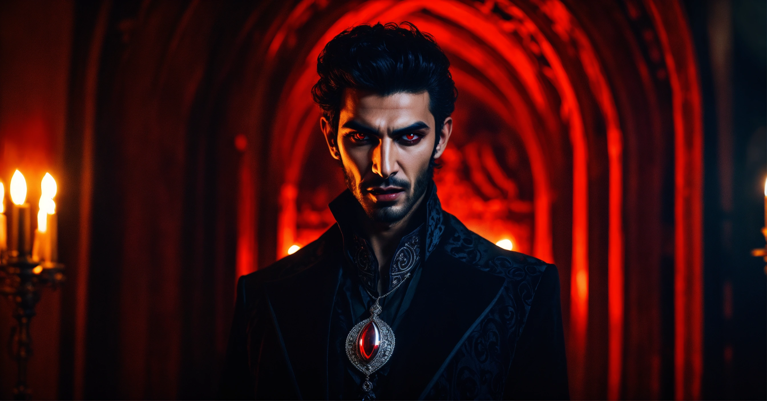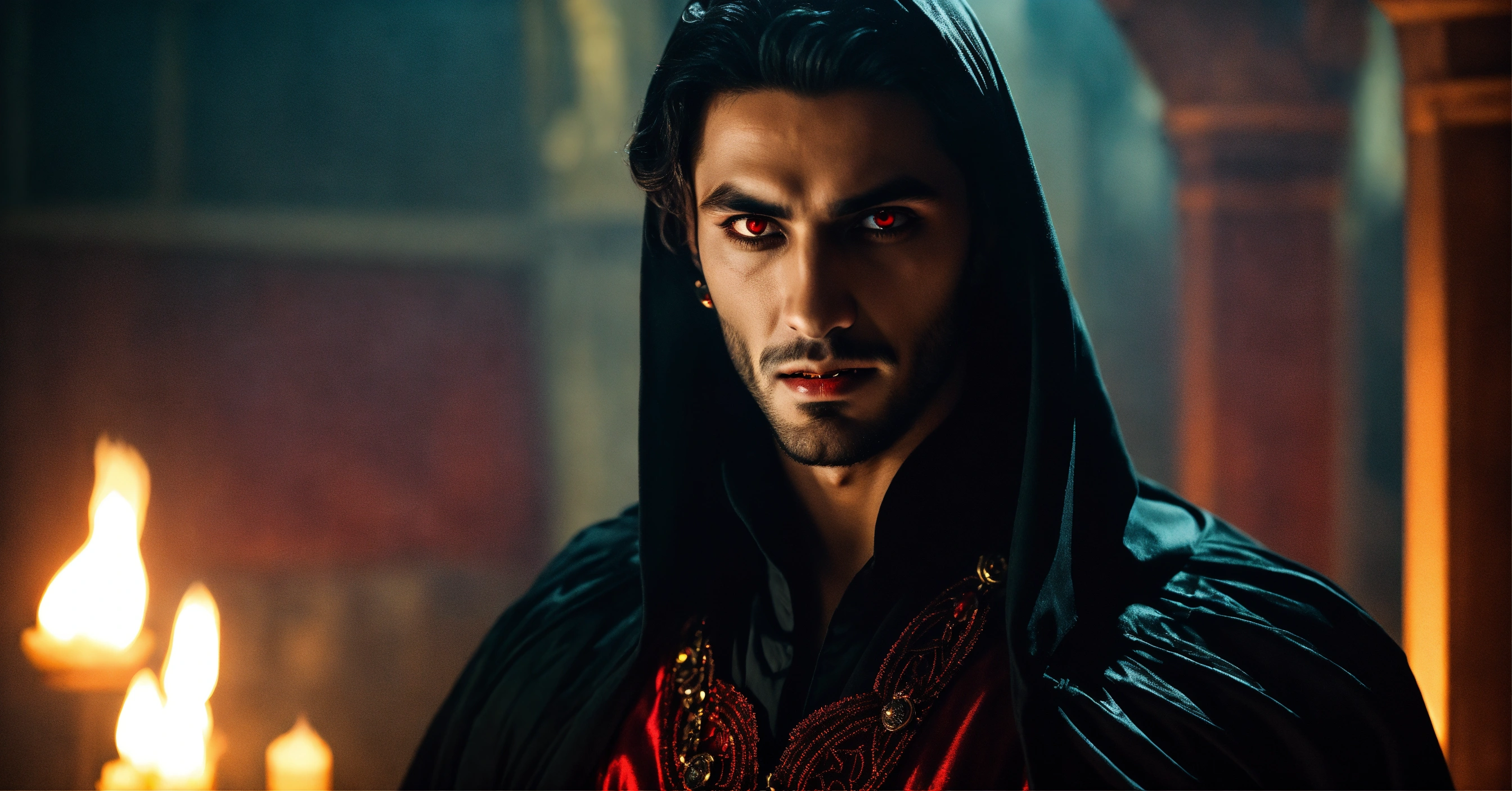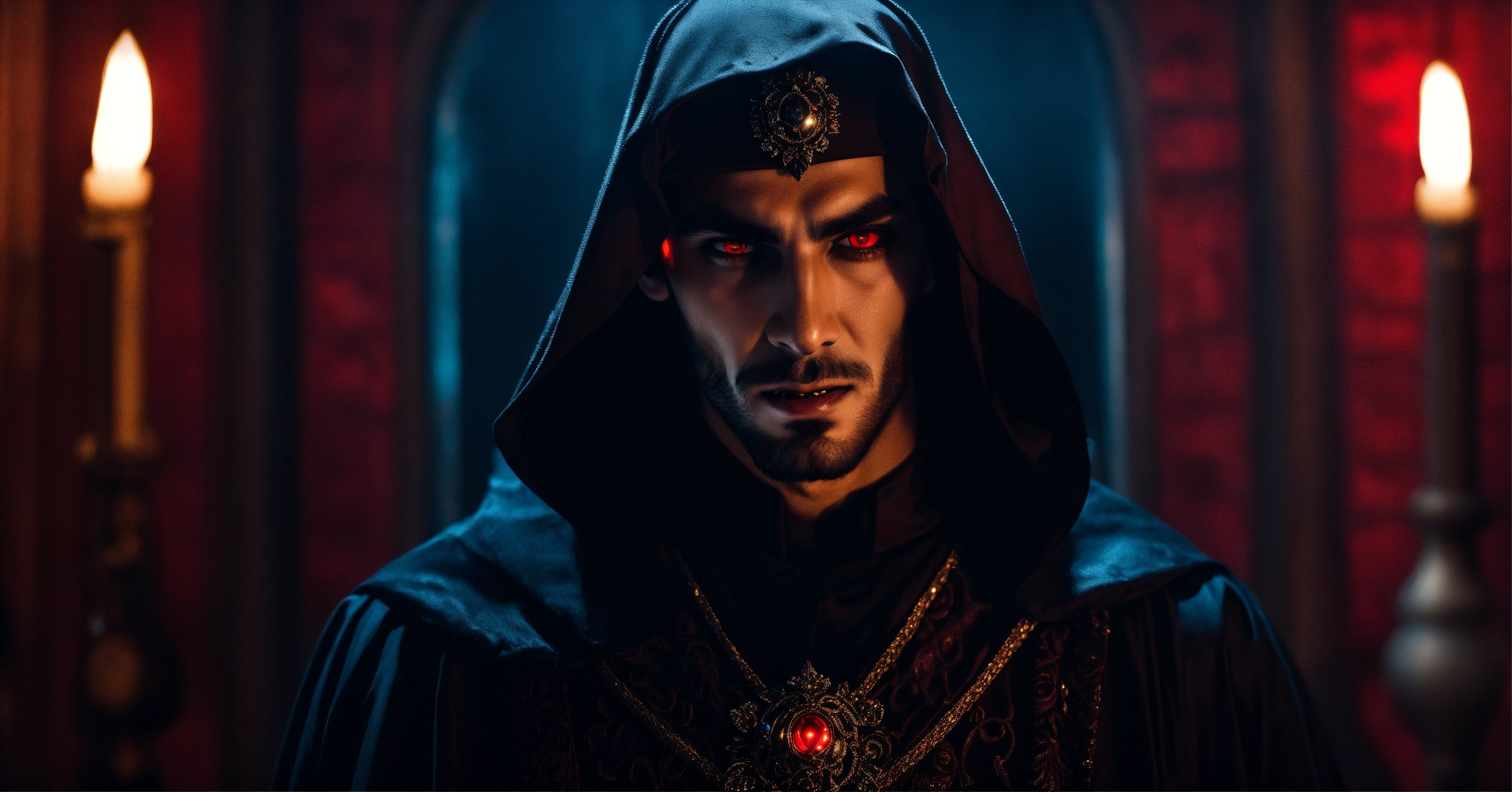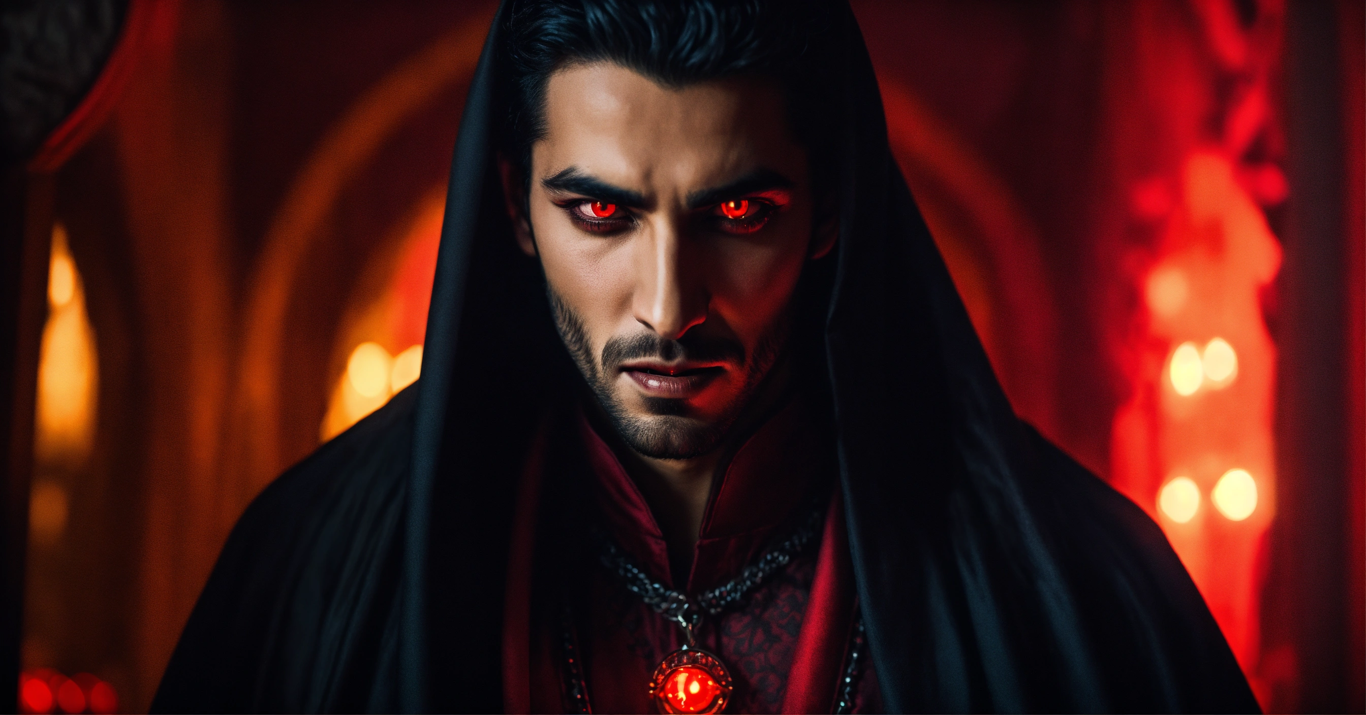 Sinister and dramatic portrait of a young handsome arab evil vampire with hypnotically glowing red eyes and gleaming fangs wearing dark elaborate mystical clothes, mesmerising the viewer in a hidden dimly lit chamber.