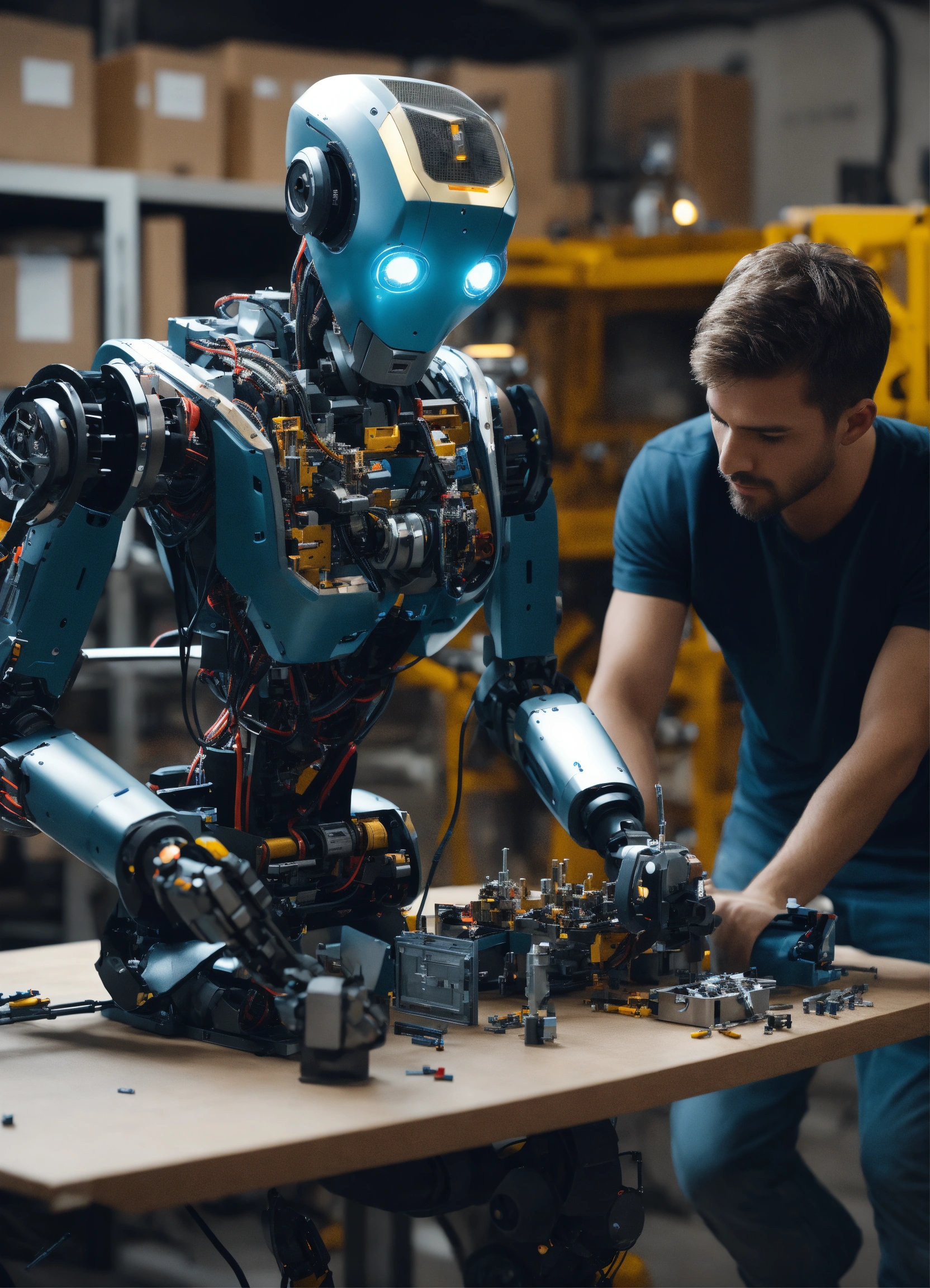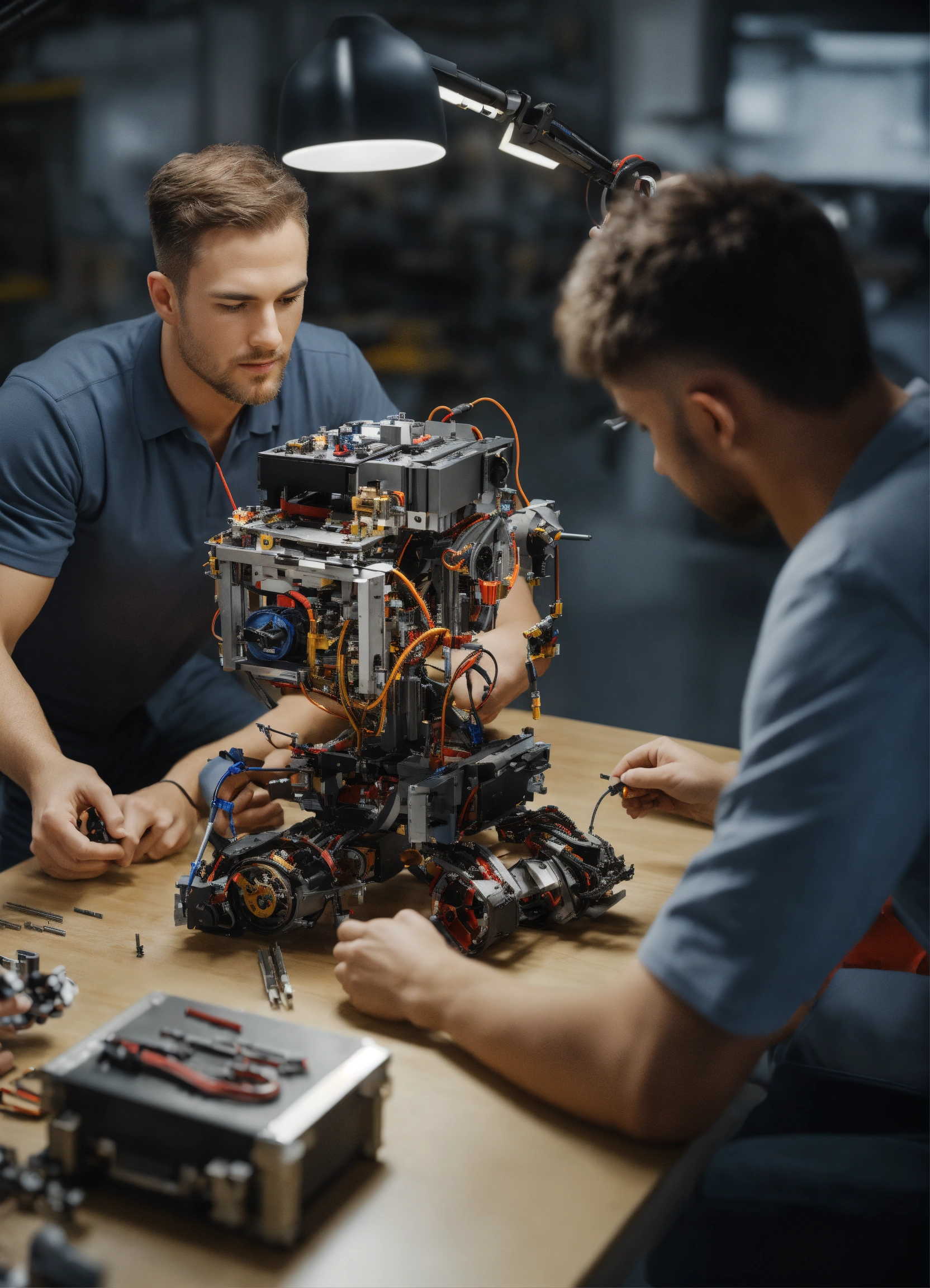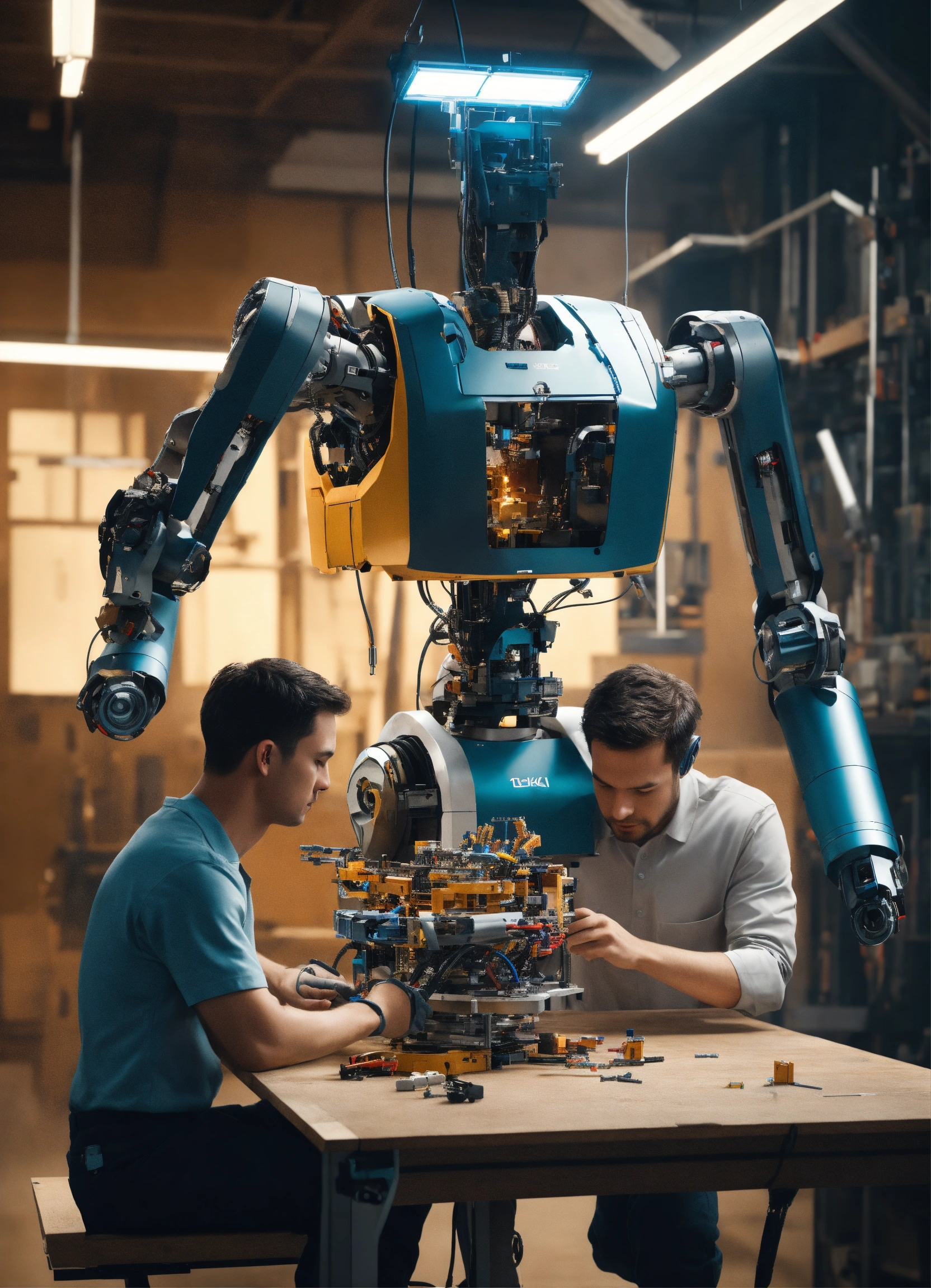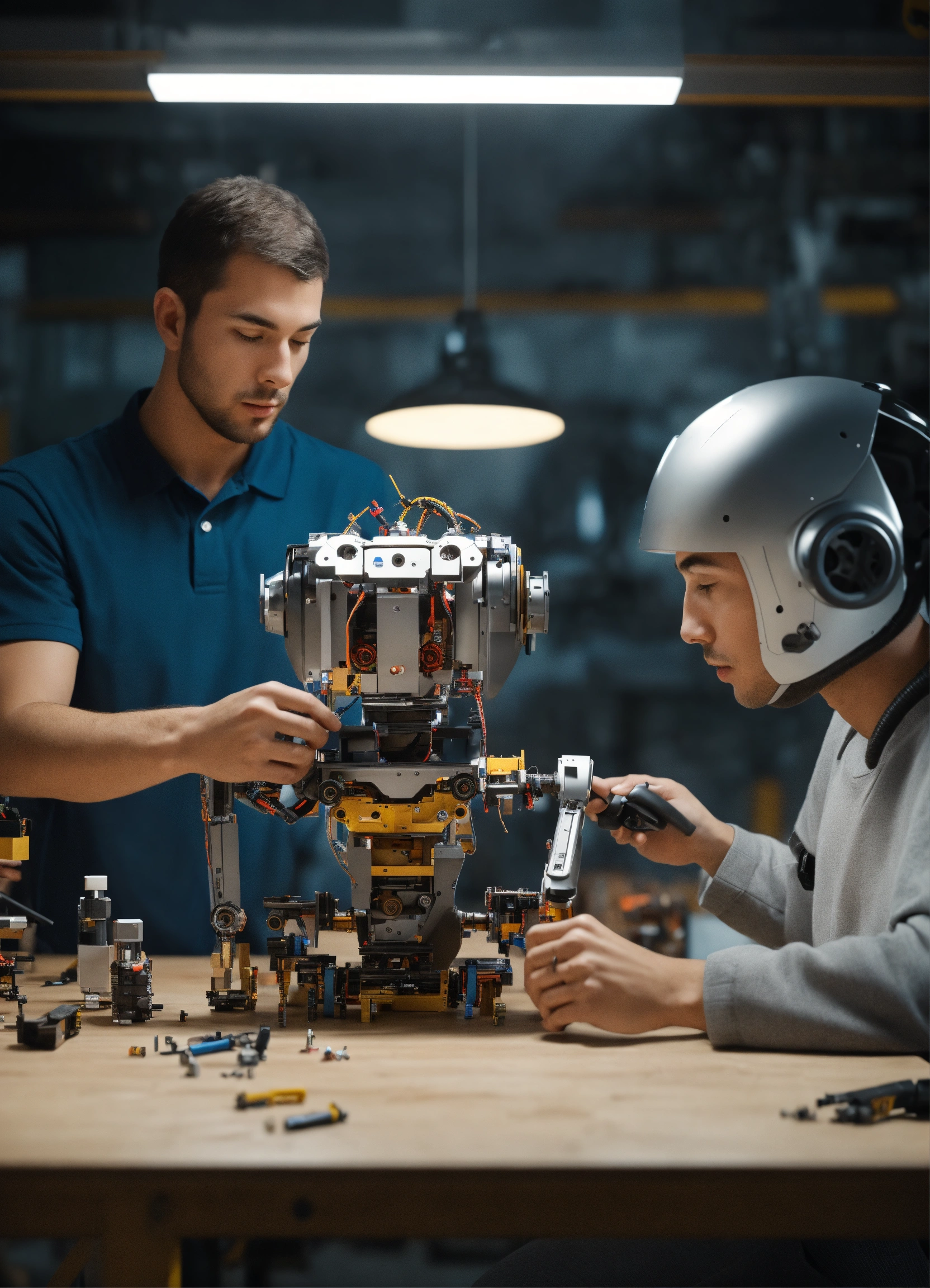 Generate a hyper-realistic image in 4k resolution that portrays two humans assembling a robot, using parts, tools. the robot is in separate parts over an assembly table