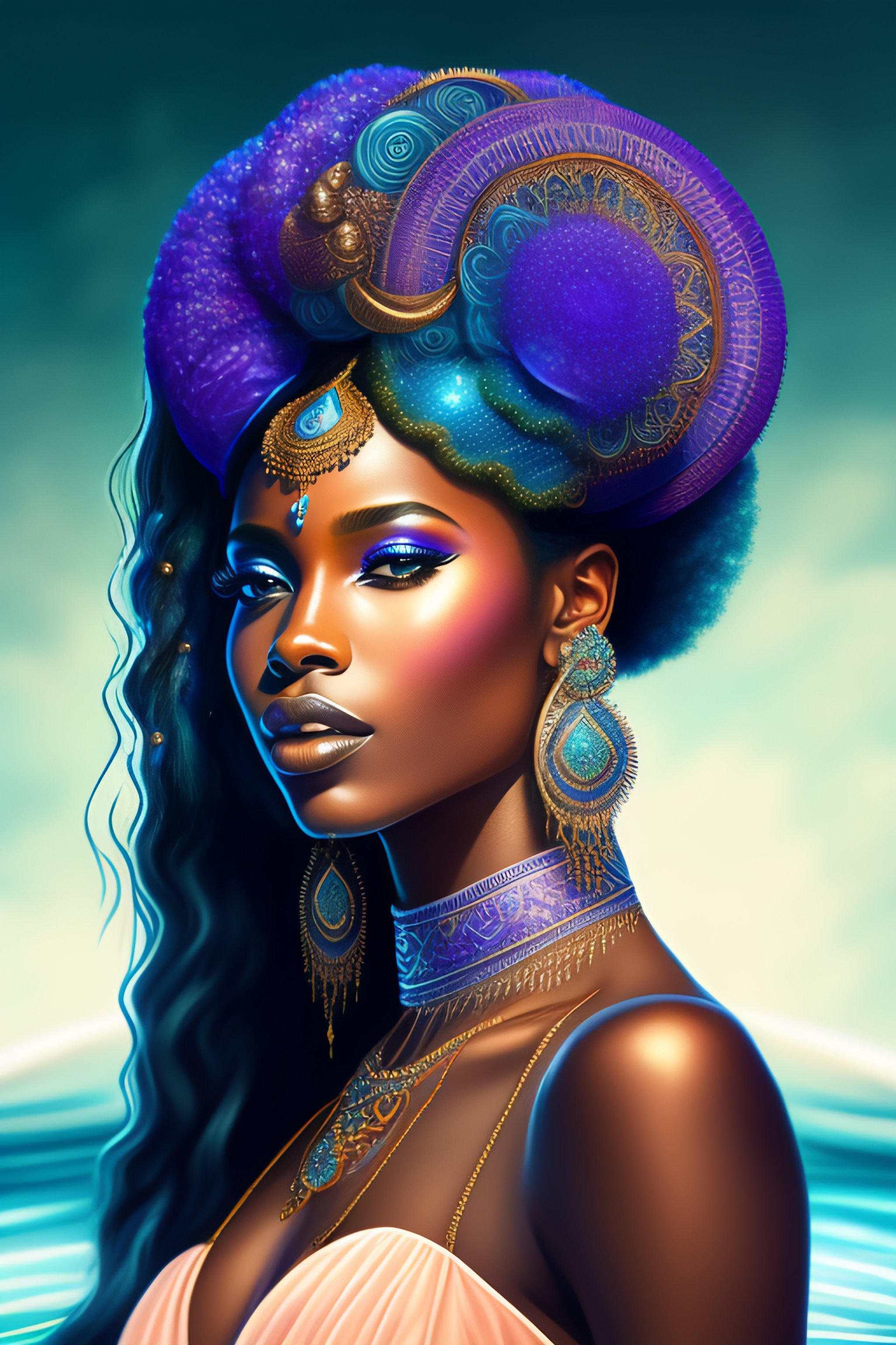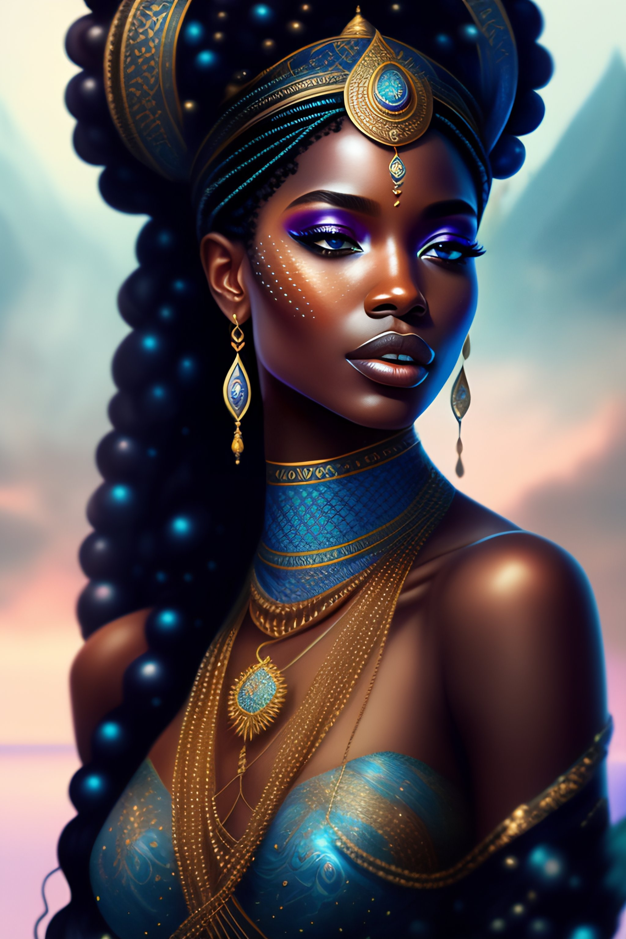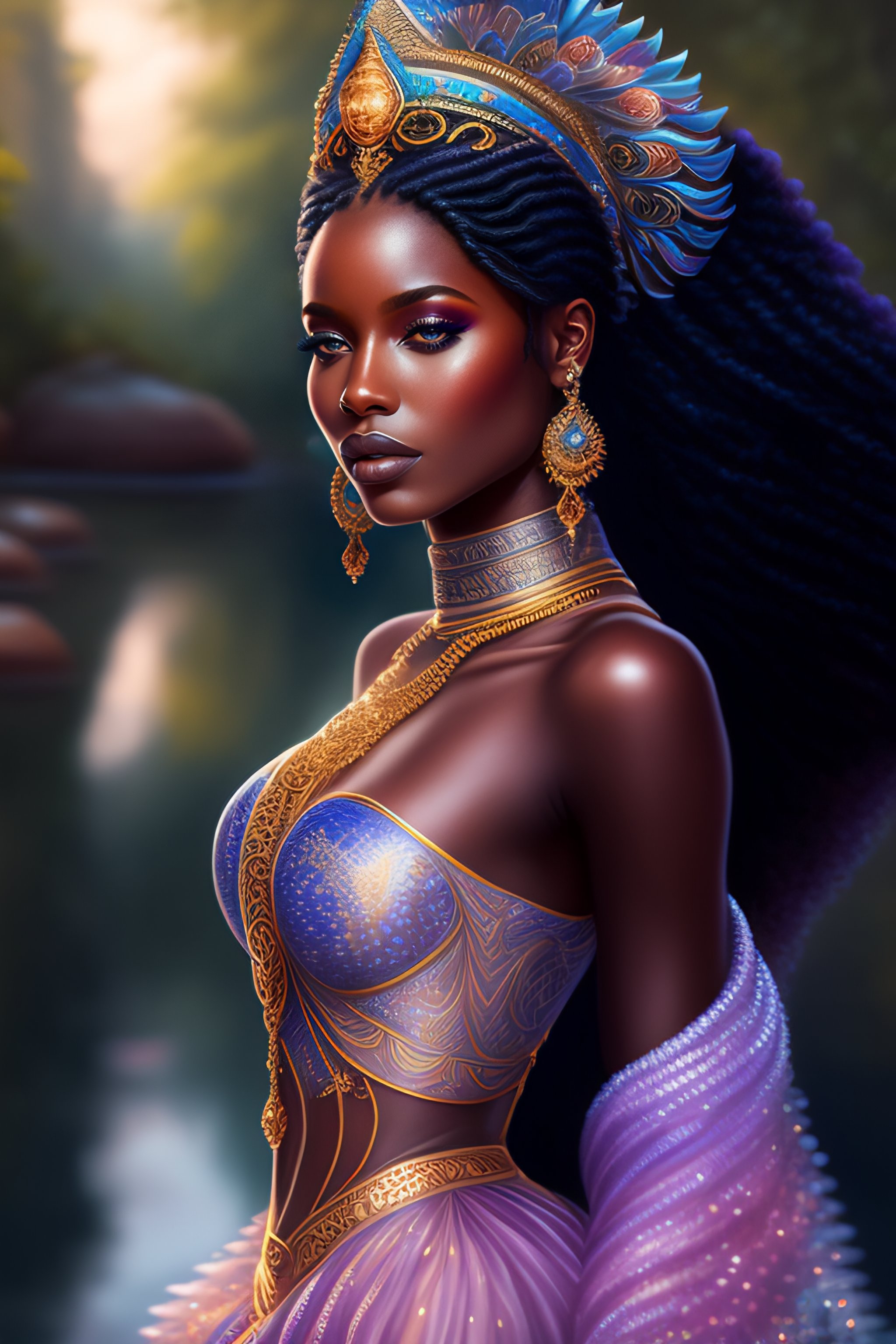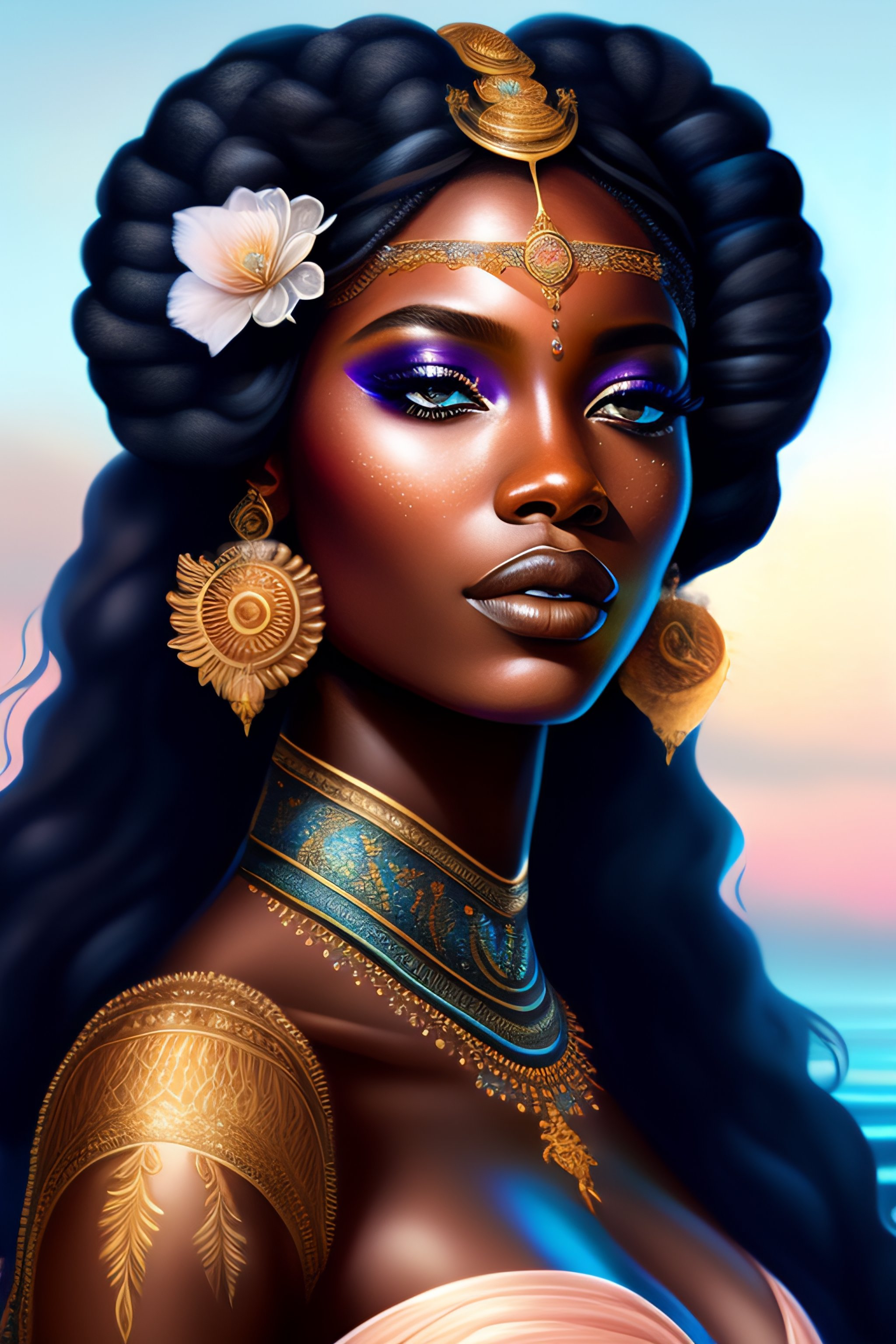 Water goddess, orisha, ralism, intertwined with a water, elegant lace dress, black woman, universe fulfilling the body, fantasy, long hair, renaissance aesthetic, realistic aesthetic, pastel colors aesthetic, intricate fashion clothing, highly detailed, surrealistic, digital painting, concept art, sharp focus, illustration, no watermarks, best of markus prime, disney princess