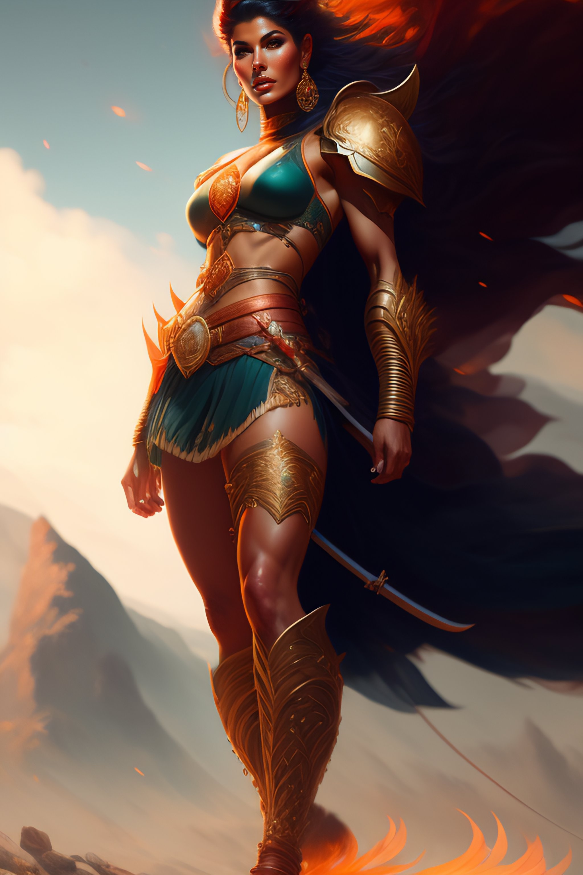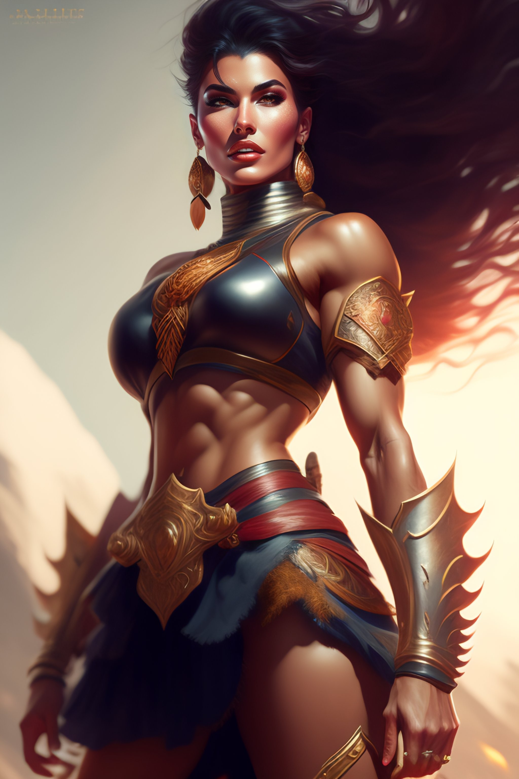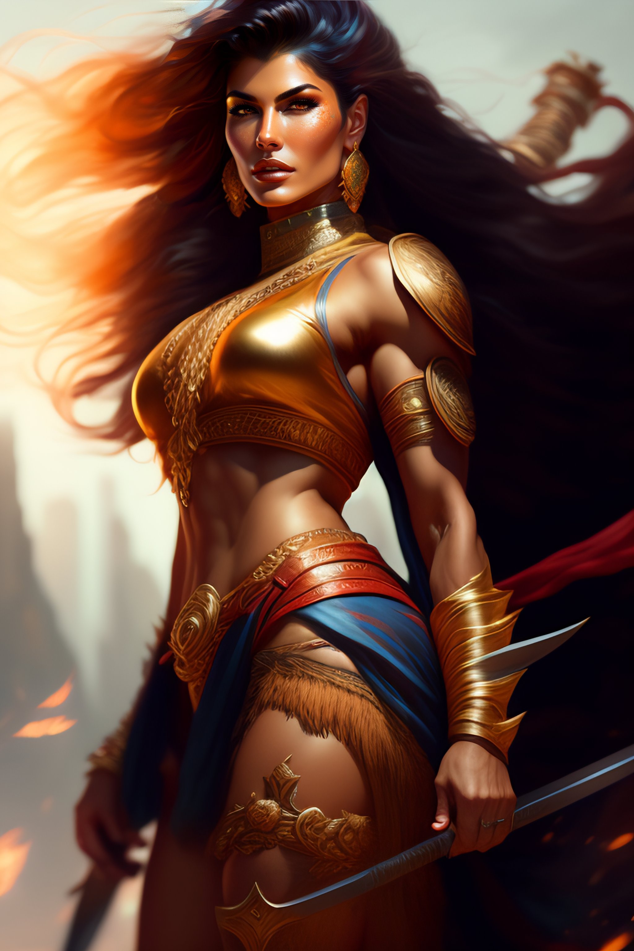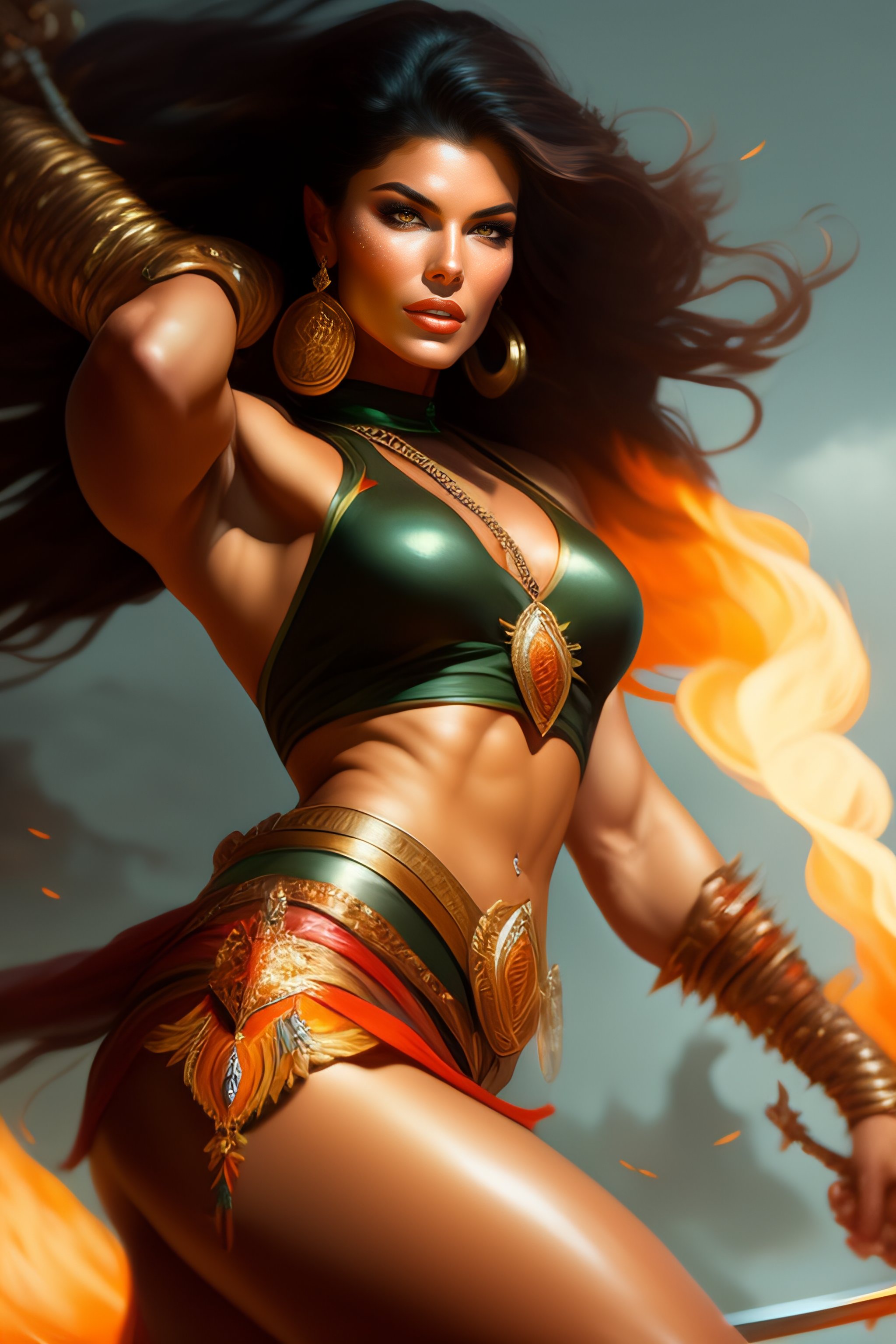 Full body potrait of muscular jacqueline fernandez as rugged warrior sparying sword(flame) in air, muscular legs and six abs, highly detailed, digital painting, artstation, concept art, smooth, sharp focus, illustration, art by tian zi and wlop and alphonse mucha