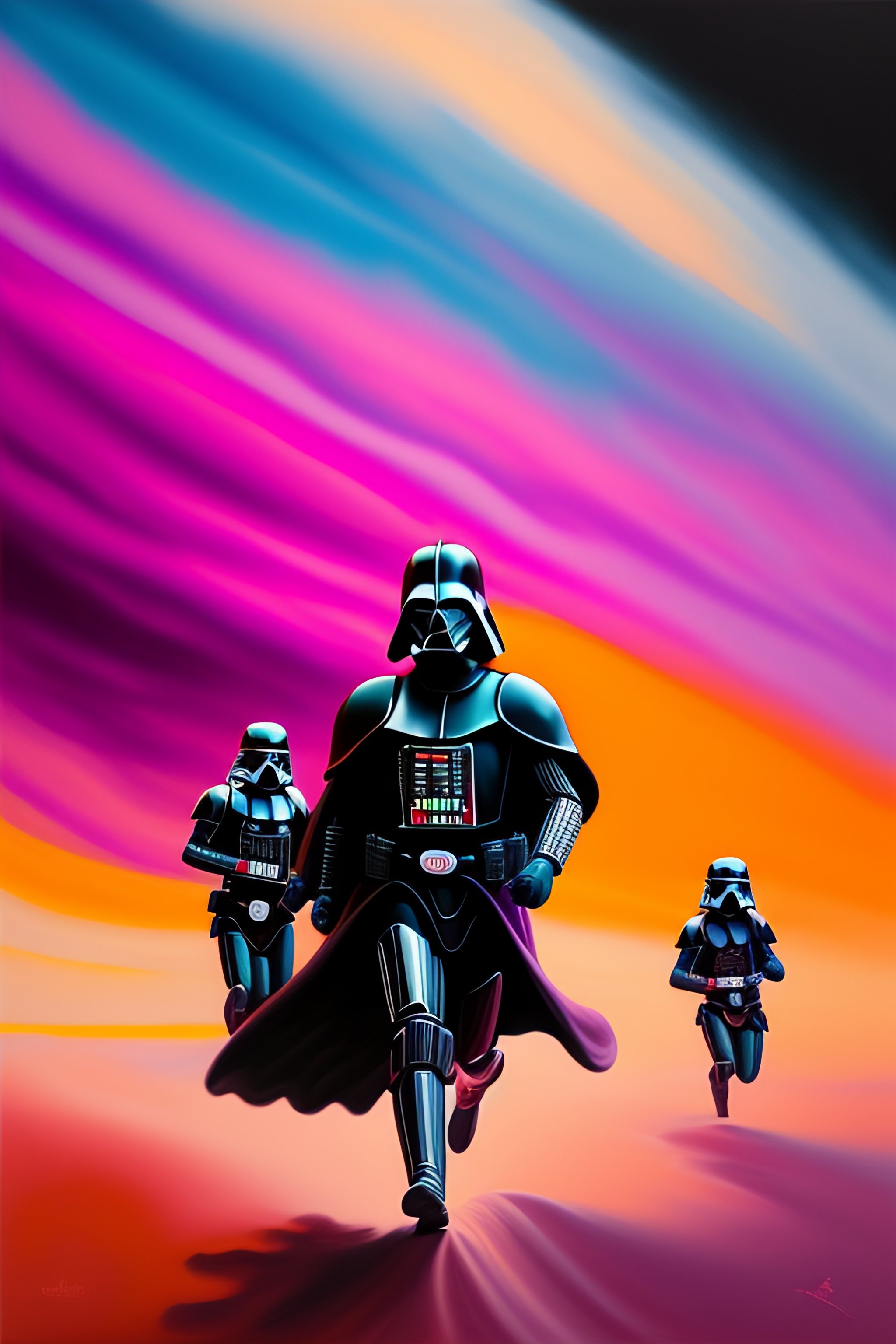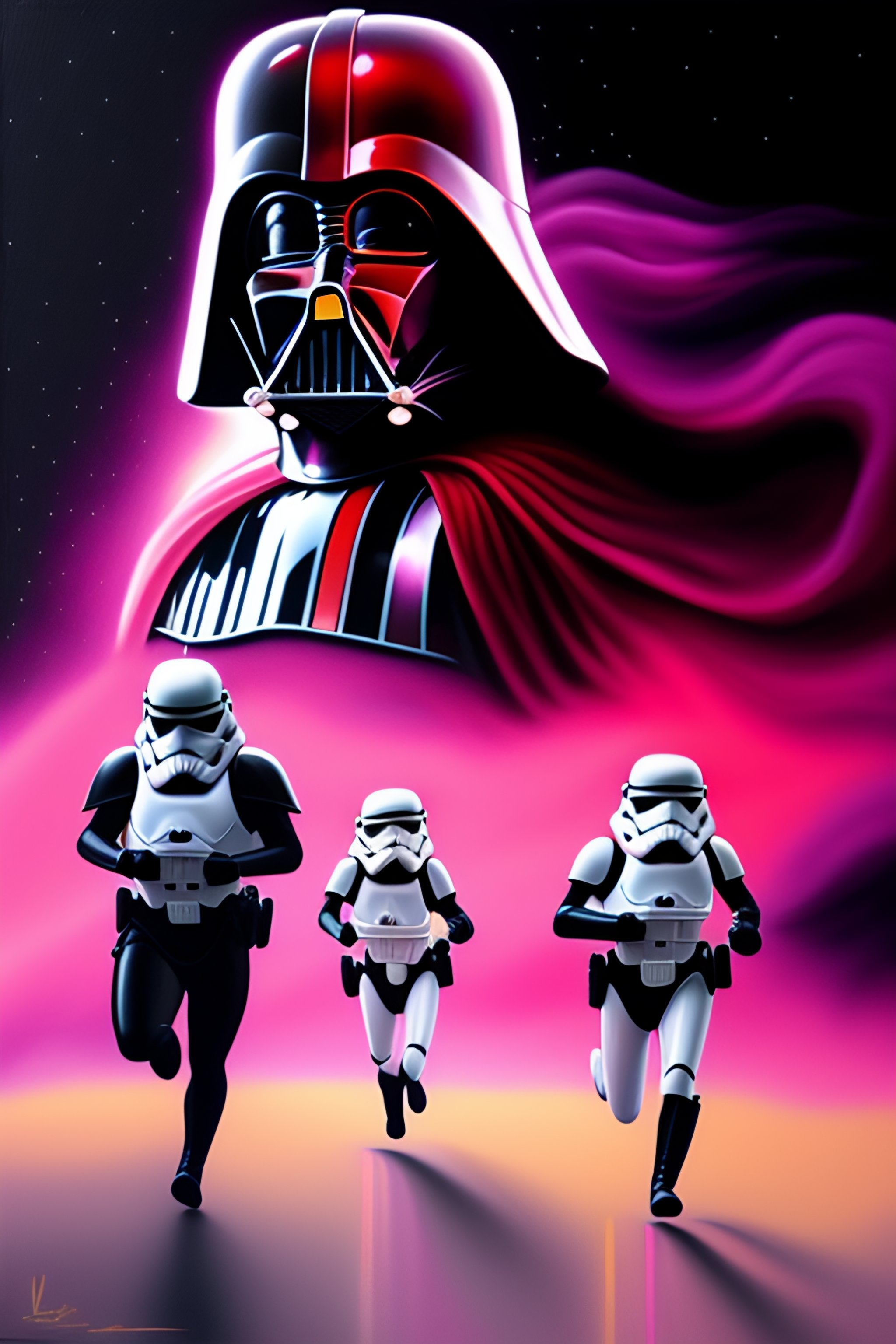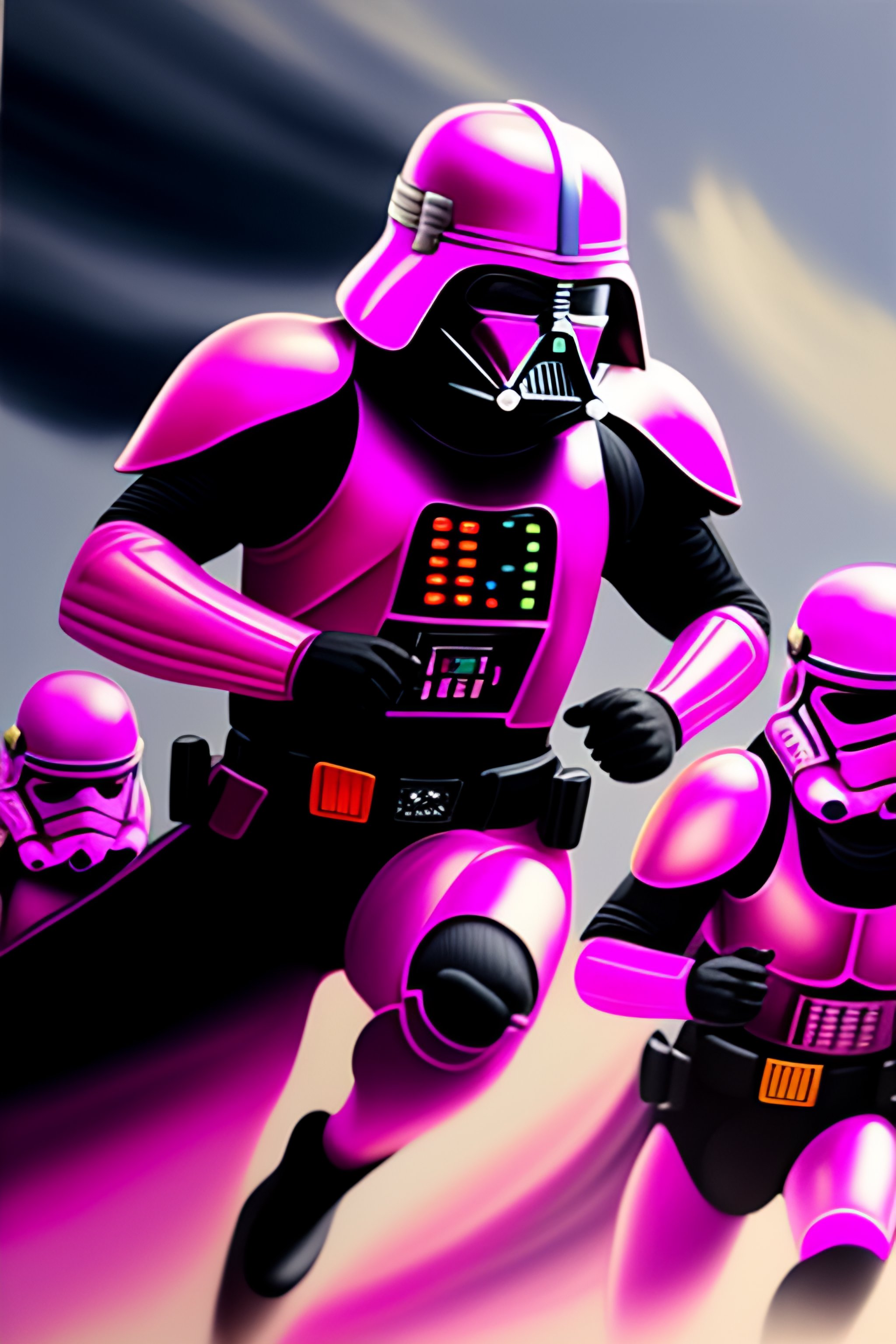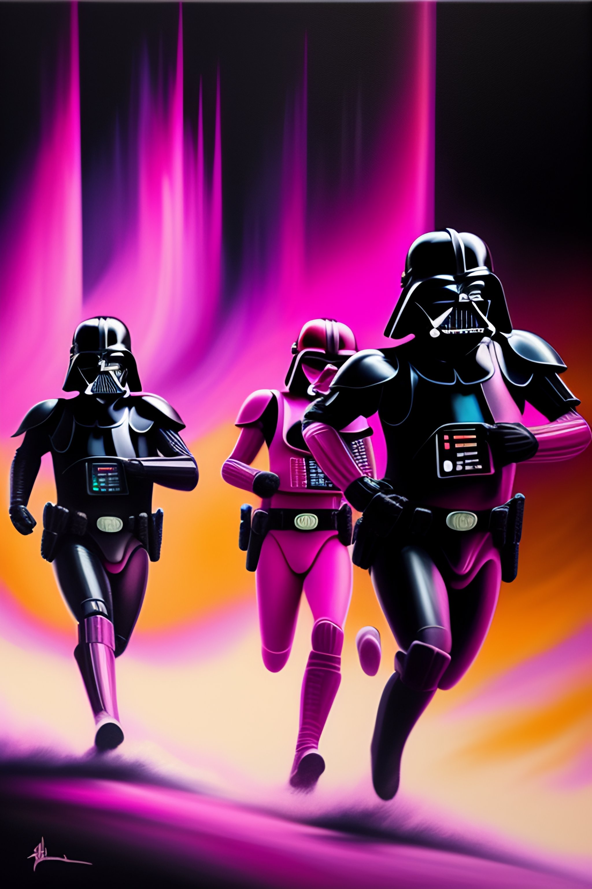 Darth vader running with stormtroopers, wearing a pink armour, oil painting, excellent quality, max details