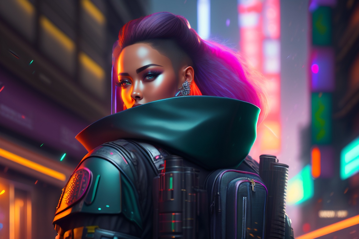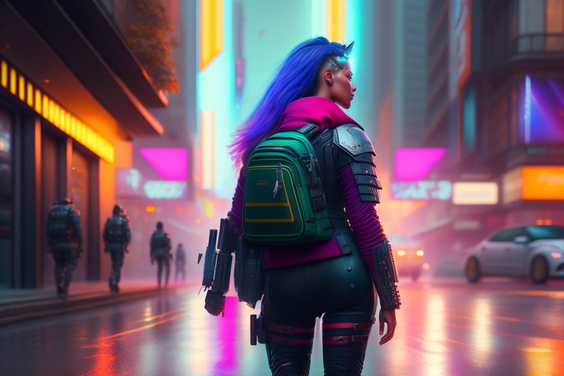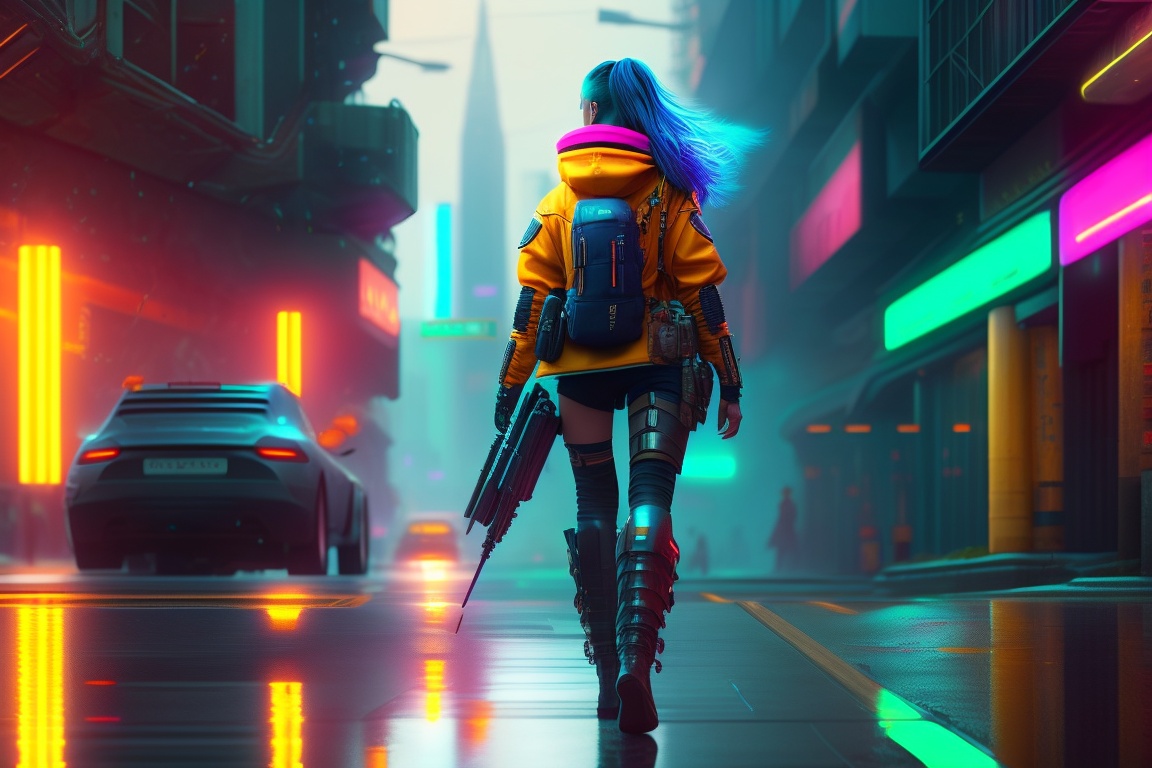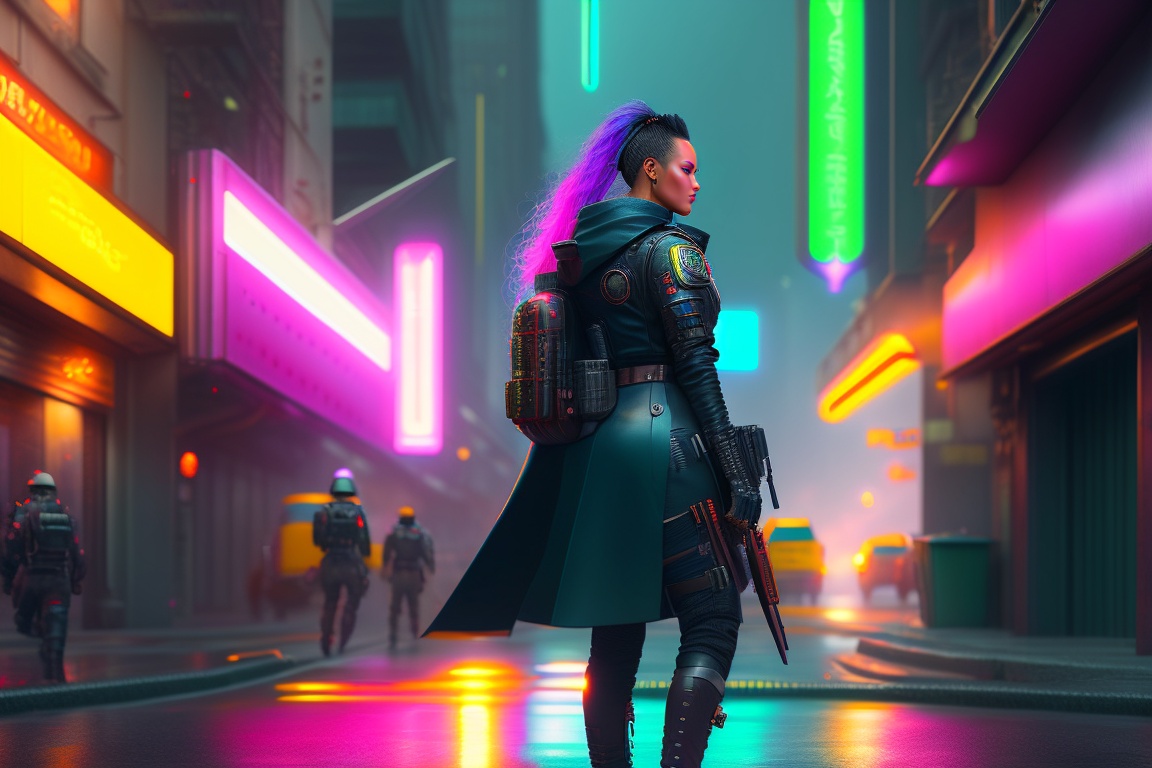 A huge cyberpunk post-apocalyptic city, raining, neon colors, a female warrior walking on the streets with her weapon, cyberpunk style, c4d blender, 4k, high quality