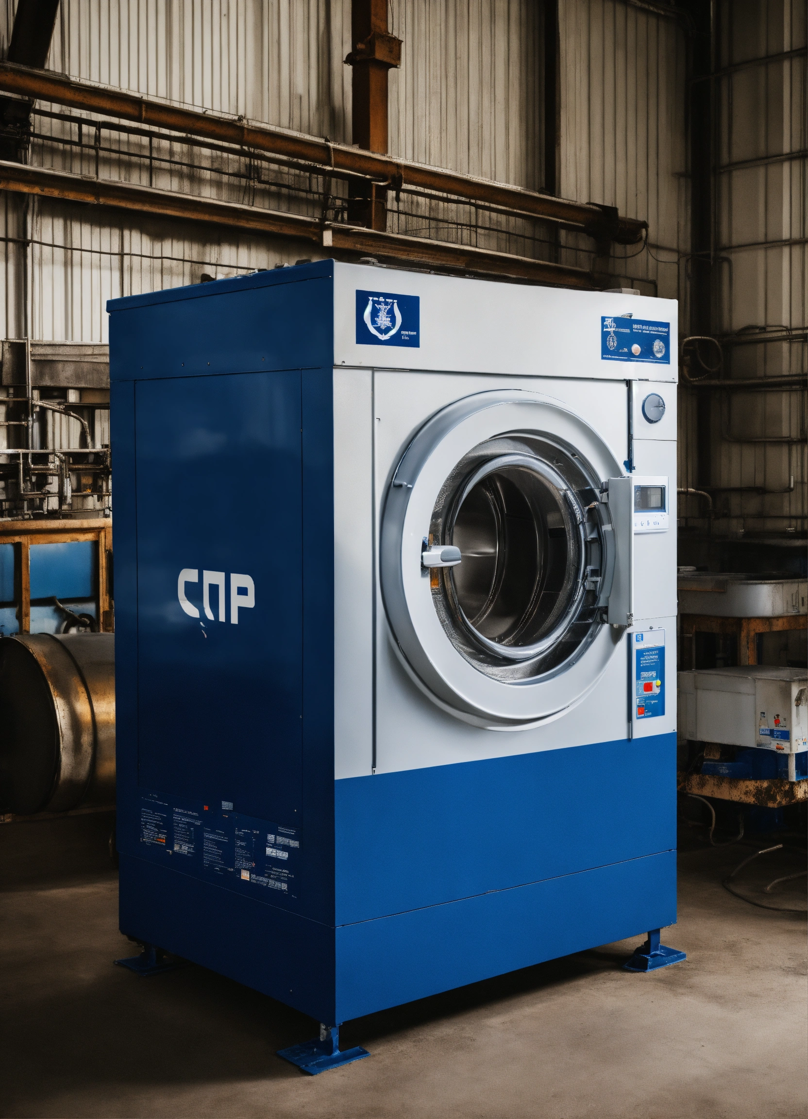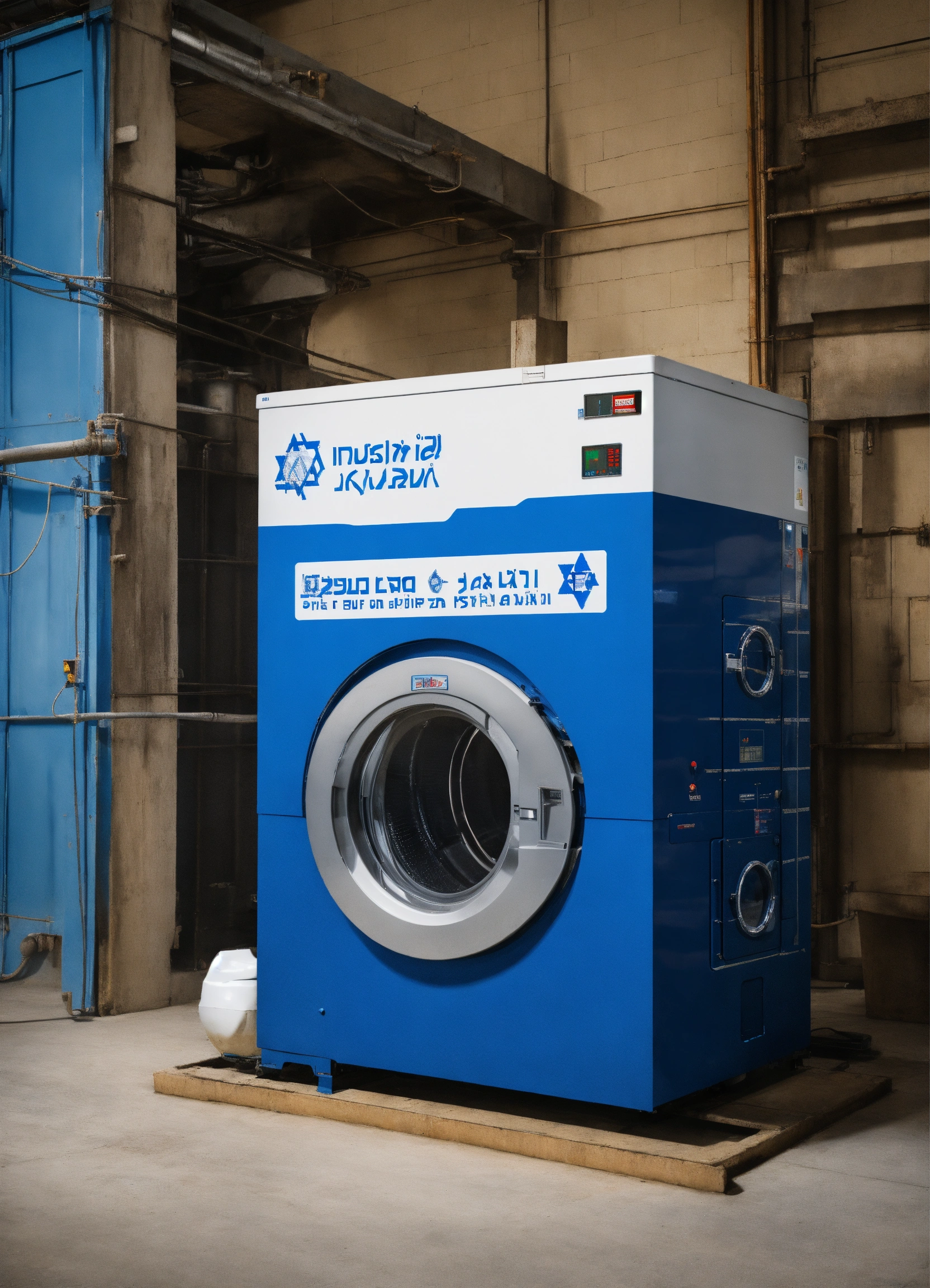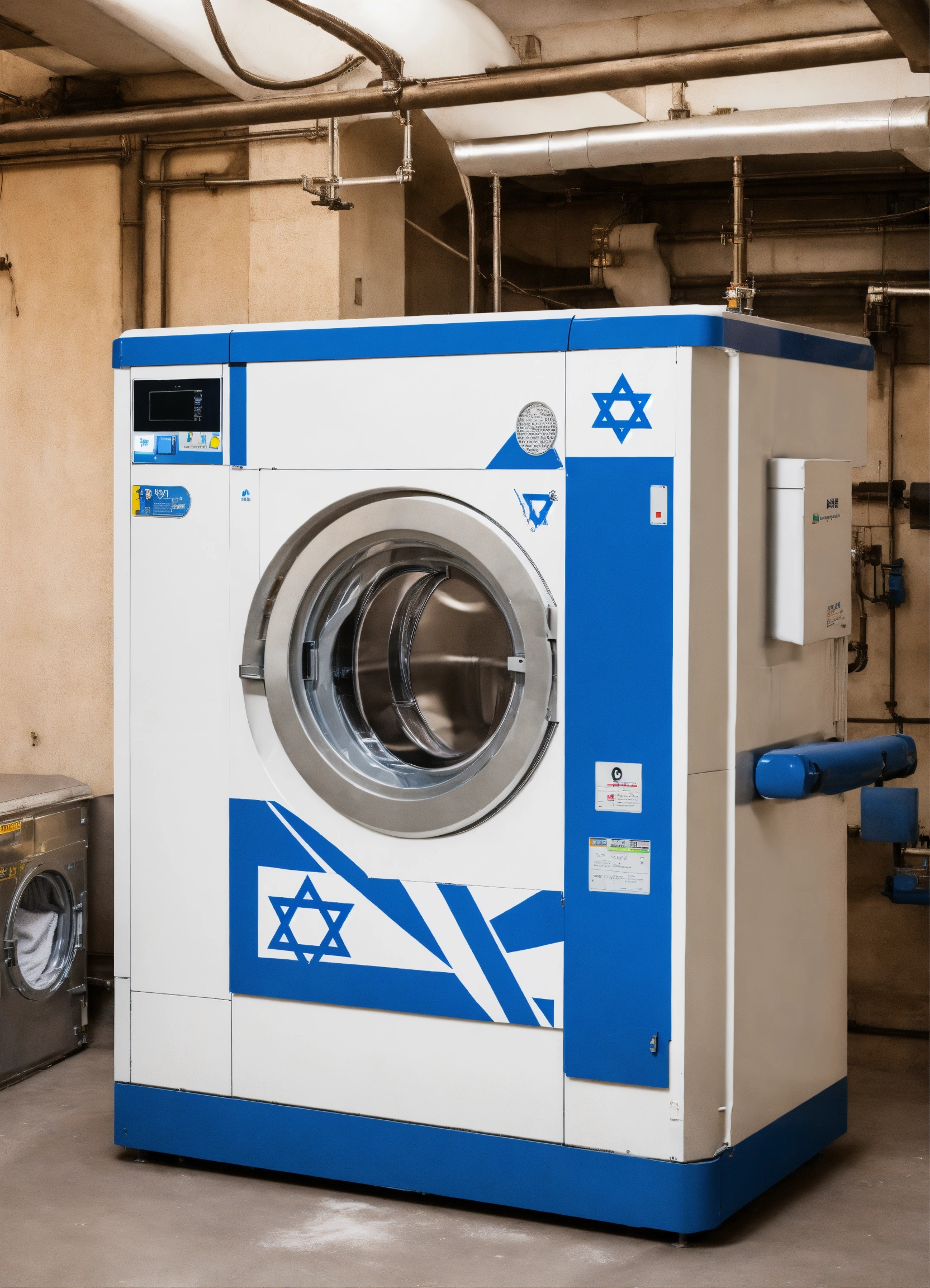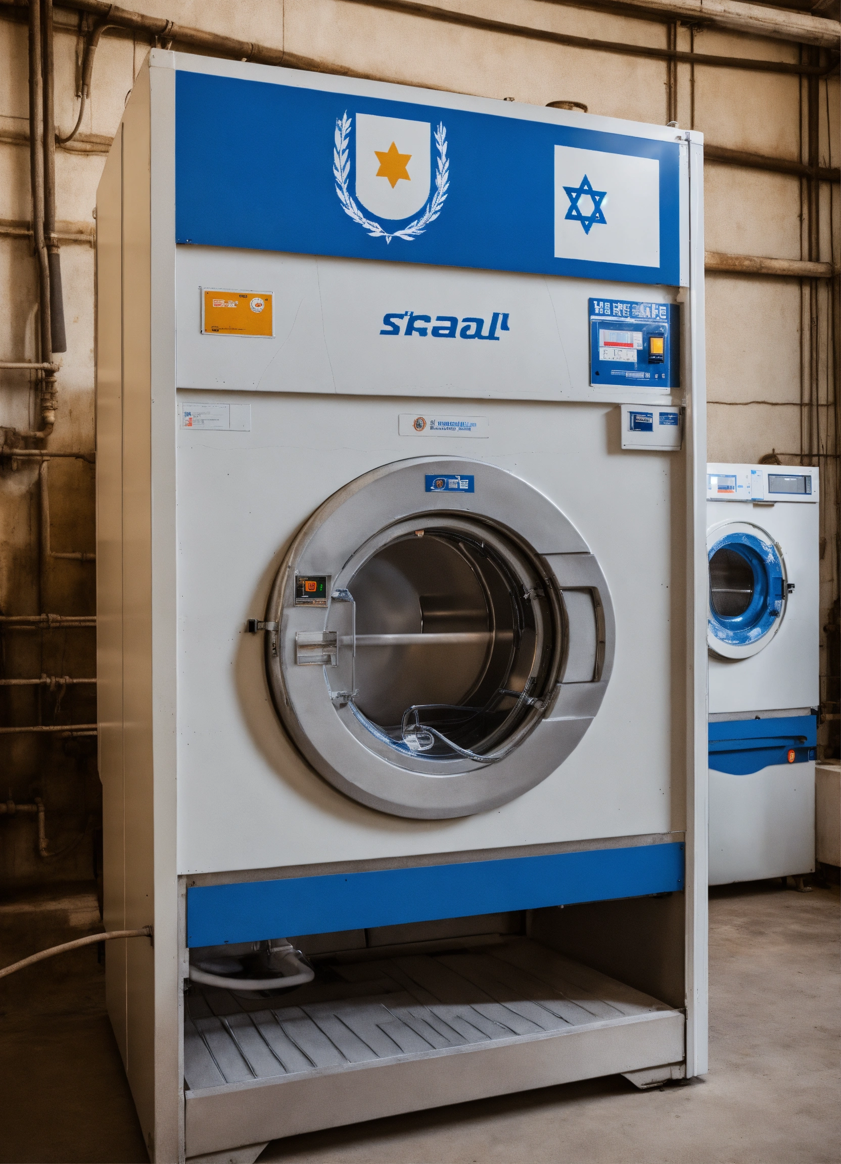 Industrial washing machine in the shape of the state of israel and in blue and white colors