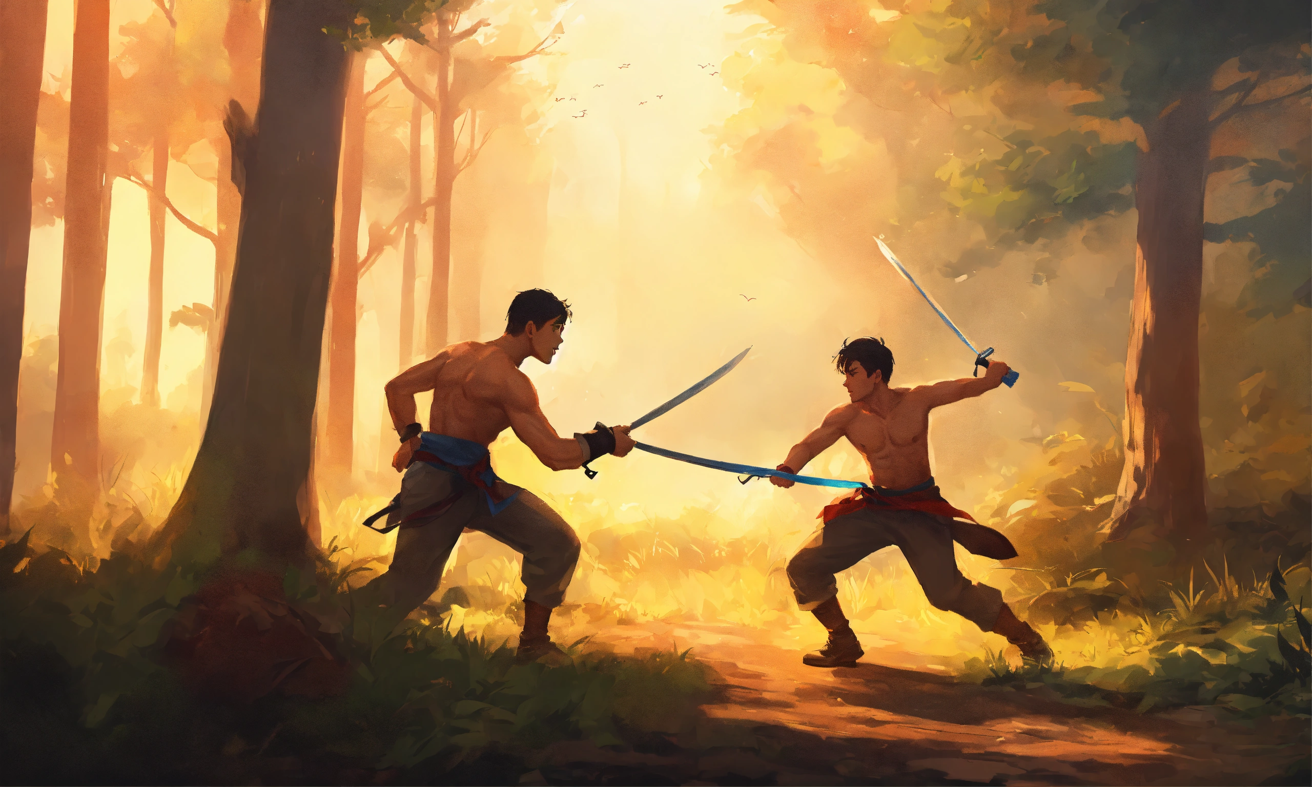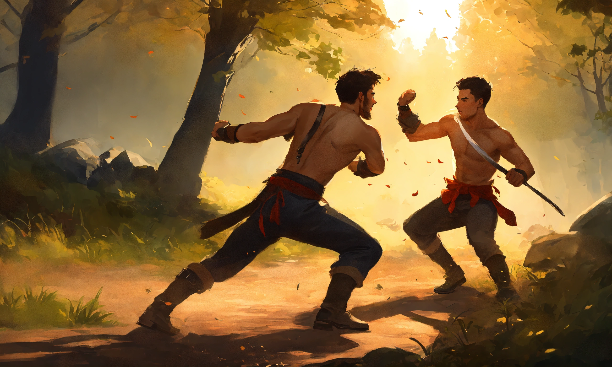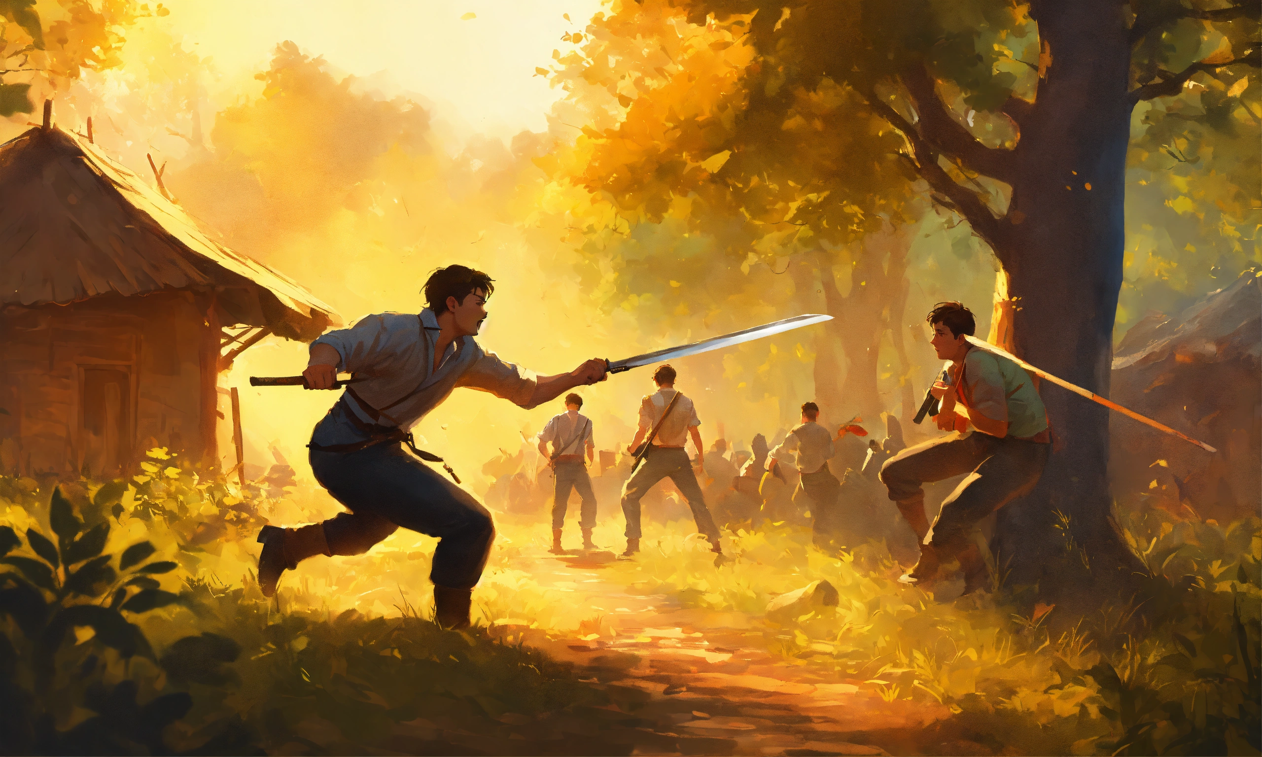 Two young men fighting in a village in forest in the style of illustrator donald zolan