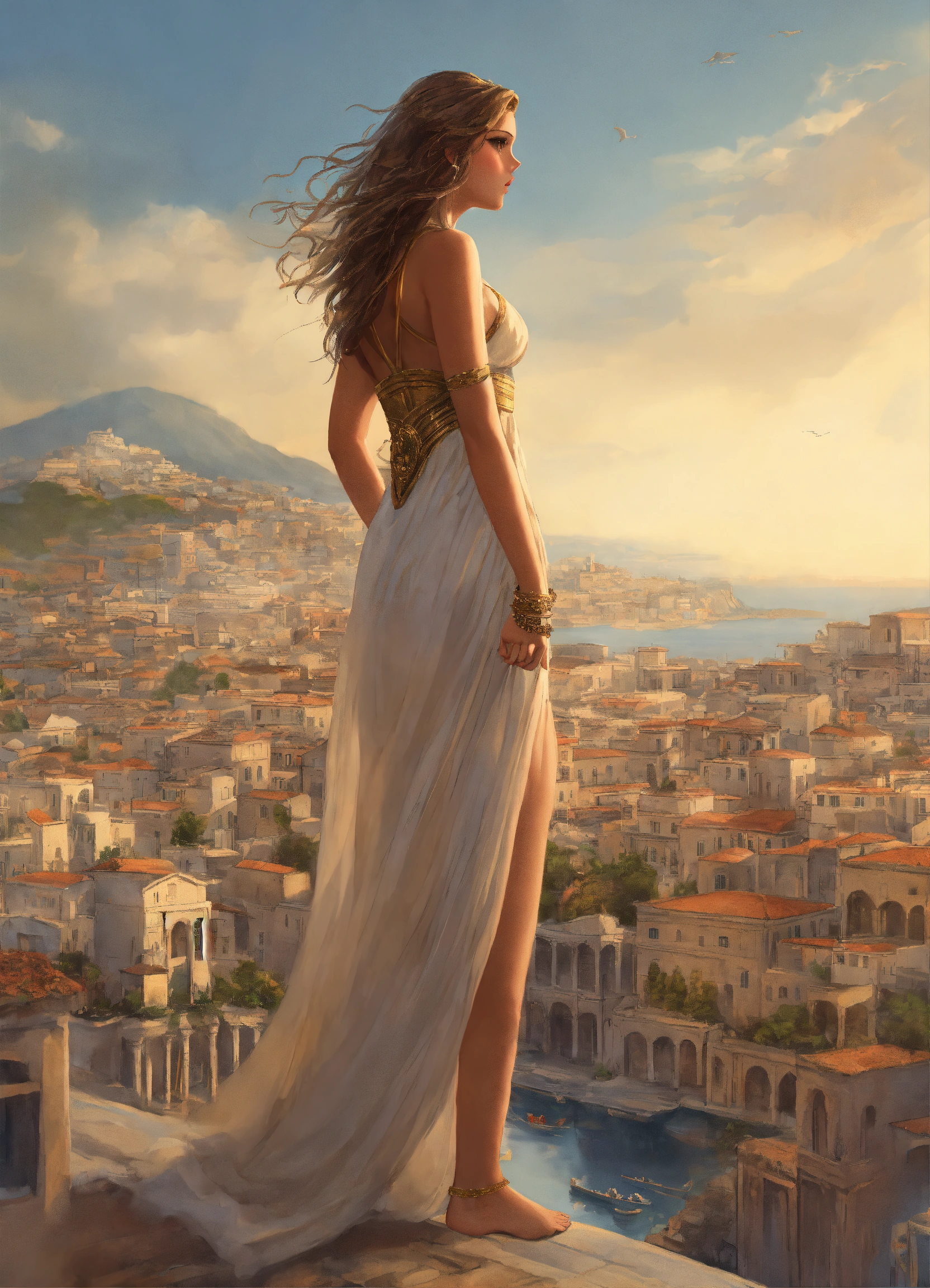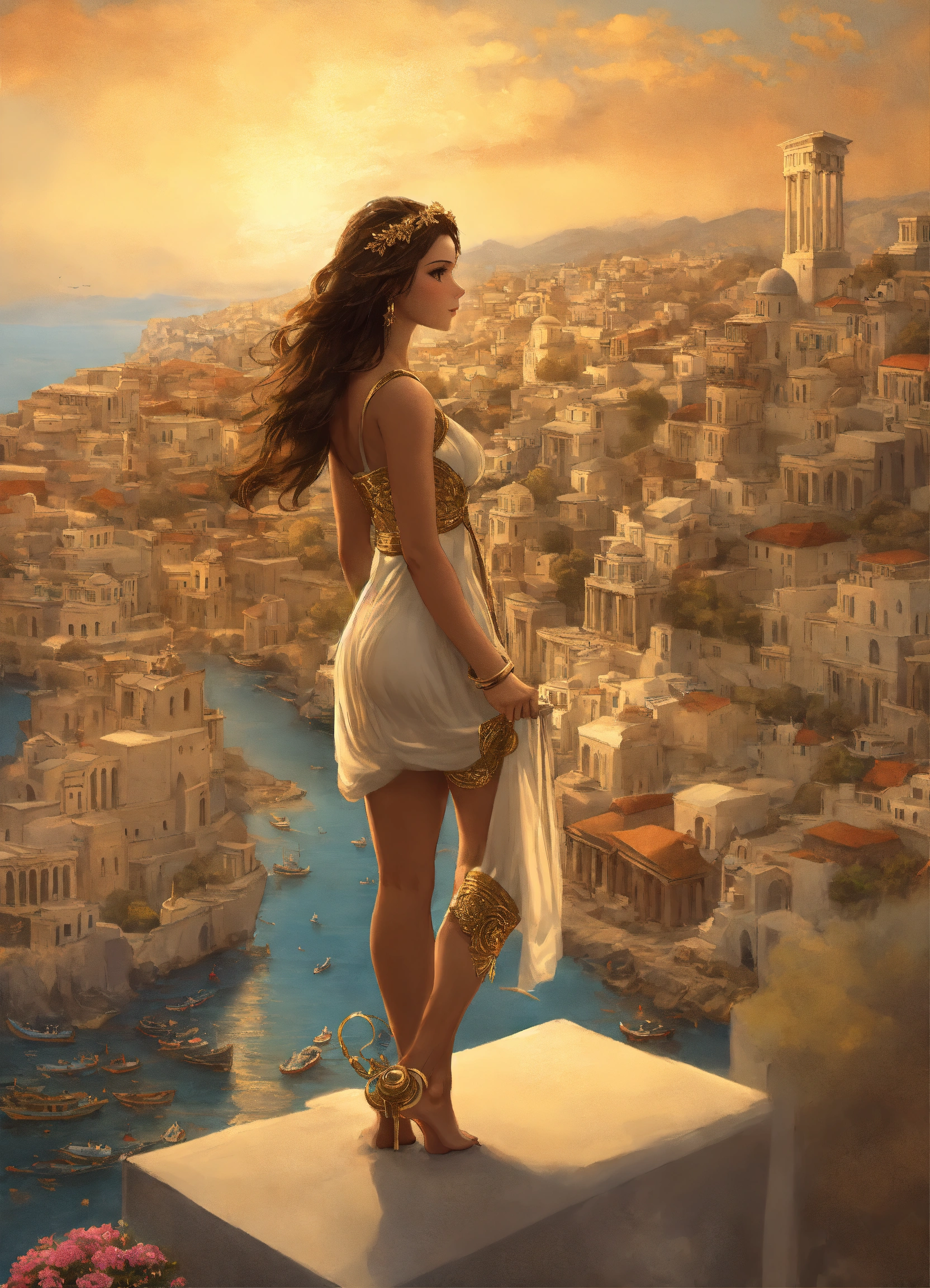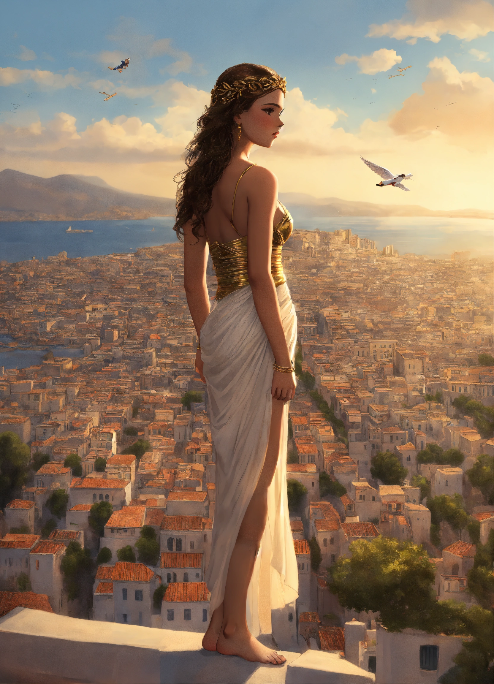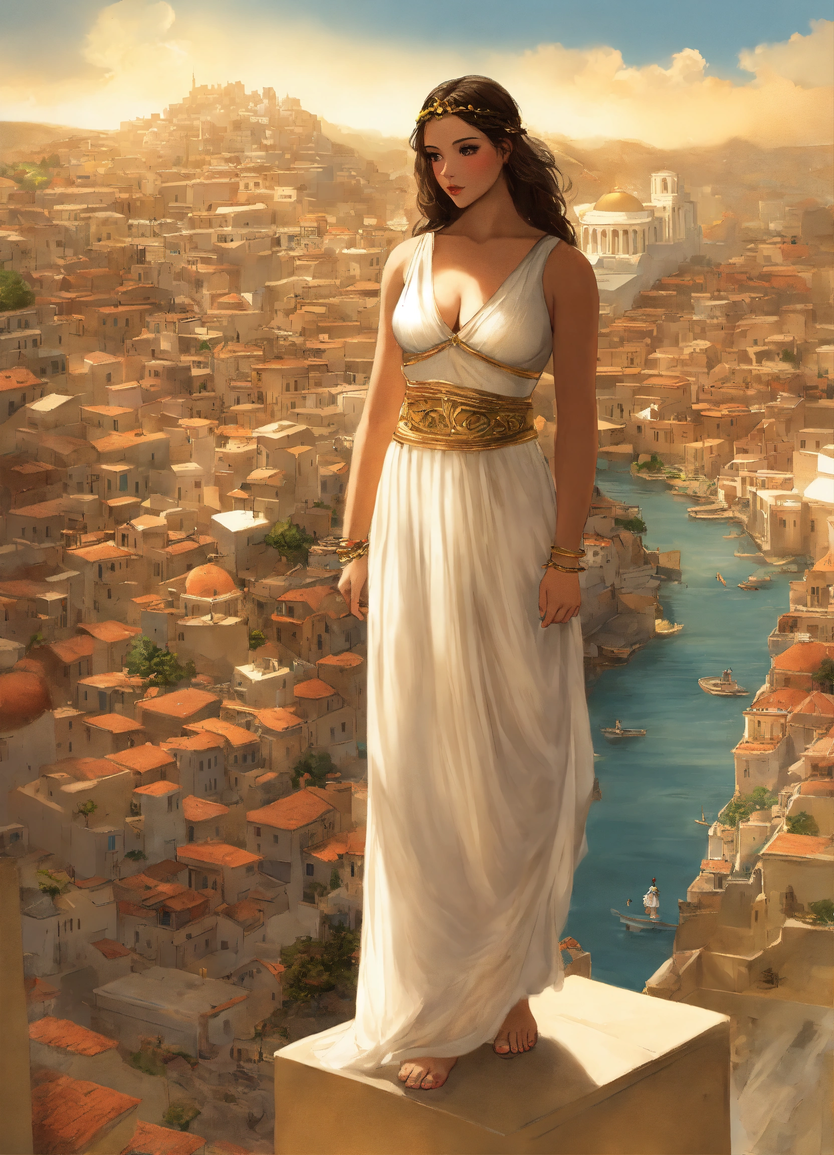 Giantess dressed like a greek goddess towering a city by her feet walking over tiny people smaller than her toes