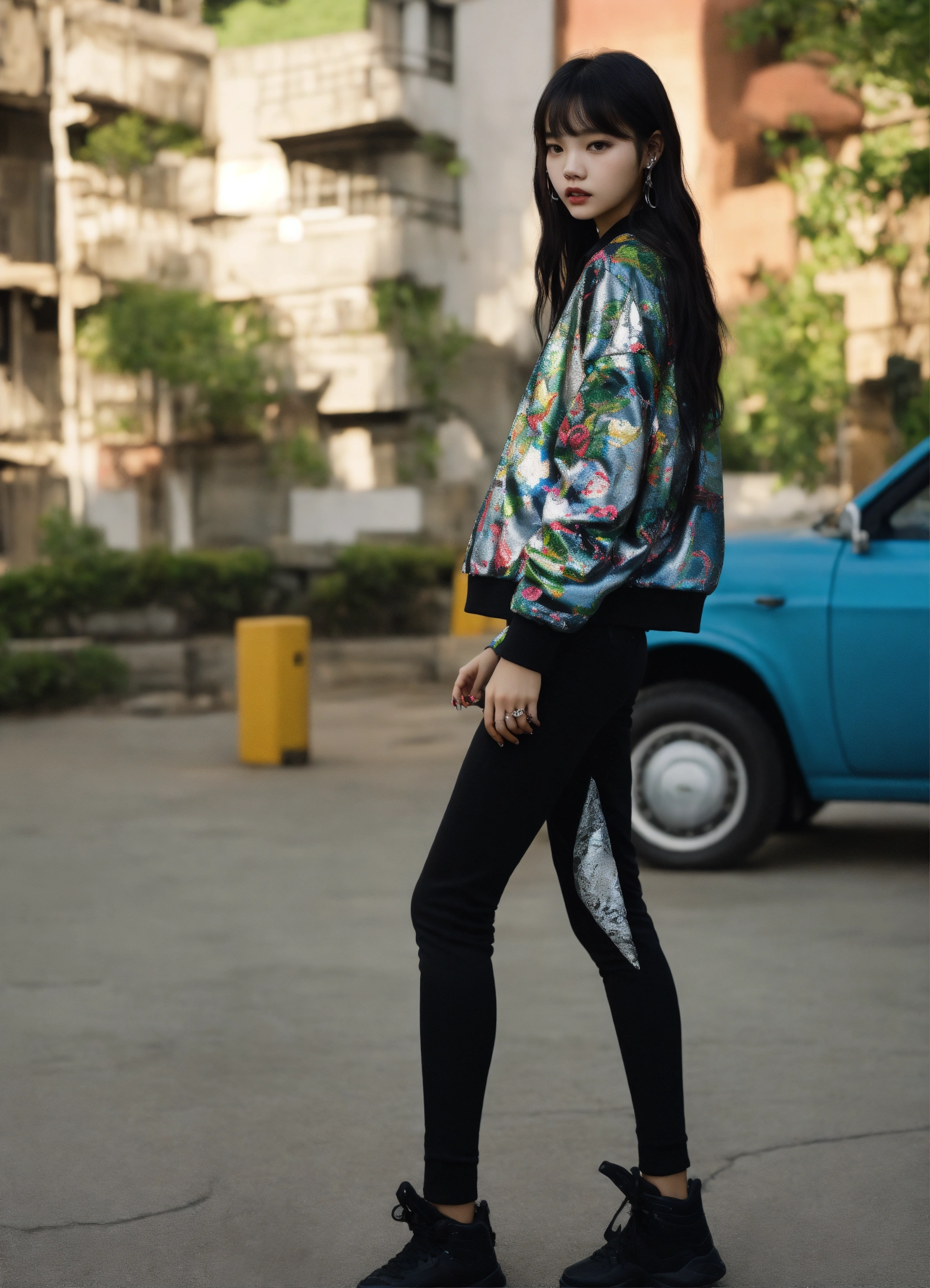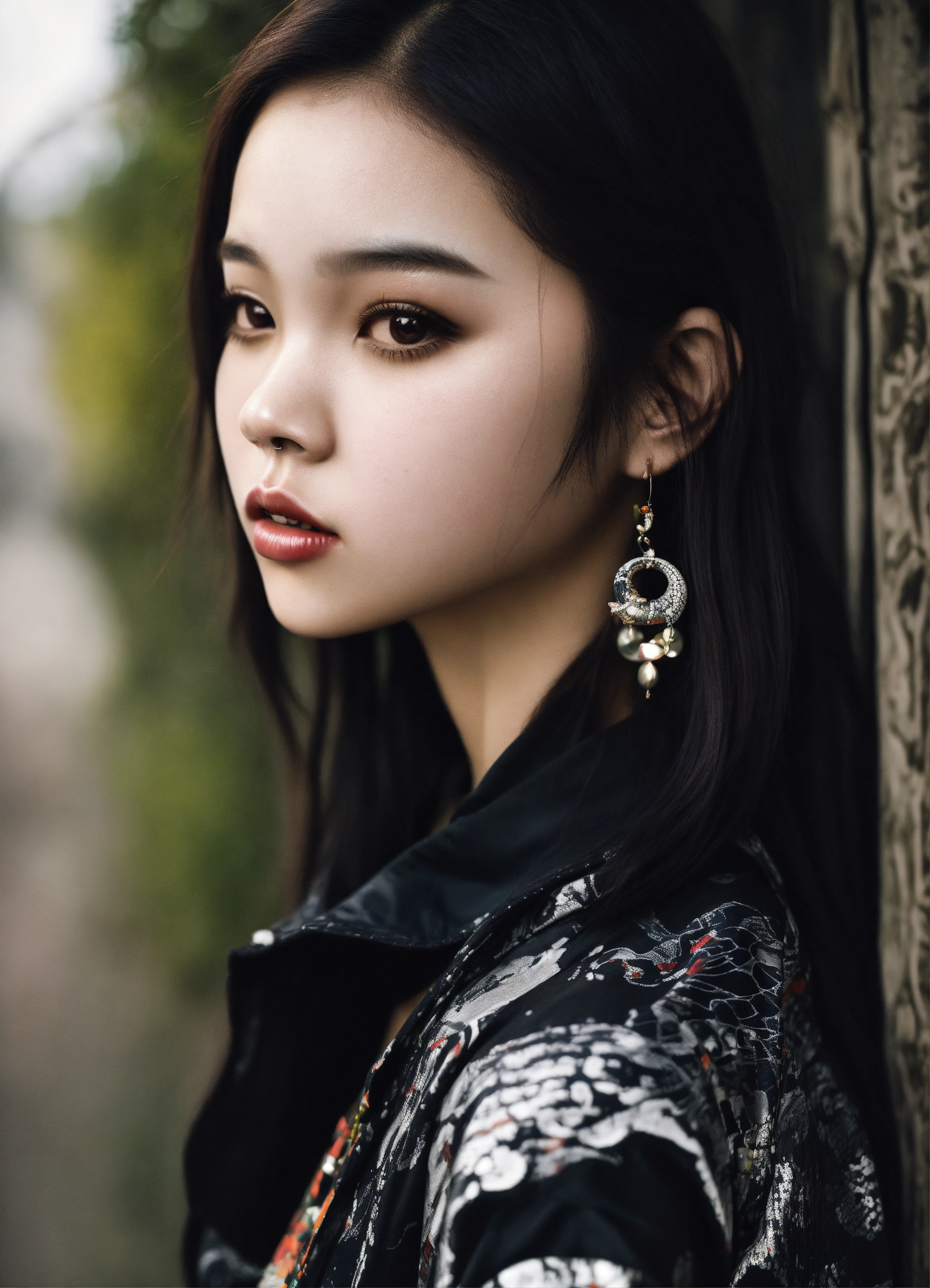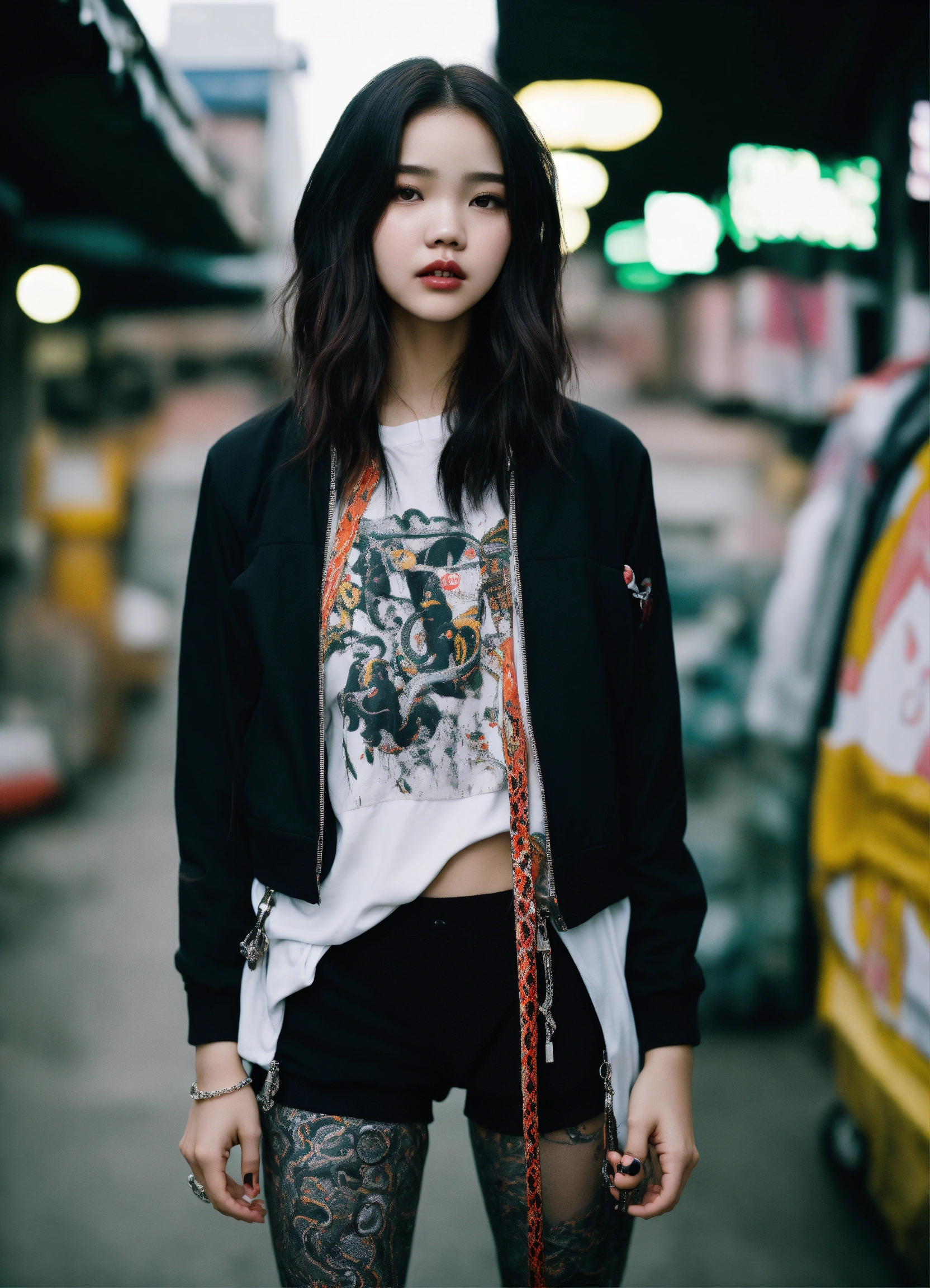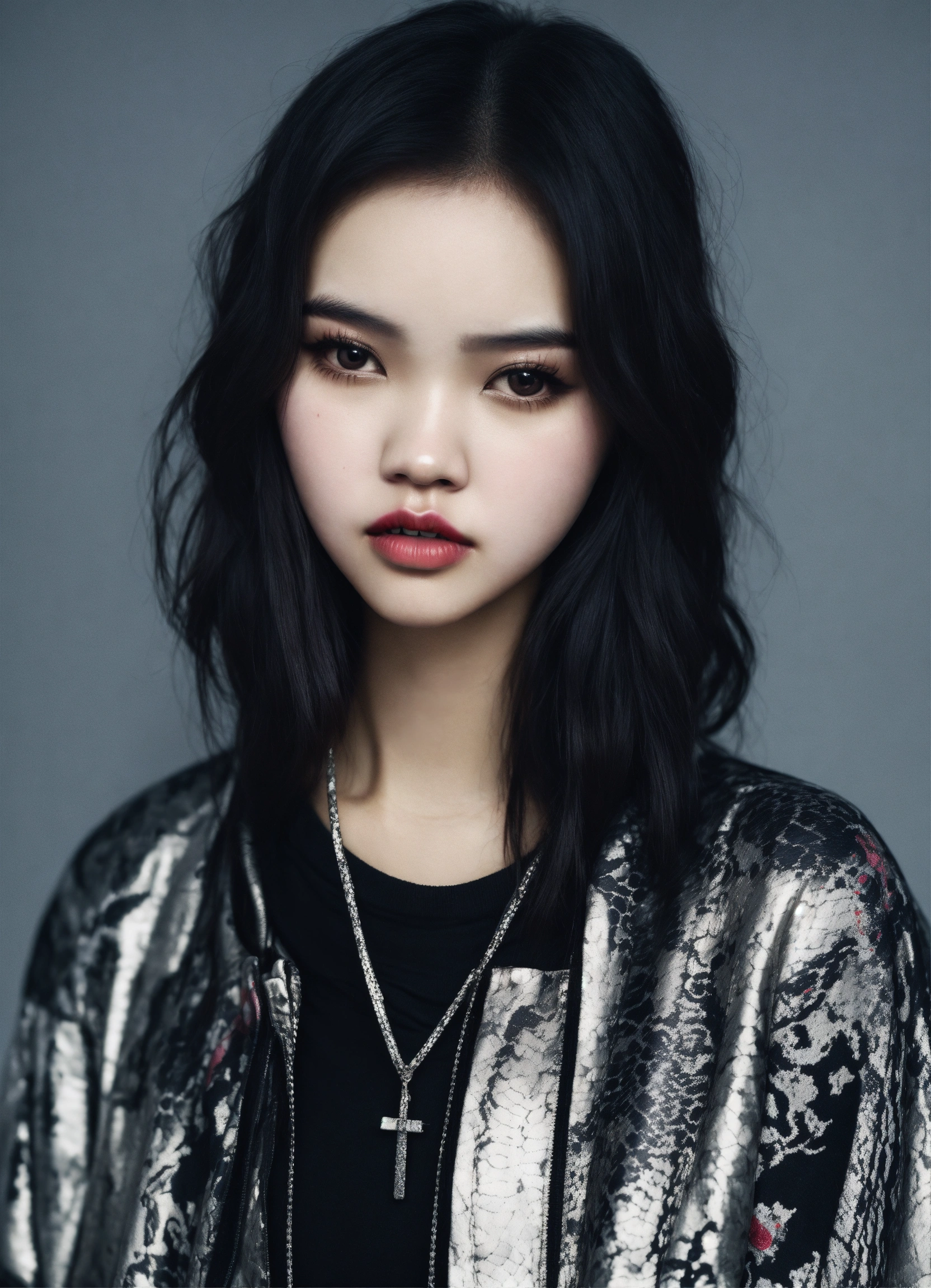 A 21 years old thinspo korean woman, with the nose and the round face of india eisley, with skeptical eyes, with round cheek bones, full body biracial korean female \vampire in hiphop streetwear drip, colors are black white an silver, with printed snakes and apples