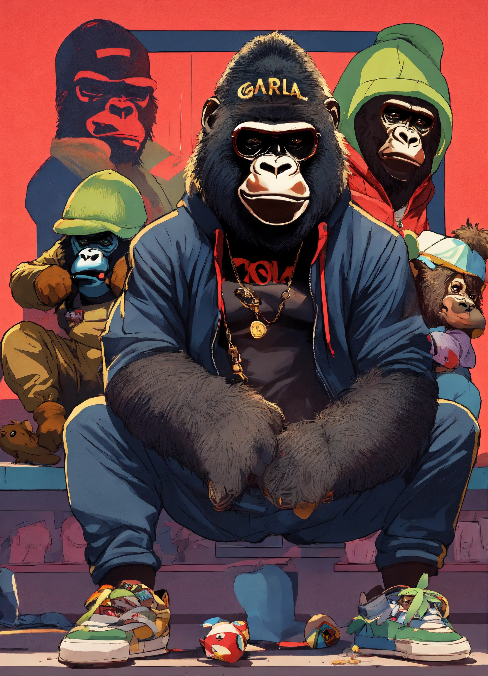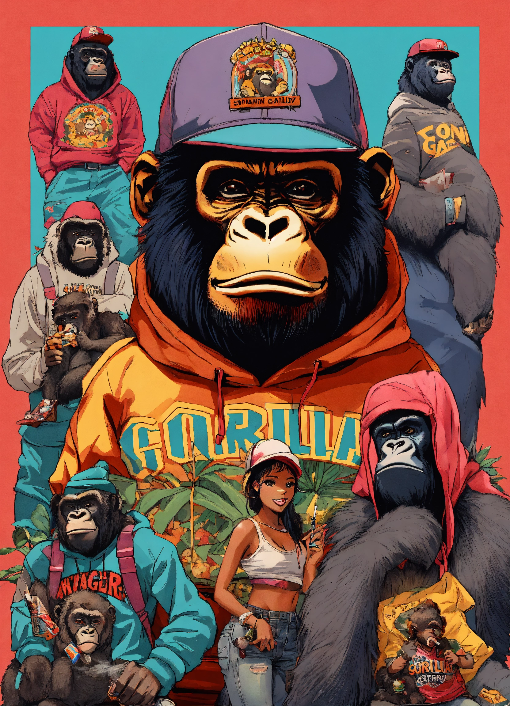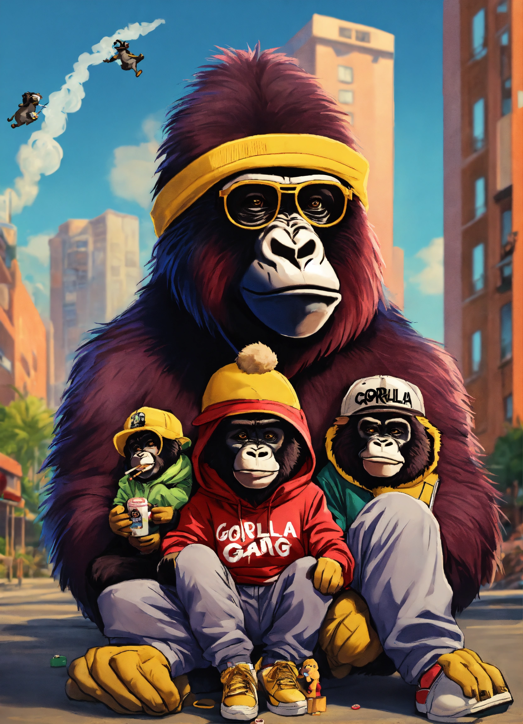 Gangster gorillas smoking a cigars and wearing snapbacks and hoodies that says gorilla gang on the hoodies, with a lady gorilla in urban designer clothing smoking a cigarette with 2 baby gorillas in kids clothes playing with toys in an apartment