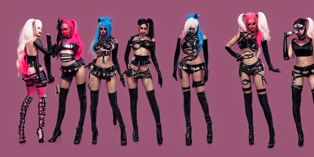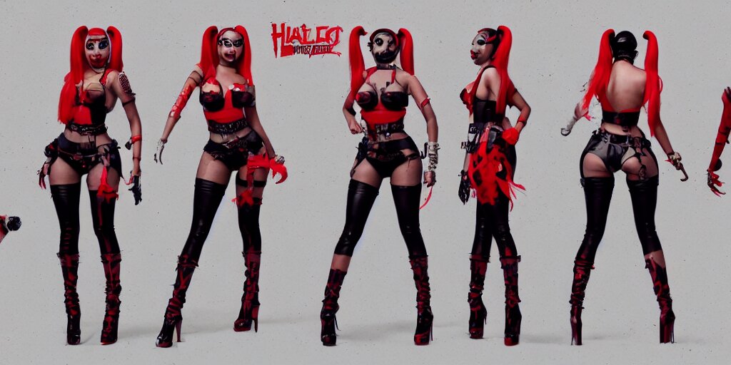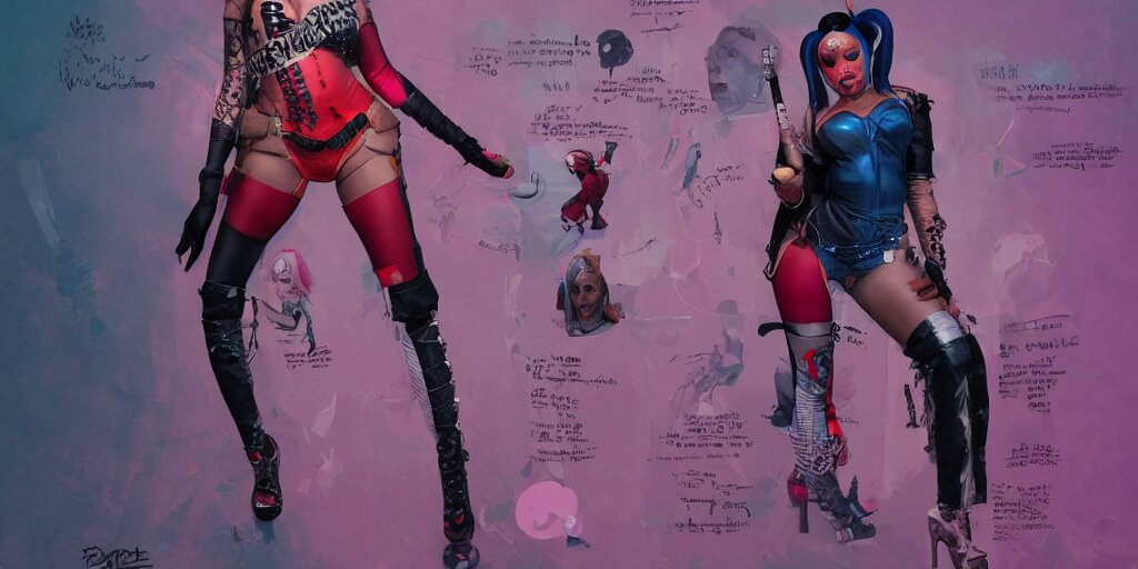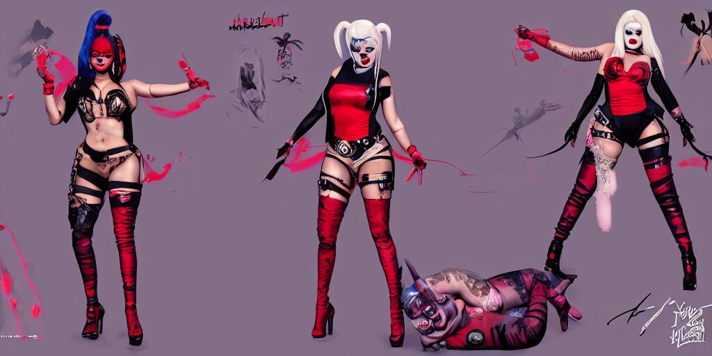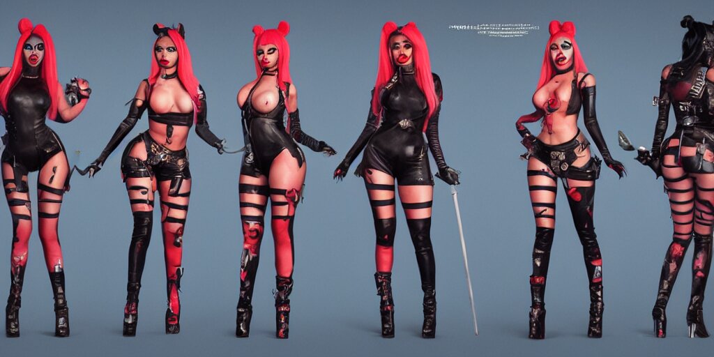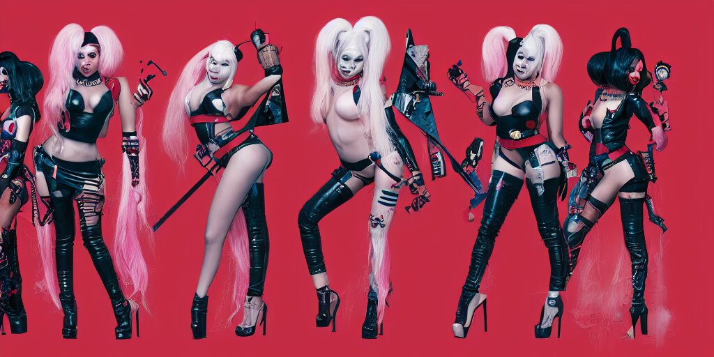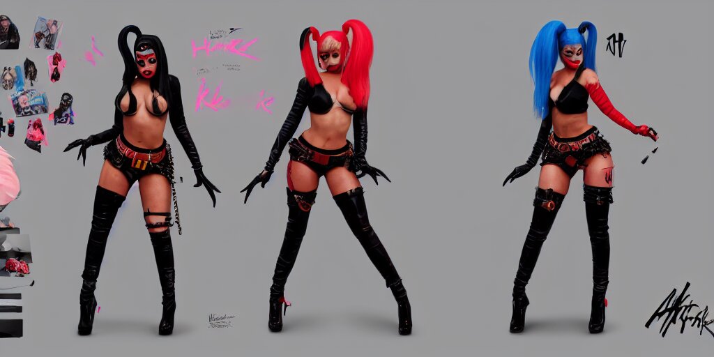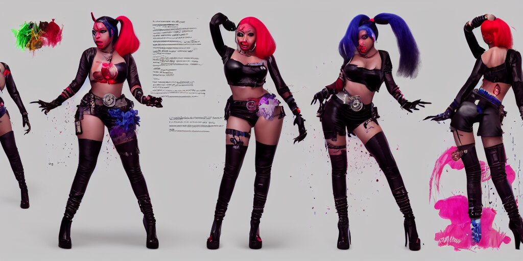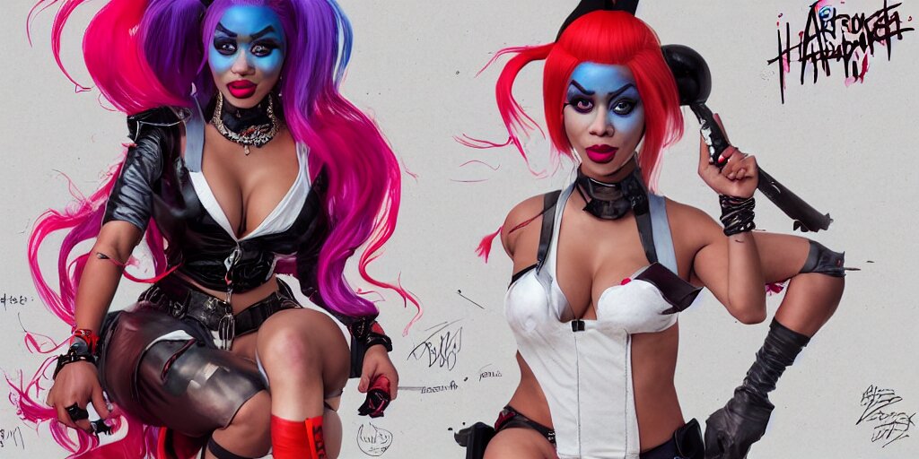 Nicki minaj as harley quinn, character sheet, concept design, contrast, hot toys, kim jung gi, greg rutkowski, zabrocki, karlkka, jayison devadas, trending on artstation, 8 k, ultra wide angle, pincushion lens effect