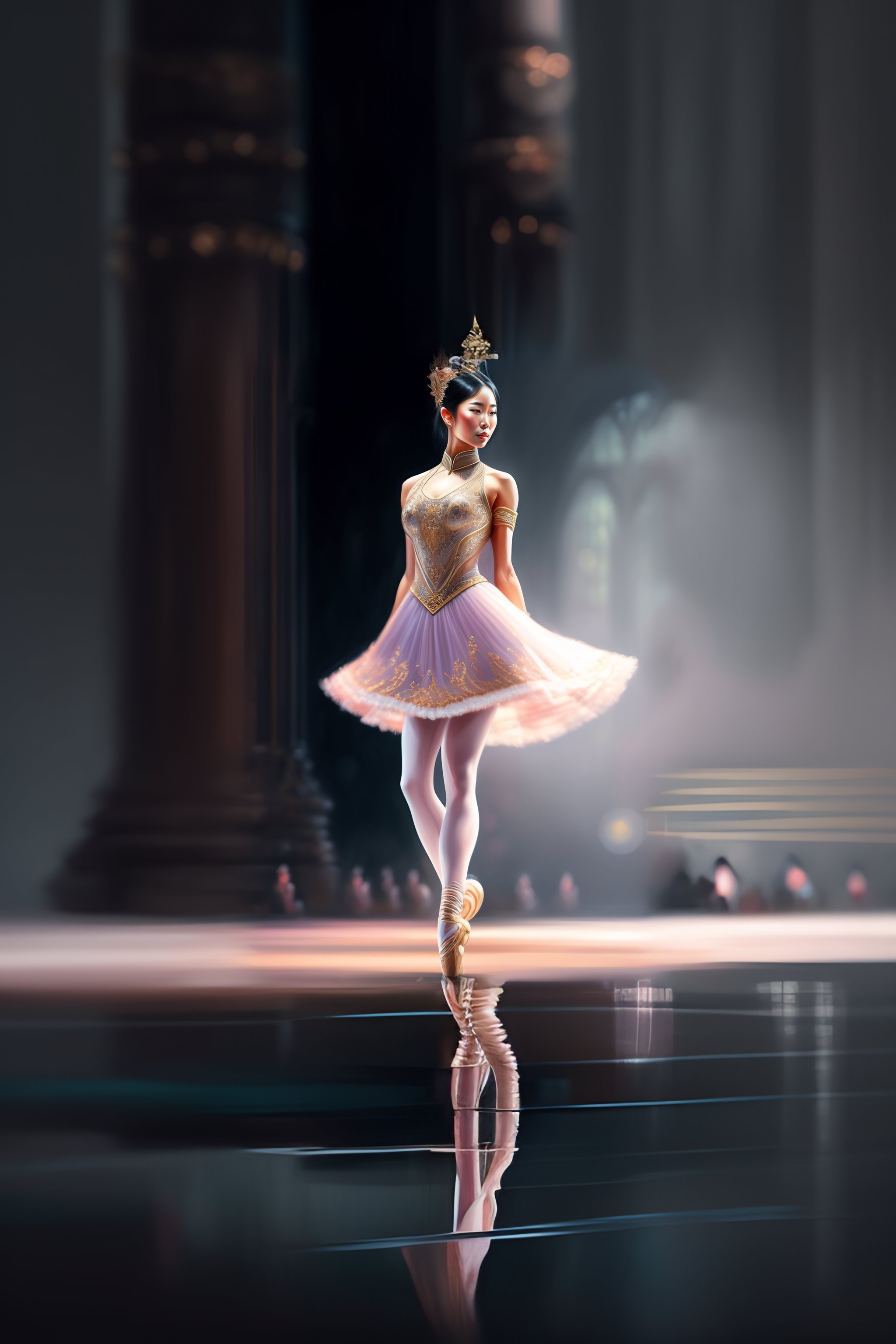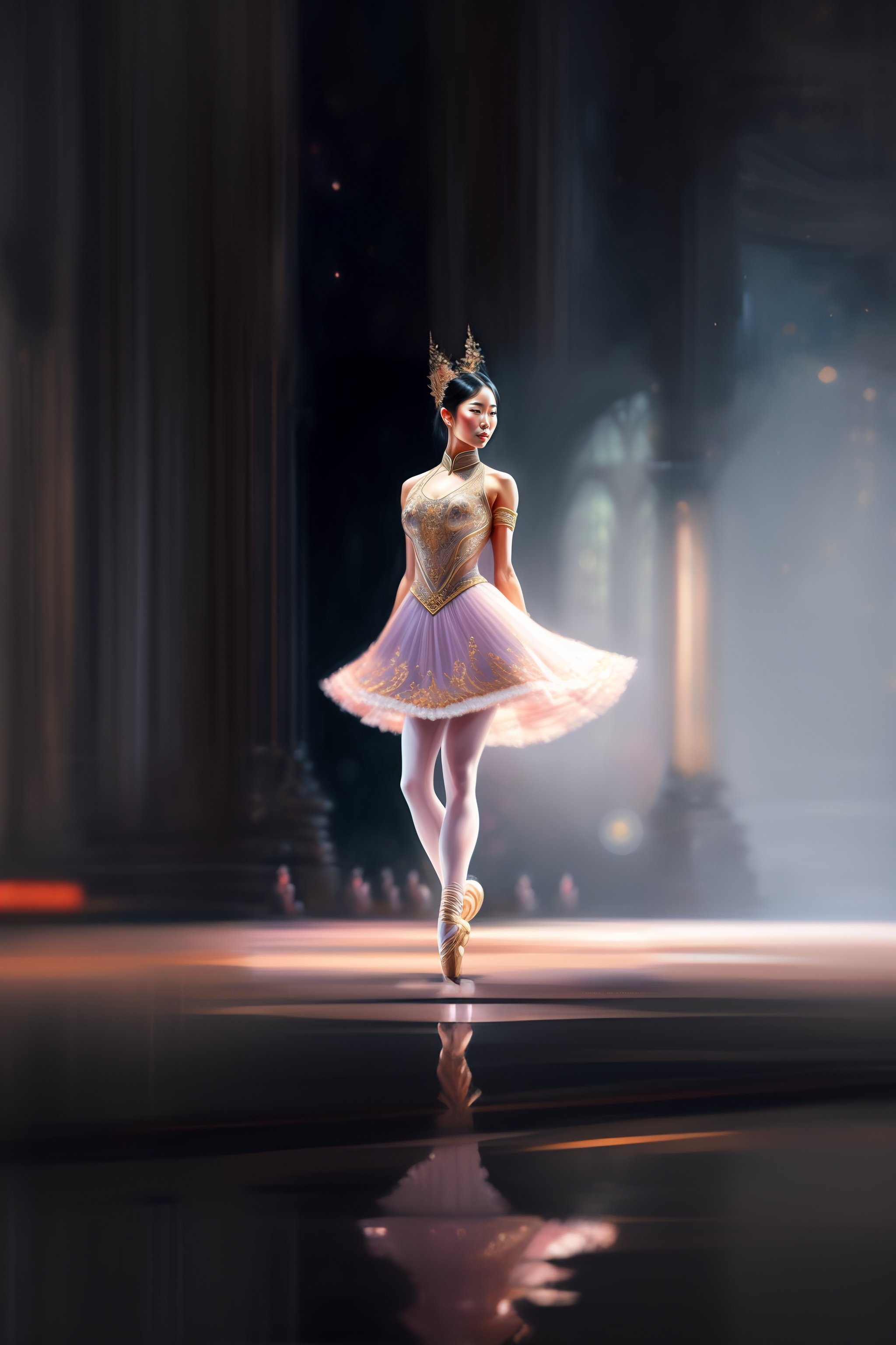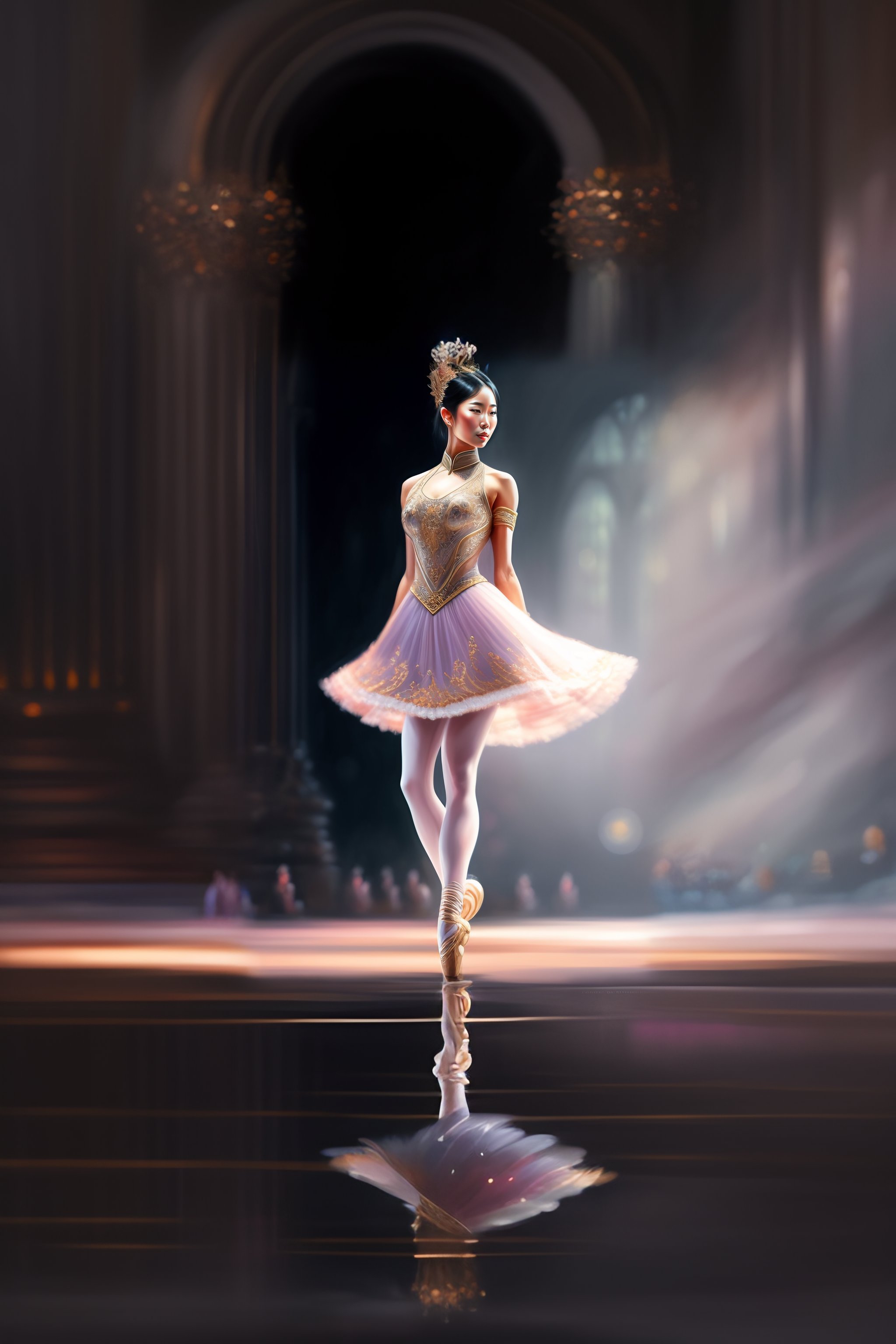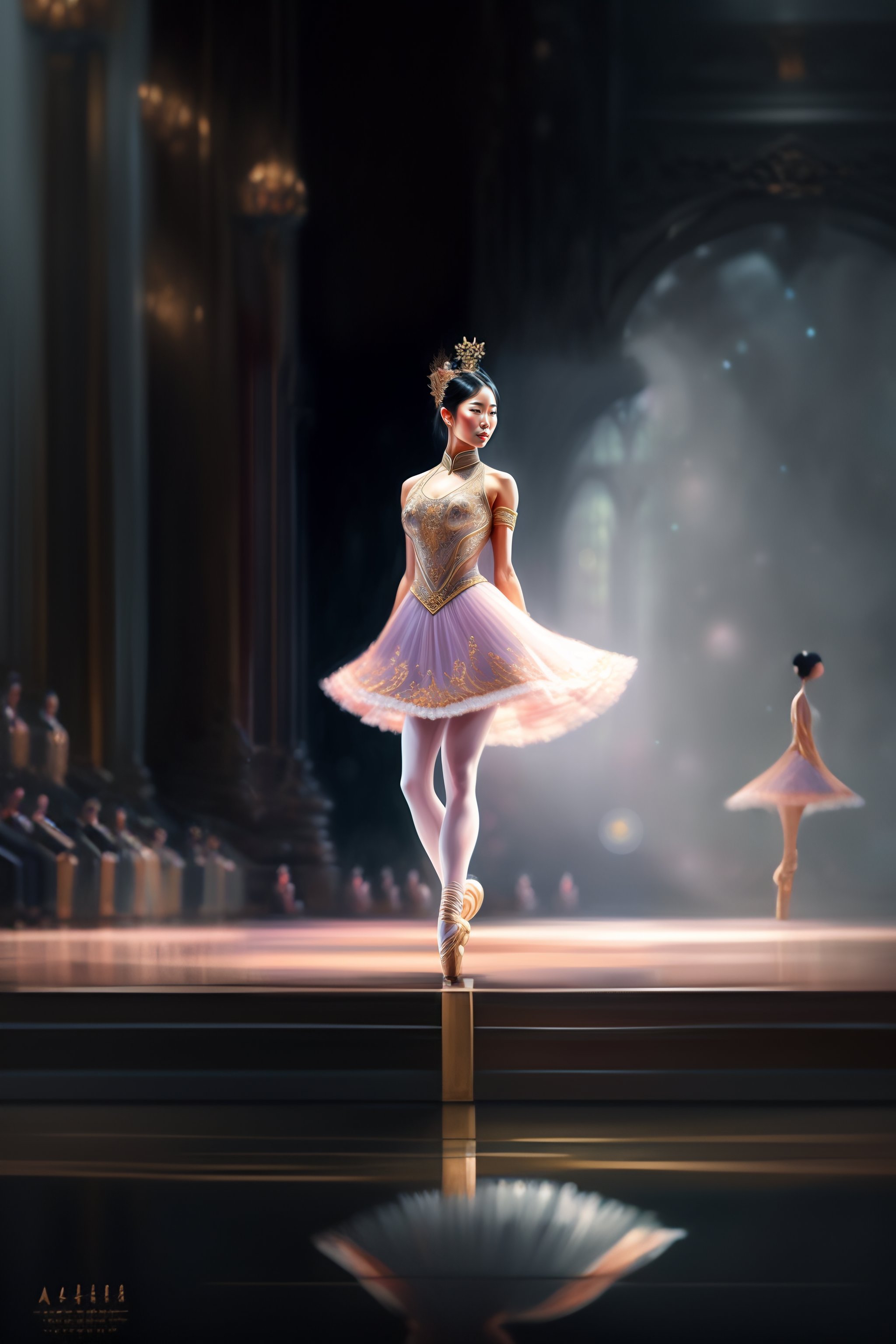 Asian ballet dancer woman alone on a big stage, full body, intricate, elegant, highly detailed, digital painting, concept art, art station, smooth, sharp focus