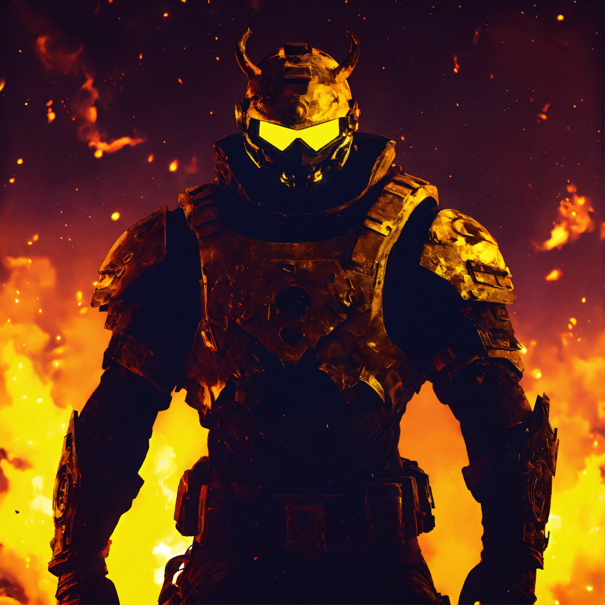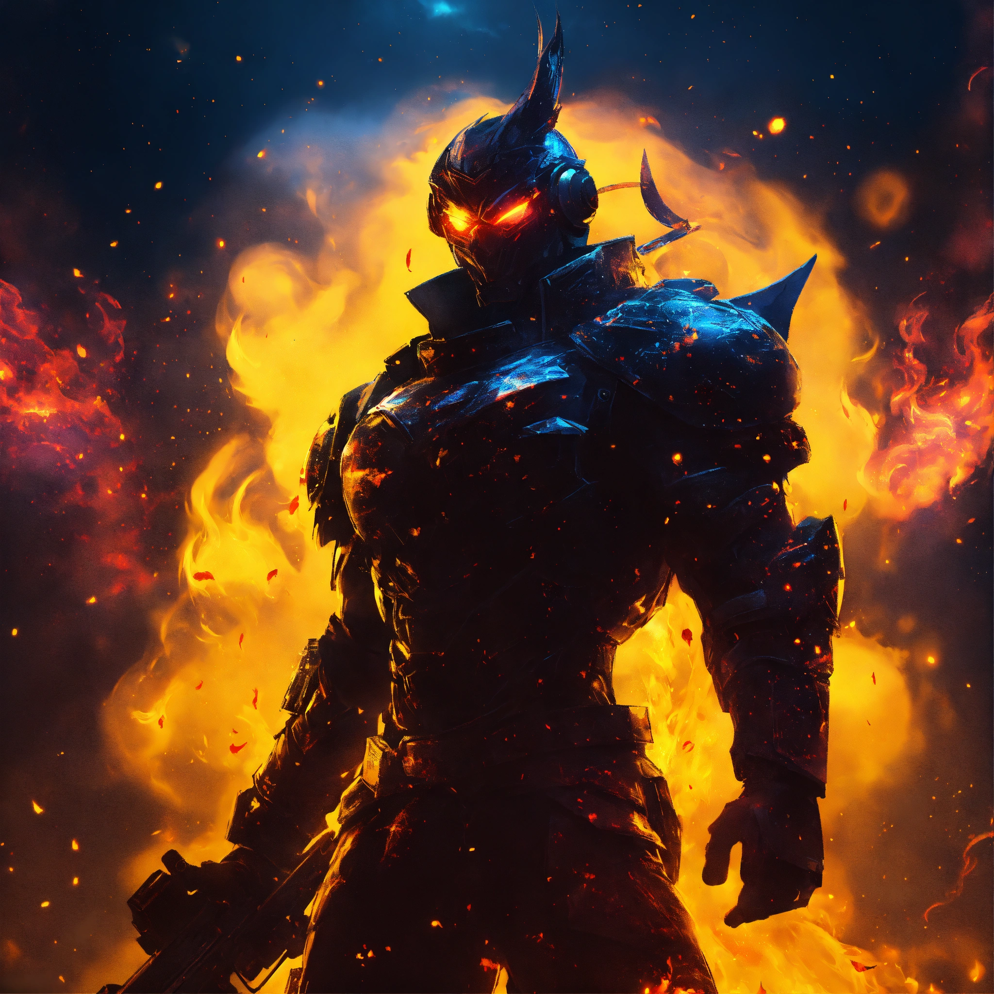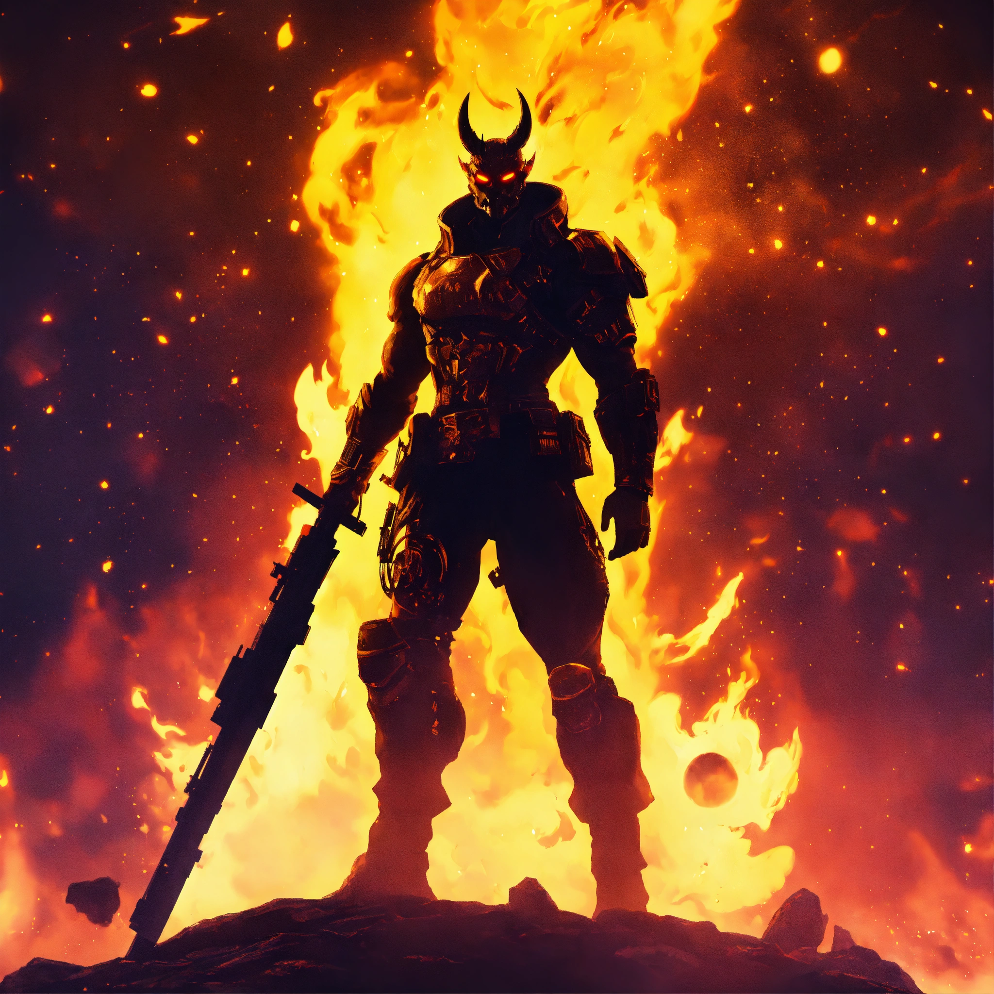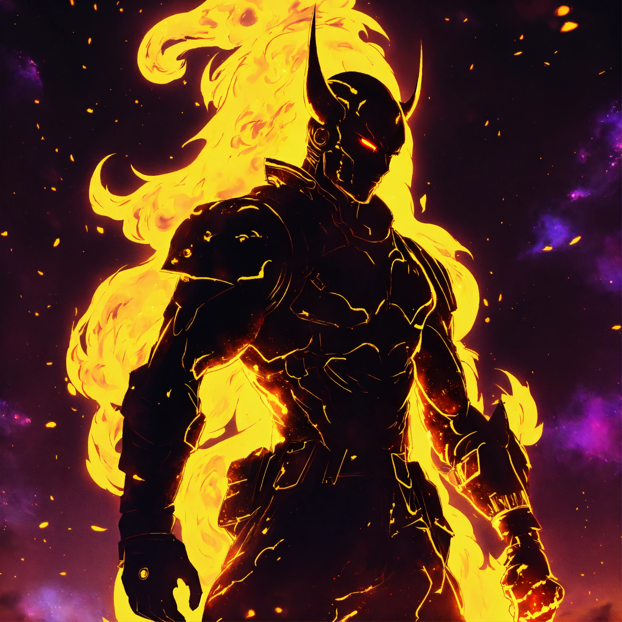 Dark silhouette of muscular soldier, cosmic galaxy skin, anime demon style, glowing eyes, flames in background, rage, yellow hue, smoke --upbeta --niji 5 -