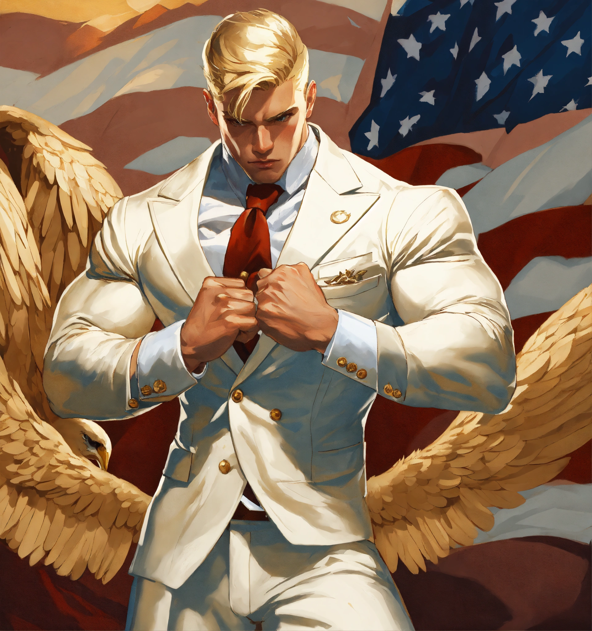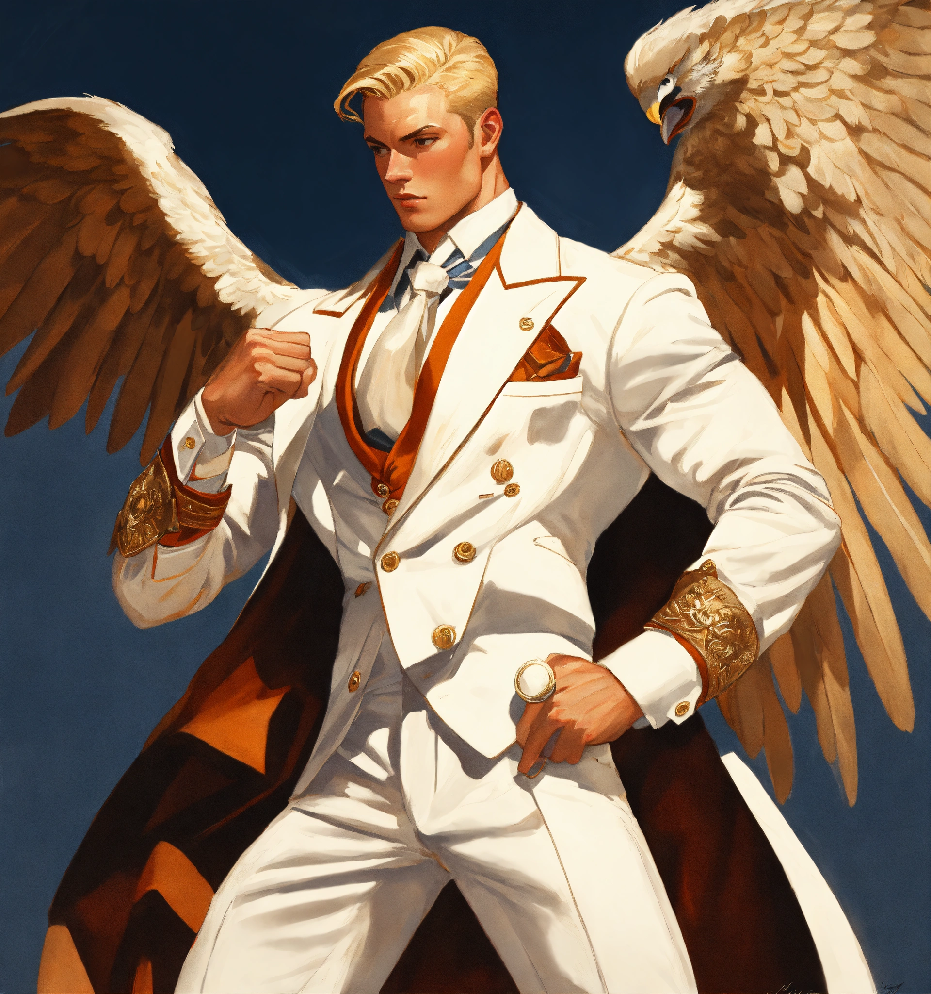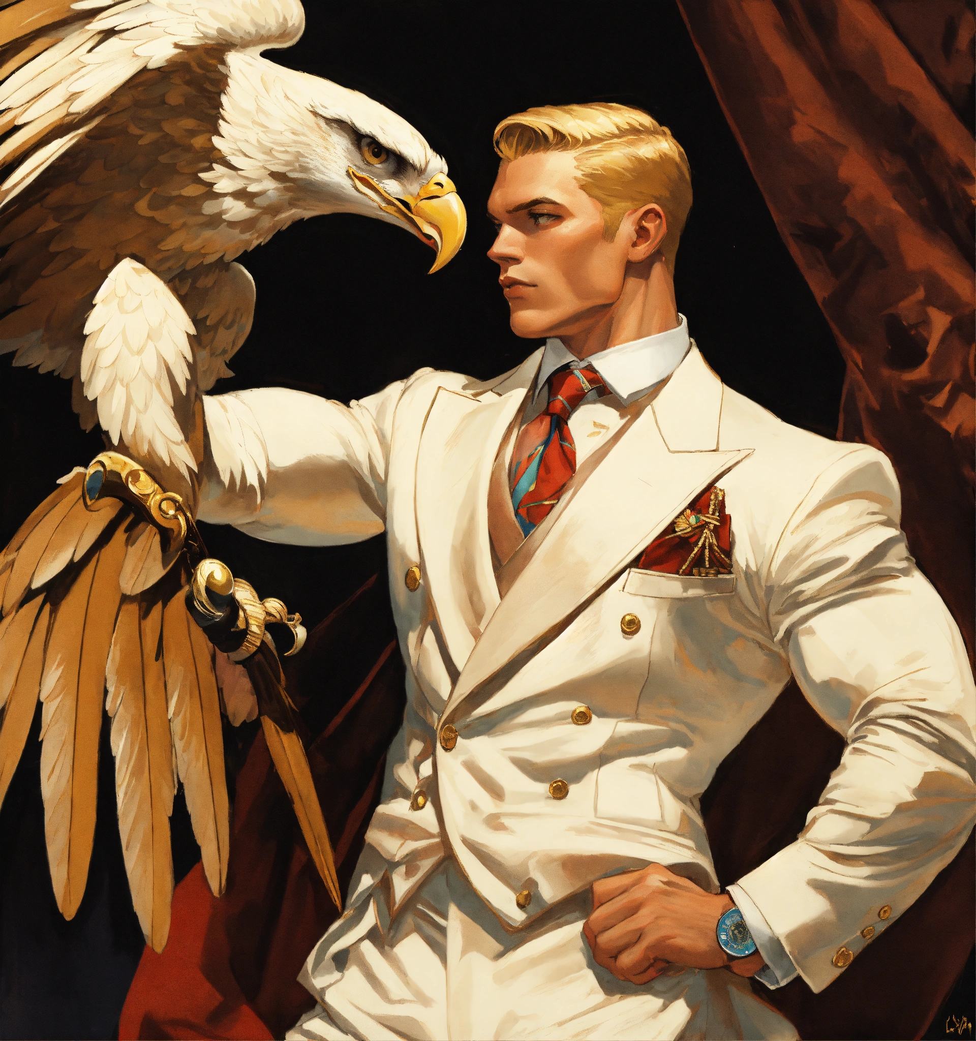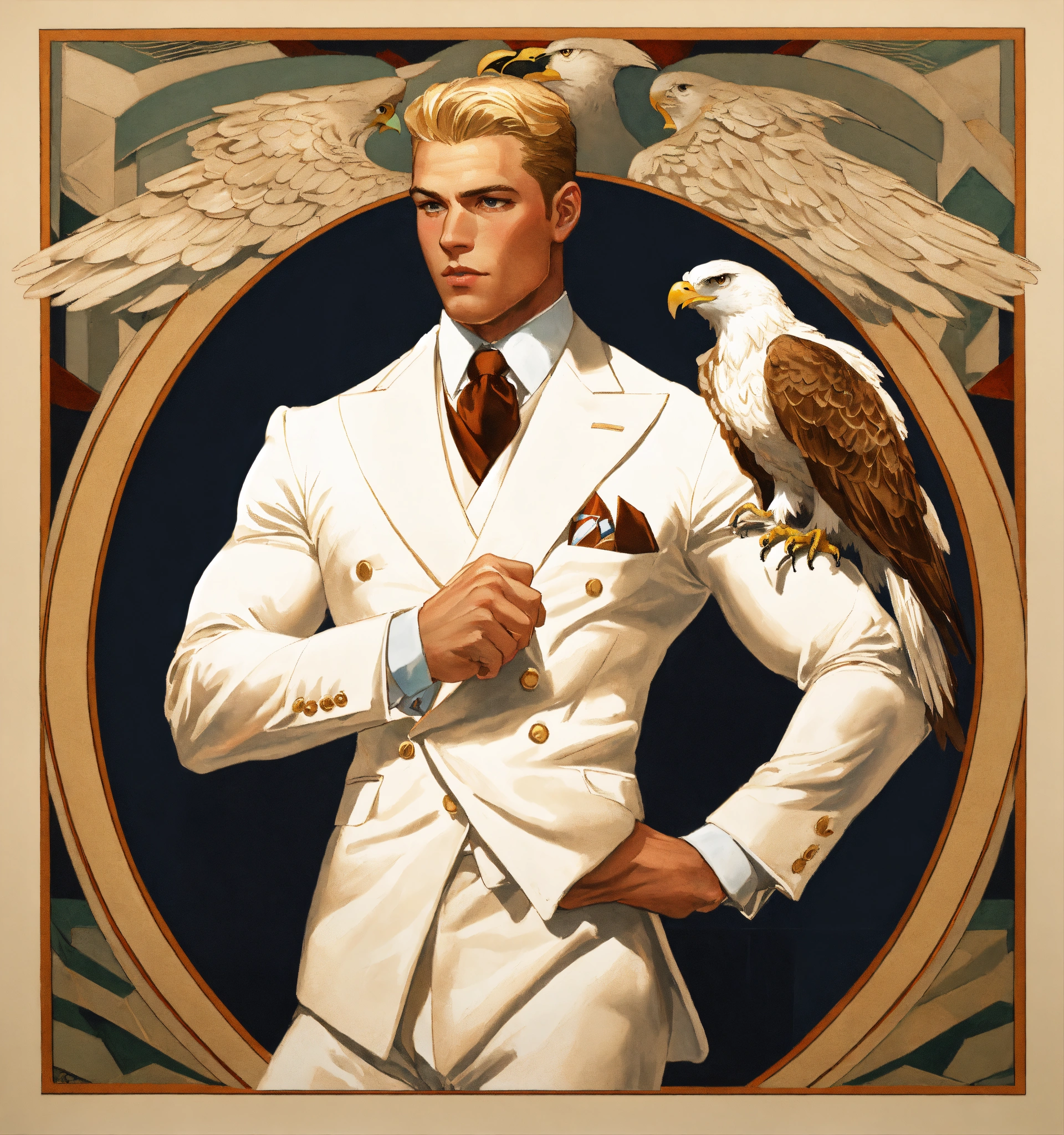 A blonde muscled sportsman in white double breasted suit holding an eagle on his fist, leyendecker style