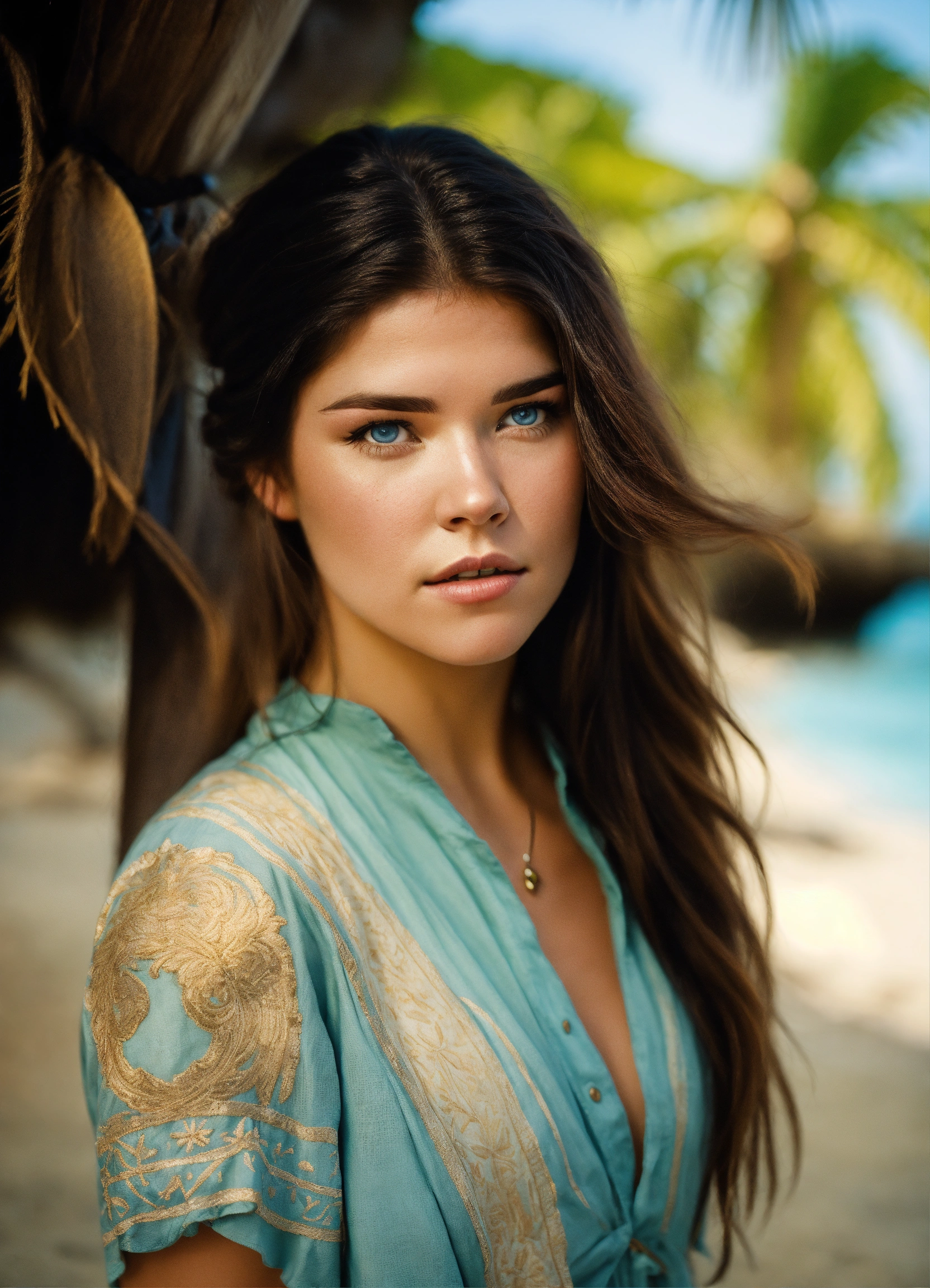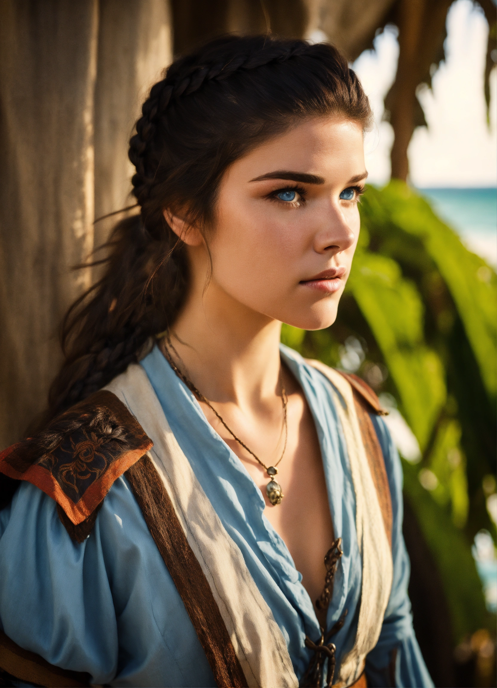 Side portrait of young marie avgeropoulos in a pirate antique shirt on a tropical island beach, elsa braid, ice blue eyes