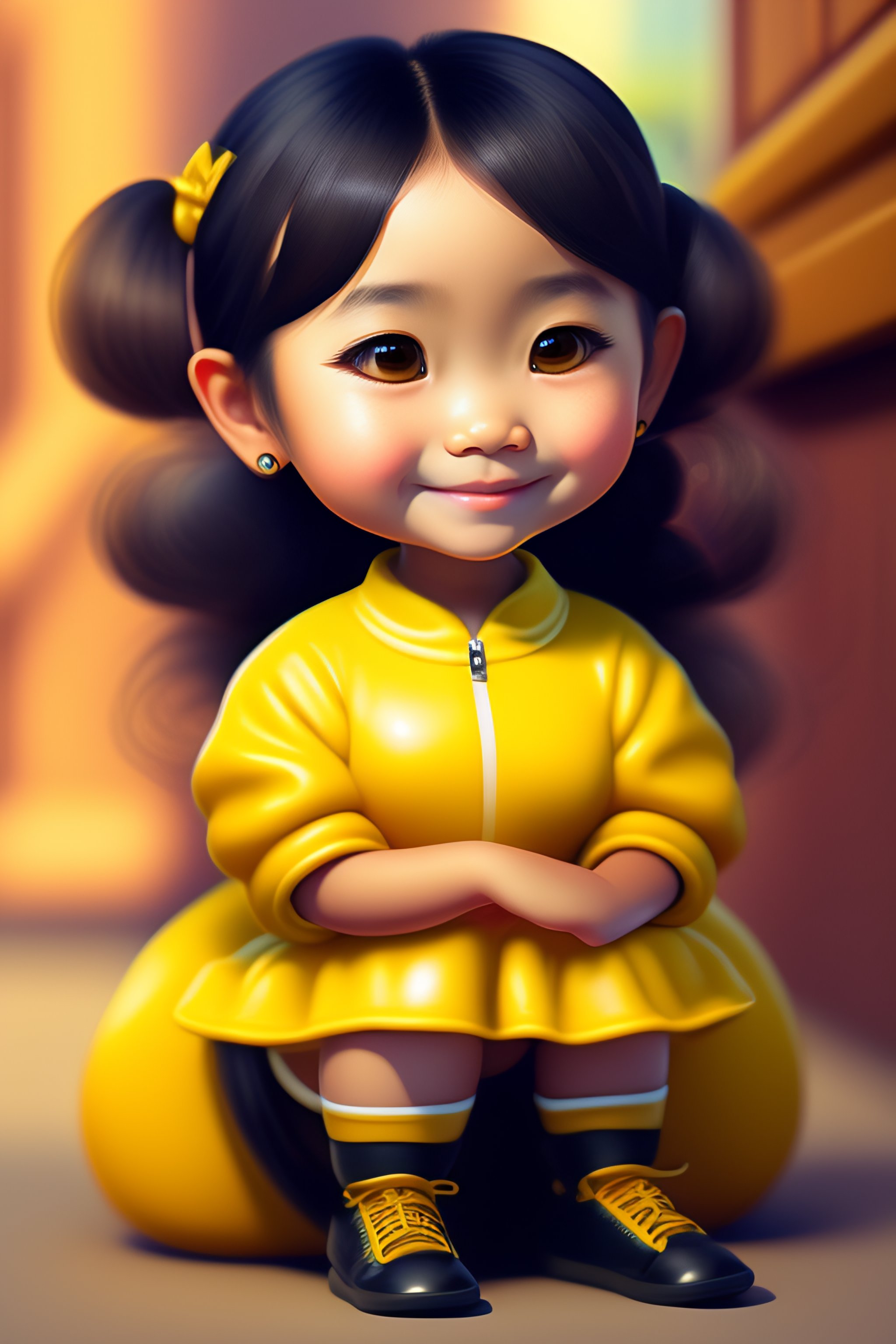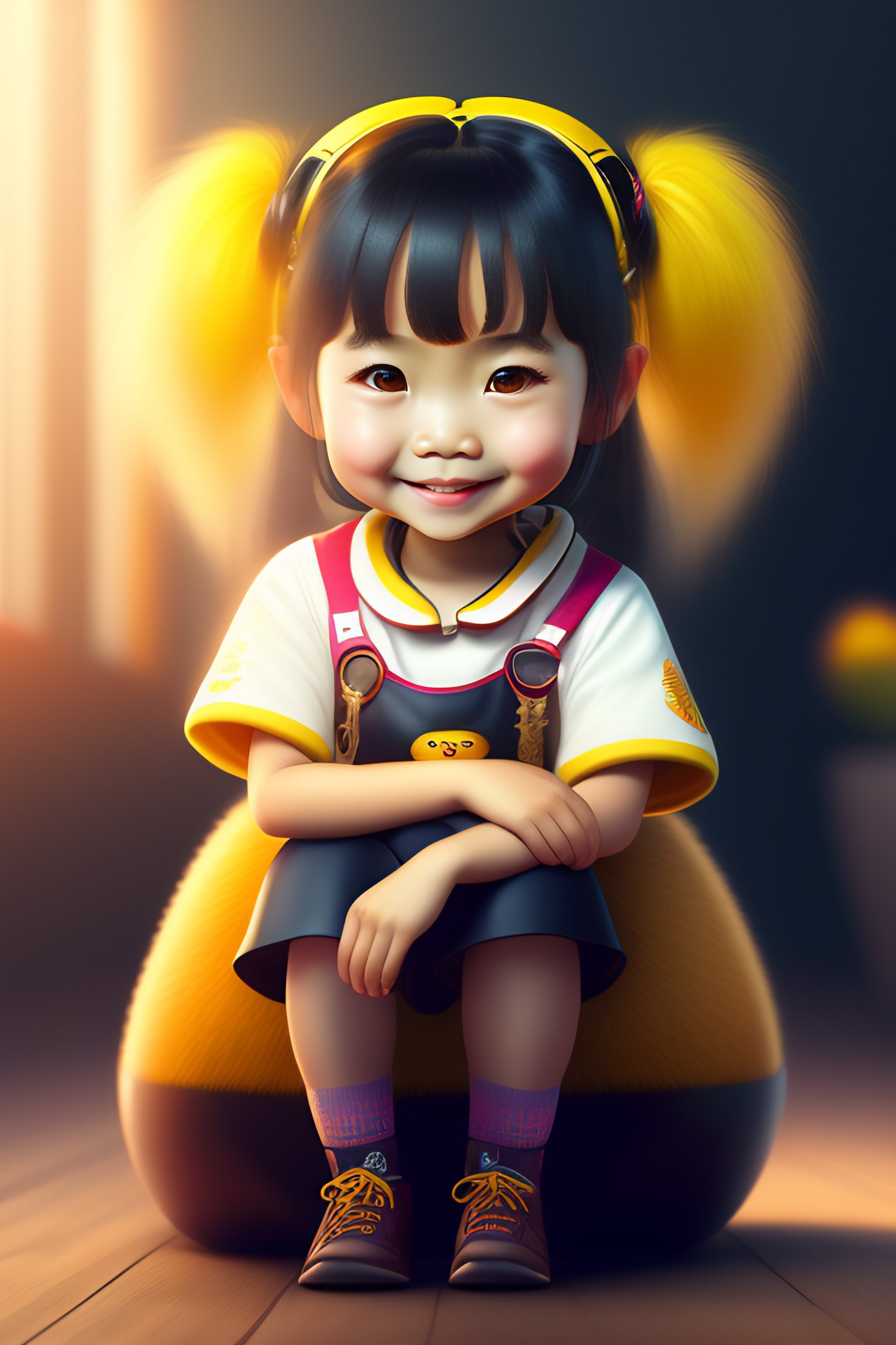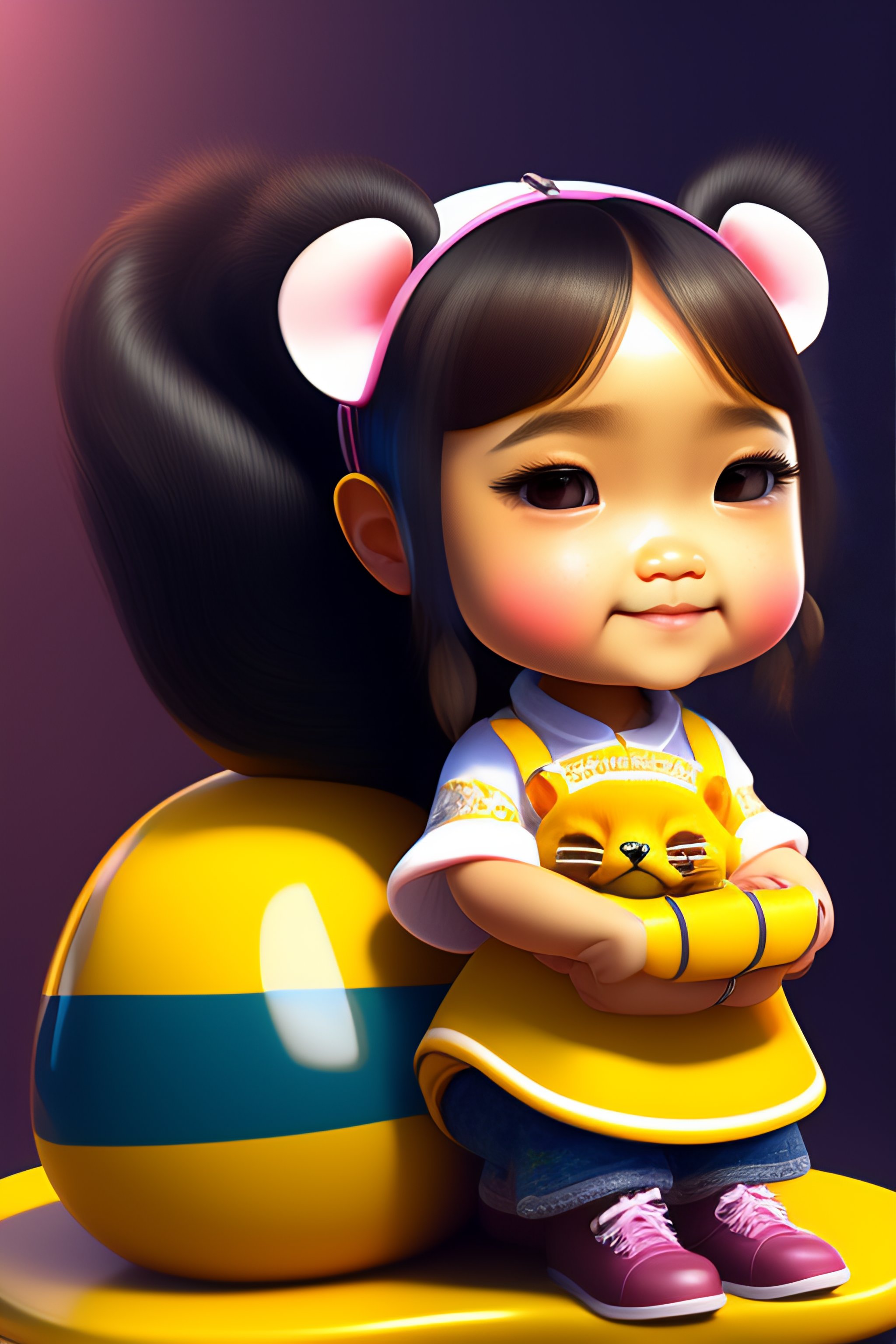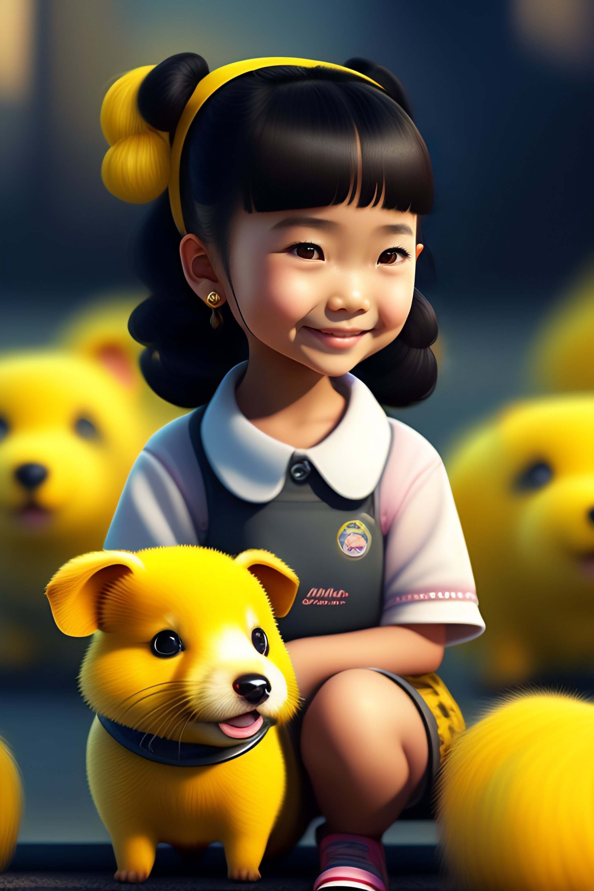 Cute and adorable cartoon asian girl, pigtails, big eyes, big smile, with high & short pigtails, sitting with yellow dog and & black long ferret, hyper real, dreamlike, surrealism, trending on art station