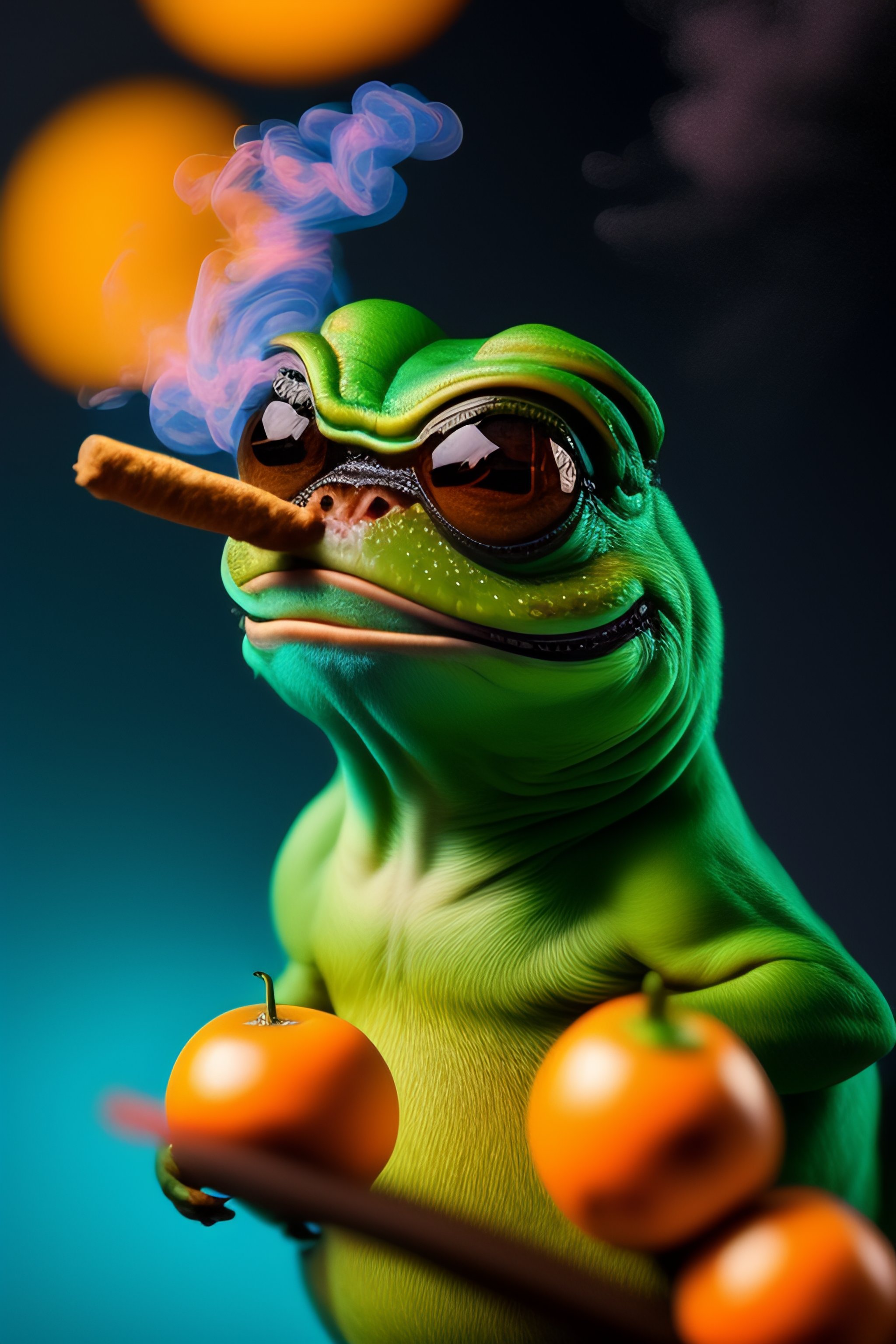 8k representation of pepe the frog smoking a cigar, blue background, pepe has wet skin, cigar has an orange glow at the tip and smoke curls up from it.
