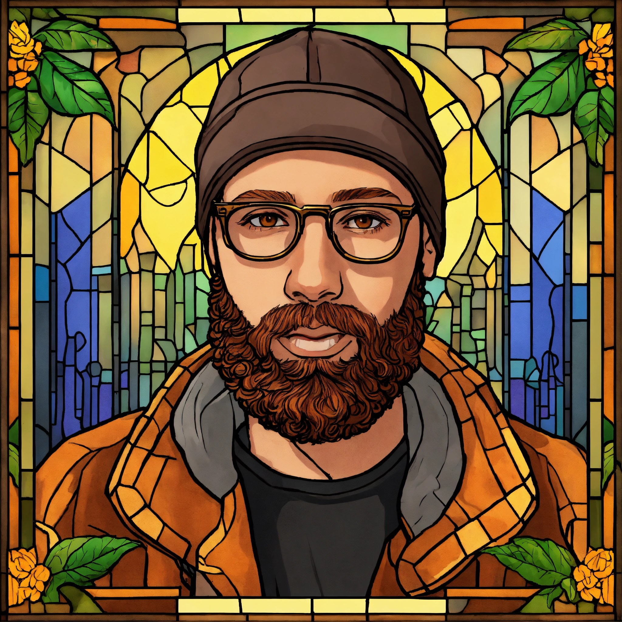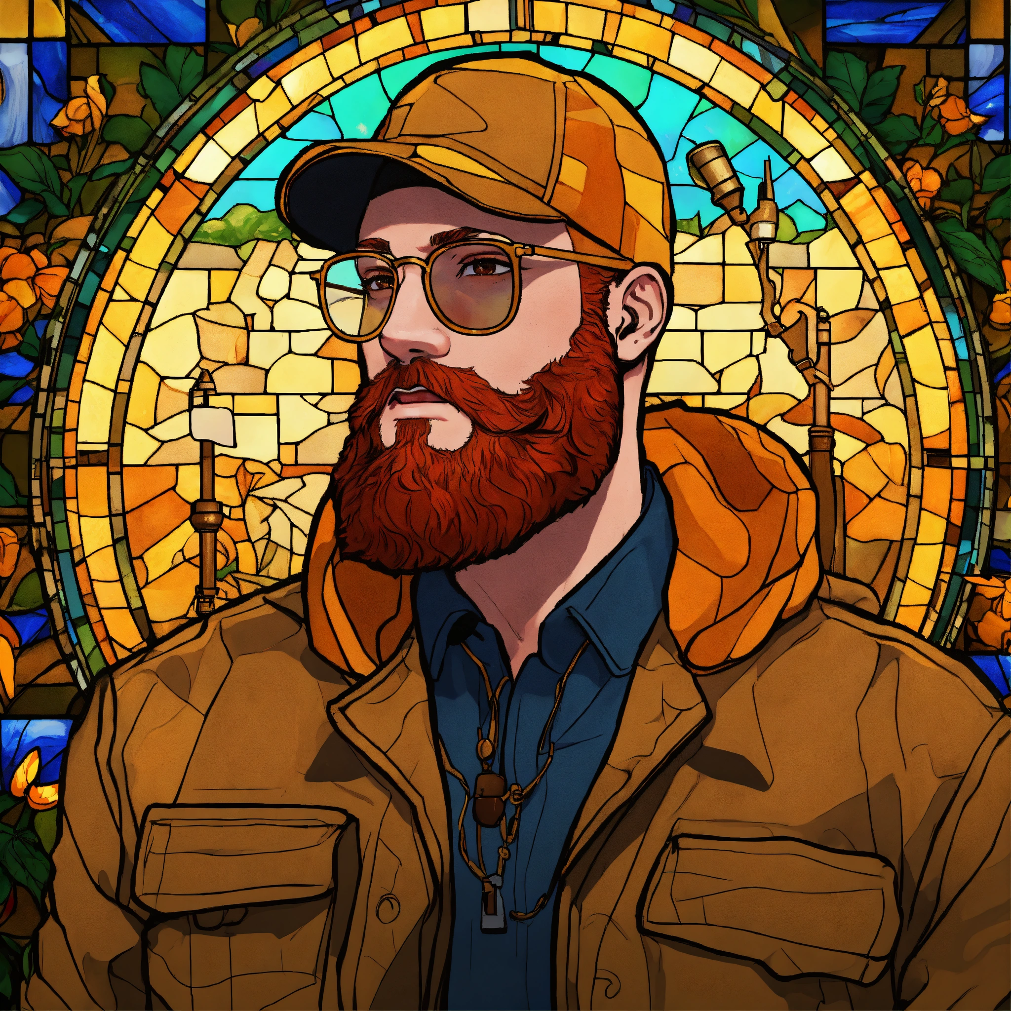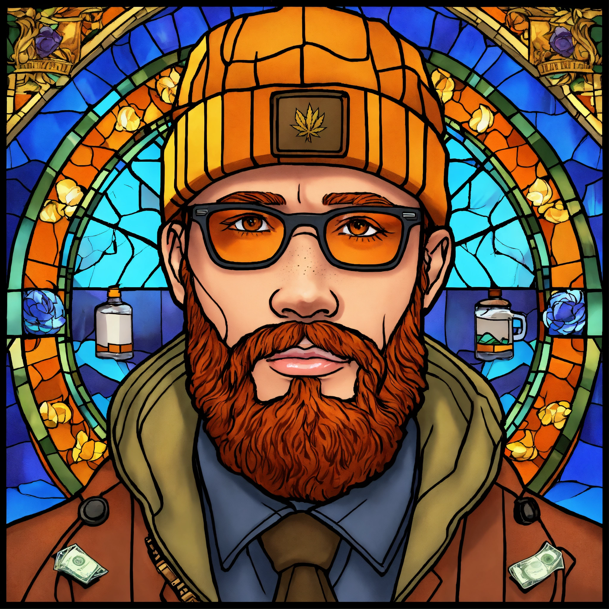 Hd, 4k, background is stained glass with images in the stained glass of tap rapper-type images (guns & bullets, cough syrup, cash, weed, etc). the rapper is a caucasian man with an orange-colored beard or ginger beard that is short in length and straight (not wavy or curly). he has a black beanie on his head. gold framed glasses with clear lenses. light brown peacoat on. couple freckles on face. brown eyes.