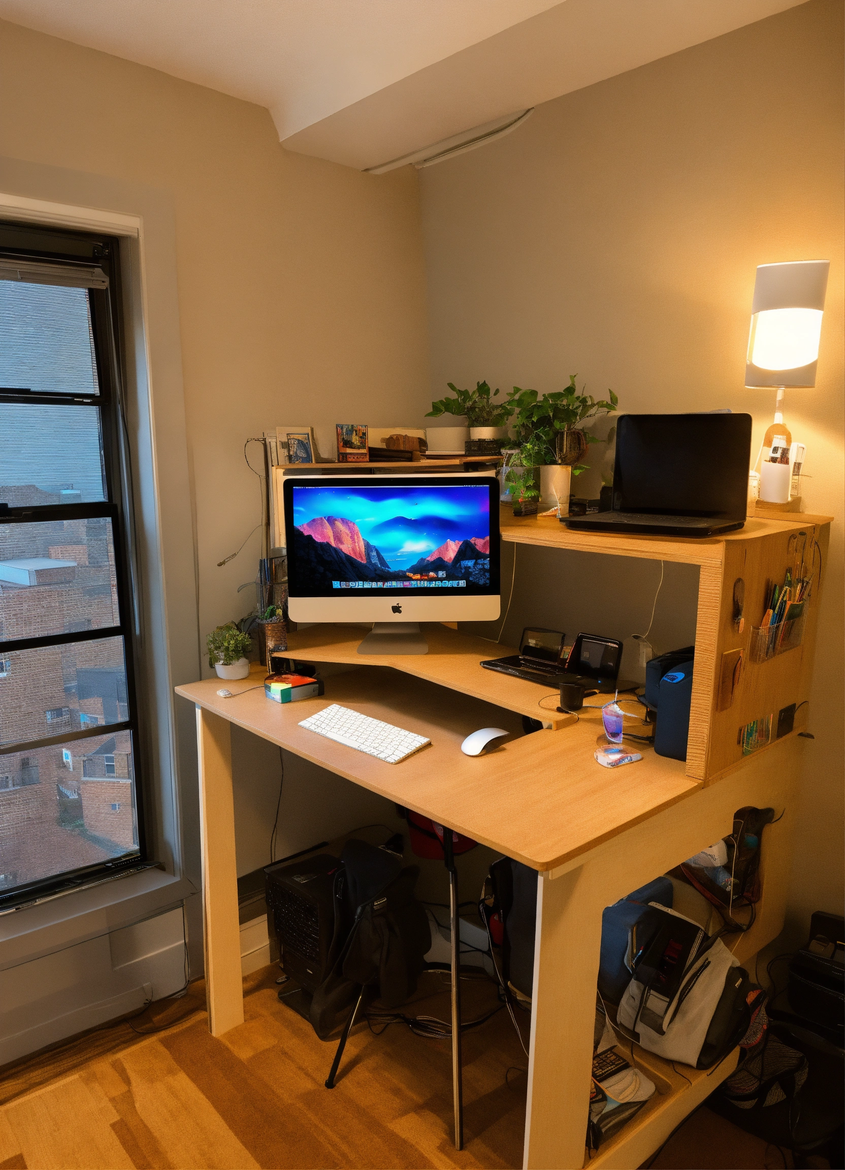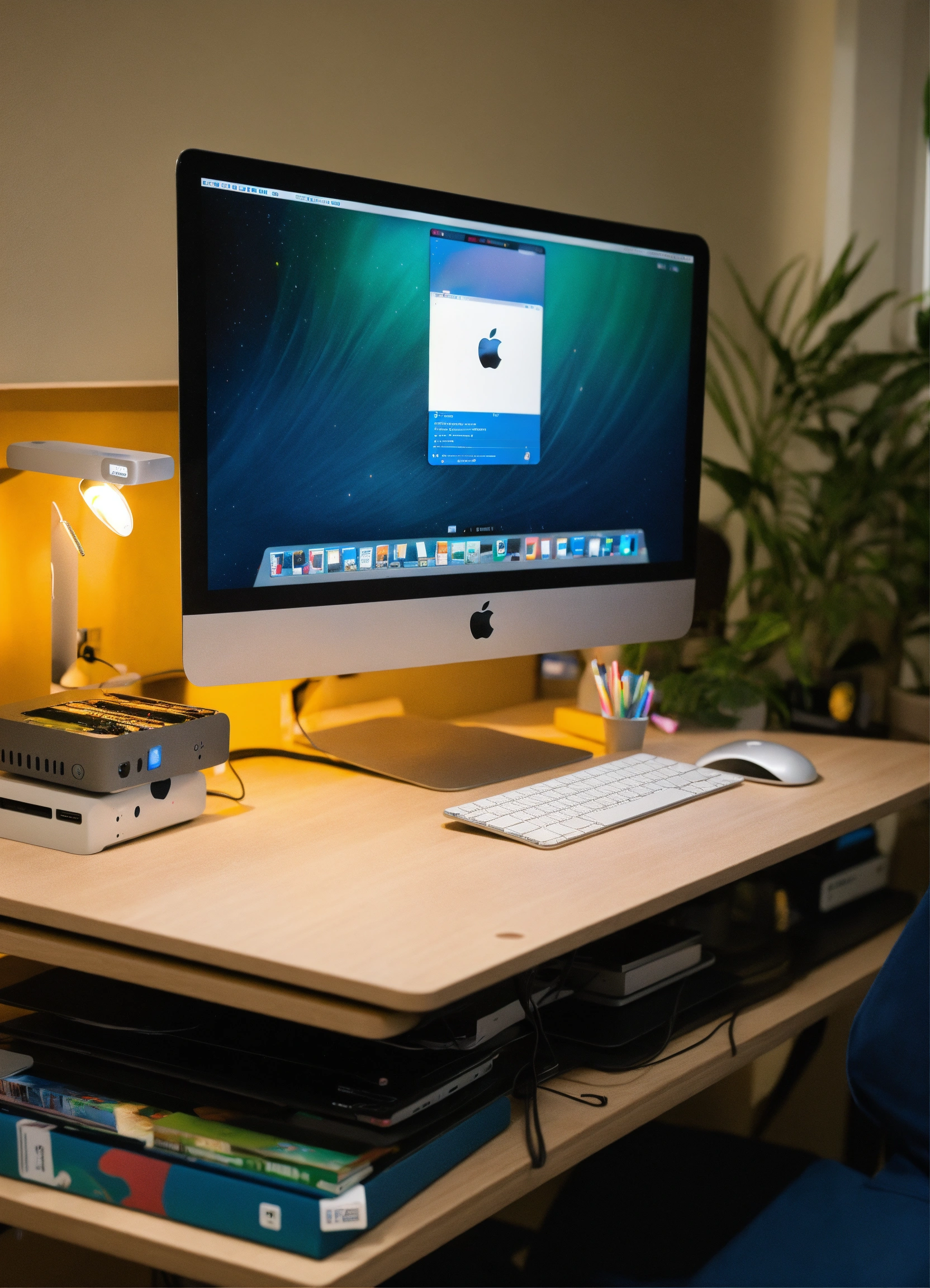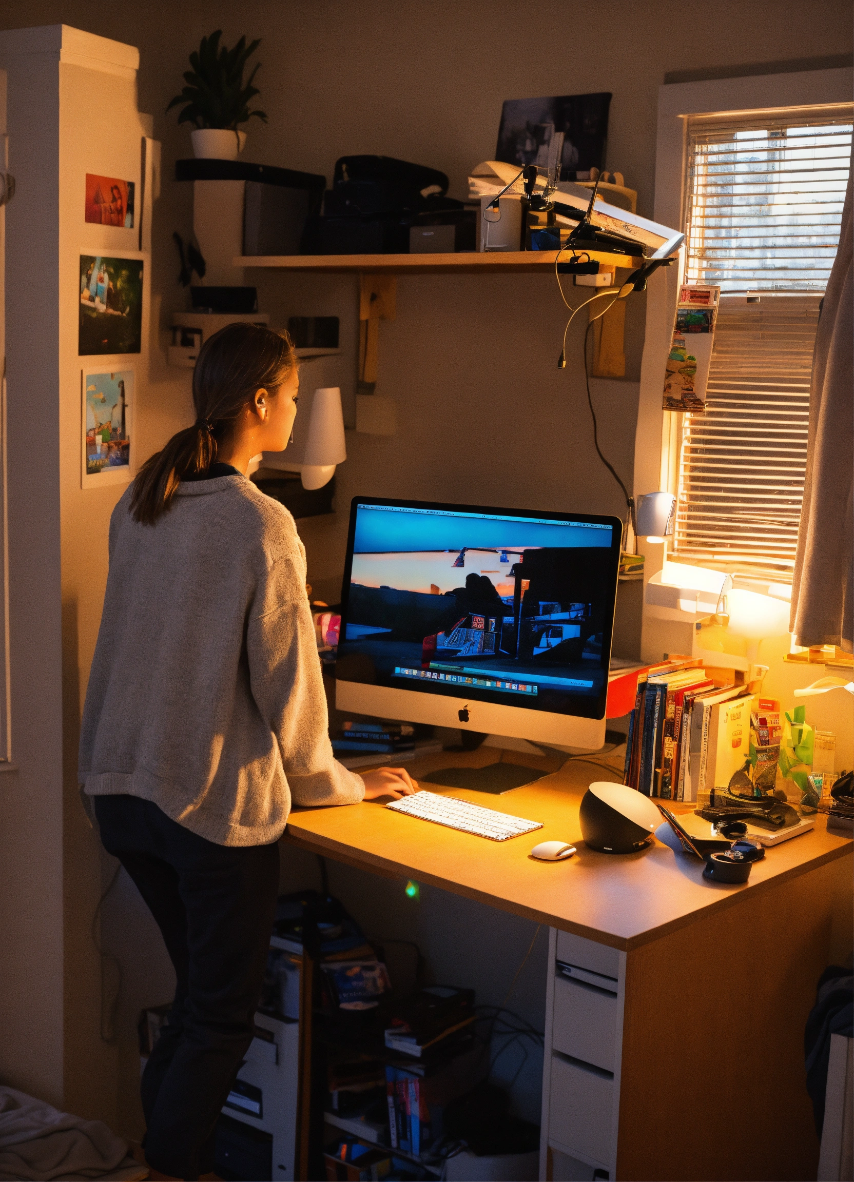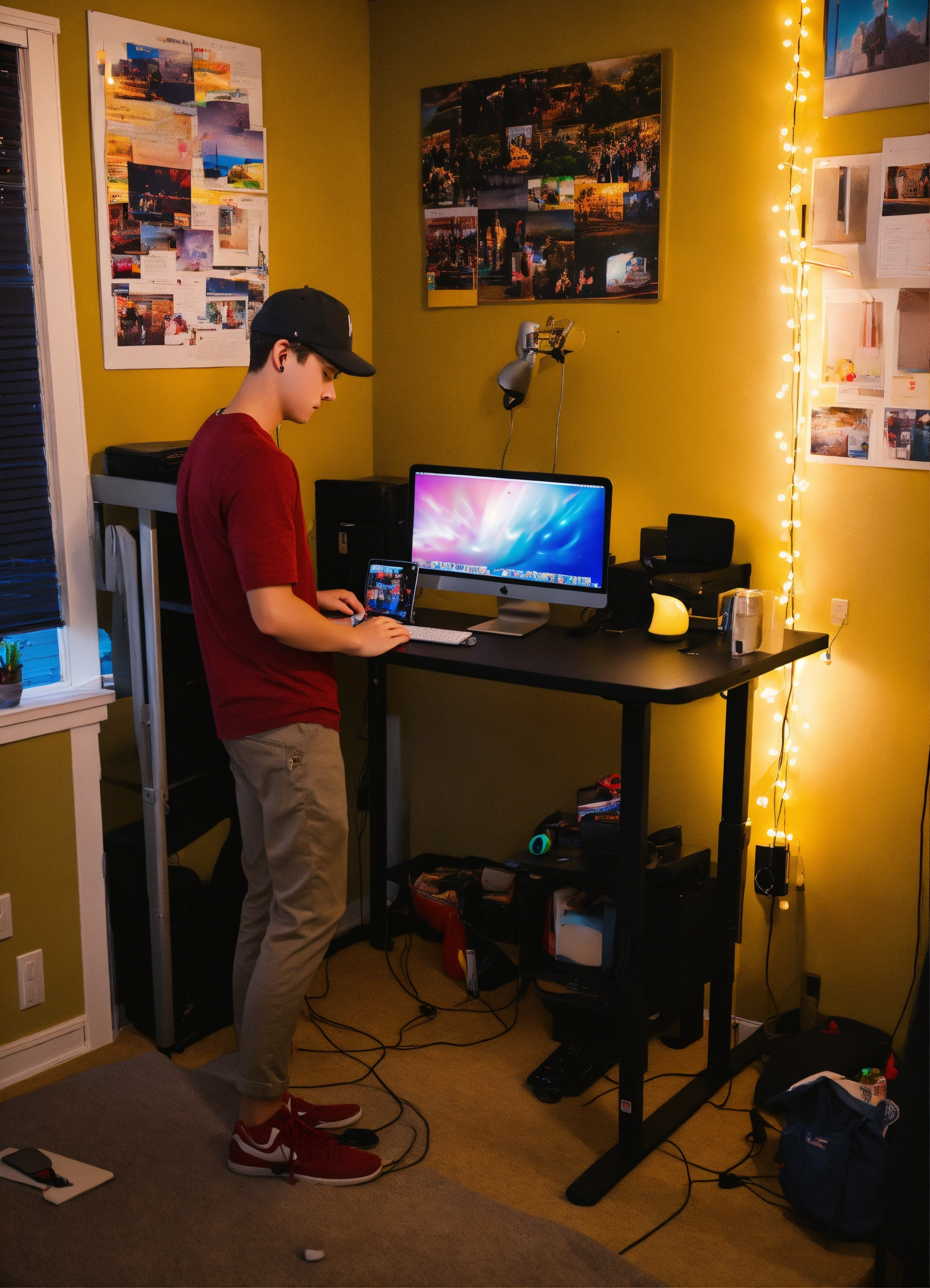 Create a picture of a college student working in their dorm room with a mac mini on their standing desk