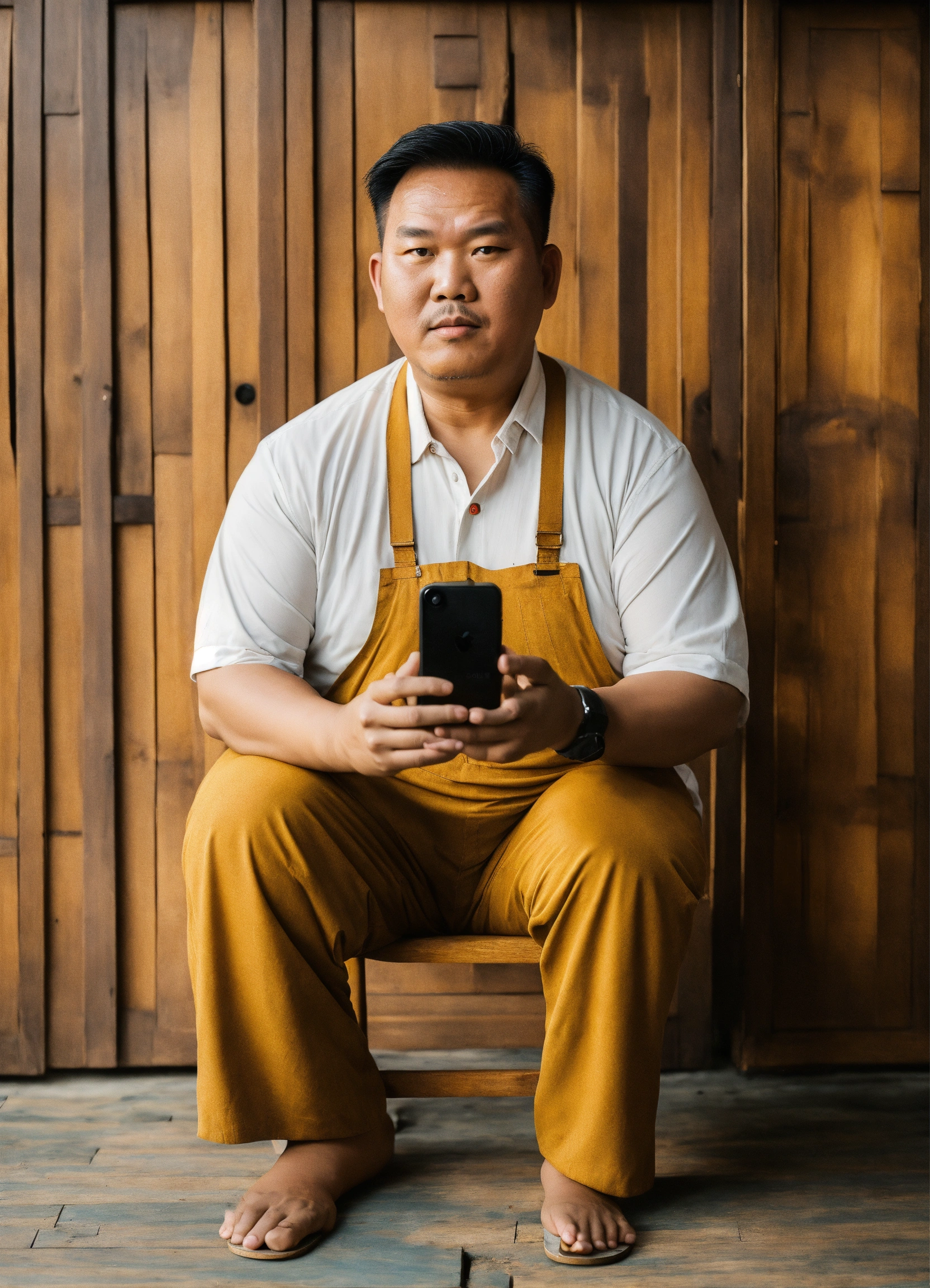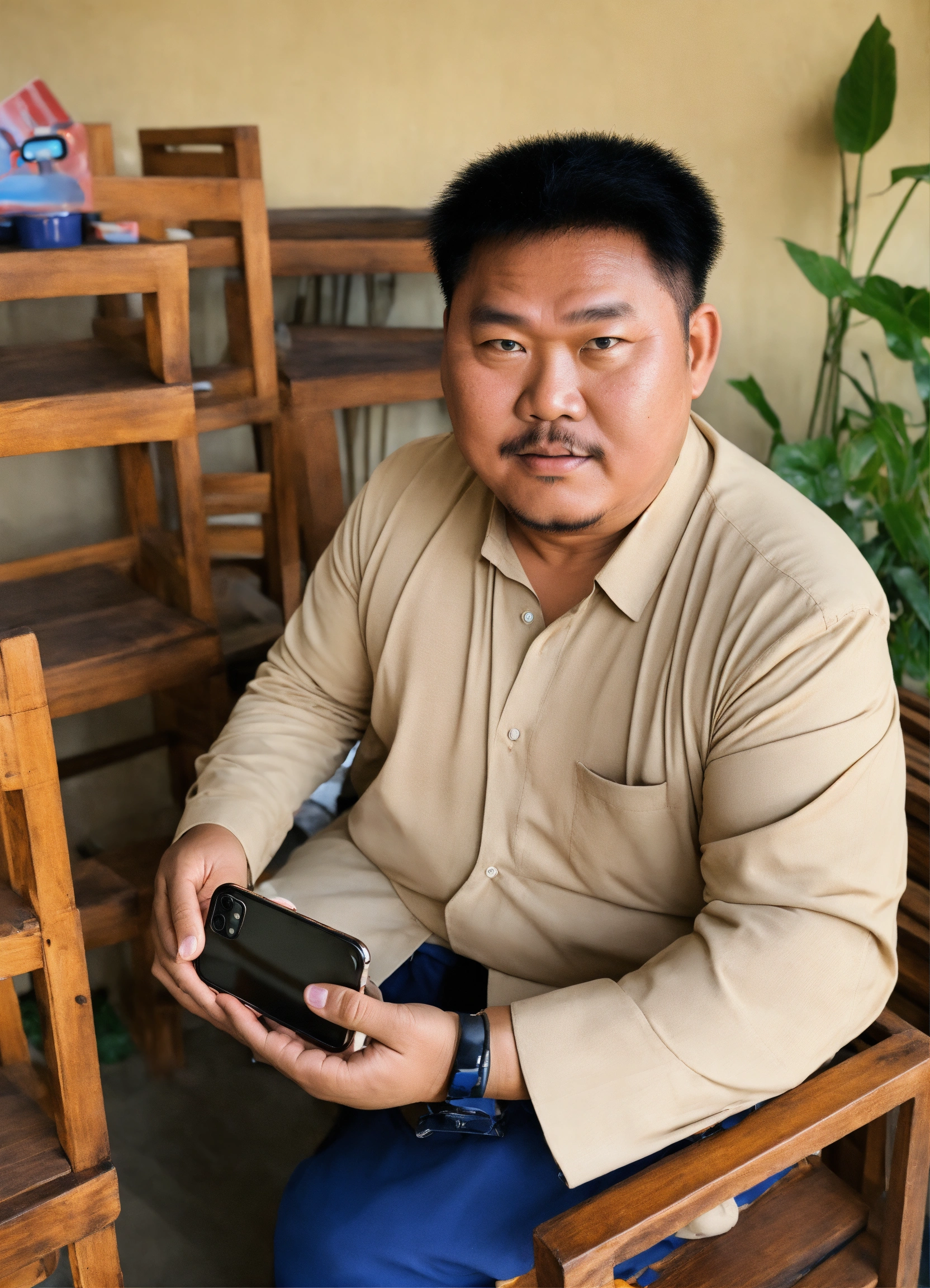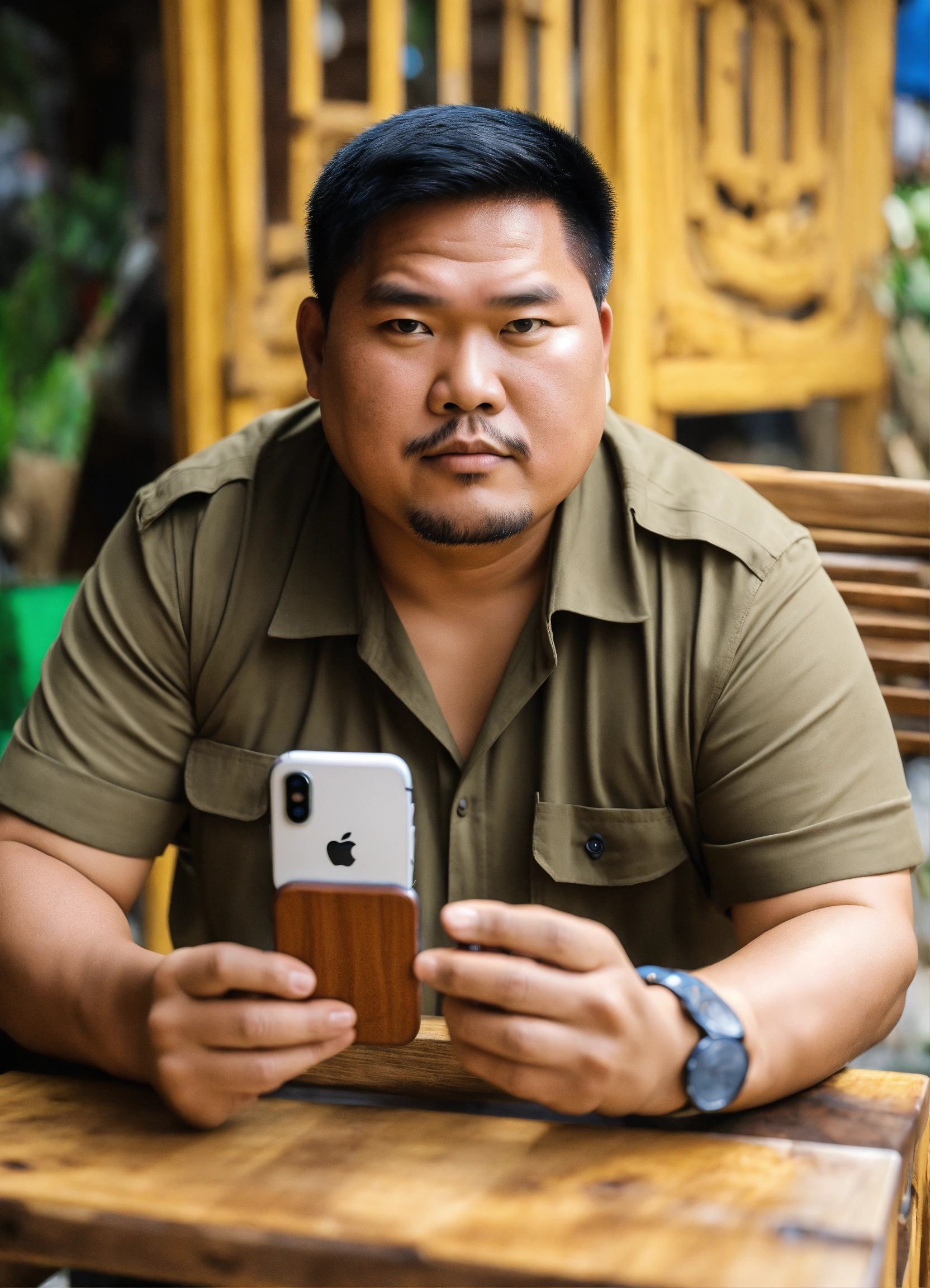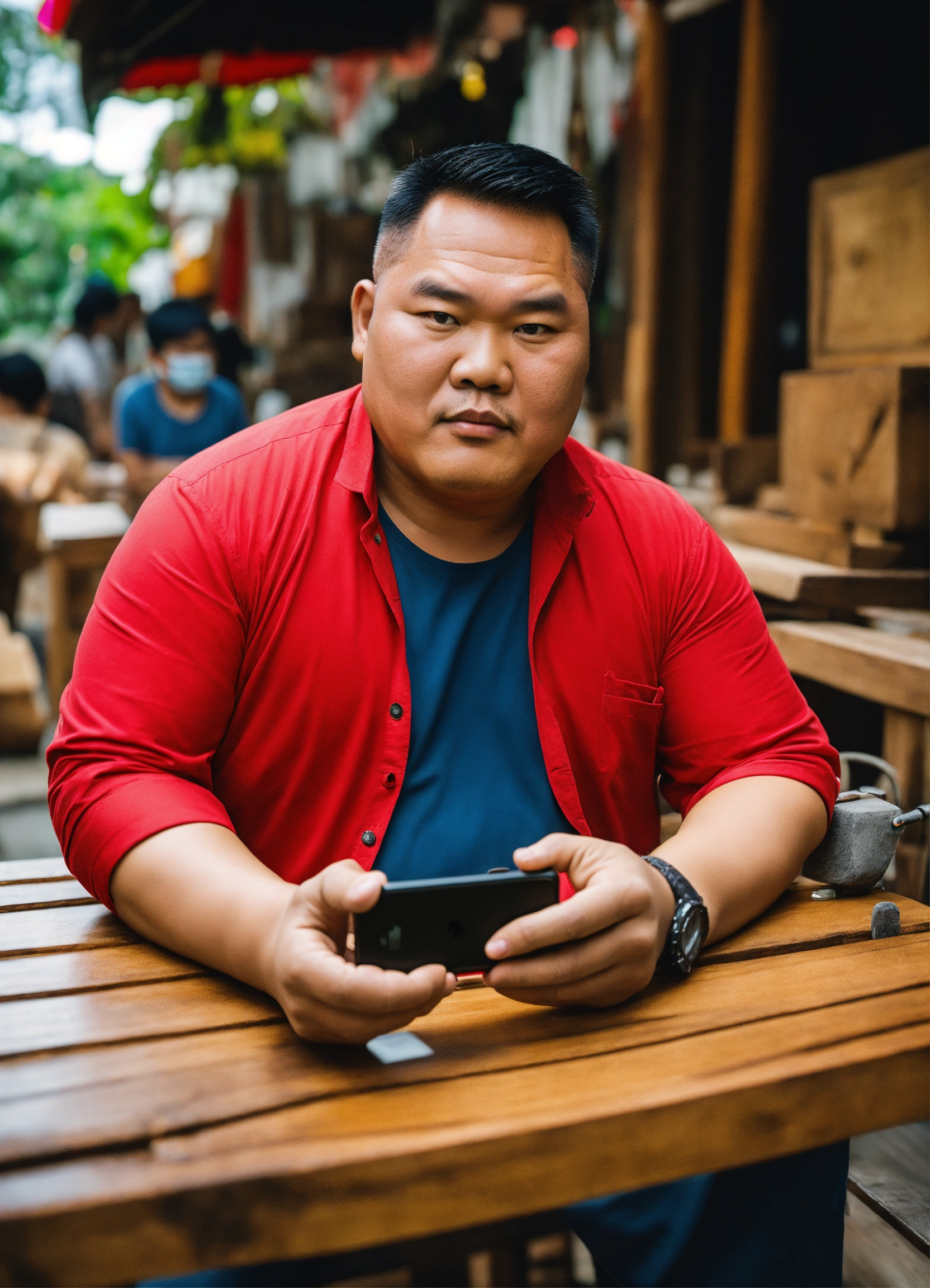 Huge vietnamese man, square face, sly eyes selling wooden furniture, holding an iphone 13 promax in his hand