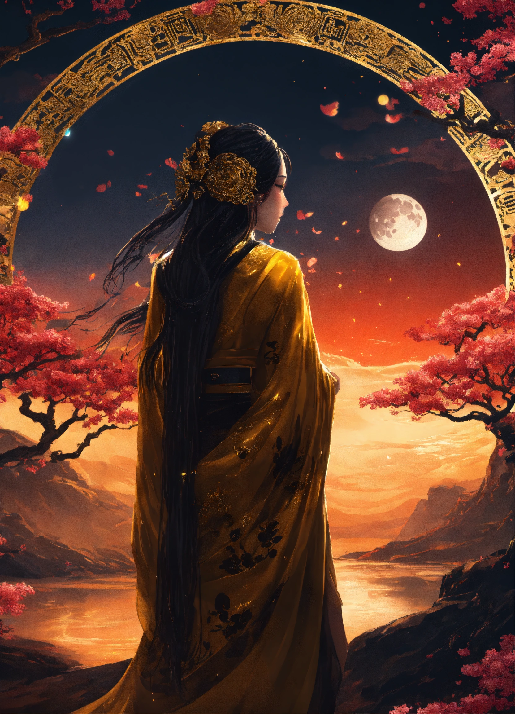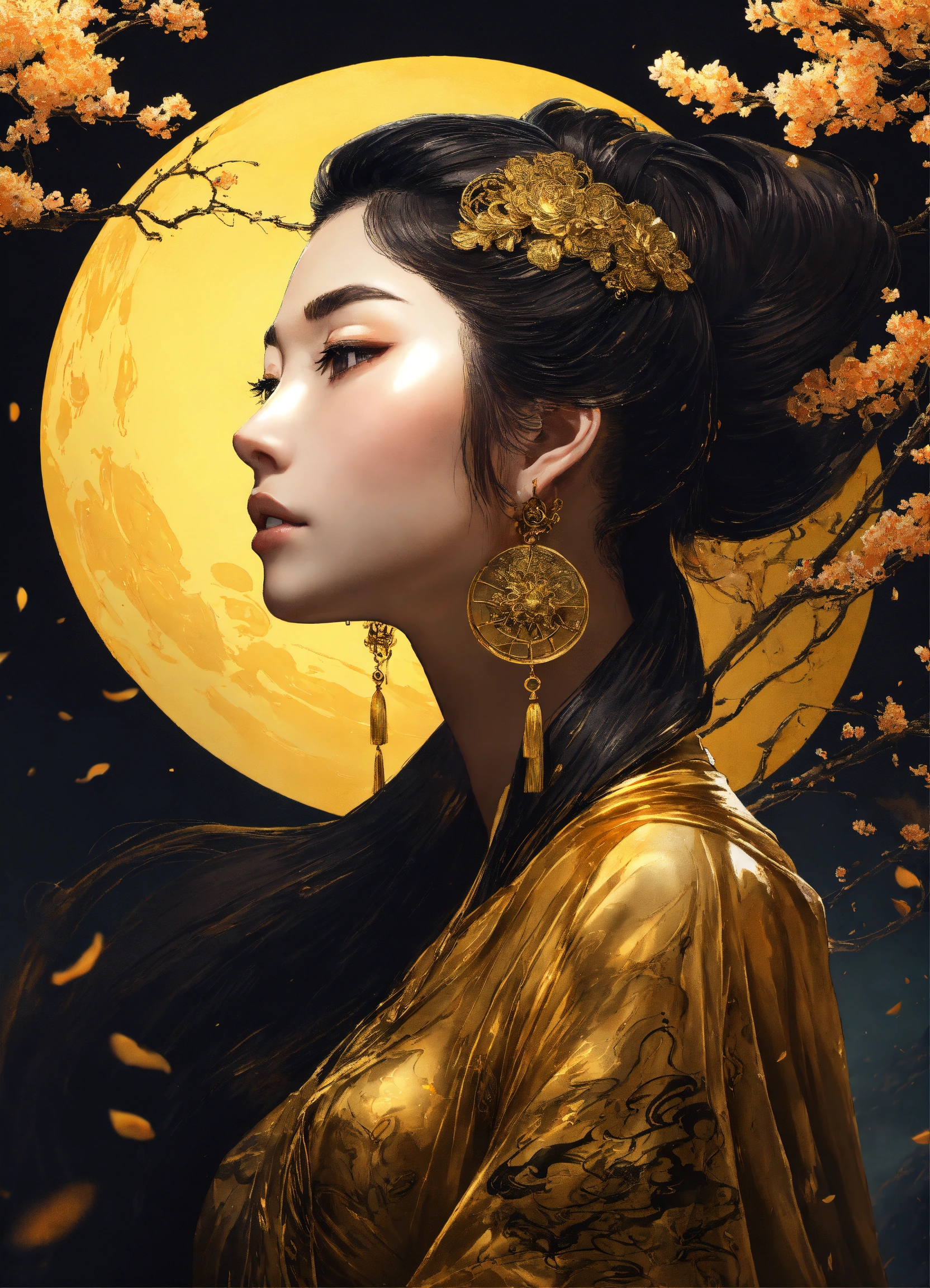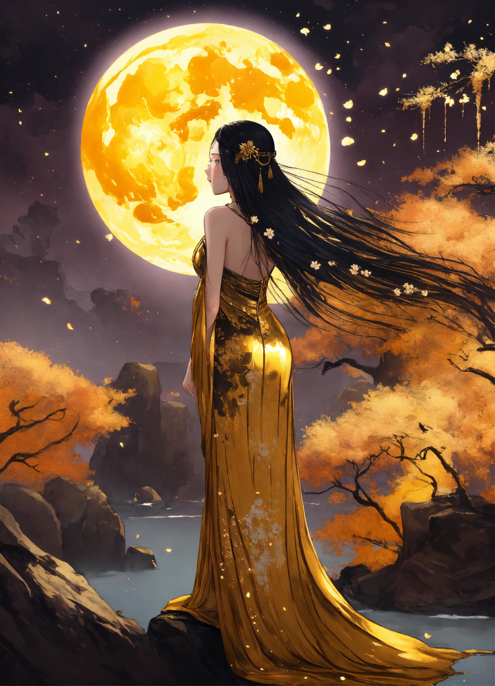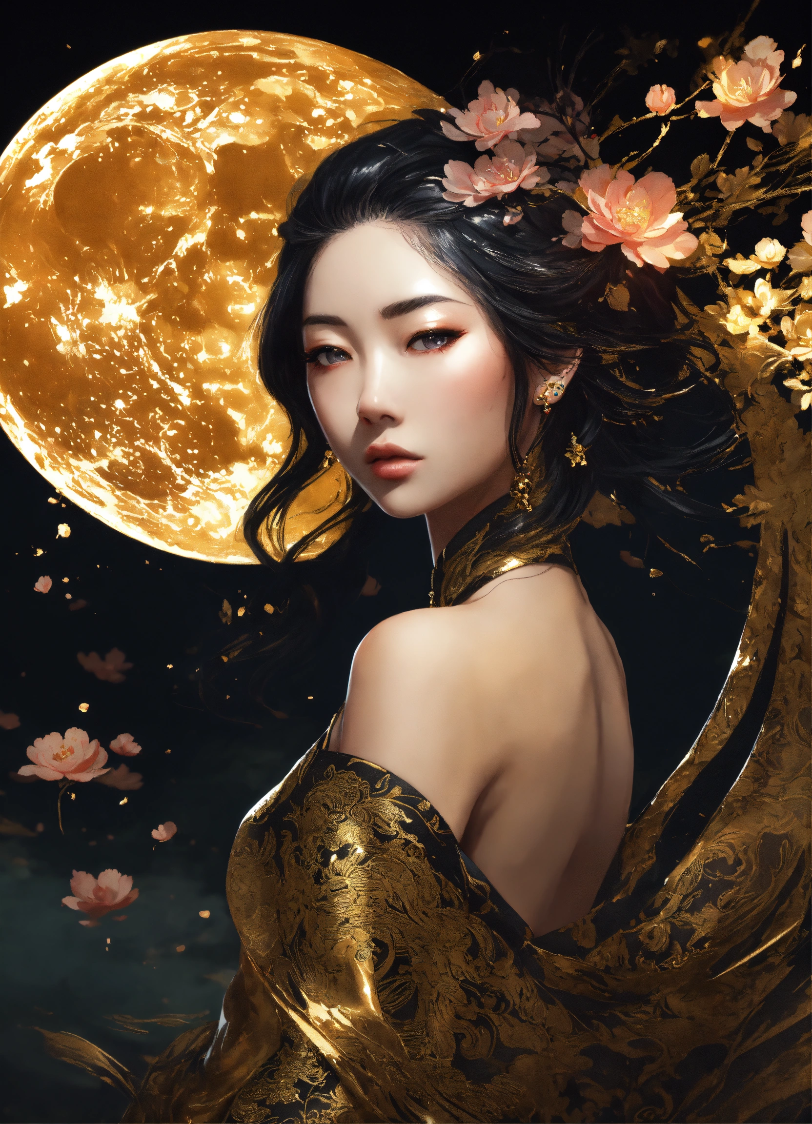 Black and gold ink, the back of a mysterious asian goddess in a gold-encrusted black dress against a large moon, holding a black fan in one hand and loosening her long hair. plum blossom night. m.c.p.a. ink art, fantasy landscape, ultra-precise eyes, line art, black background, ultra-precise art, detail flamboyant face, natural skin, water splash, color splash art, black ink, liquid melting, dreamy, shining, shadow, oil on canvas, brush strokes, smooth, ultra high definition, 8k, unreal engine 5, ultra sharp focus, complex artwork masterpiece, ominous, golden ratio, very detailed, vibrant, production cinematic character lender, ultra high definition model