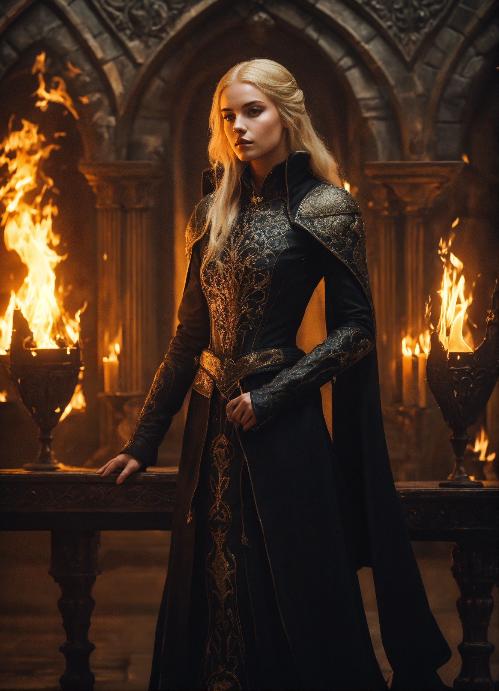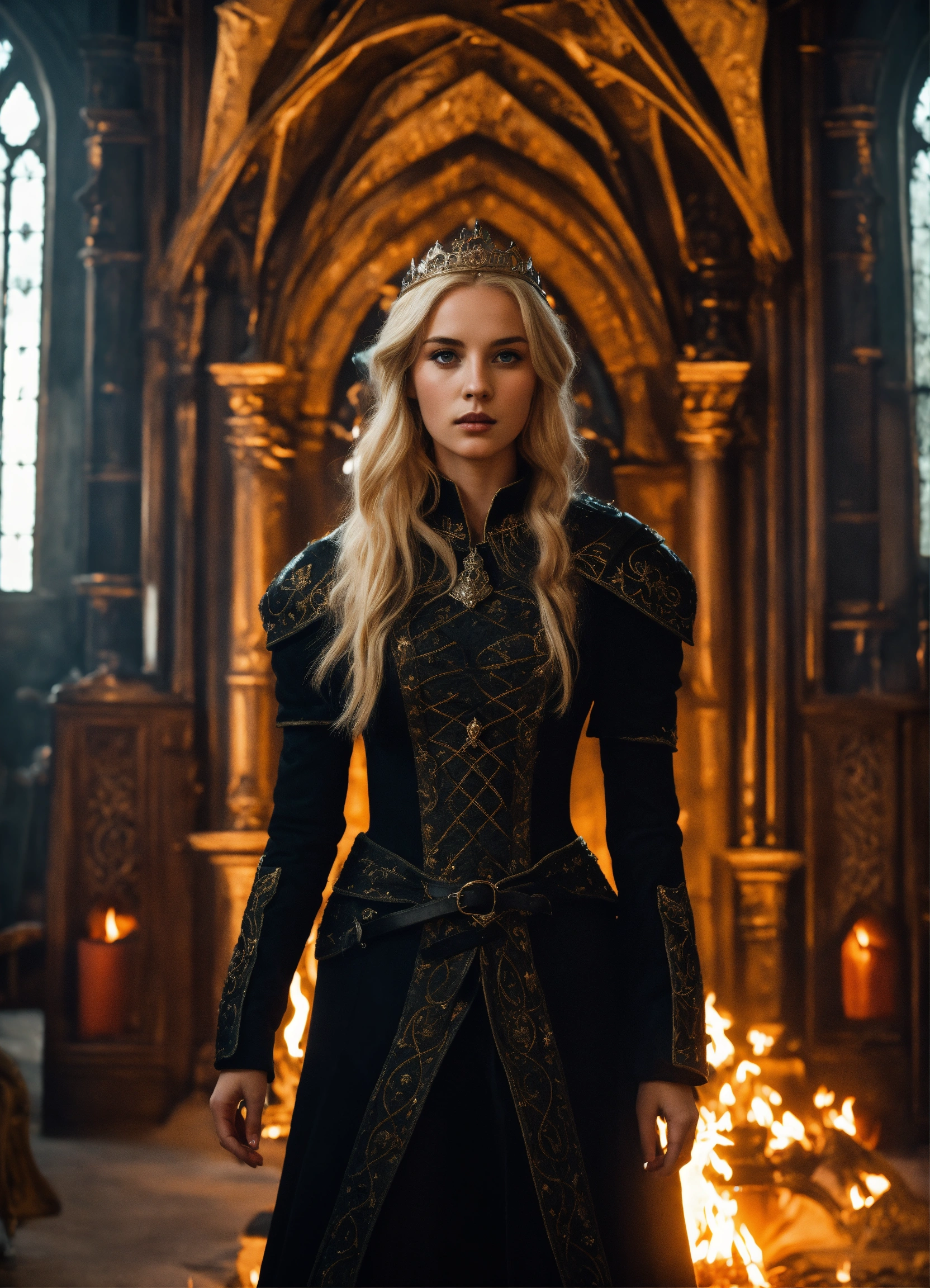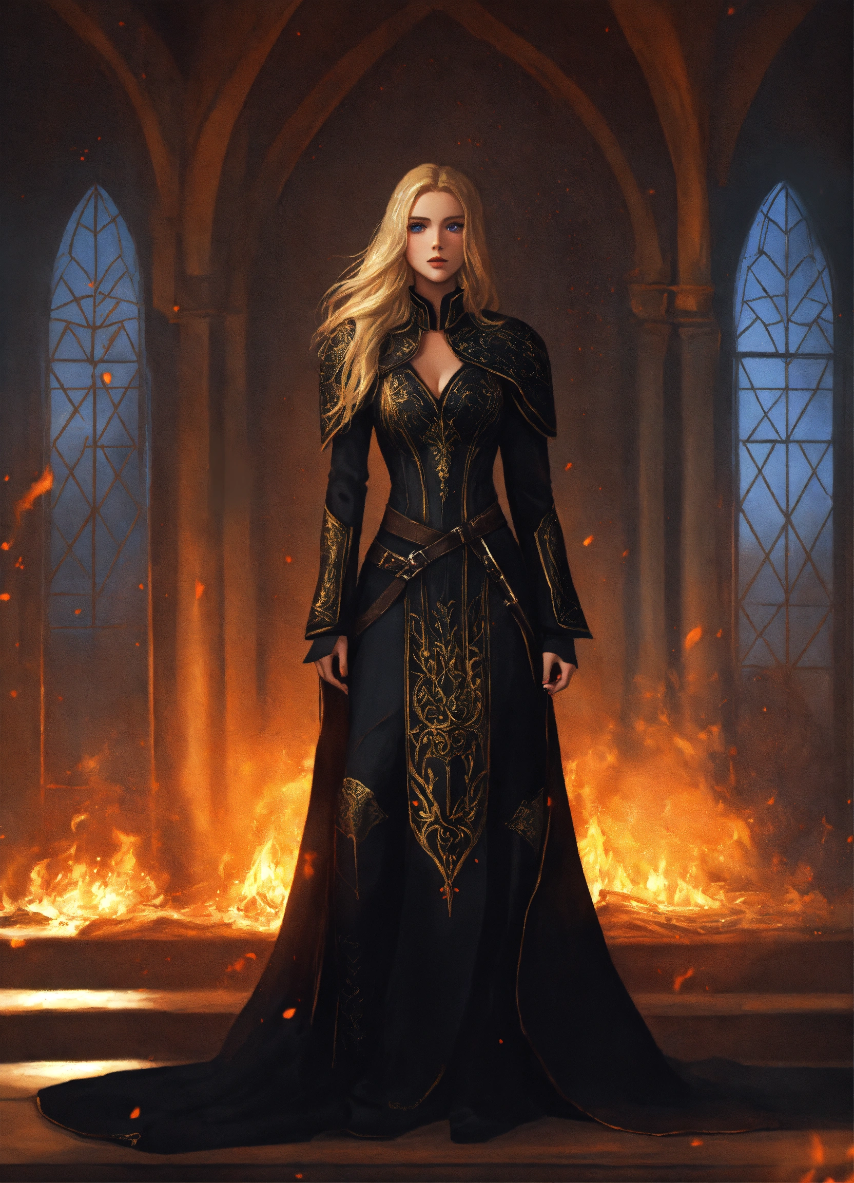 Young medieval warlock woman in black gorgeous suit, simple medieval room, fire, blond, hyperdetailed eyes, gorgeous face, warrior, throne of glass, aelin galathynius, queen