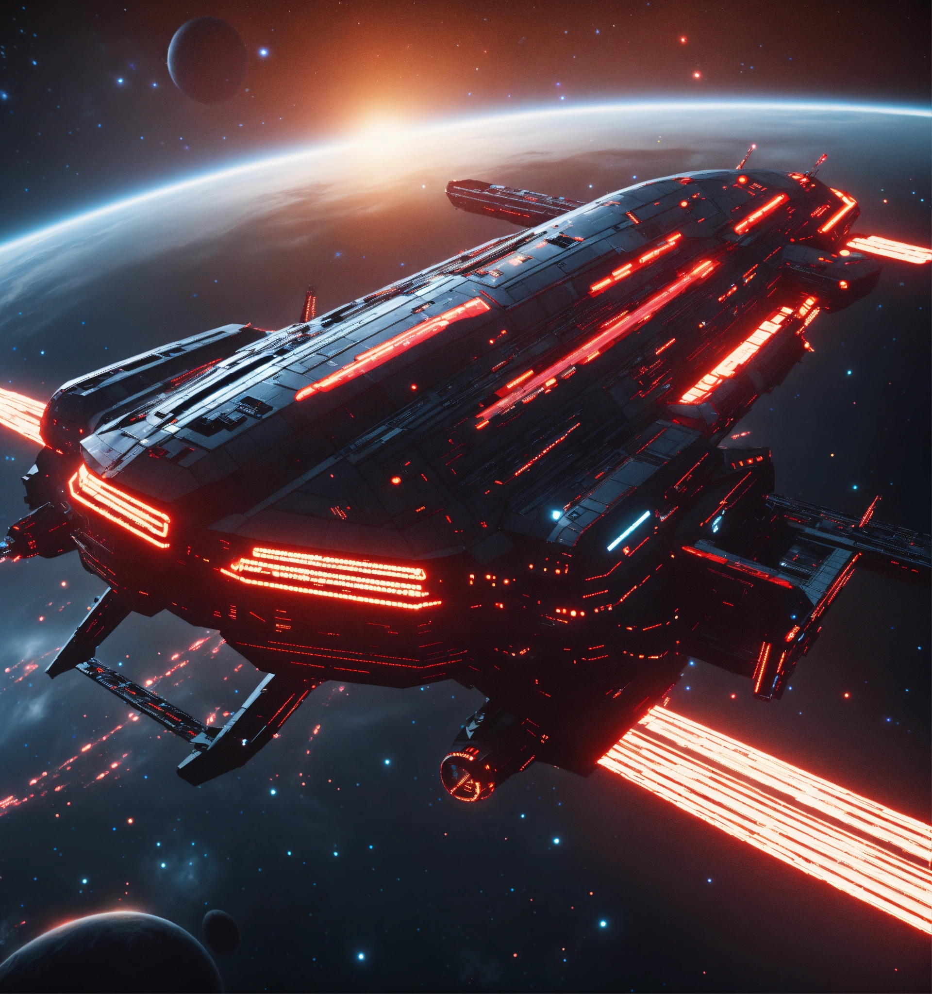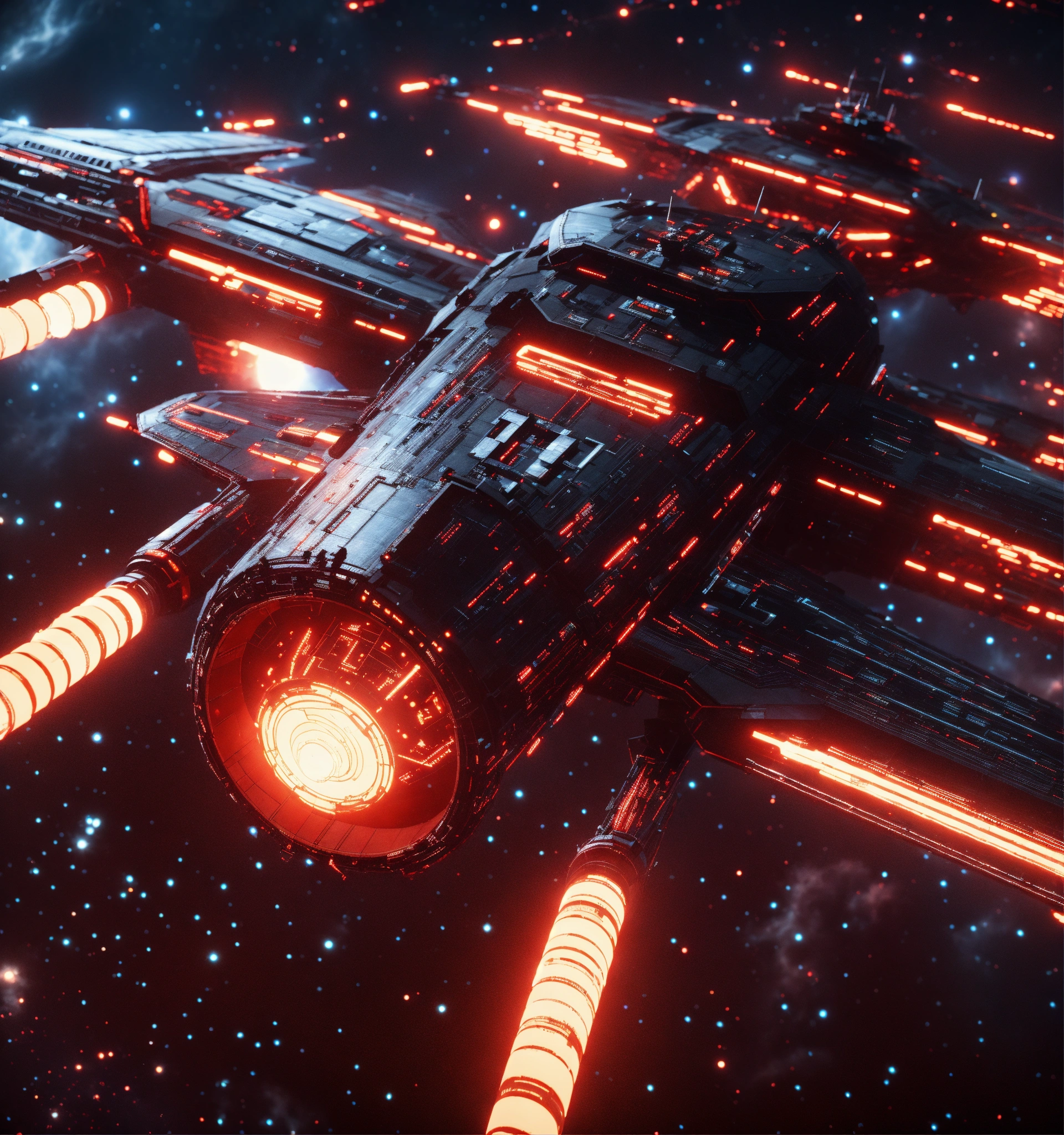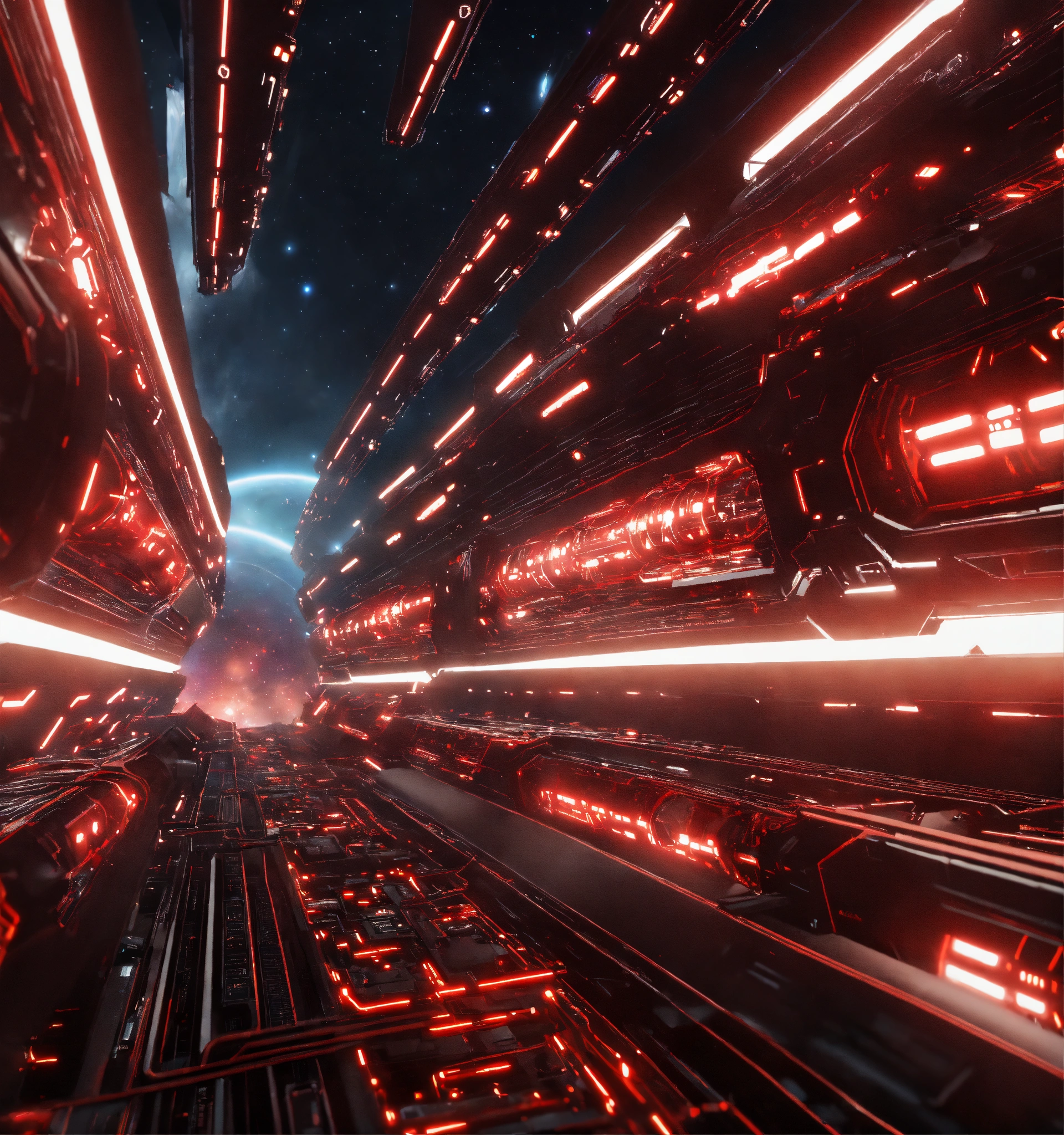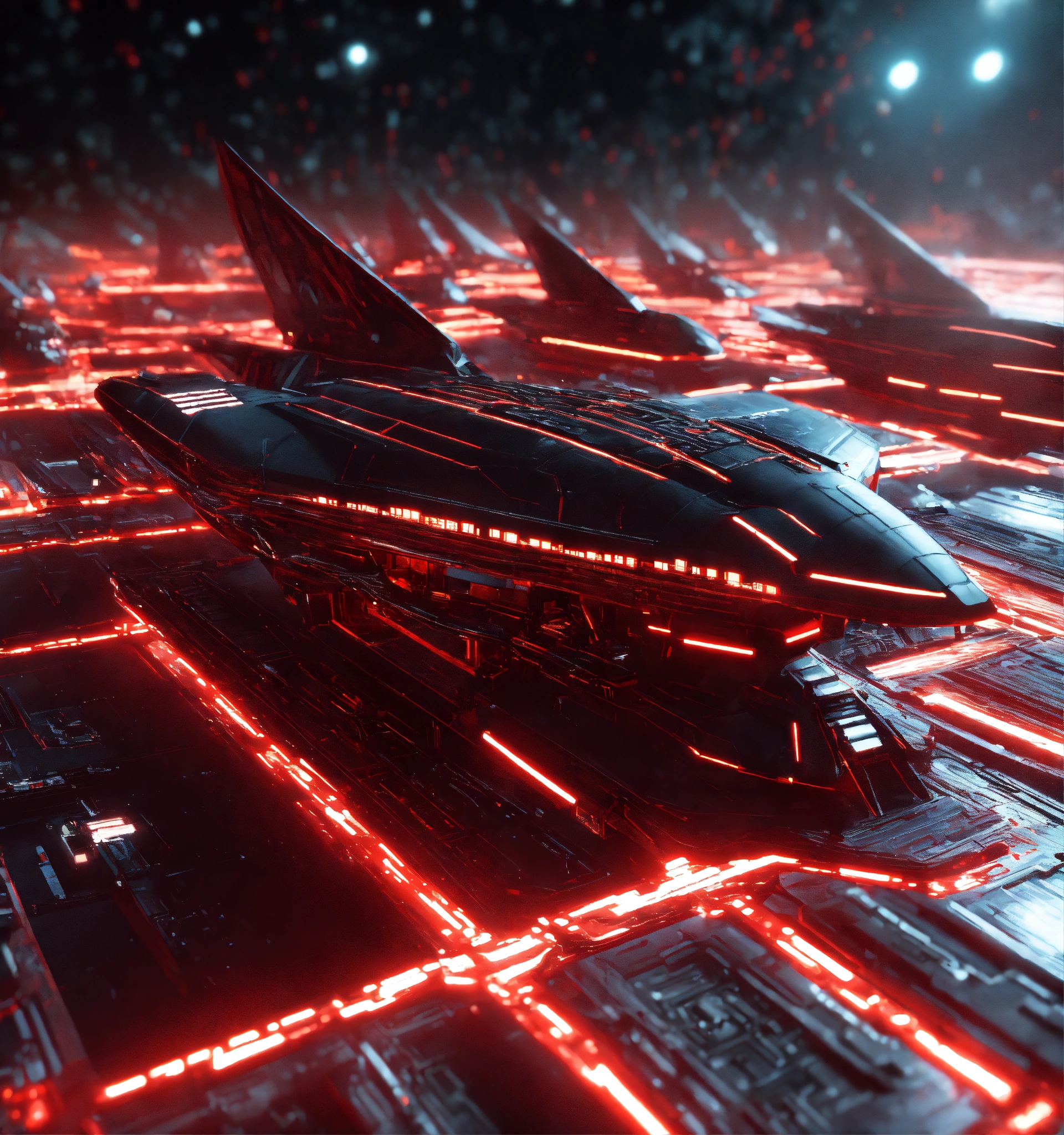 Zoom out on fleet of long black organic worm like space ships with glowing red circuitry and markings, appear in deep space from hyperspace, realistic, 8k, tron, unreal engine