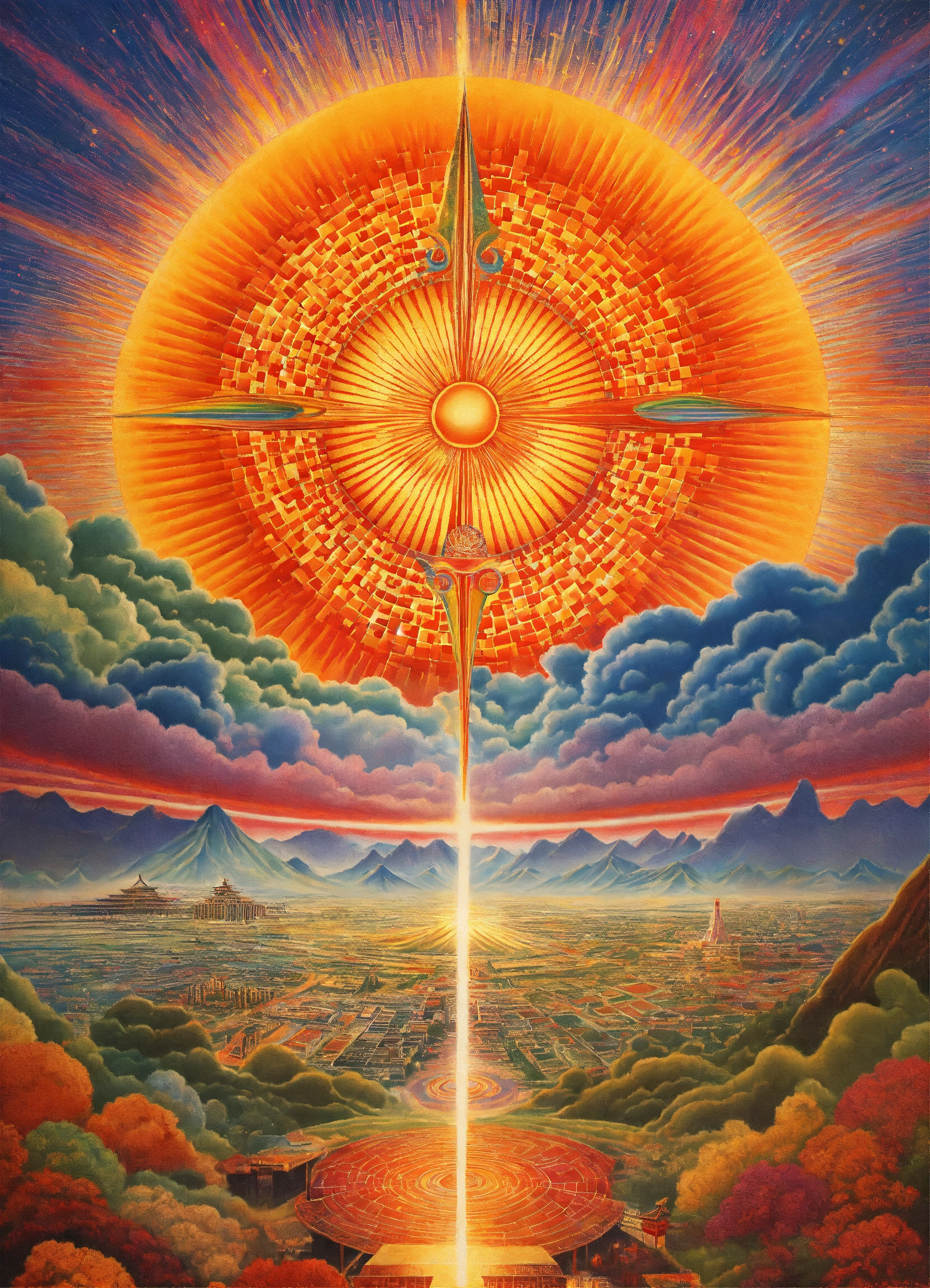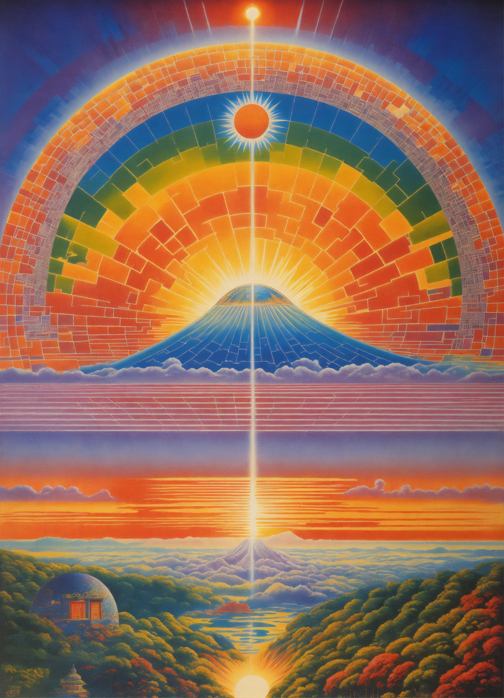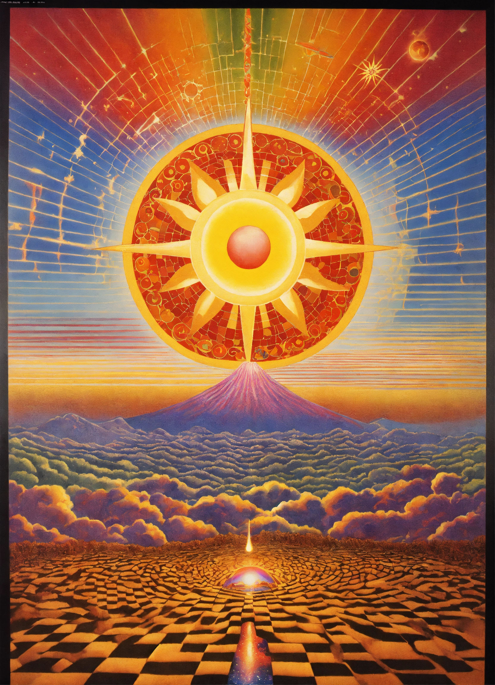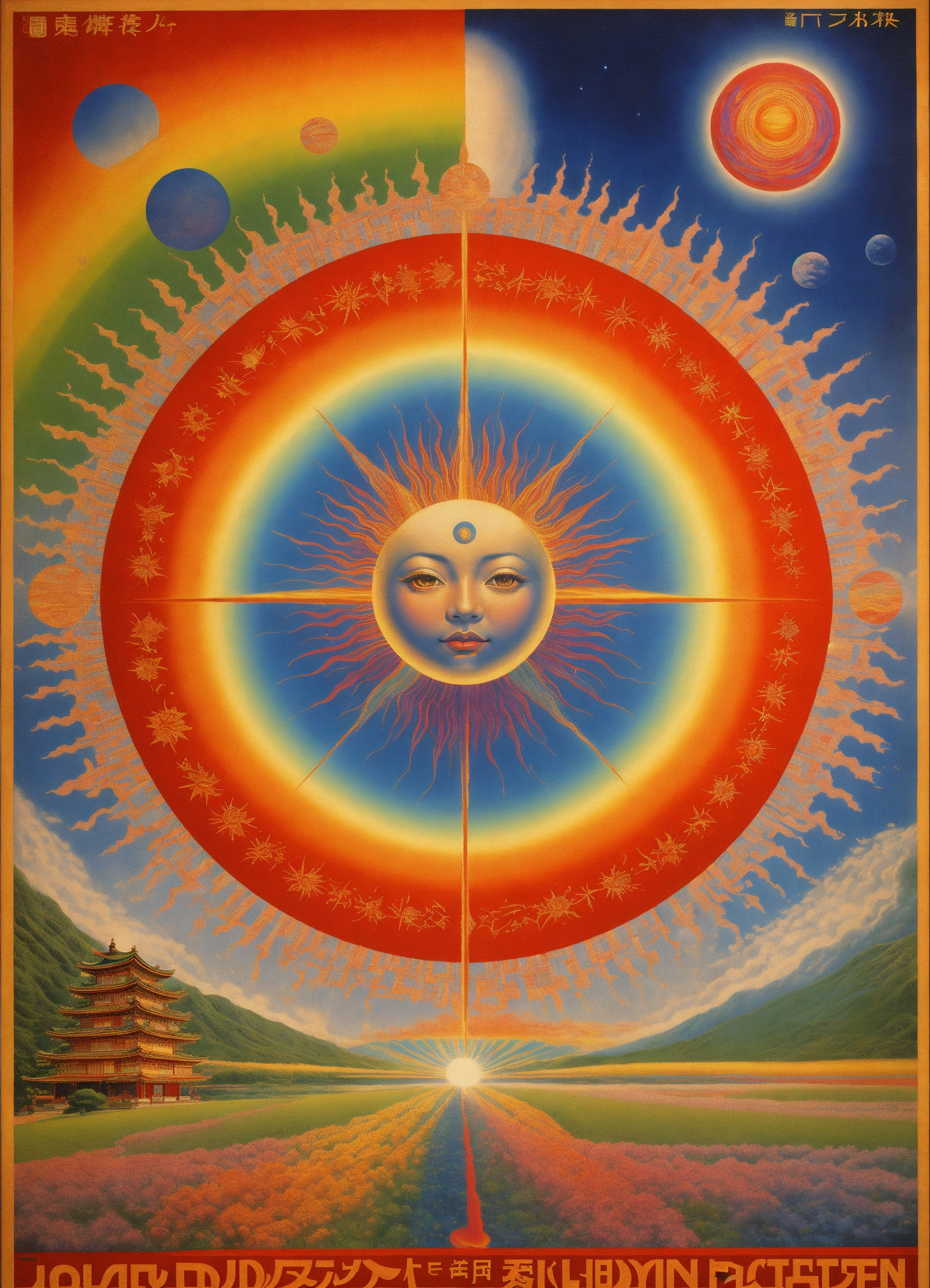 Japanese vintage poster, oriental, gigantic sun, dream dimension, psychedelic, nebula, the four corners of the world, rainbow checkerboard patterns by alex grey