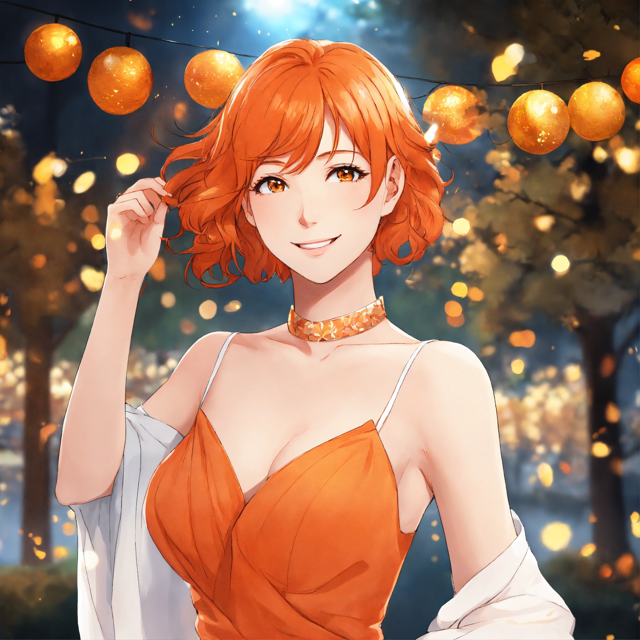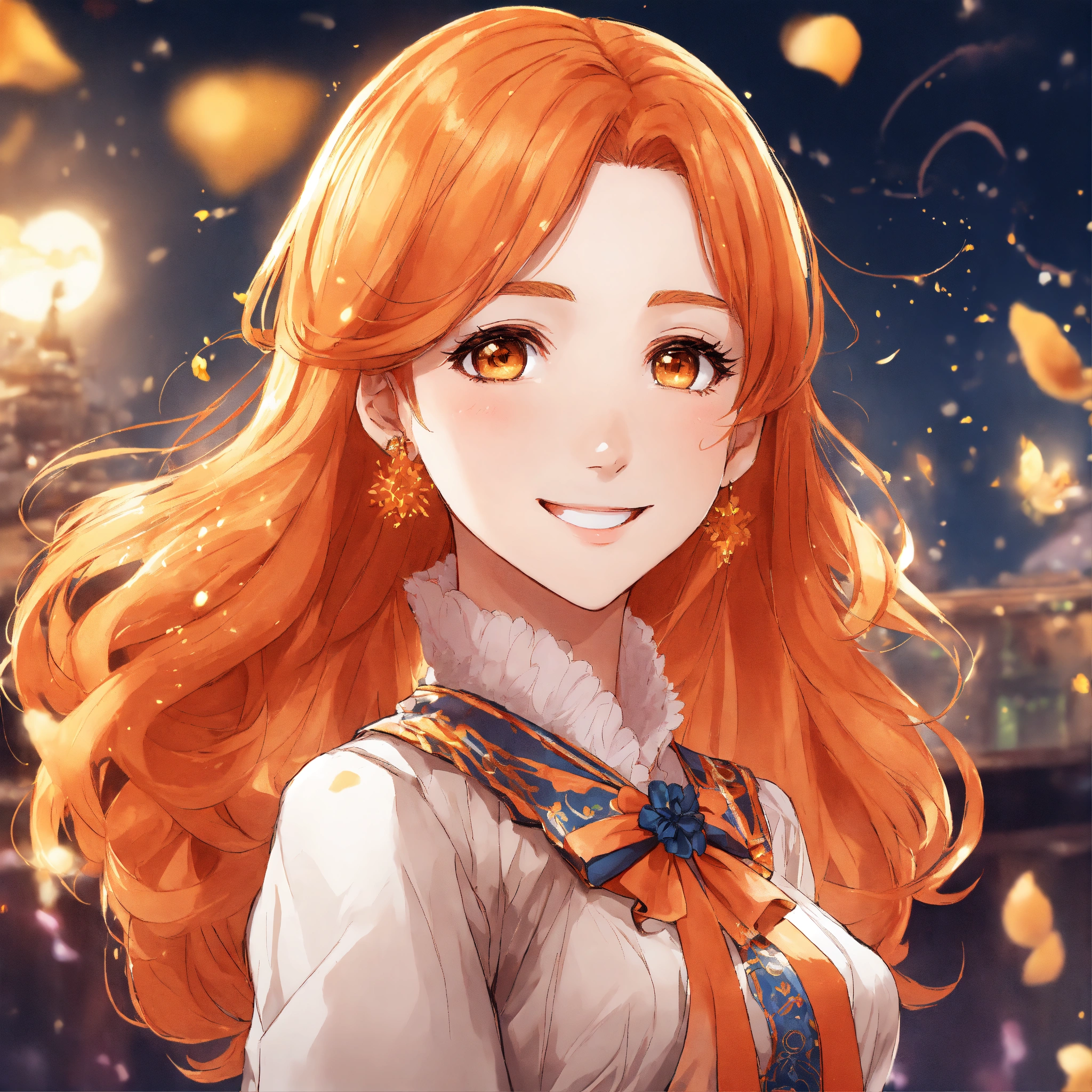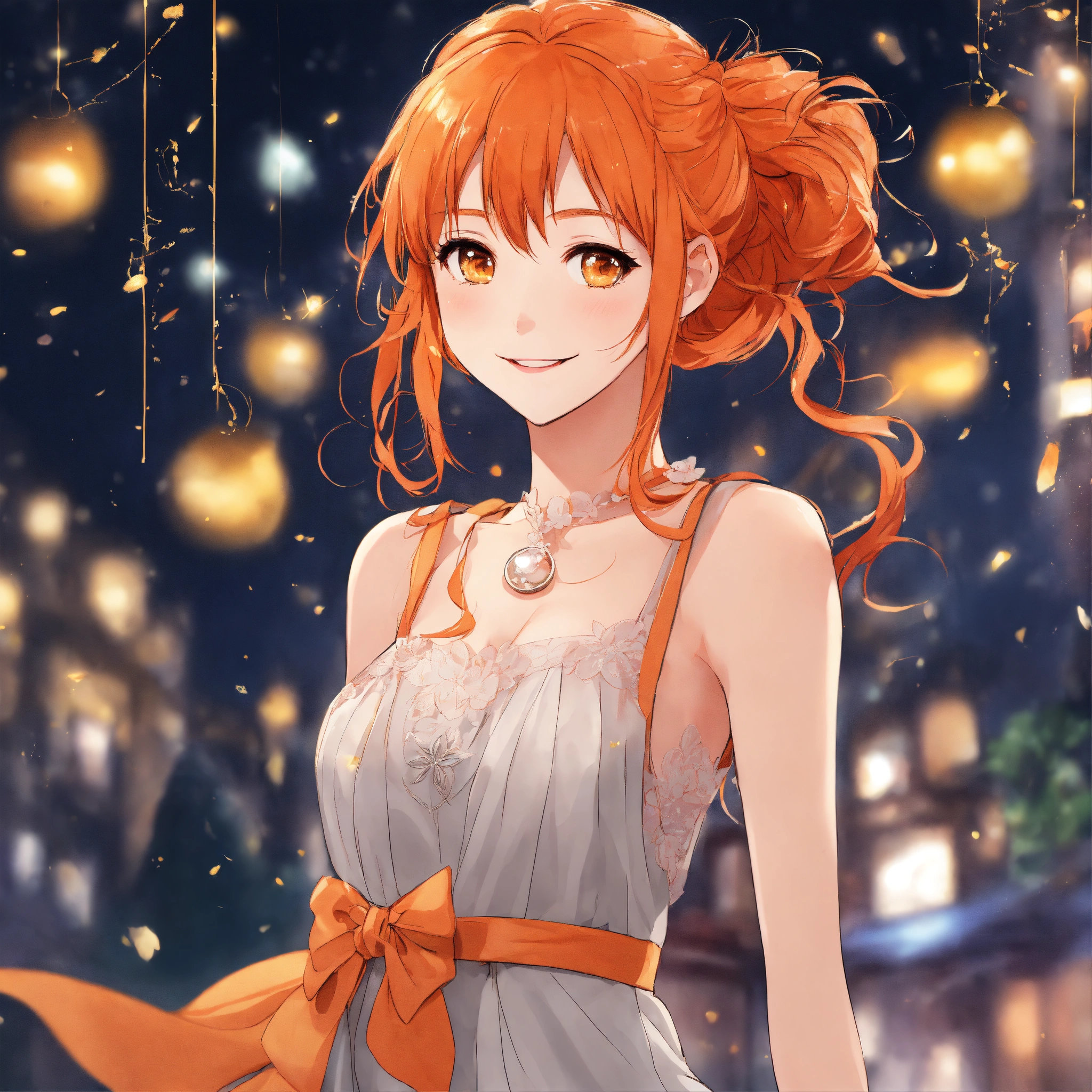 Create a manga version of a girl, very smiling, wearing an elegant dress and with orange hair, who appears celebrating the end of the year