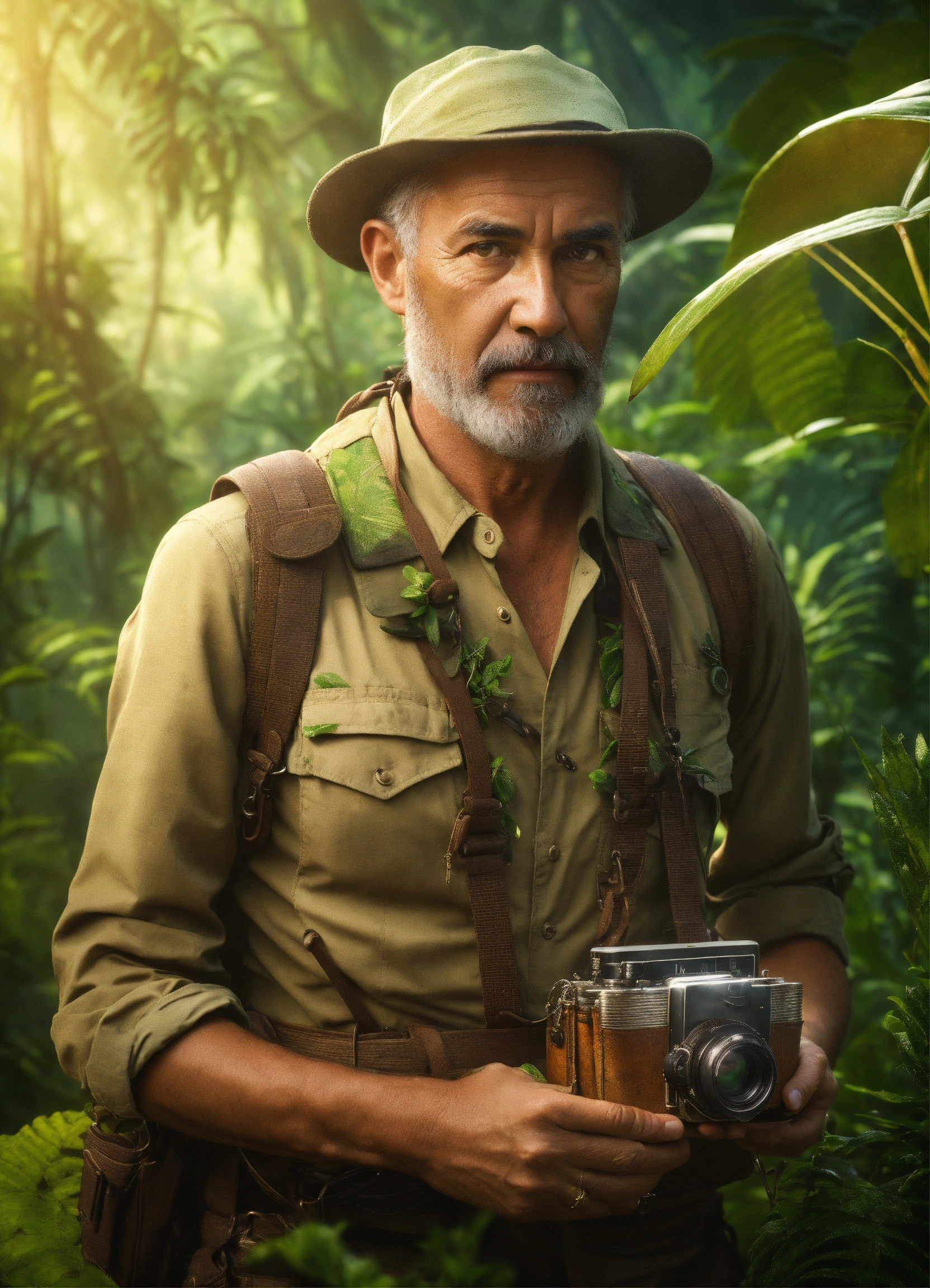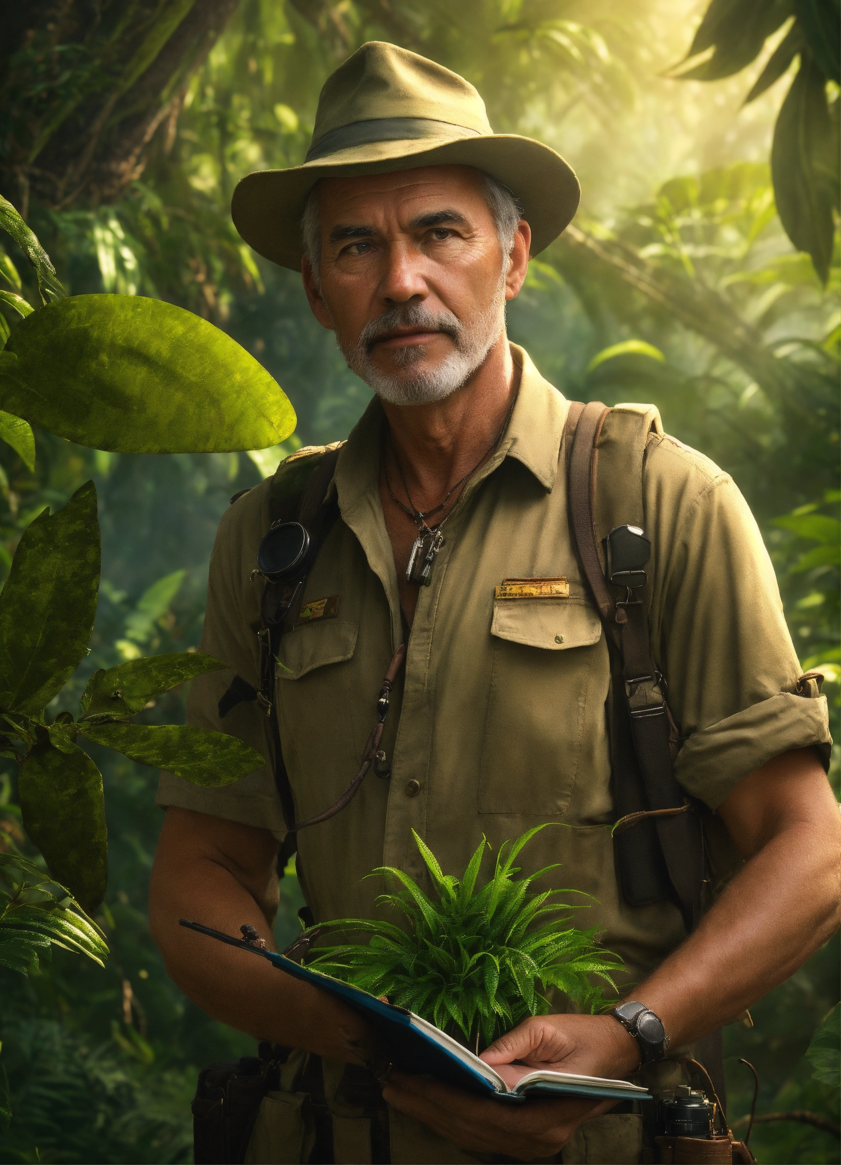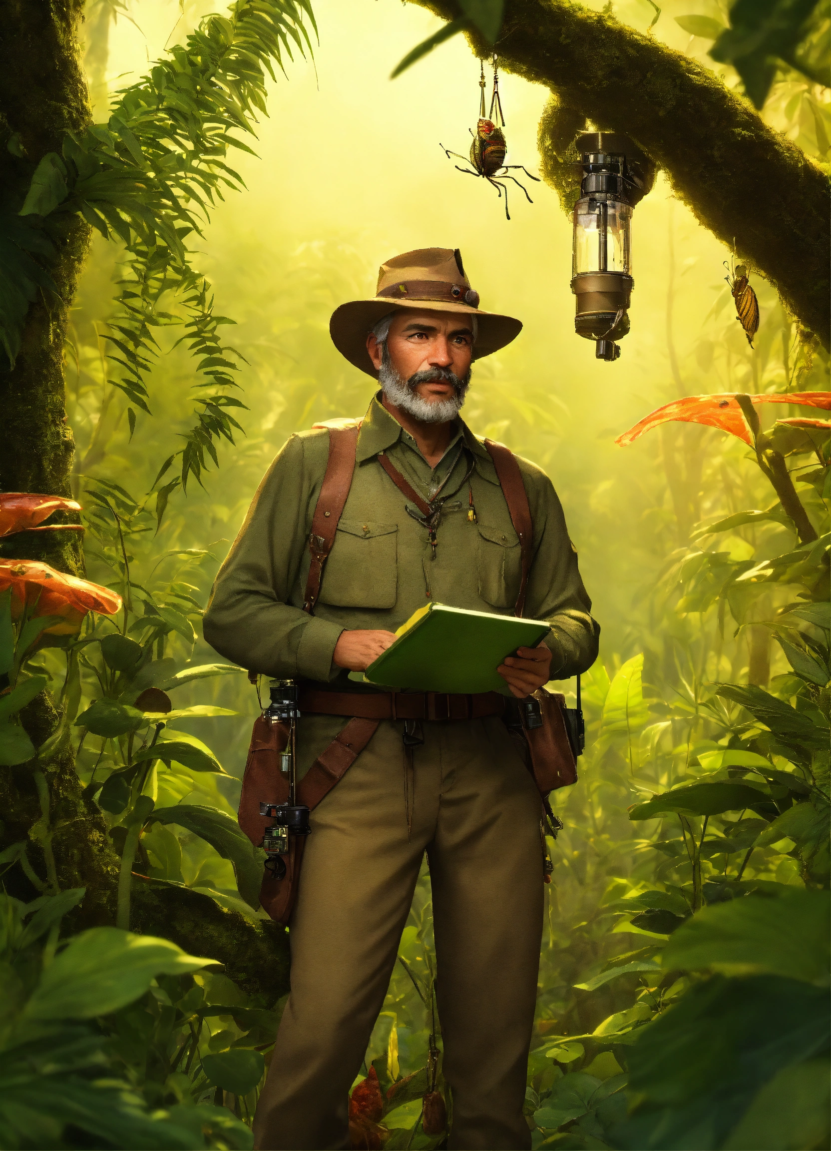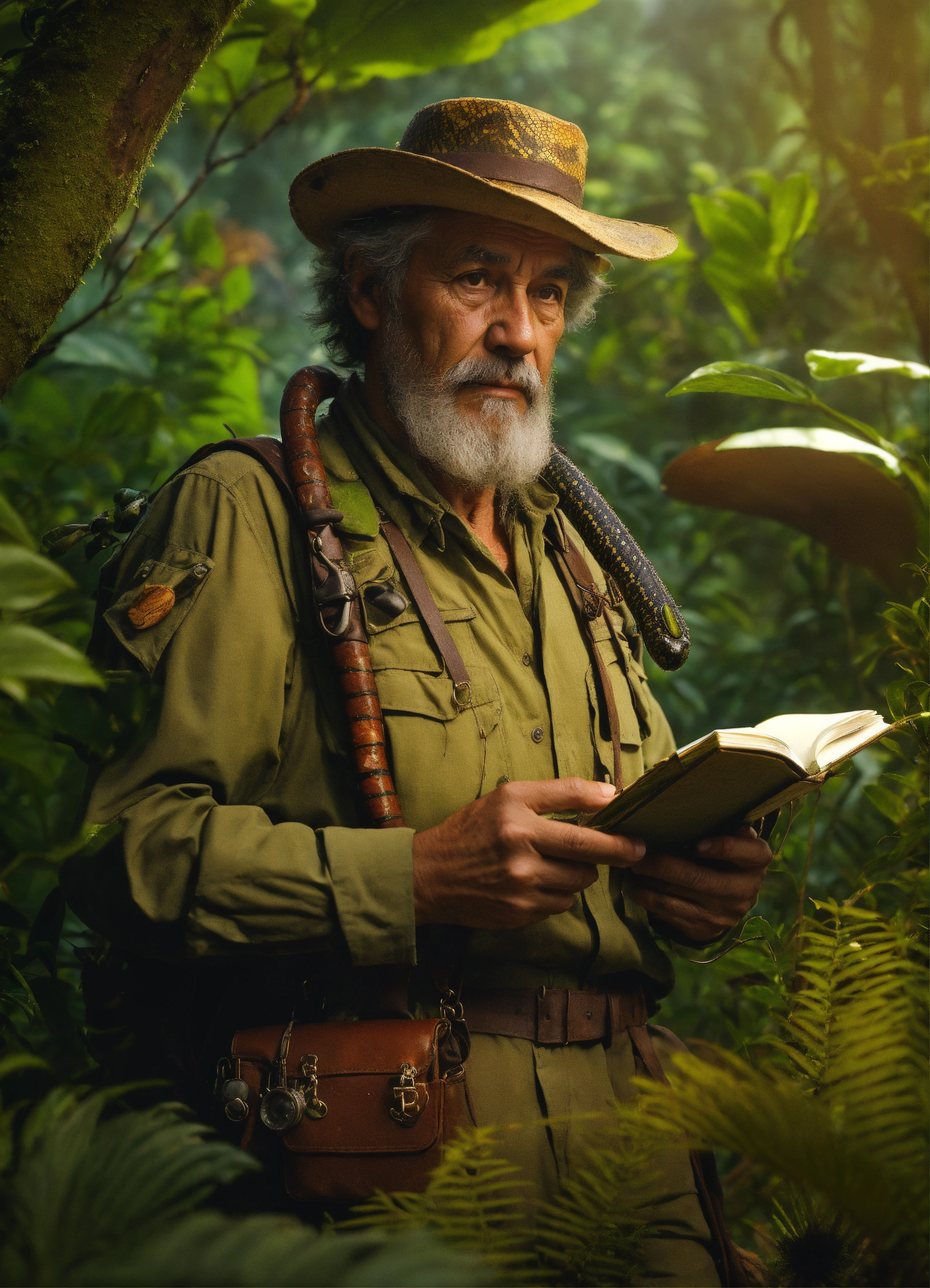 A 60-years-old botanist with a stubble and dressed in a timeless wilderness ensemble, with a notebook in his hands in a jungle. detailed image with vintage 3d video game animation style, with great lighting and tension. detailed character with jumanji vidéo game aspect. detailed jungle with a lot of little insectes and with a few big dionaea muscipula and with a anaconda in a tree in a background. detailed accessoires with a film camera slung arround his neck.