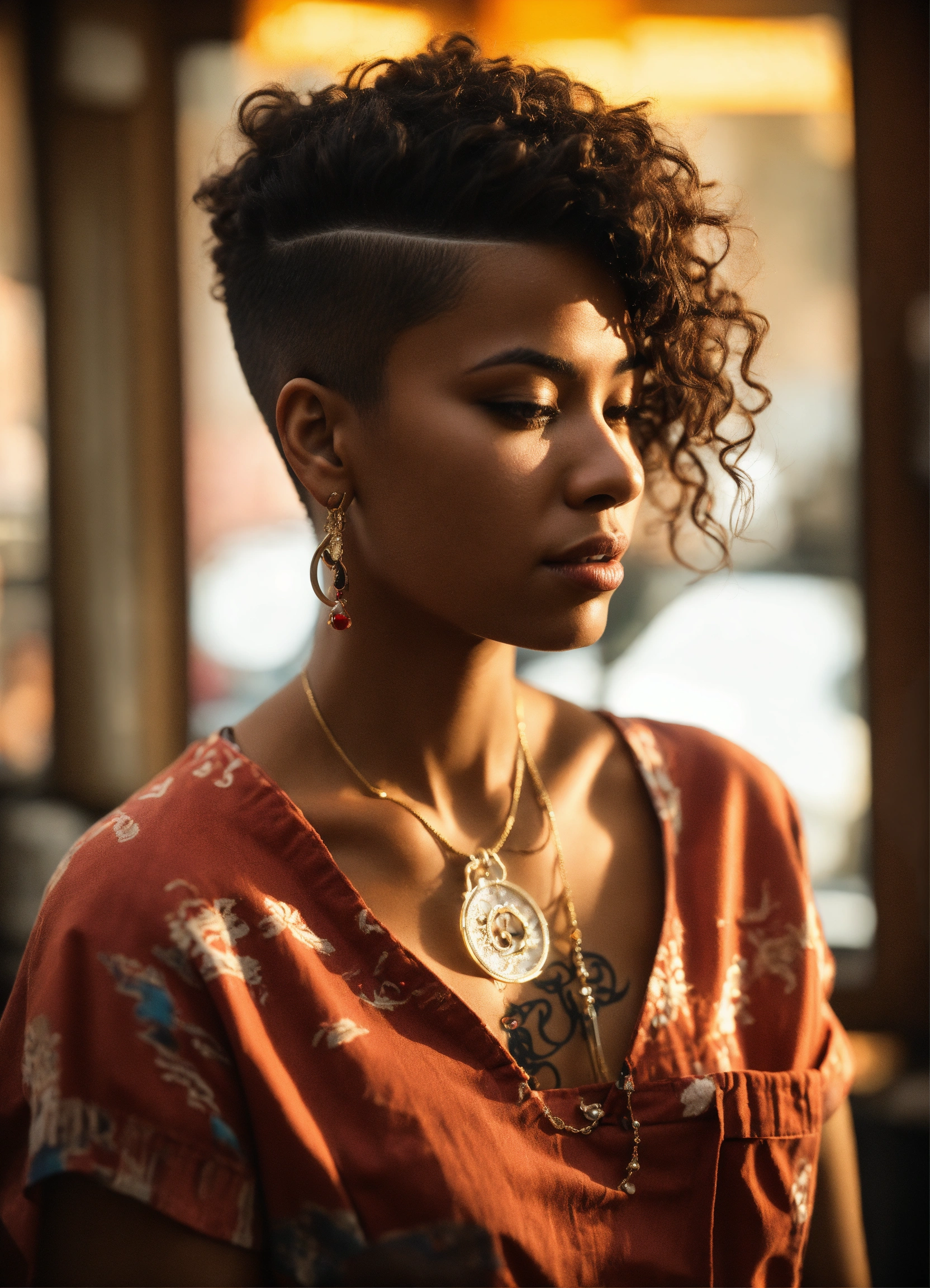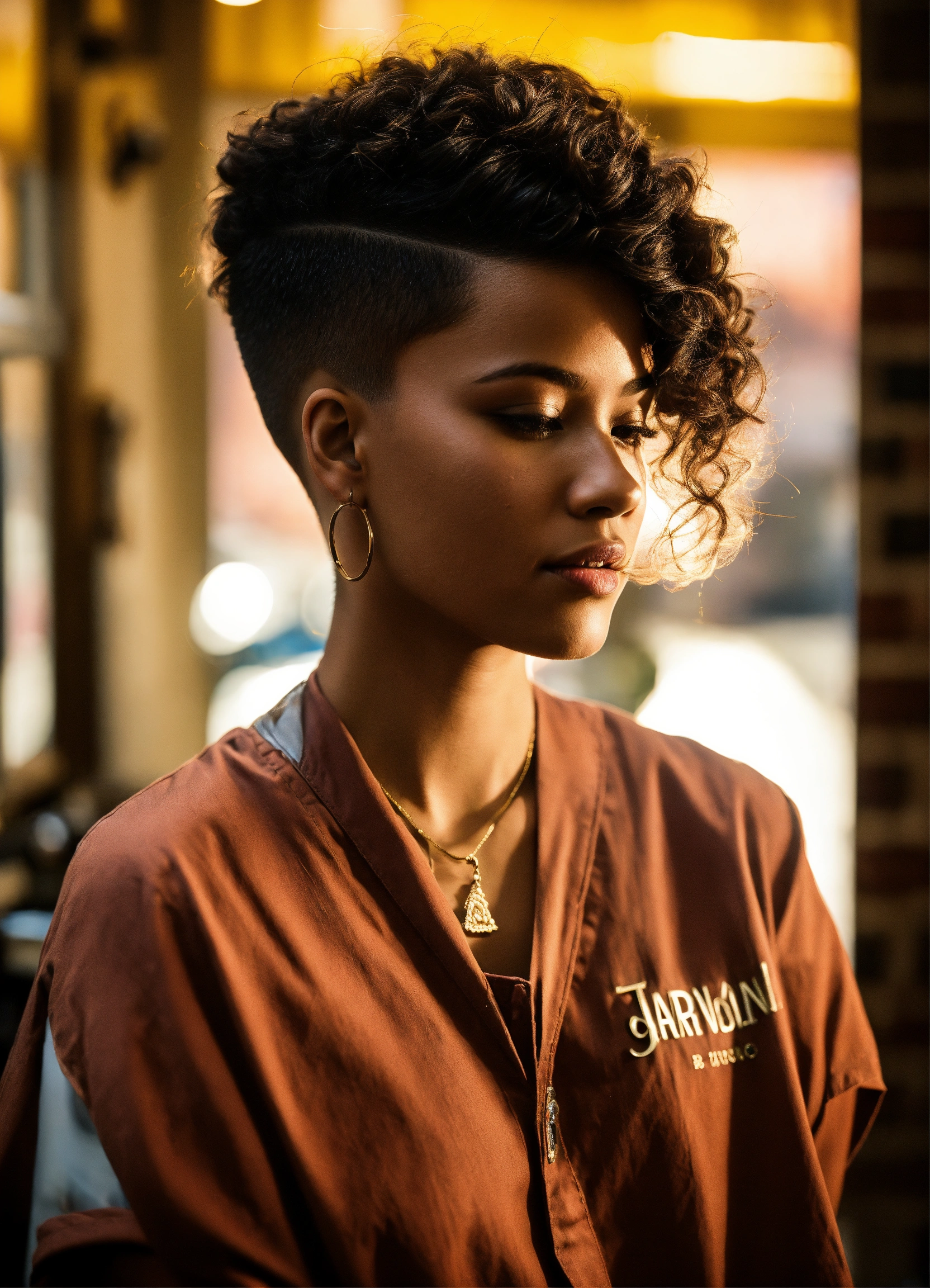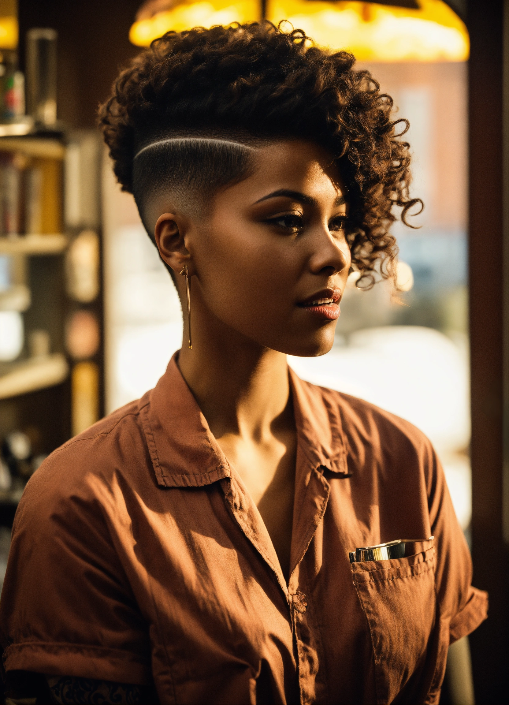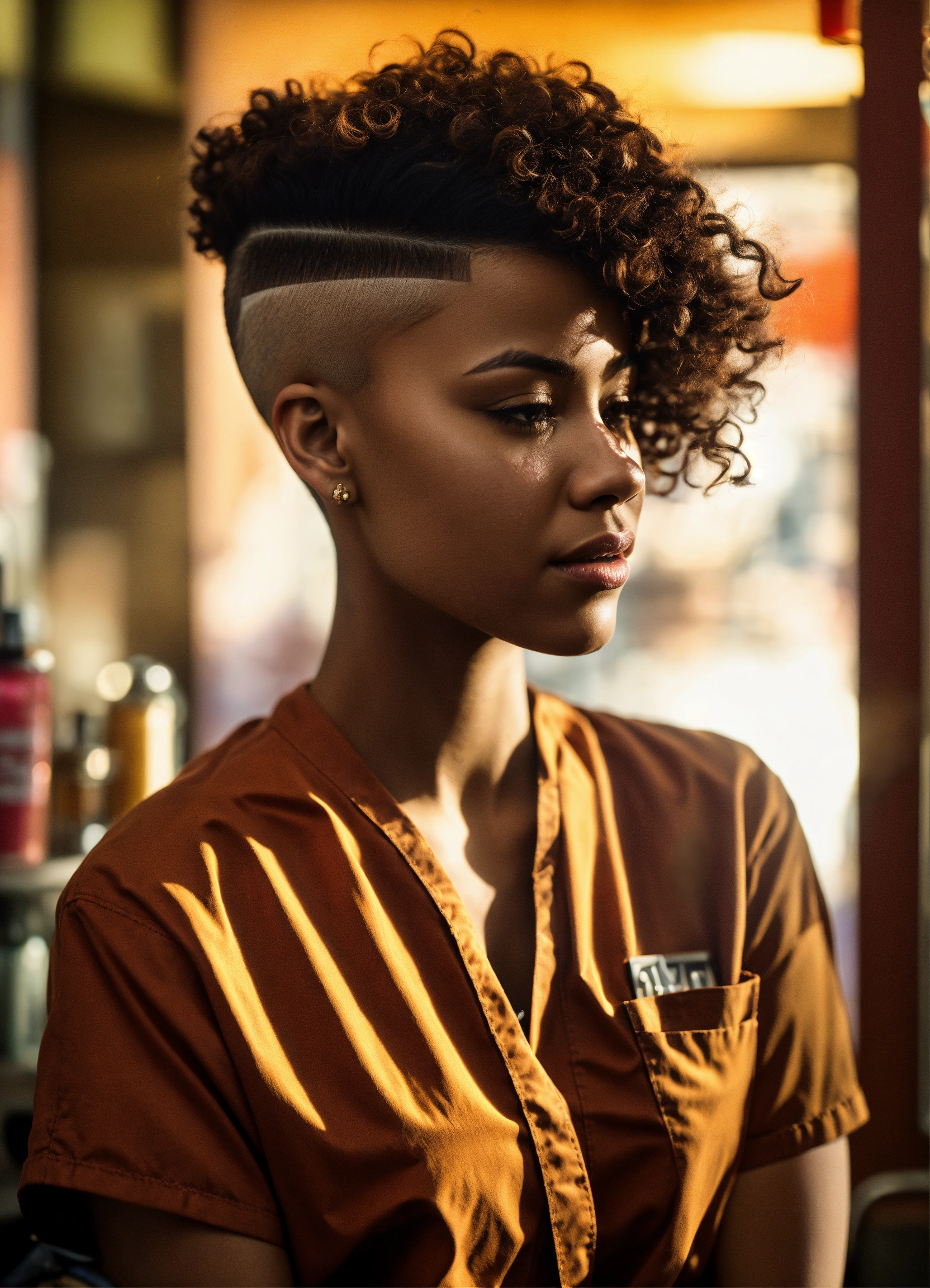 /imagine prompt a skilled brown-skinned professional female barber working in an urban barbershop, surrounded by other barbers, is cutting skin fades and creating fantasy haircuts. bright sunlight streams through large windows, capturing the barber's essence, creativity and expression of passion for his skill. intricate clipper work, attention to detail, photography, dslr with a 66mm prime lens, f/2.8 aperture, --ar 45 --v 5